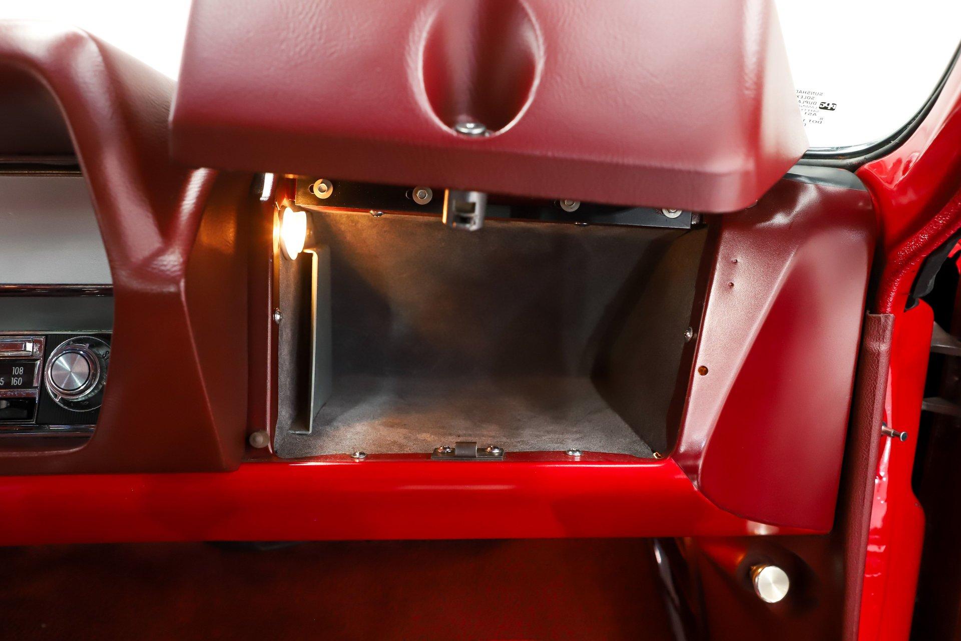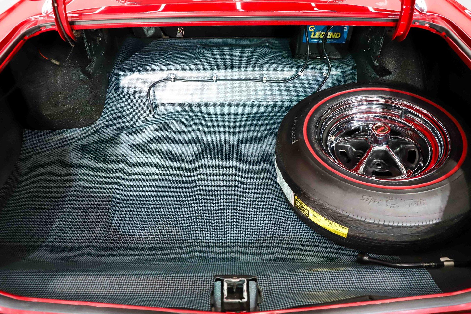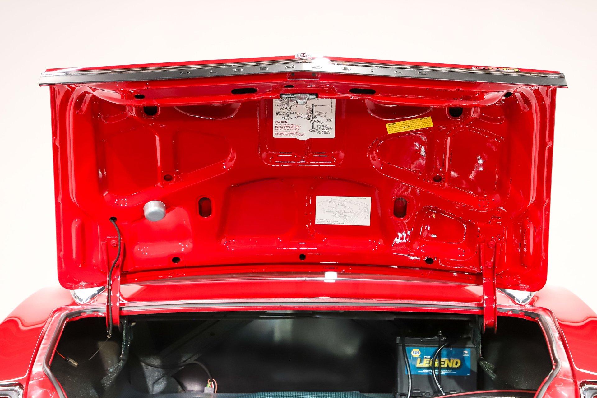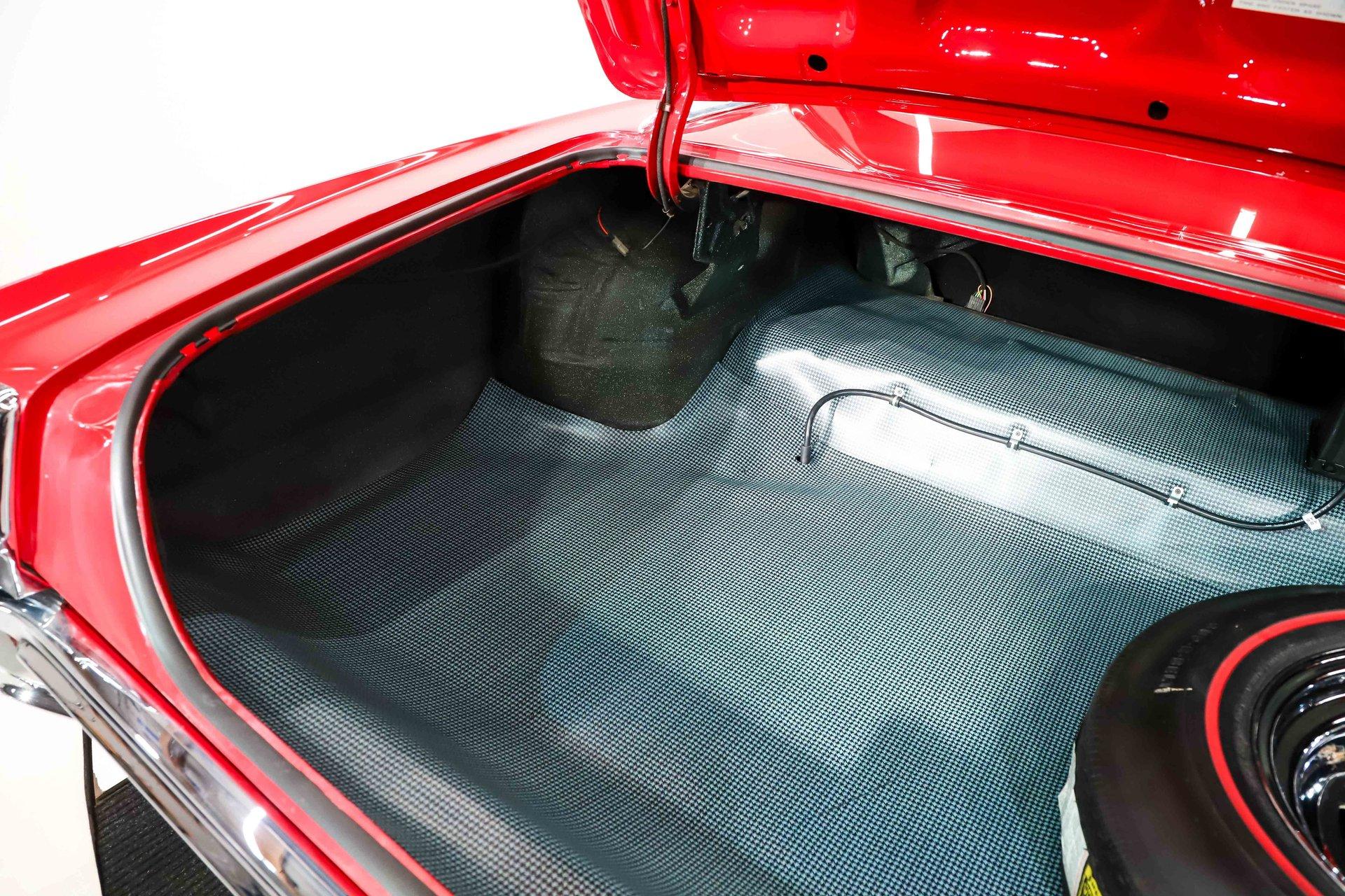 TRUNK COMPARTMENT: The trunk is fully restored and very complete. Under the lid is a glossy red finish with reproduction decals and a working trunk light. The jamb is clean with a new weatherstrip. Inside is solid metal, neatly finished with correct spatter paint and tidy wiring throughout. The restorer did not cut corners- this car is equipped with a fifth matching SS1 chrome wheel wrapped in a reproduction redline tire, a detail that really sets it apart. It's also complete with the jack, lug wrench, and correct trunk mat. The battery has been properly relocated to the trunk, just as the W30 was factory equipped.