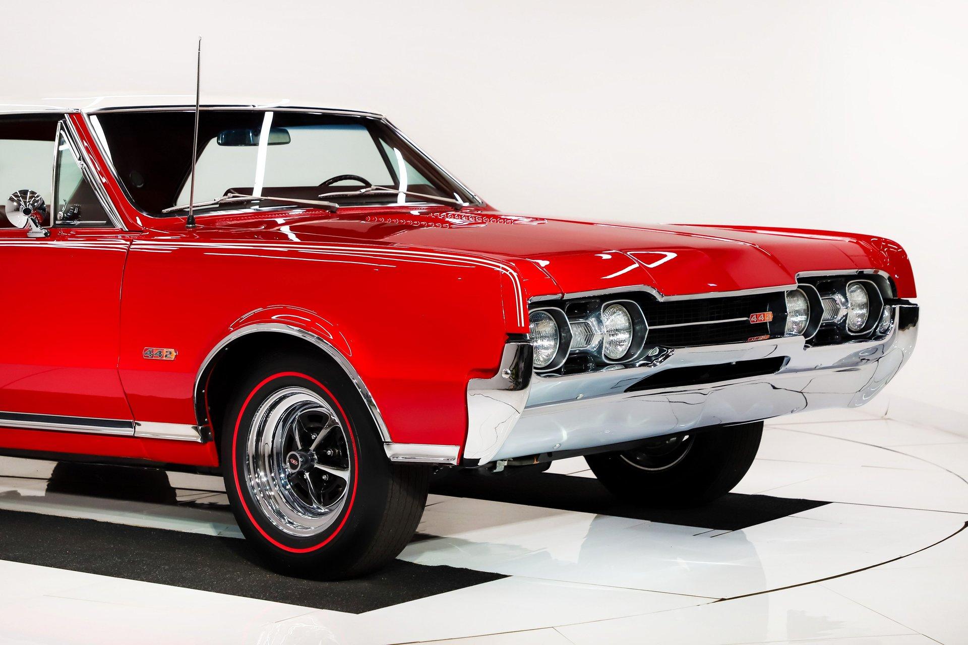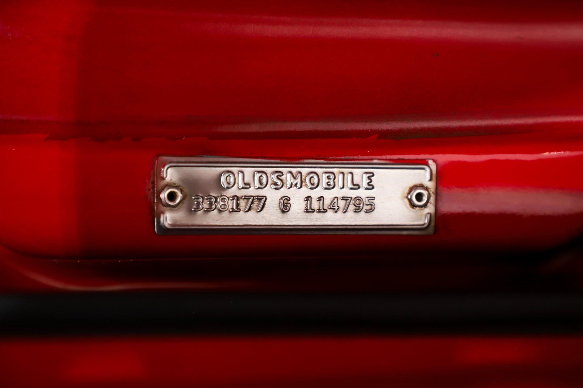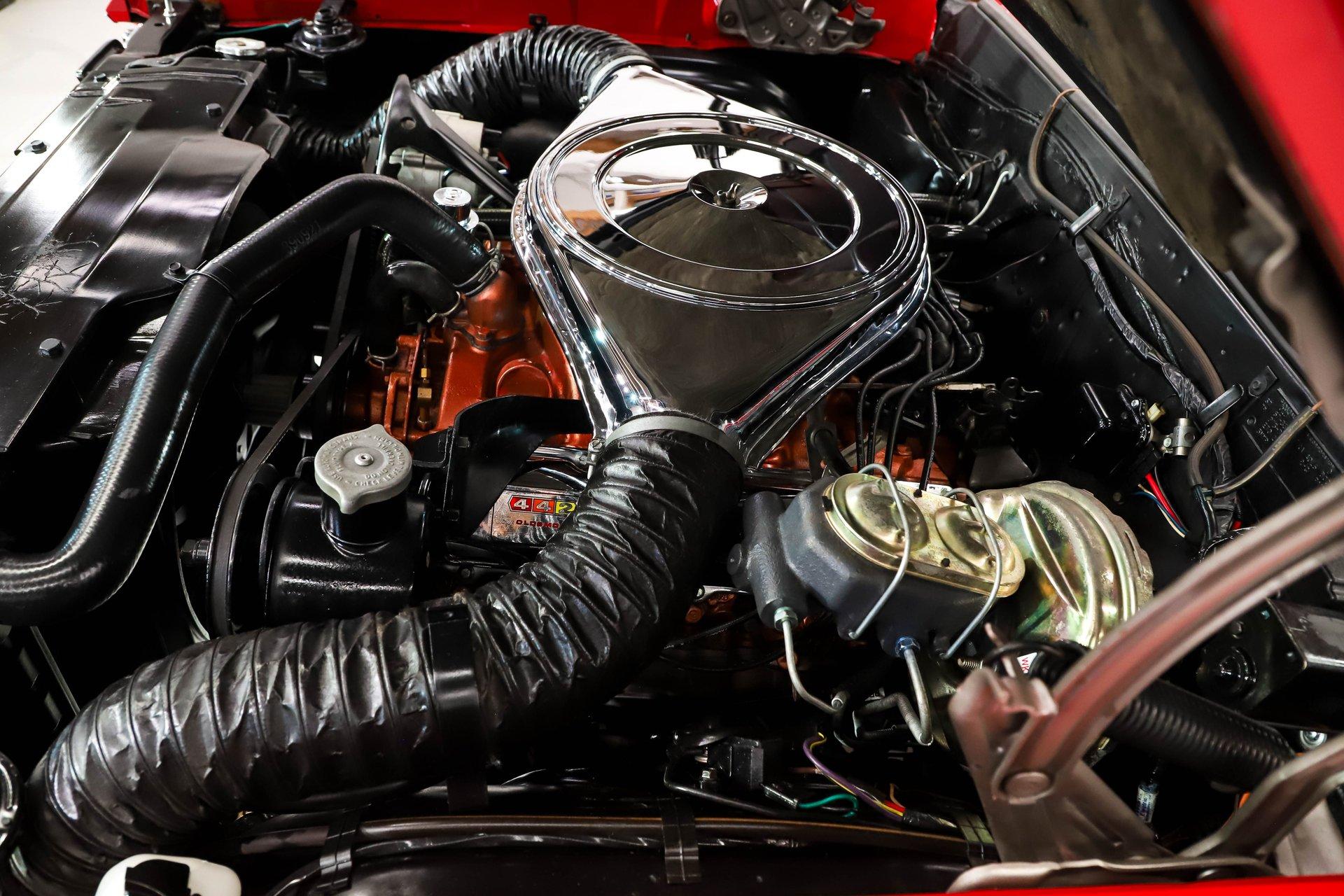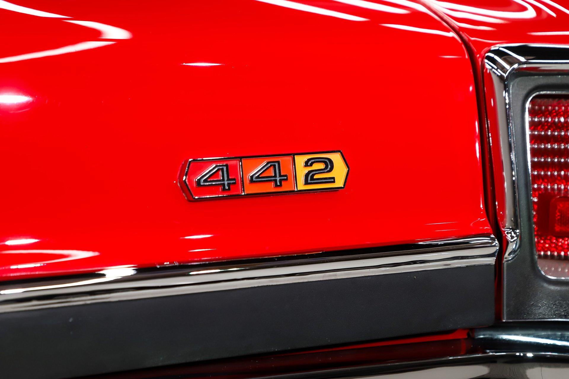 EXTERIOR: This 442 has stunning curb appeal, refinished in its factory correct two tone combination of Spanish Red with a Provincial White roof. The body is pristine. Although the restoration was completed over 10 years ago, I could not find a bubble, crack, or any signs of bodywork- it is laser straight with excellent panel alignment. The gaps are spot on, and the doors shut with a solid, like-new feel. The red finish is exceptional, topped with three coats of House of Kolor clear that have been polished to a deep, glass like shine from the rockers to the roof. The factory painted pinstripe was properly duplicated, adding to its authenticity. The chrome, trim, and emblems all sparkle, the glass is crystal clear, and the weatherstrips have been replaced. Even the door jambs are detailed with care. It's finished off exactly right with correct T3 headlamps and sits on a beautiful set of chrome SS1 wheels wrapped in reproduction redline tires, giving it the perfect period correct stance.
