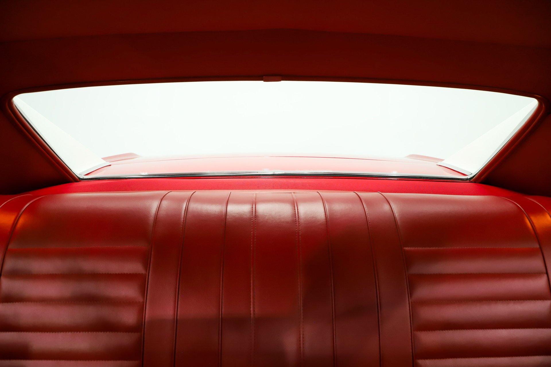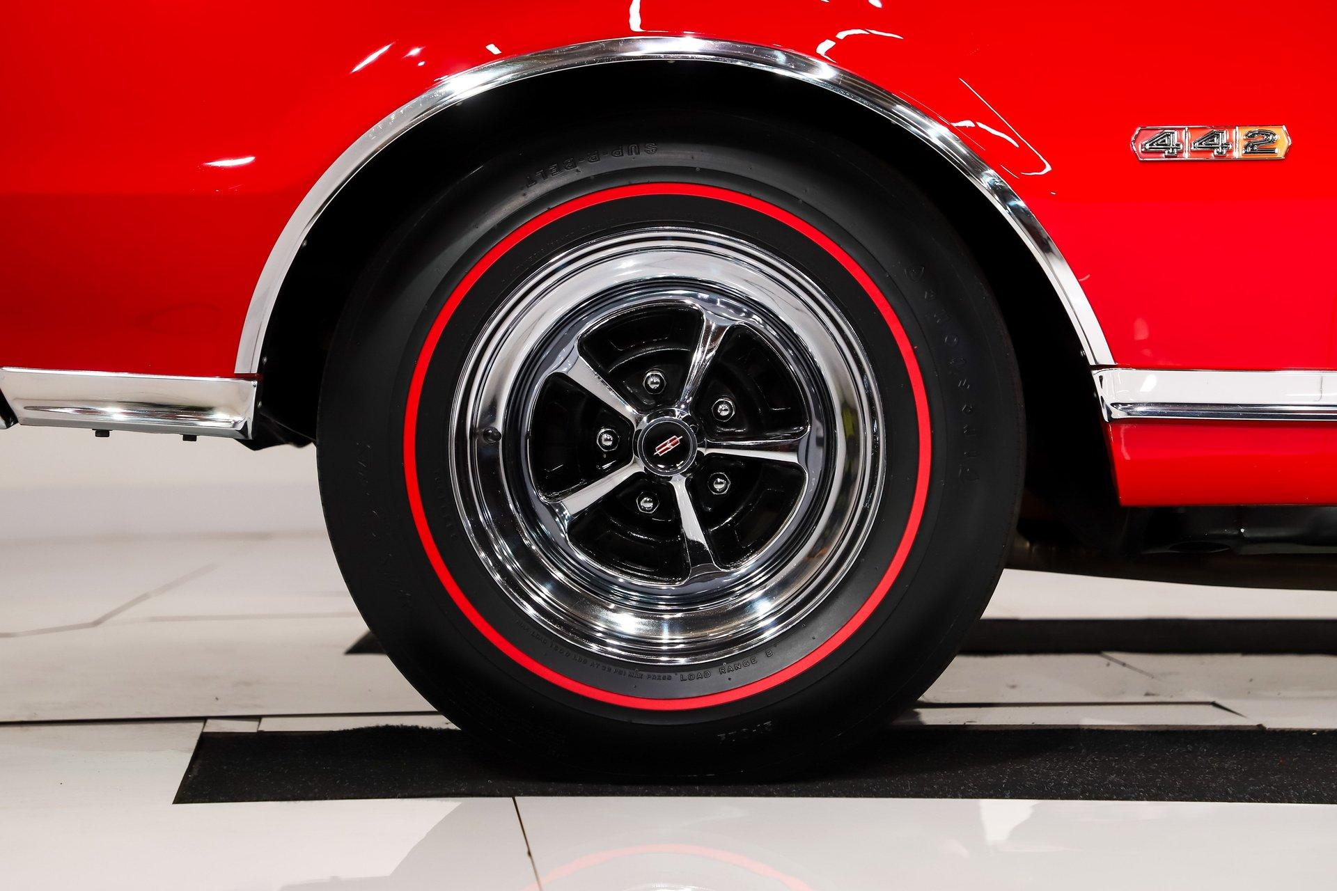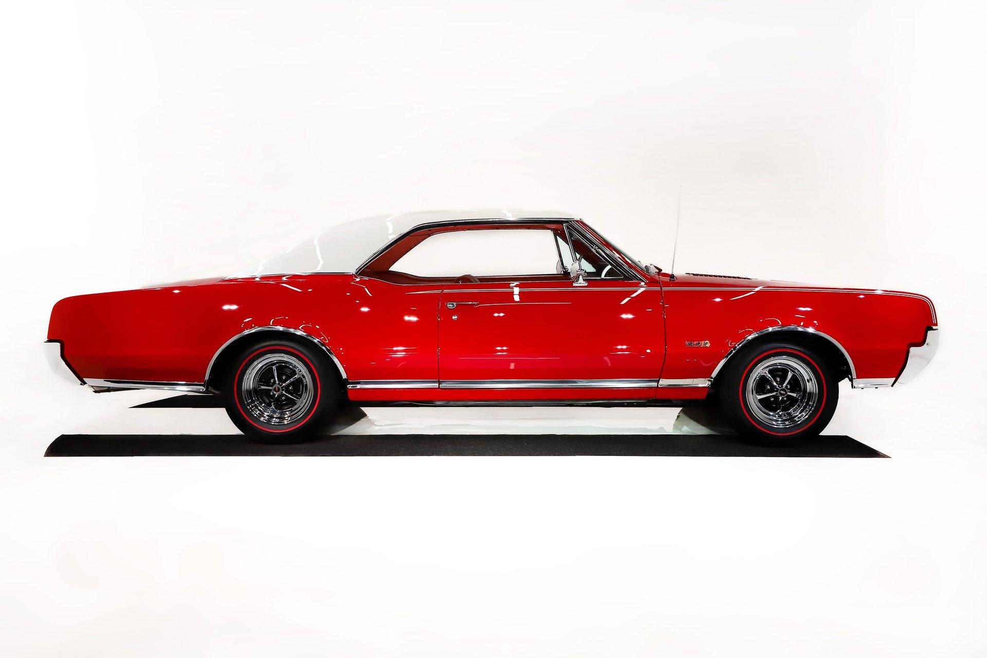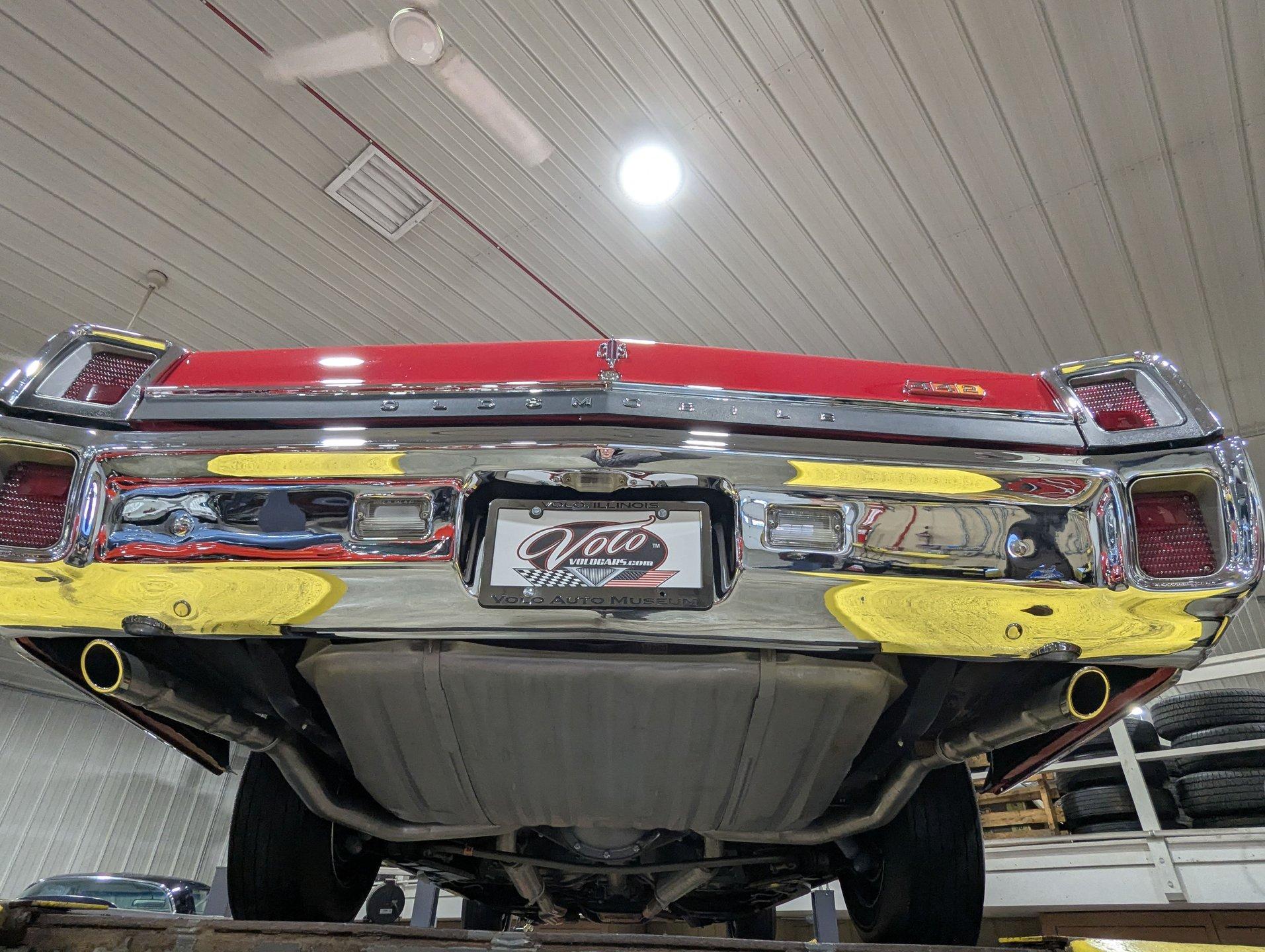 EXTERIOR: This 442 has stunning curb appeal, refinished in its factory correct two tone combination of Spanish Red with a Provincial White roof. The body is pristine. Although the restoration was completed over 10 years ago, I could not find a bubble, crack, or any signs of bodywork- it is laser straight with excellent panel alignment. The gaps are spot on, and the doors shut with a solid, like-new feel. The red finish is exceptional, topped with three coats of House of Kolor clear that have been polished to a deep, glass like shine from the rockers to the roof. The factory painted pinstripe was properly duplicated, adding to its authenticity. The chrome, trim, and emblems all sparkle, the glass is crystal clear, and the weatherstrips have been replaced. Even the door jambs are detailed with care. It's finished off exactly right with correct T3 headlamps and sits on a beautiful set of chrome SS1 wheels wrapped in reproduction redline tires, giving it the perfect period correct stance.