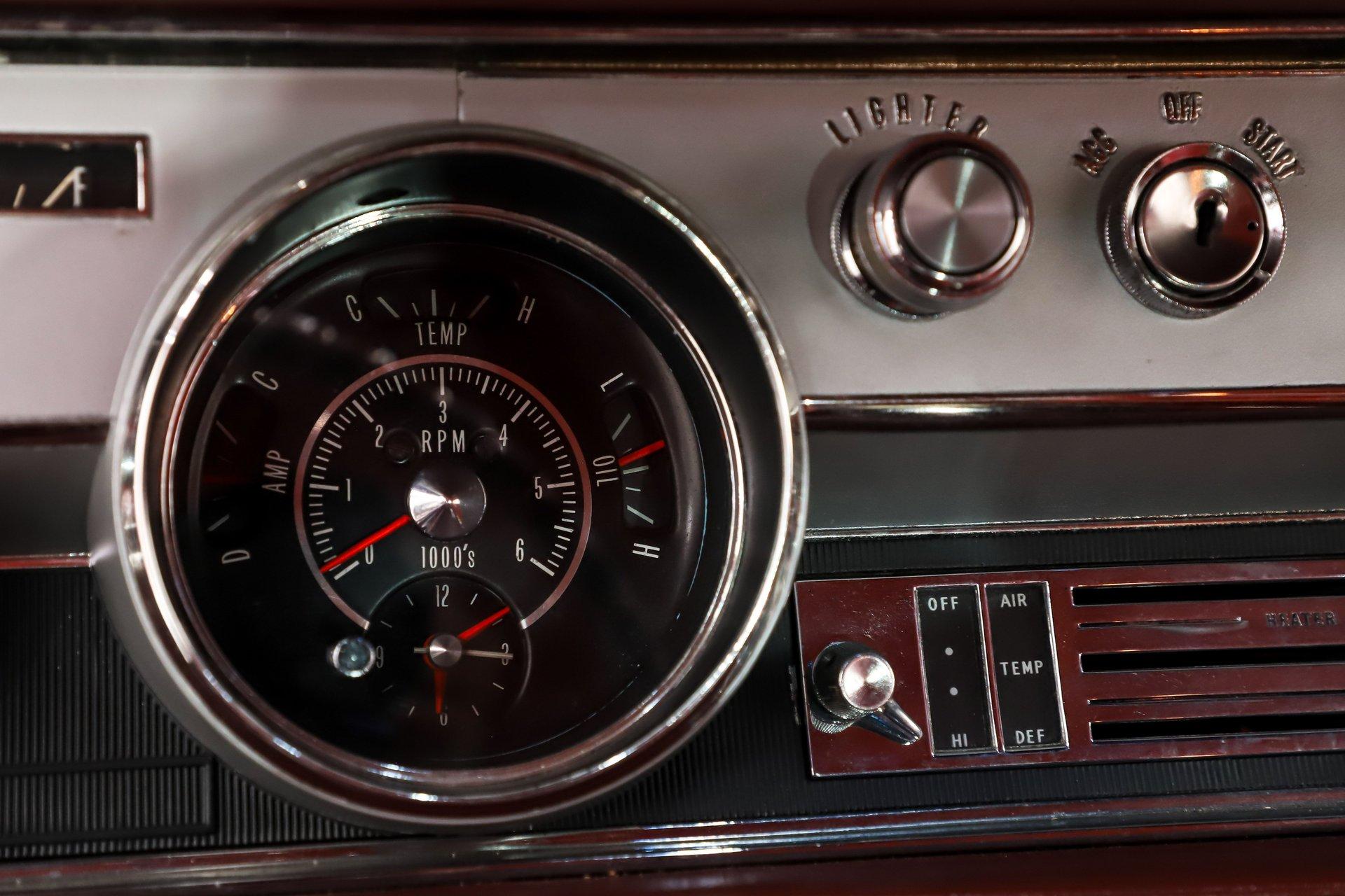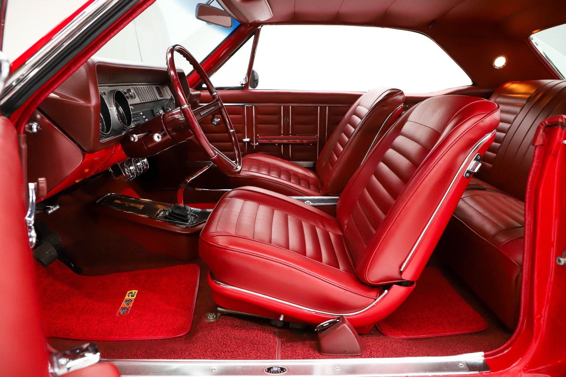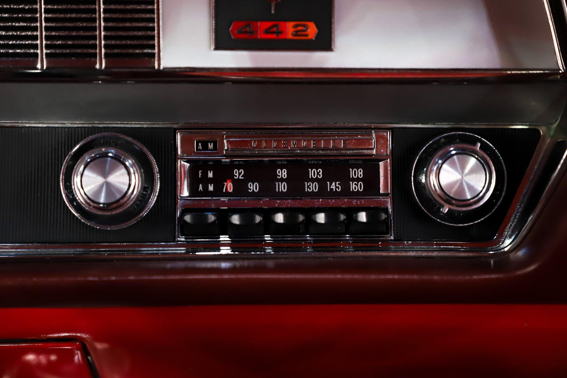 INTERIOR: Inside is just as impressive, it's restored from carpet to headliner with a very meticulous touch, all redone in its original red color. The door panels and armrests look brand new, and the seats have been properly recushioned and upholstered for both comfort and appearance. The red carpet fits beautifully and is complemented by a set of reproduction Oldsmobile rubber mats as well as embroidered 442 carpeted mats. The original center console remains in place with the iconic 442 Hurst shifter, and it is equipped with a power seat for added comfort. All interior lights are working, and the original red deluxe seat belts are still intact. The dash area has been fully restored, the instrument bezel was rechromed, and it features a rebuilt rally gauge cluster with a tachometer. It also includes an optional AM/FM radio, along with a discreet set of auxiliary gauges mounted below the dash for more precise readings. Overhead there is a fresh, tight fitting headliner with matching visors. Even the small details throughout the interior are clean, tidy, and well executed.