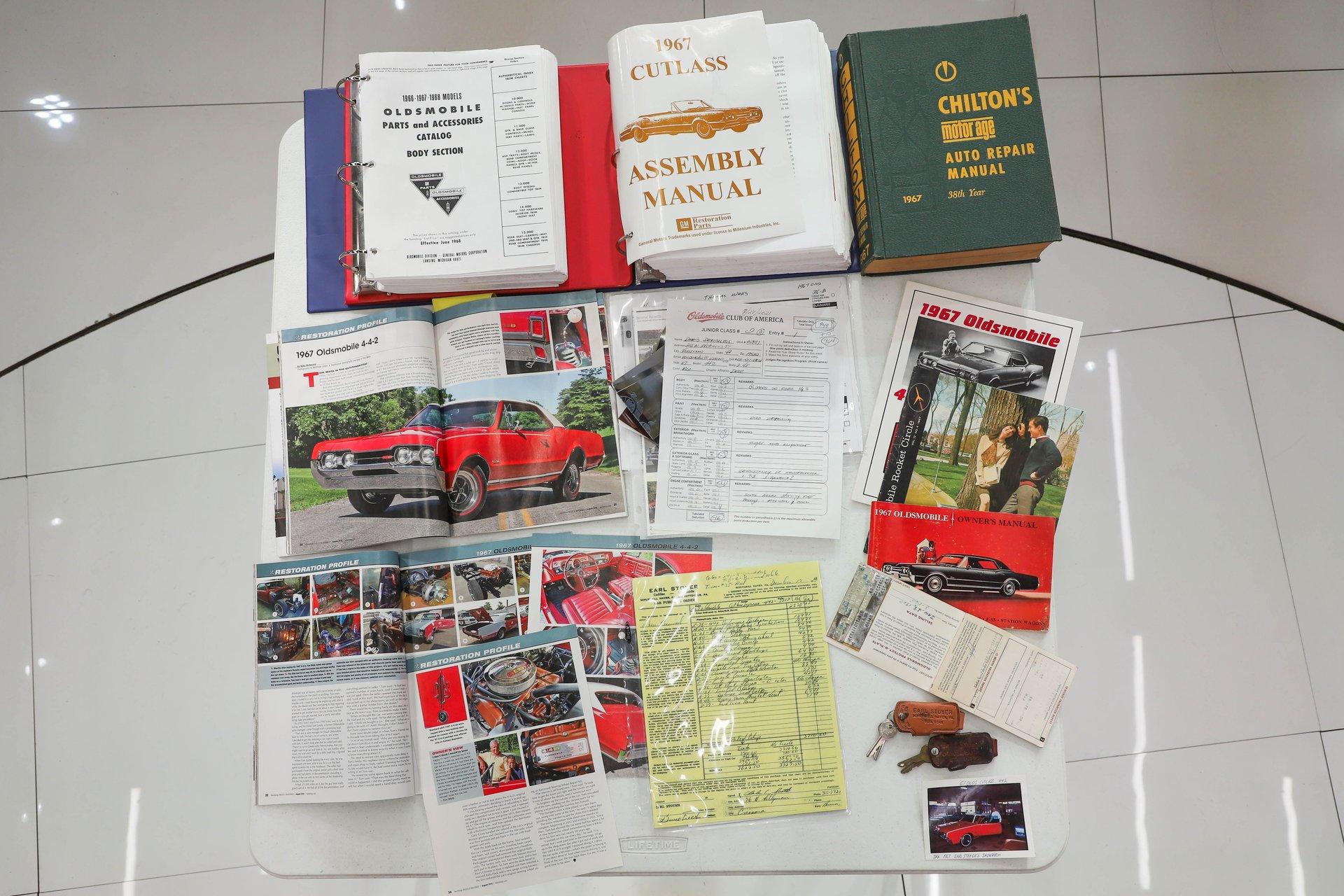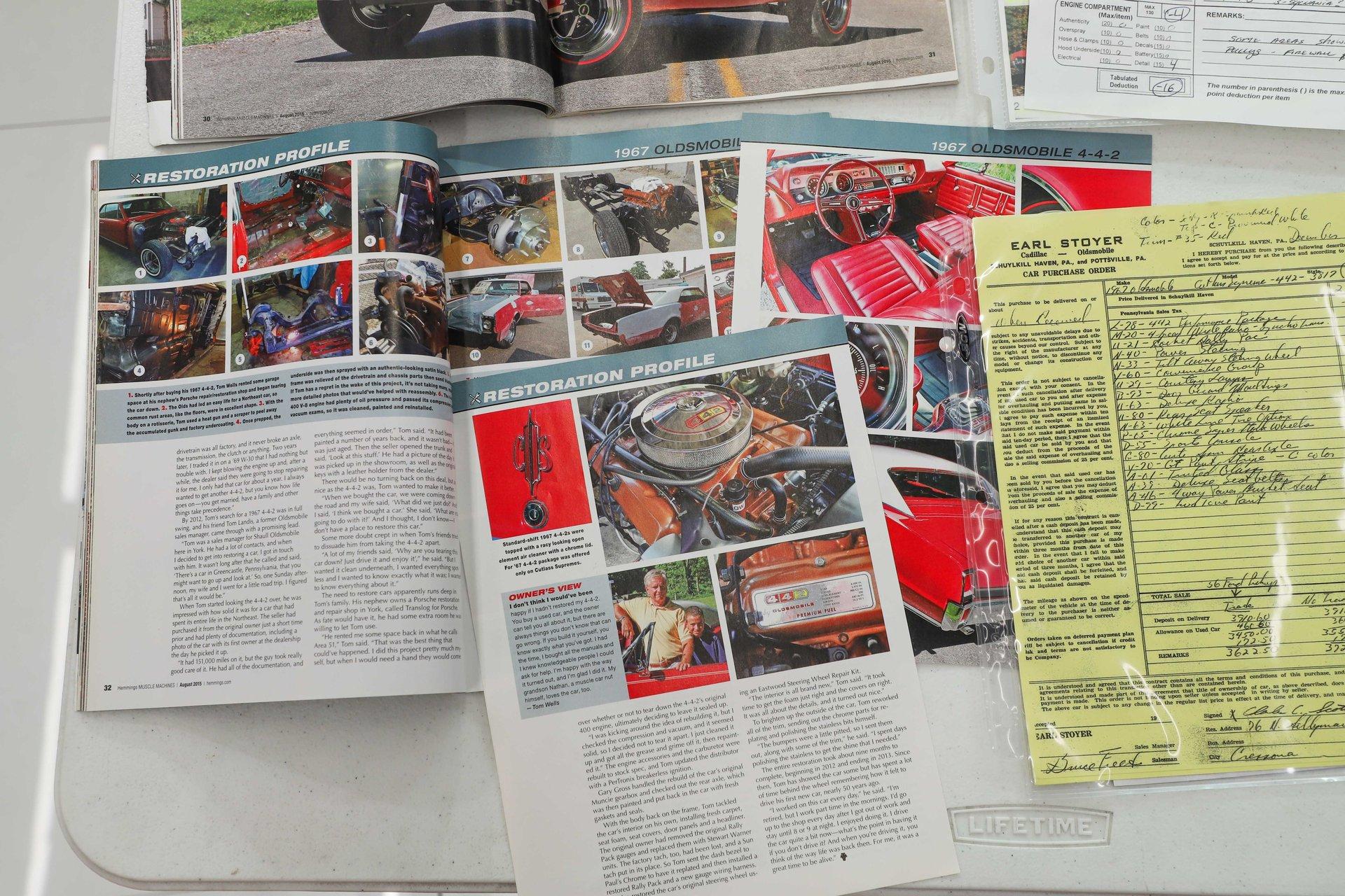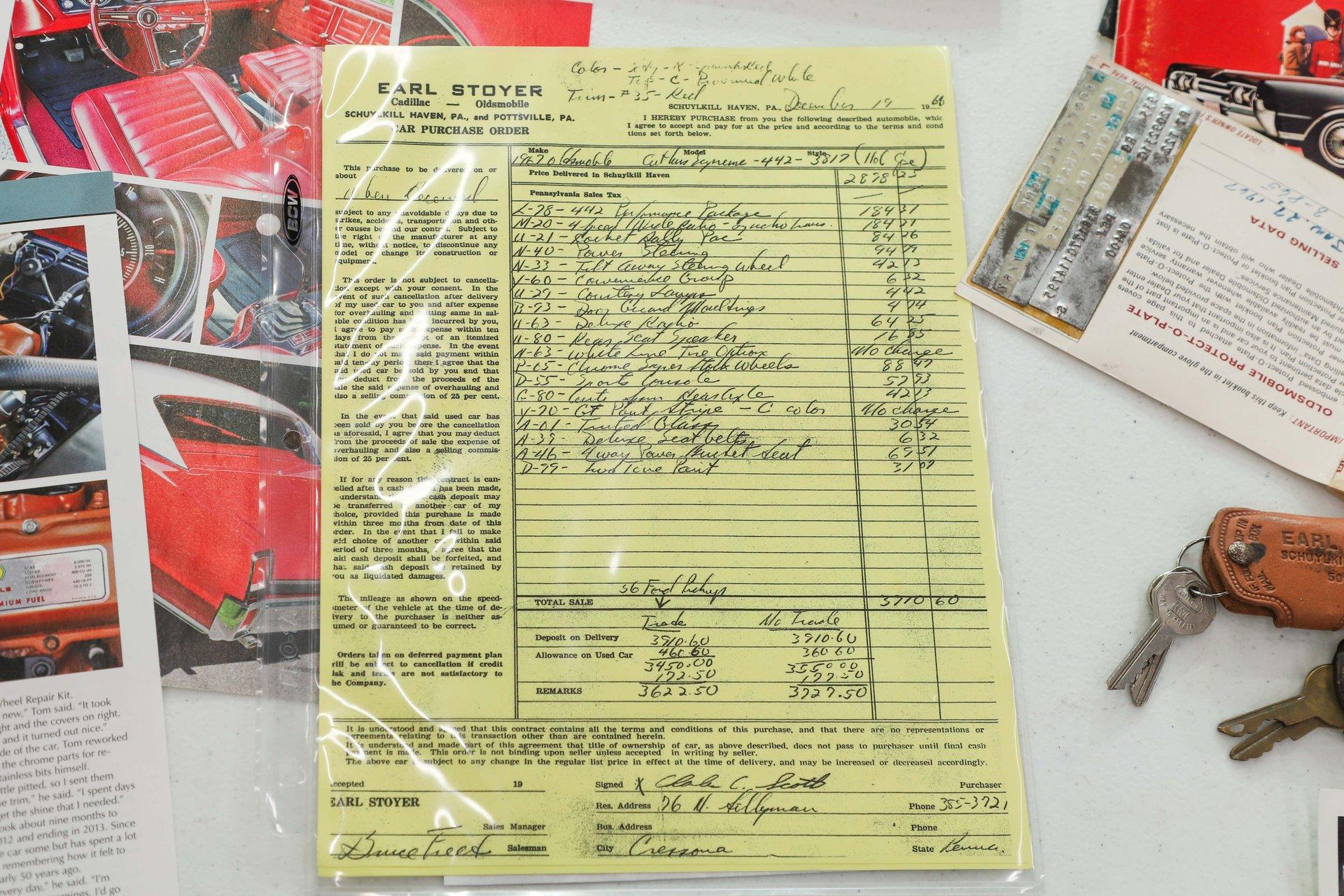 CONCLUSION: This 442 comes with an assortment of extras, including books, shop manuals, the original dealer issued leather key tag, 3 sets of keys, photos of the restoration, and copies of its magazine features. It's not only a highly restored example- it's also everything a muscle car should be with its 400 Ram Air engine, 4-speed, and 3.90 posi! Turn the key, grab a gear, and you'll quickly remember what it's all about.