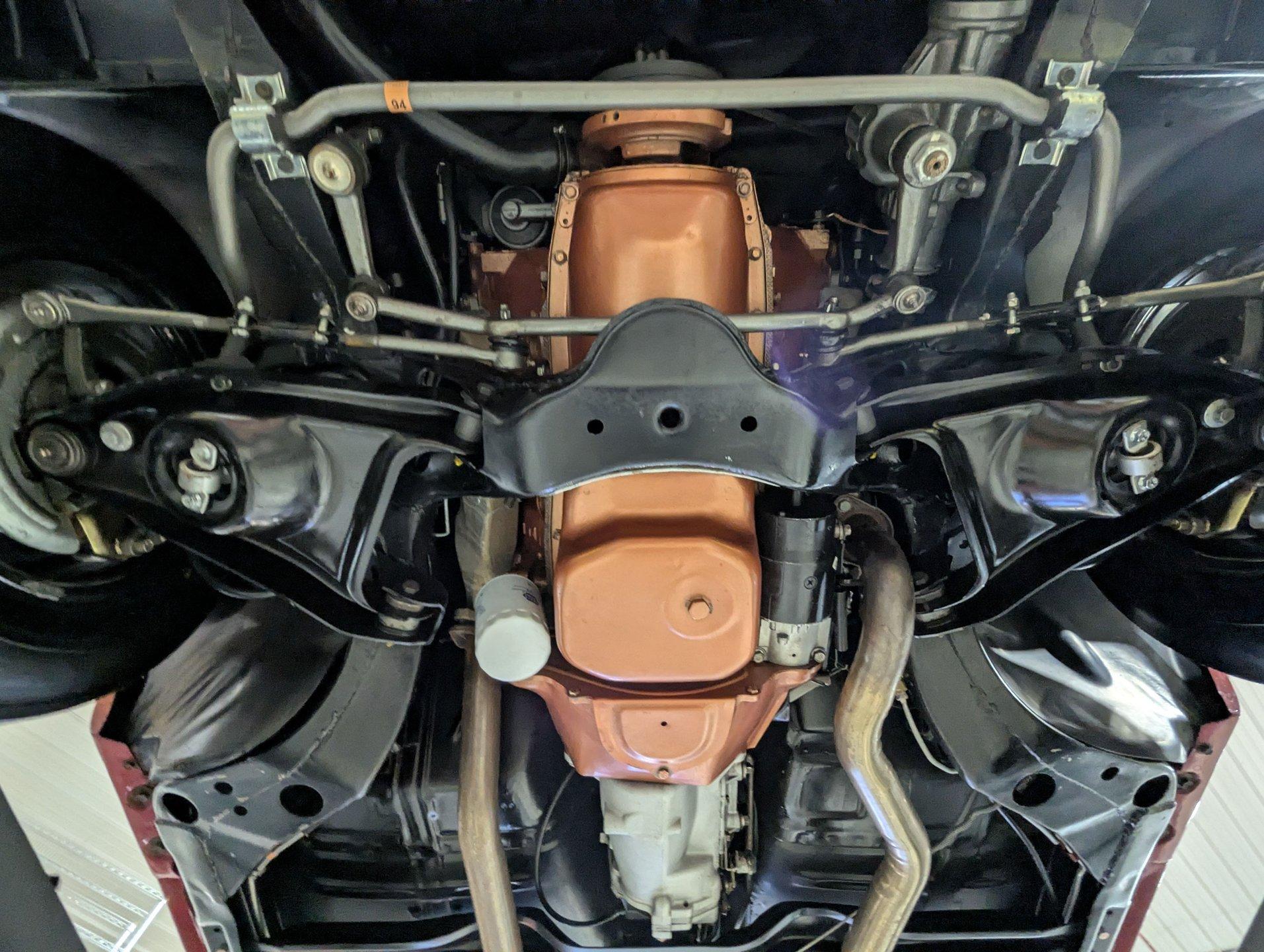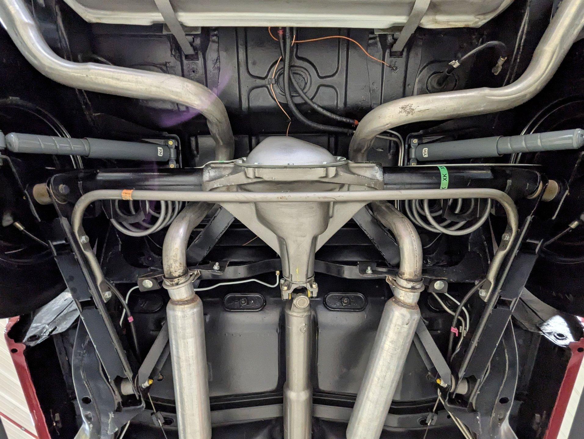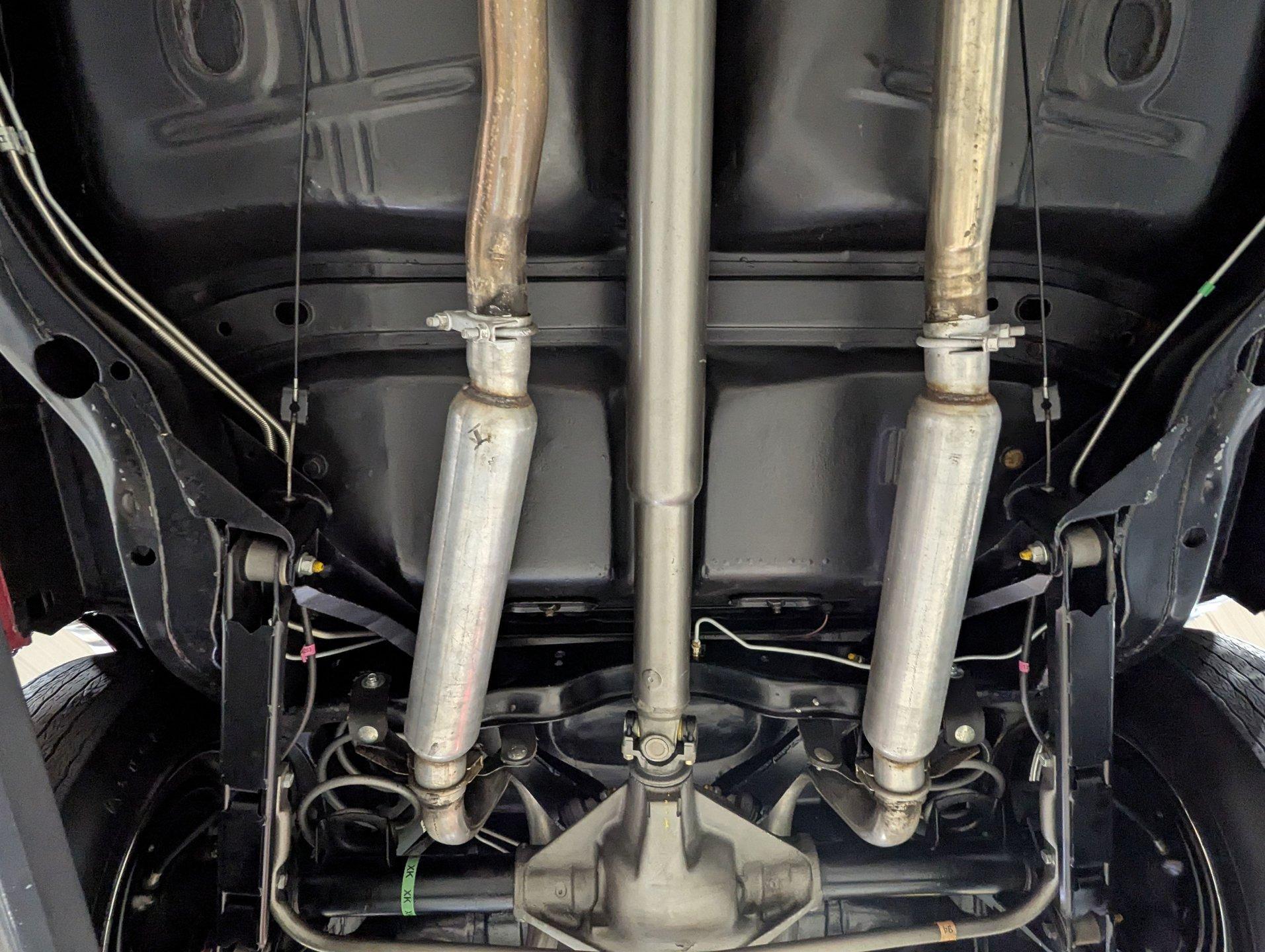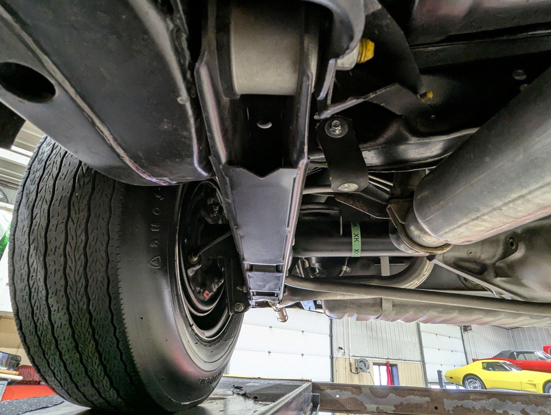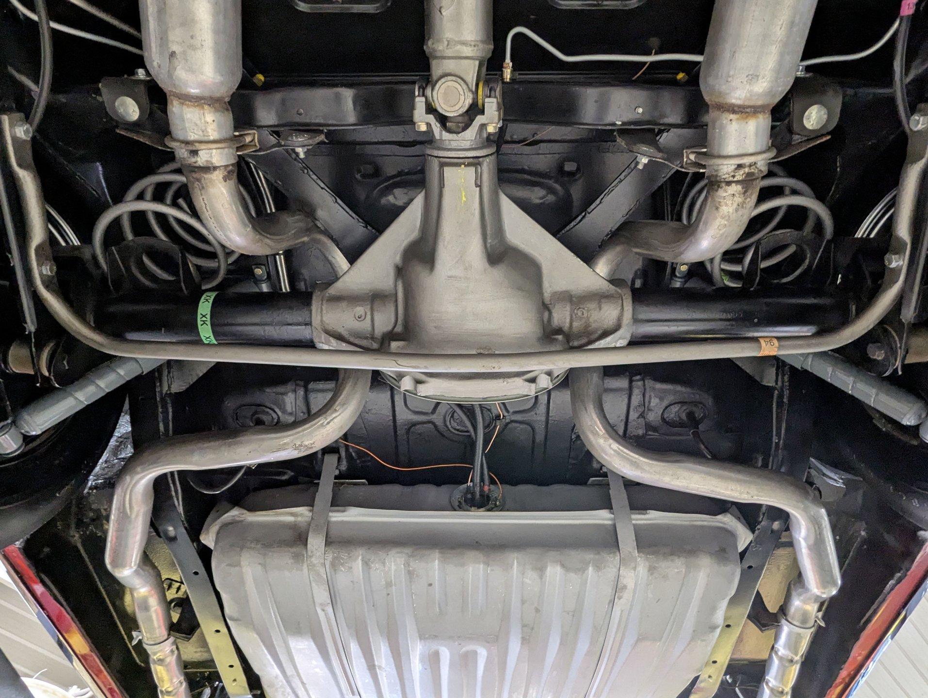 UNDERSIDE: The body was removed from the frame and placed on a rotisserie during the restoration, allowing every detail underneath to be addressed properly. The underside is all original, pristine metal that was carefully scraped, cleaned, and refinished in a smooth satin black, along with the chassis. It's equipped with the rally suspension, including front and rear sway bars and boxed rear control arms, all of which have been completely rebuilt. Even the details are right- factory style spiral shocks and assembly line tags have been reinstalled. The brake system has been fully rebuilt and upgraded with front disc brakes, and the e-brake is hooked up. The fuel system has been replaced, and it features a clean dual exhaust with correct crimped tailpipes and polished tips. It currently has cherry bomb style mufflers, and the correct mufflers are included. Looking up at the drivetrain, everything is clean and proper. The original Muncie wide ratio 4-speed has been rebuilt, and the restored driveshaft leads back to its original posi rear with 3.90 gears, also gone through. This is the kind of underside that will absolutely impress when you see it in person.