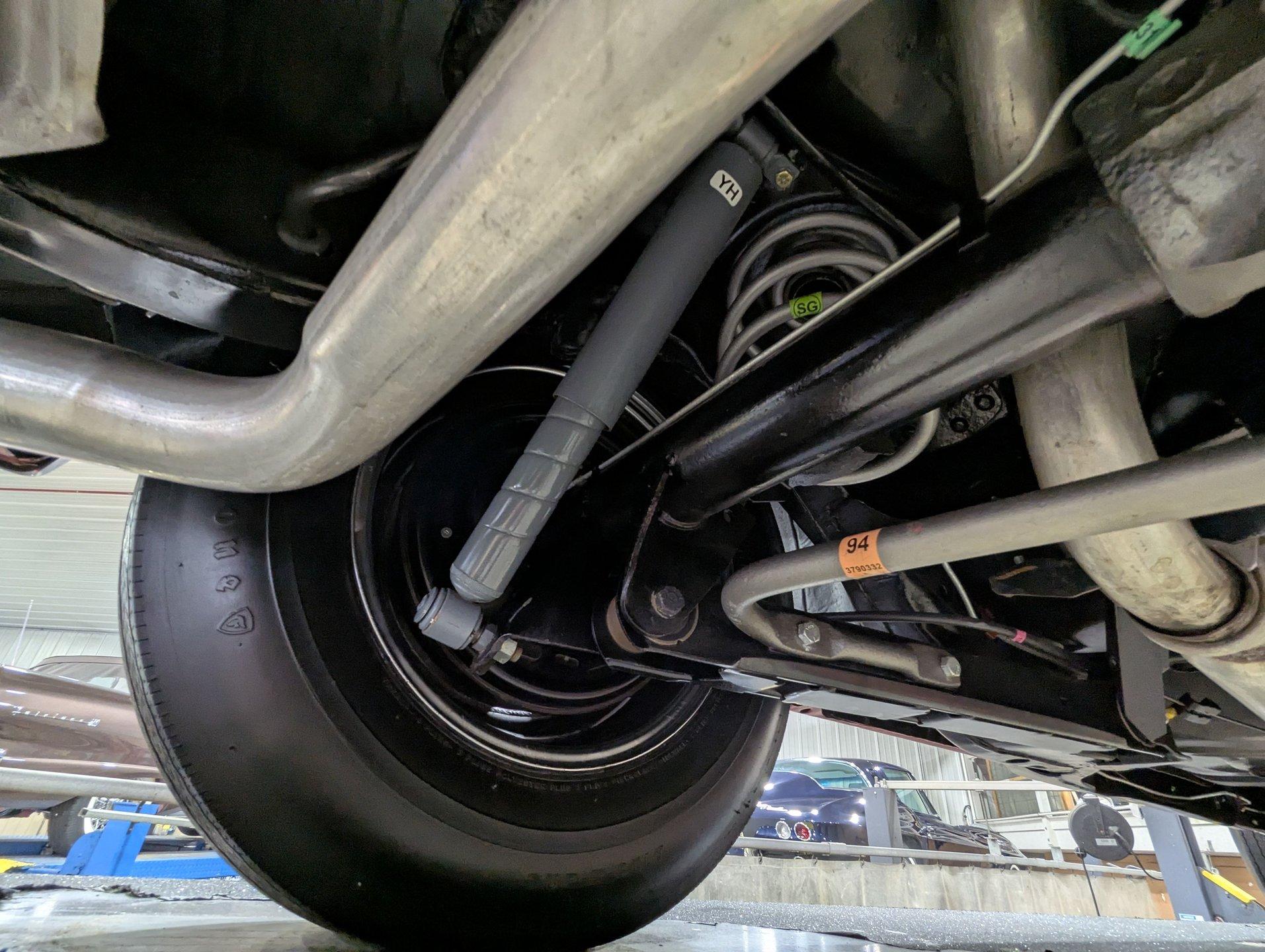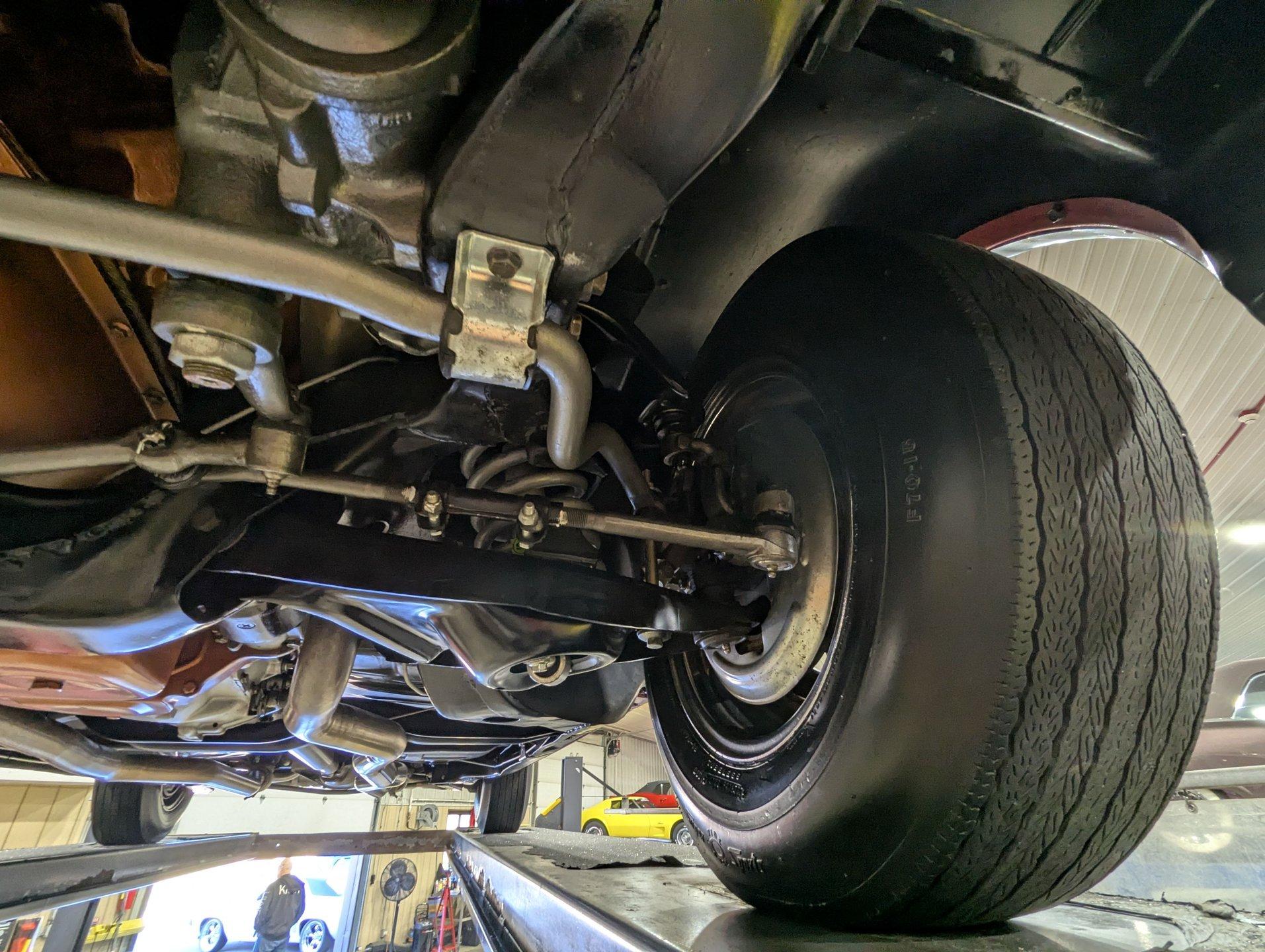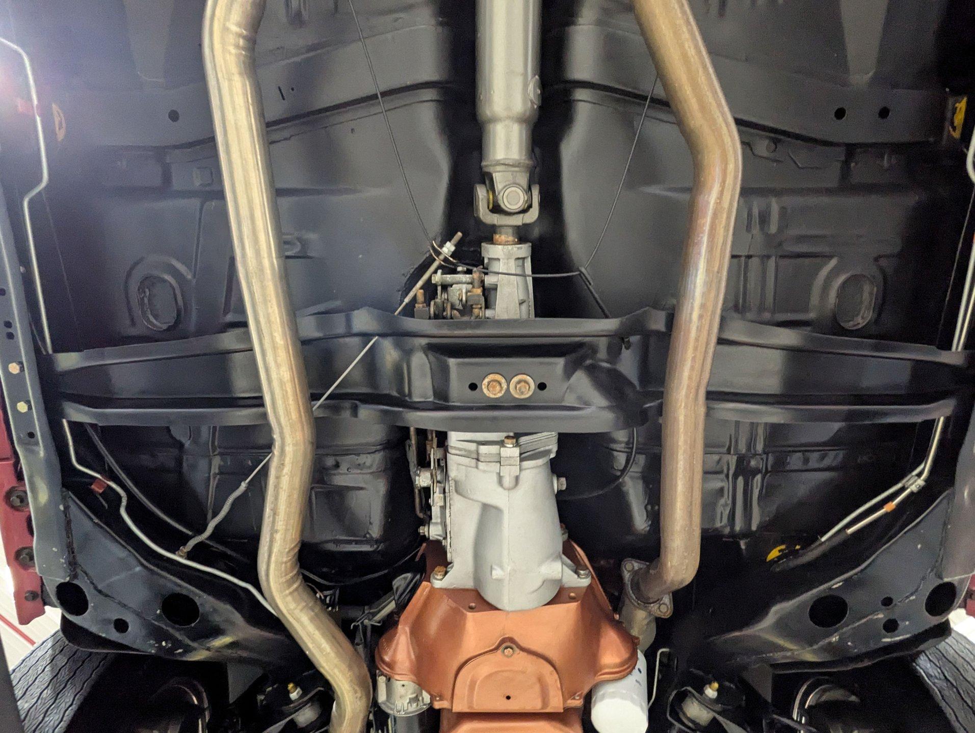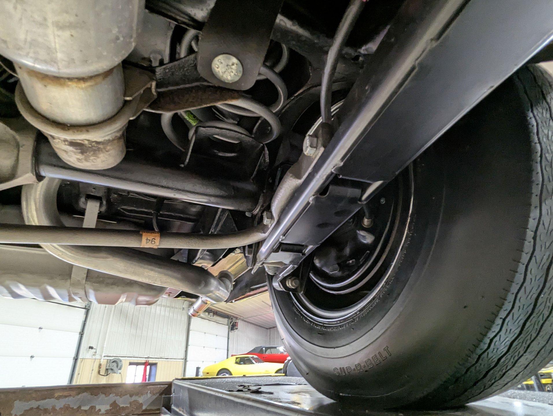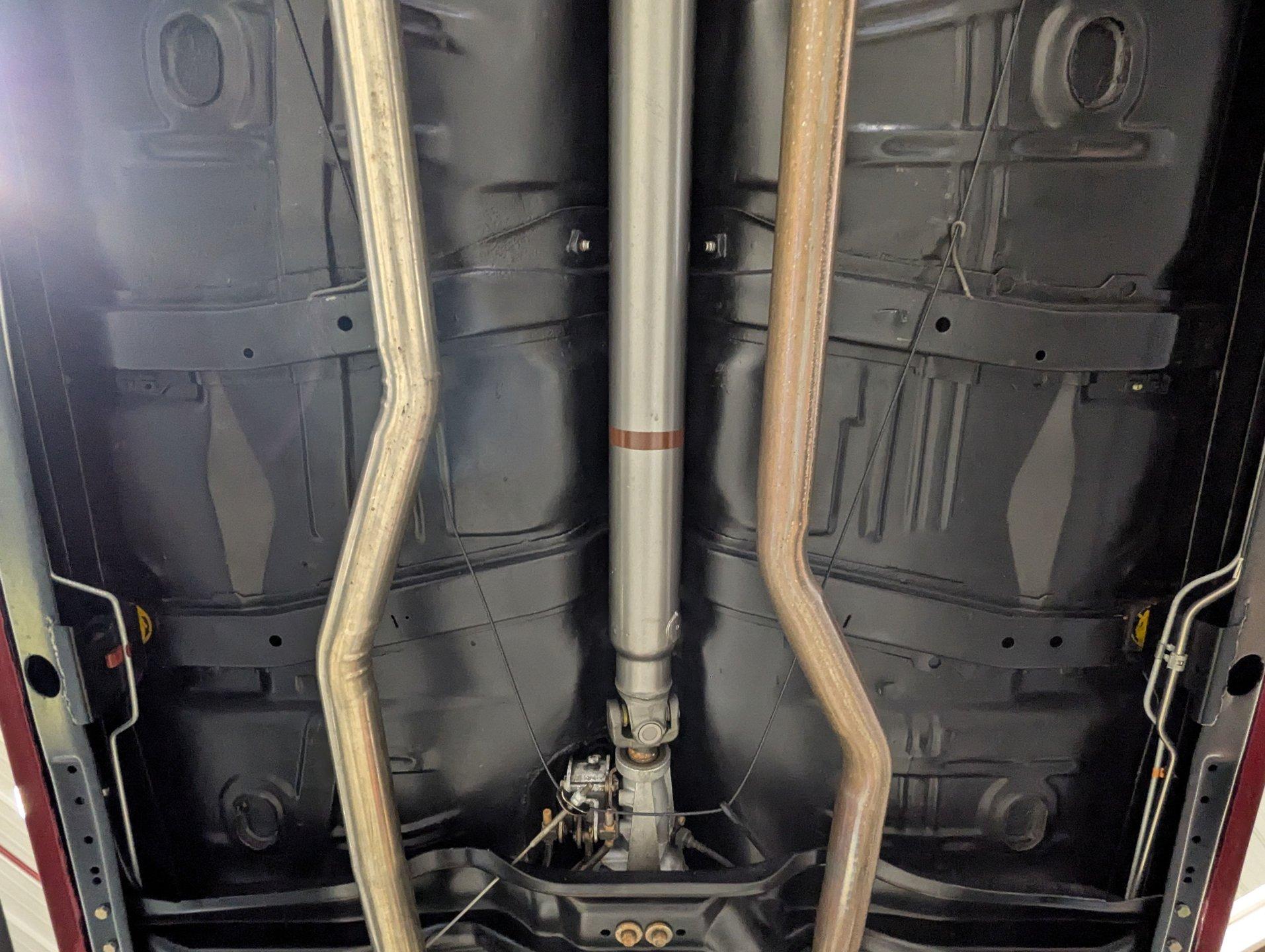 UNDERSIDE: The body was removed from the frame and placed on a rotisserie during the restoration, allowing every detail underneath to be addressed properly. The underside is all original, pristine metal that was carefully scraped, cleaned, and refinished in a smooth satin black, along with the chassis. It's equipped with the rally suspension, including front and rear sway bars and boxed rear control arms, all of which have been completely rebuilt. Even the details are right- factory style spiral shocks and assembly line tags have been reinstalled. The brake system has been fully rebuilt and upgraded with front disc brakes, and the e-brake is hooked up. The fuel system has been replaced, and it features a clean dual exhaust with correct crimped tailpipes and polished tips. It currently has cherry bomb style mufflers, and the correct mufflers are included. Looking up at the drivetrain, everything is clean and proper. The original Muncie wide ratio 4-speed has been rebuilt, and the restored driveshaft leads back to its original posi rear with 3.90 gears, also gone through. This is the kind of underside that will absolutely impress when you see it in person.