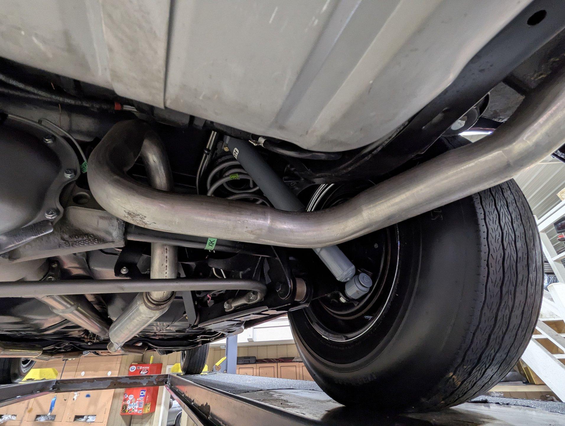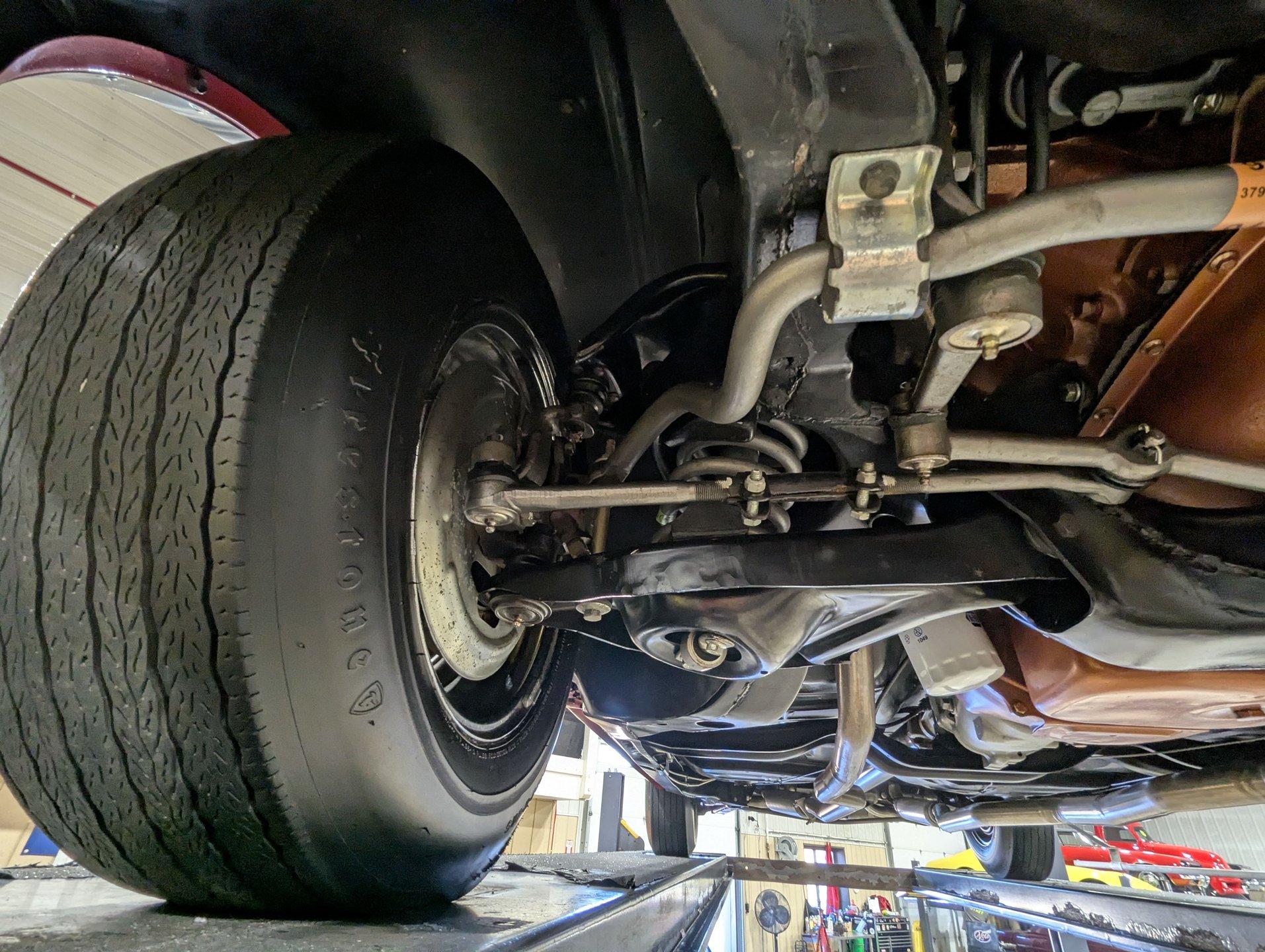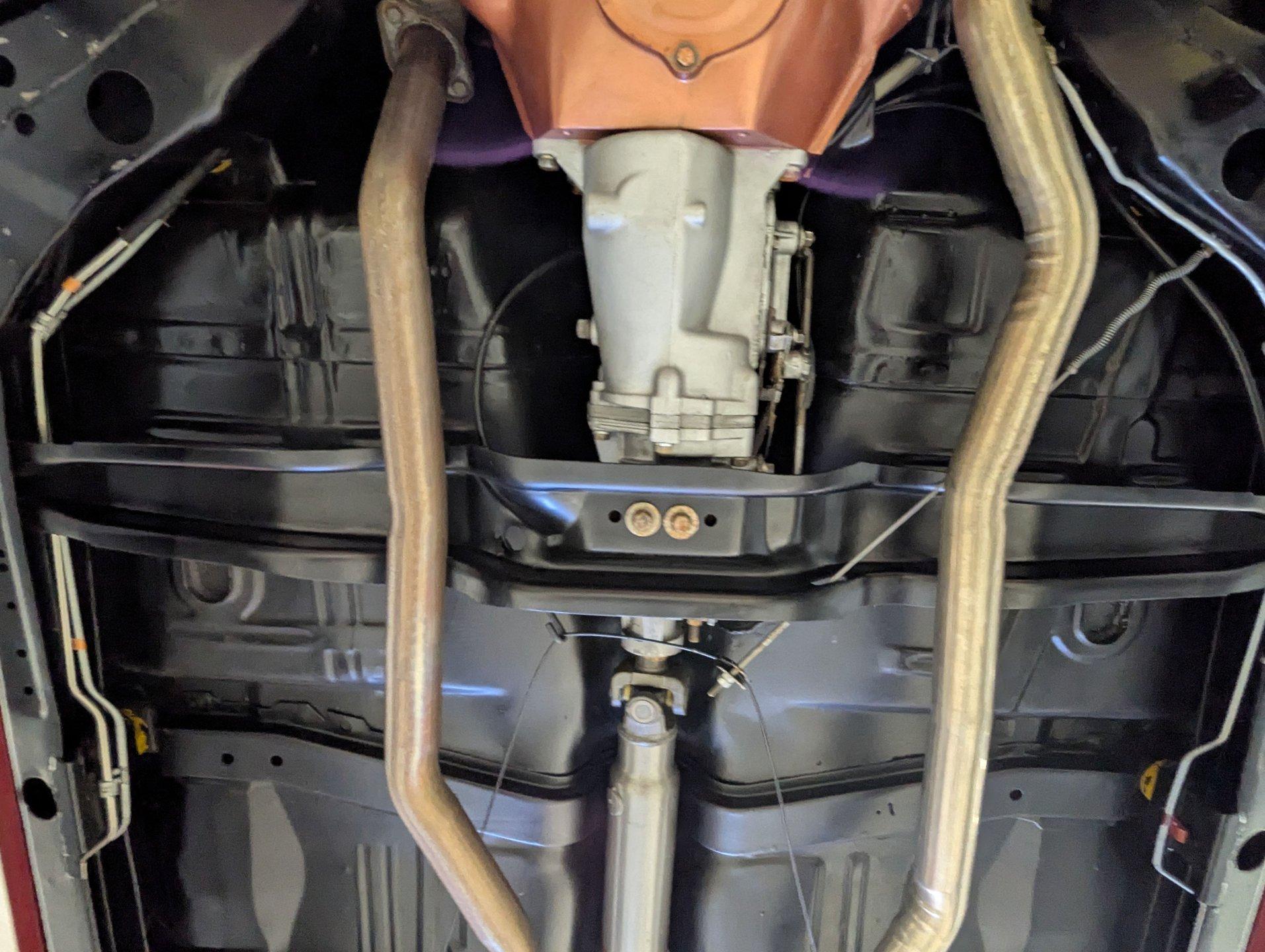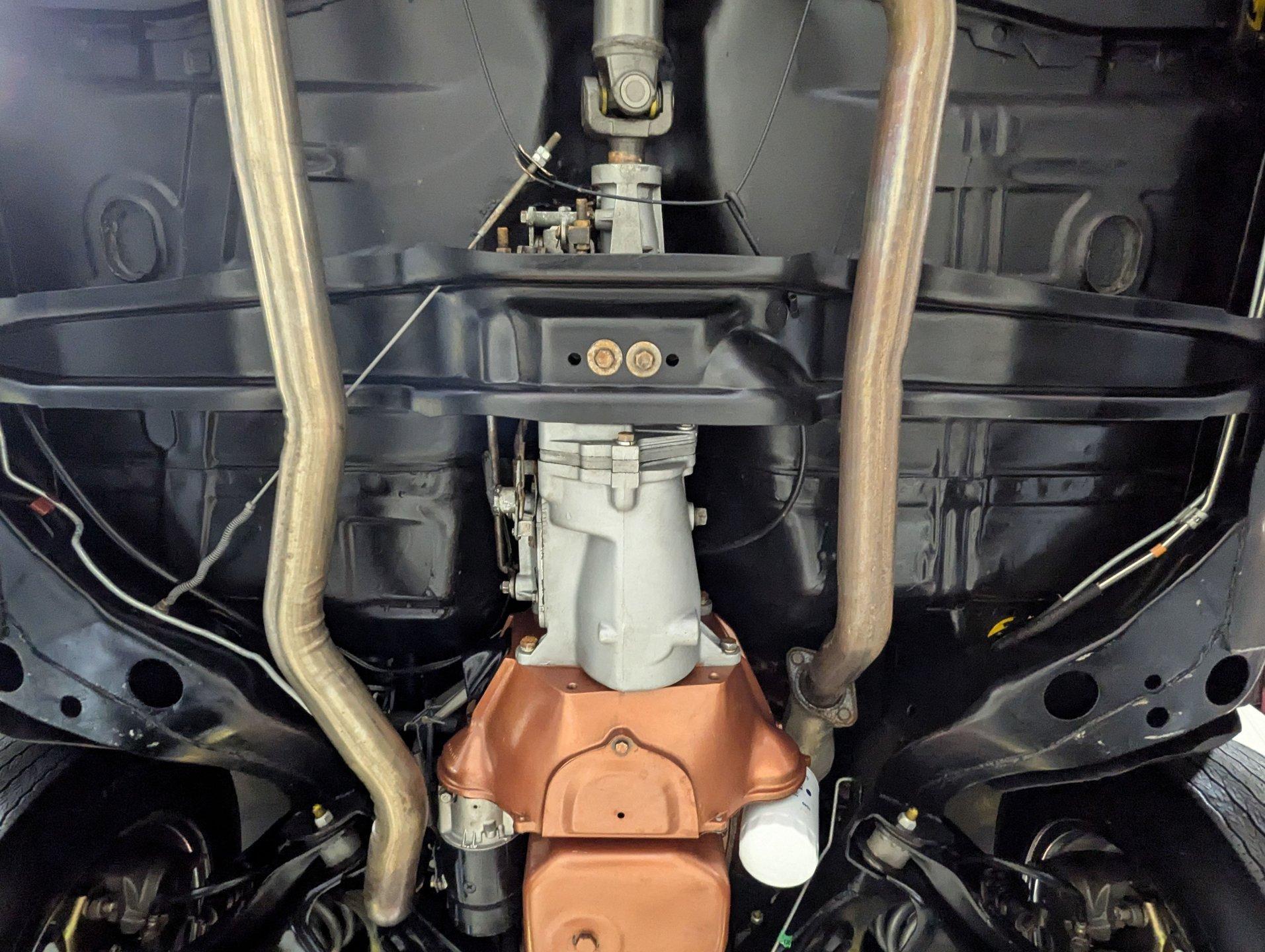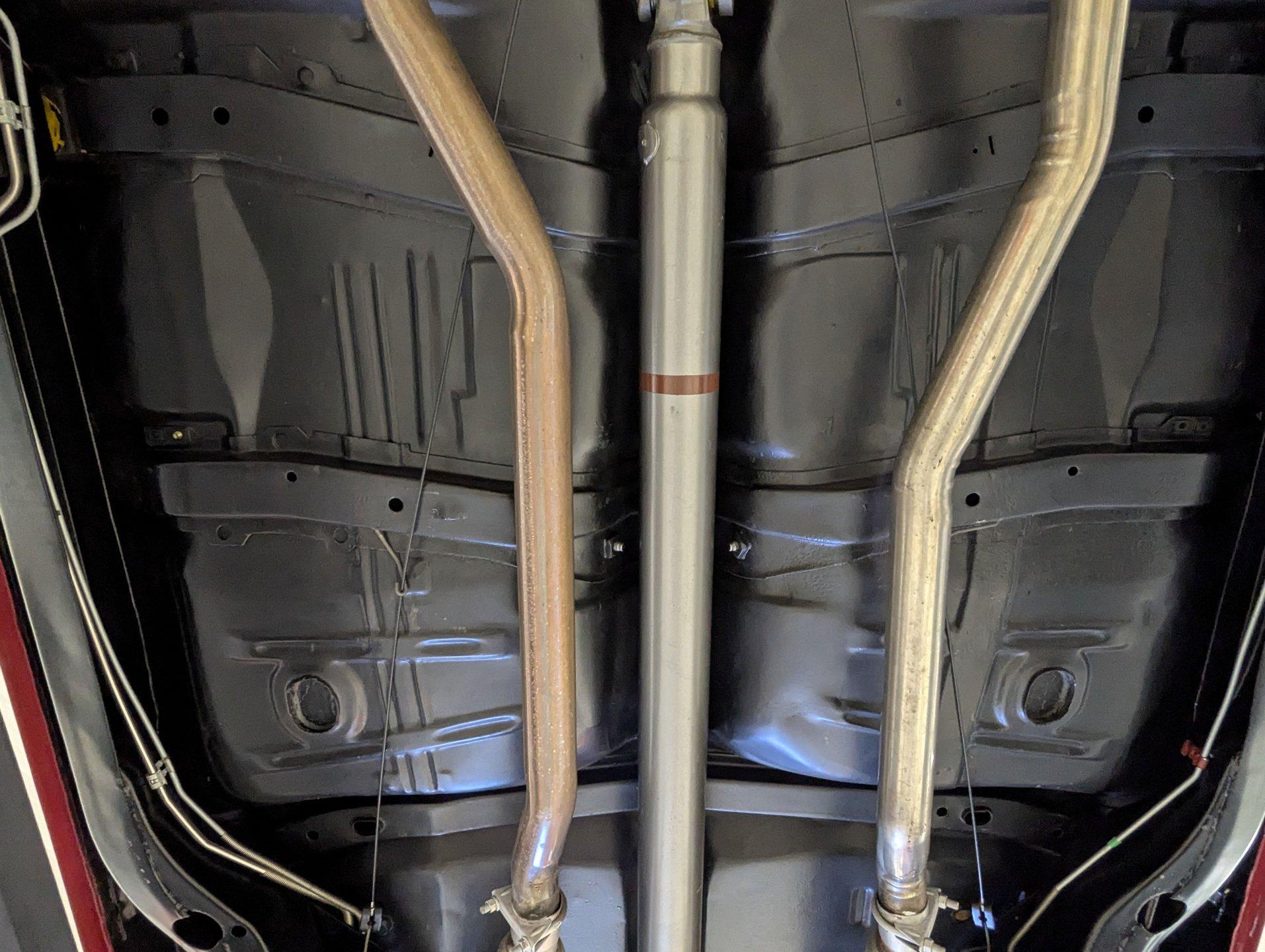 UNDERSIDE: The body was removed from the frame and placed on a rotisserie during the restoration, allowing every detail underneath to be addressed properly. The underside is all original, pristine metal that was carefully scraped, cleaned, and refinished in a smooth satin black, along with the chassis. It's equipped with the rally suspension, including front and rear sway bars and boxed rear control arms, all of which have been completely rebuilt. Even the details are right- factory style spiral shocks and assembly line tags have been reinstalled. The brake system has been fully rebuilt and upgraded with front disc brakes, and the e-brake is hooked up. The fuel system has been replaced, and it features a clean dual exhaust with correct crimped tailpipes and polished tips. It currently has cherry bomb style mufflers, and the correct mufflers are included. Looking up at the drivetrain, everything is clean and proper. The original Muncie wide ratio 4-speed has been rebuilt, and the restored driveshaft leads back to its original posi rear with 3.90 gears, also gone through. This is the kind of underside that will absolutely impress when you see it in person.