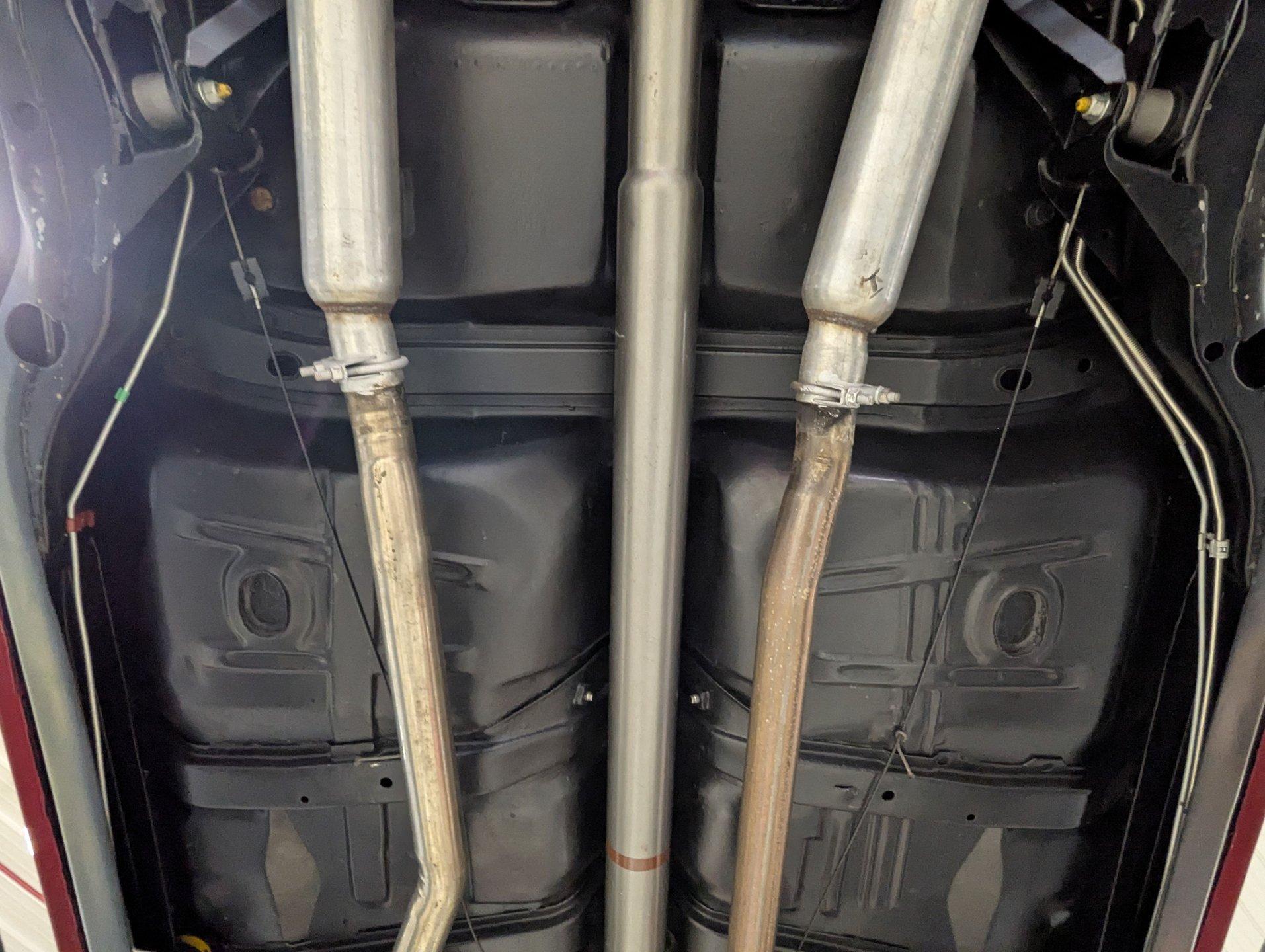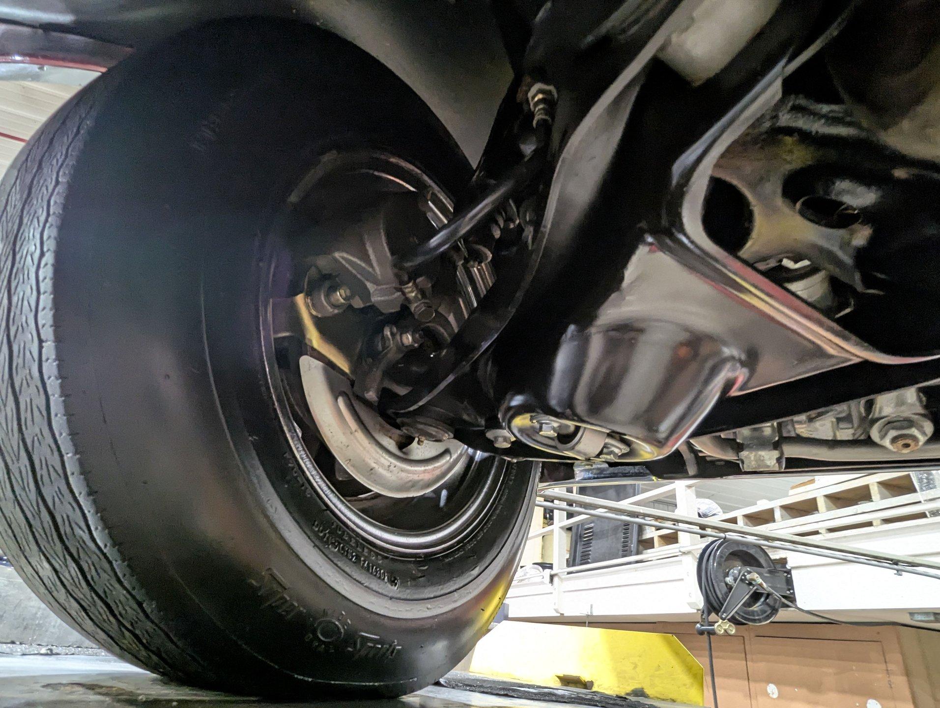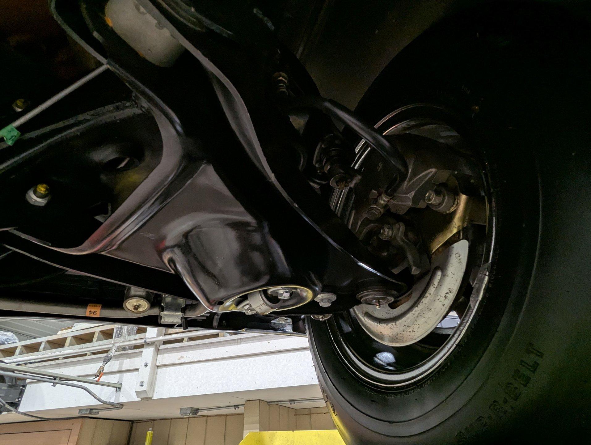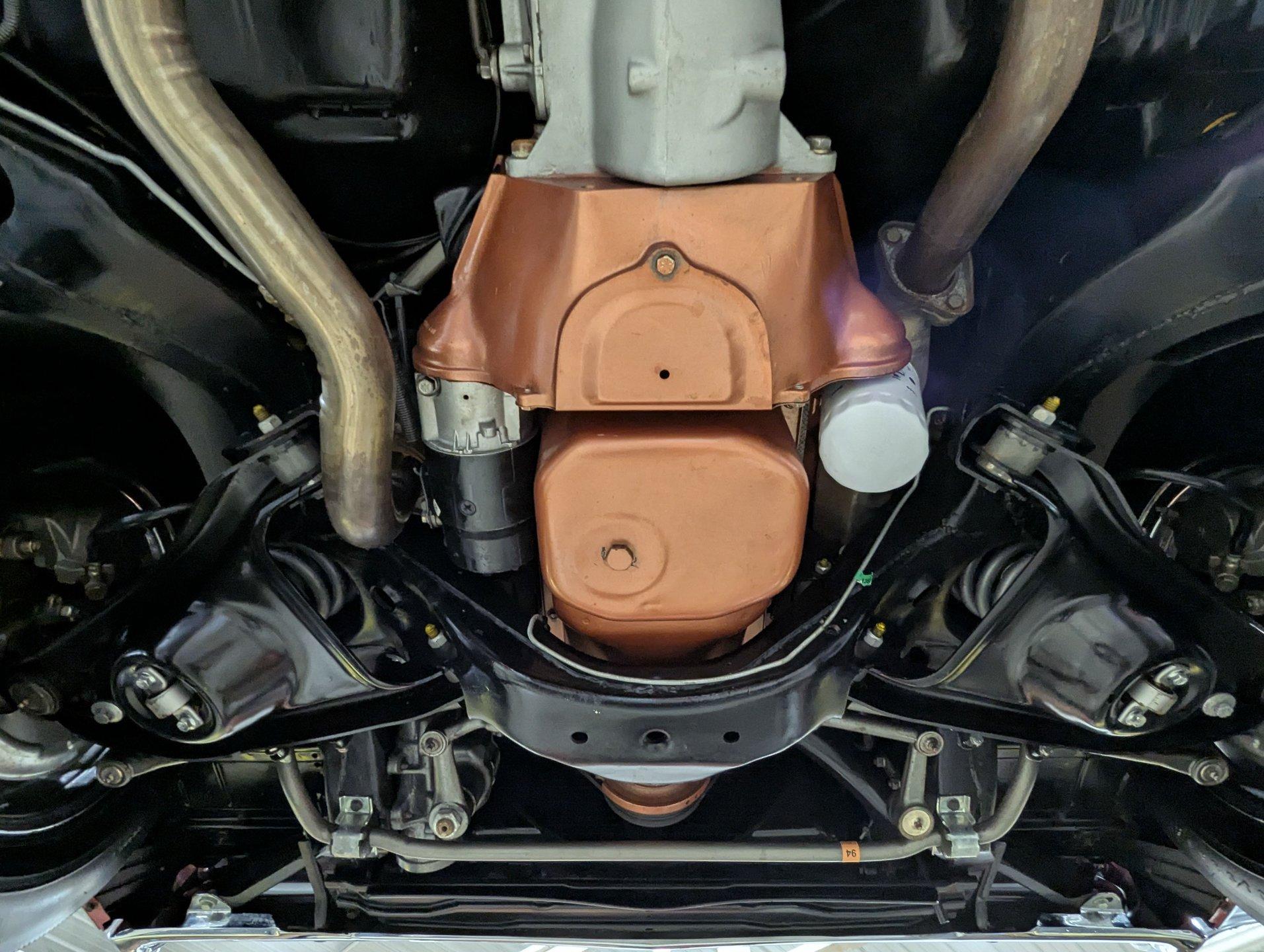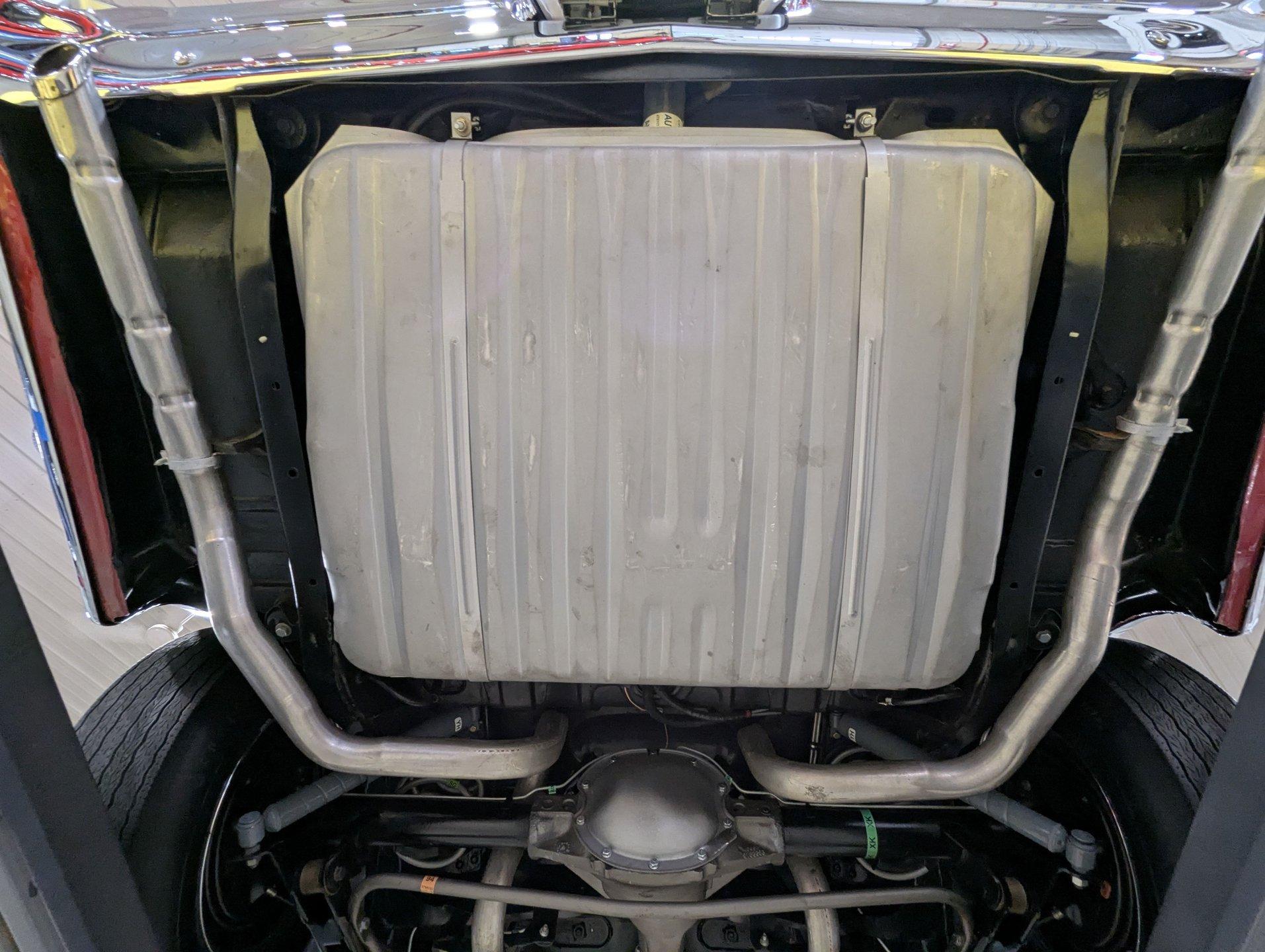 UNDERSIDE: The body was removed from the frame and placed on a rotisserie during the restoration, allowing every detail underneath to be addressed properly. The underside is all original, pristine metal that was carefully scraped, cleaned, and refinished in a smooth satin black, along with the chassis. It's equipped with the rally suspension, including front and rear sway bars and boxed rear control arms, all of which have been completely rebuilt. Even the details are right- factory style spiral shocks and assembly line tags have been reinstalled. The brake system has been fully rebuilt and upgraded with front disc brakes, and the e-brake is hooked up. The fuel system has been replaced, and it features a clean dual exhaust with correct crimped tailpipes and polished tips. It currently has cherry bomb style mufflers, and the correct mufflers are included. Looking up at the drivetrain, everything is clean and proper. The original Muncie wide ratio 4-speed has been rebuilt, and the restored driveshaft leads back to its original posi rear with 3.90 gears, also gone through. This is the kind of underside that will absolutely impress when you see it in person.
