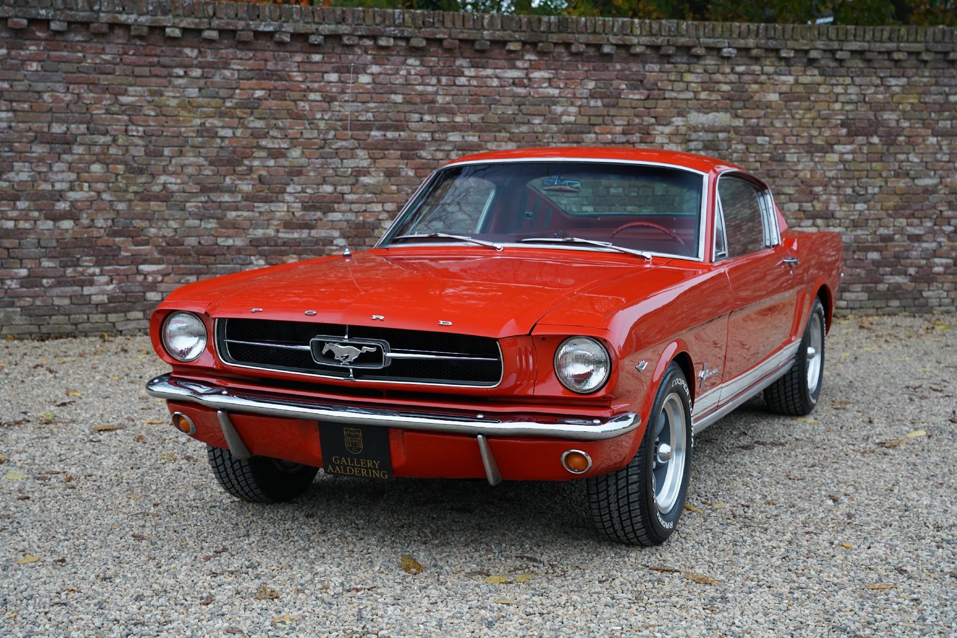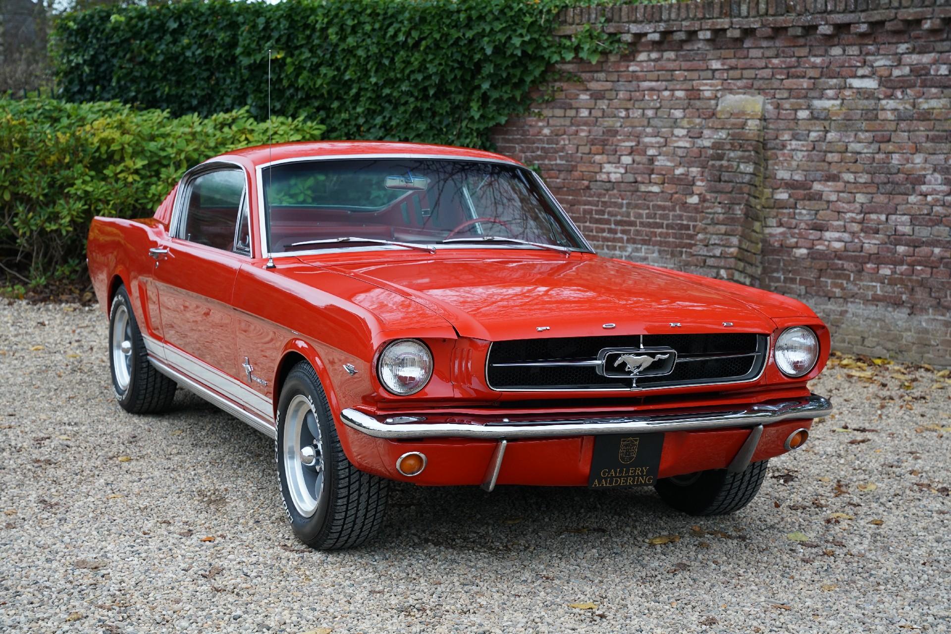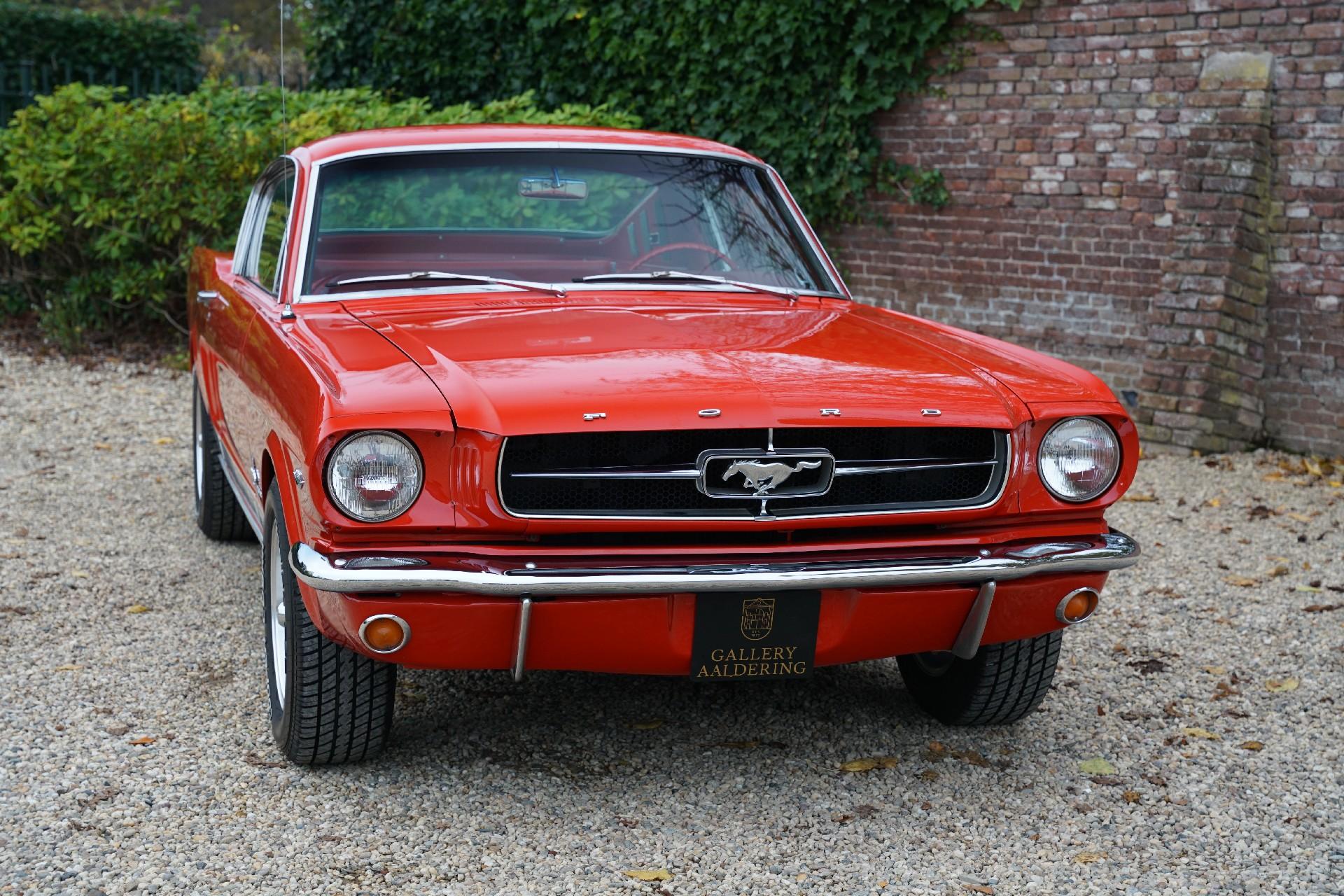 Our car is a so-called red over red example and is a feast to behold. This car has already been fully restored and is in a fine state. The nice and thin panelwork is correctly aligned and looks amazing. The chrome brightwork also fits well and looks great. The car has its original steel rims with the original hubcaps all shod in correctly sized rubber. The Mustang has been sprayed in the timeless “Rangoon Red” finish. The paintwork was particularly well redone at the time of restoration and has remained in splendid condition.