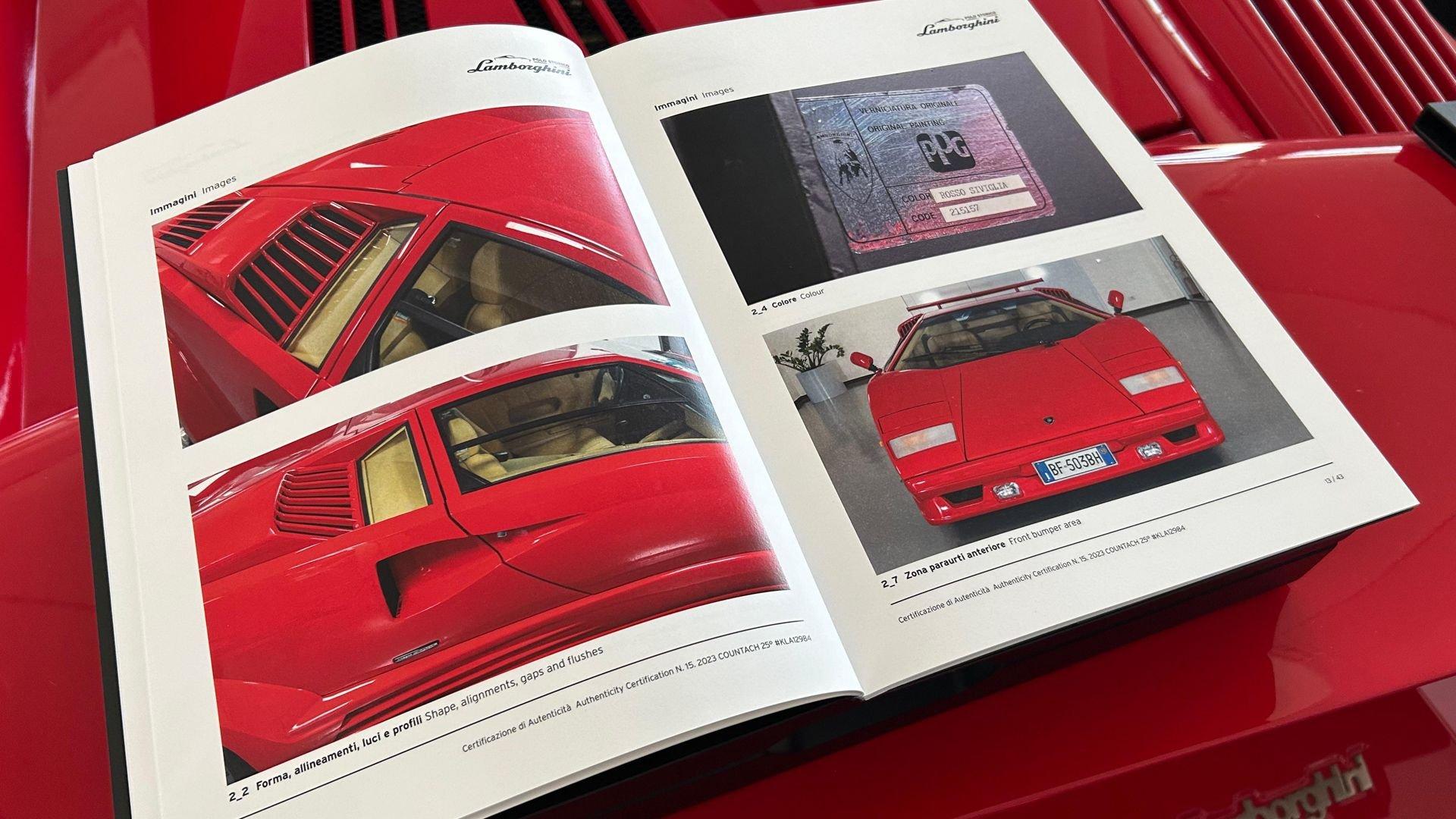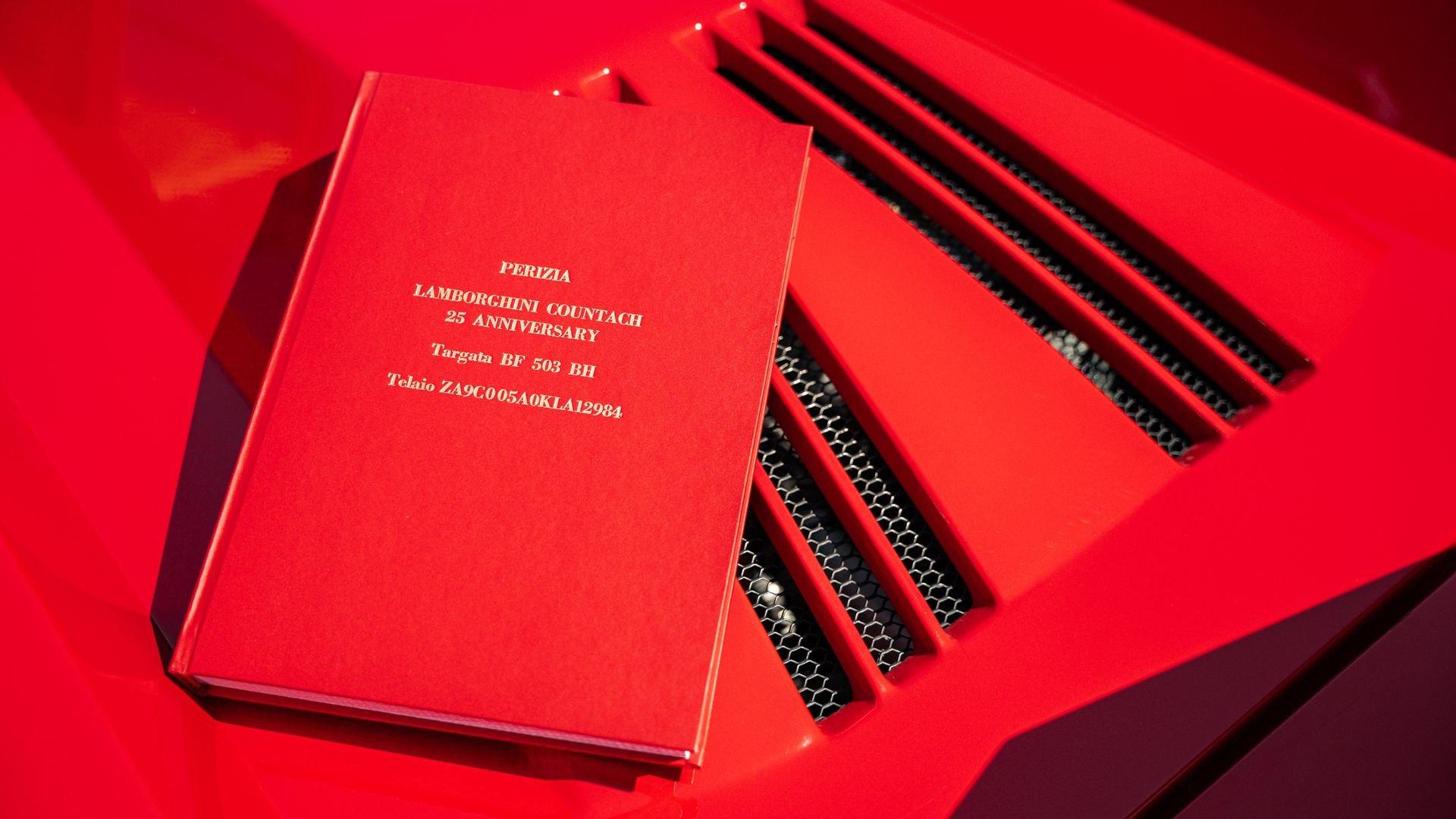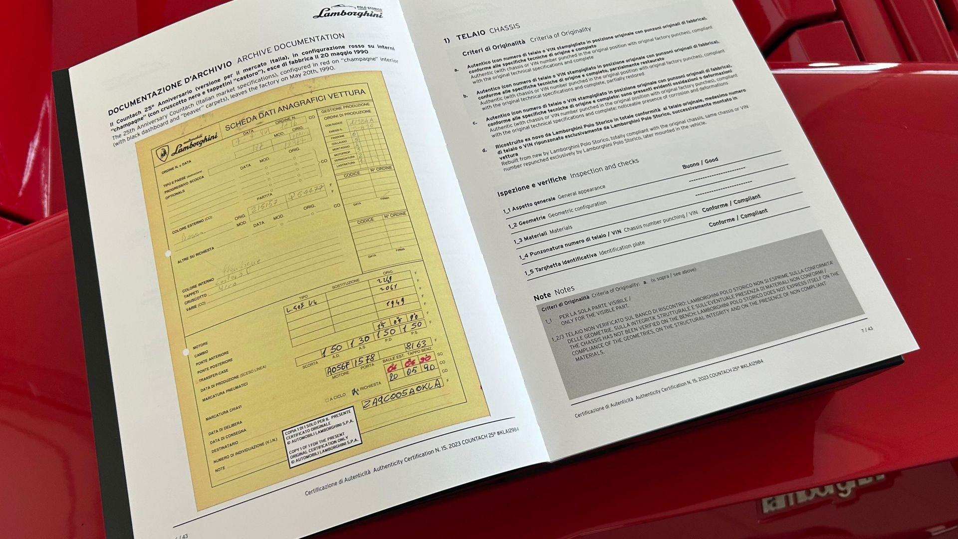 Factory-certified and award-winning, this 1990 Lamborghini Countach 25th Anniversario is now offered with just 22,616 kilometers at cataloging. It is furnished with its essential Polo Storico certificate, two keys, owner's manuals plus maintenance guide in leather pouch, trophies, and copies of the Ruoteclassiche, Youngclassic, and Classic Club Italia magazines it has been featured in.