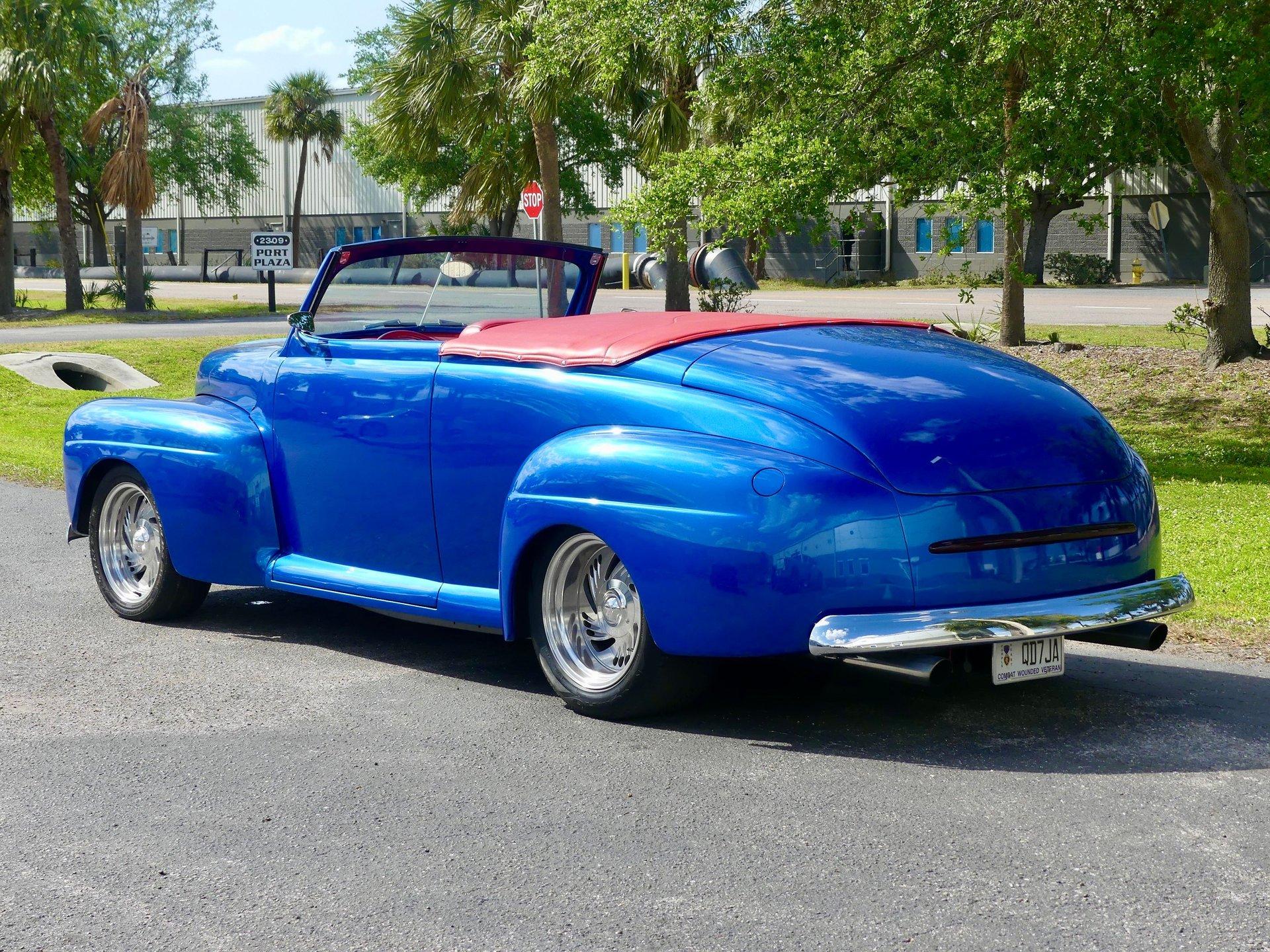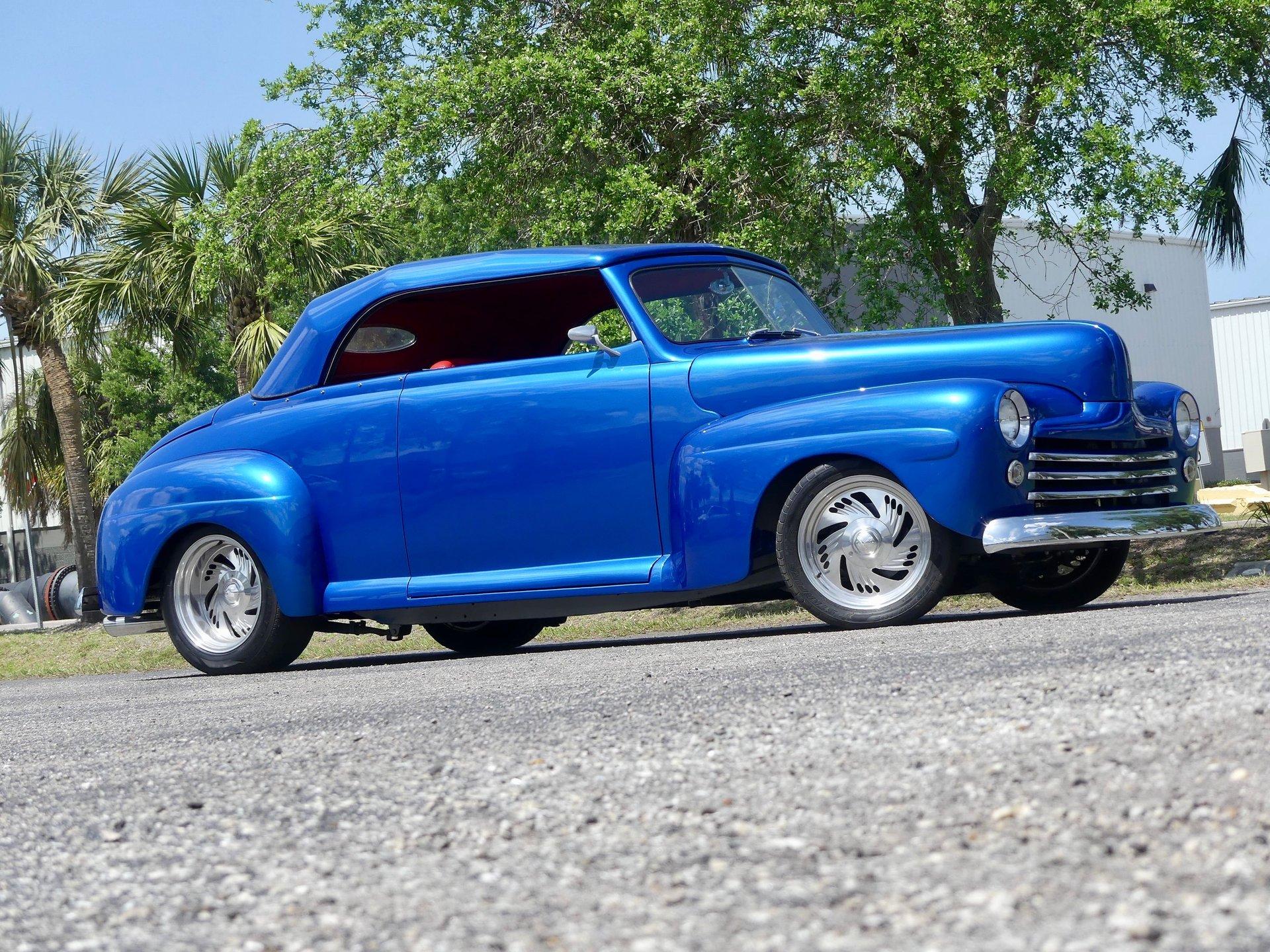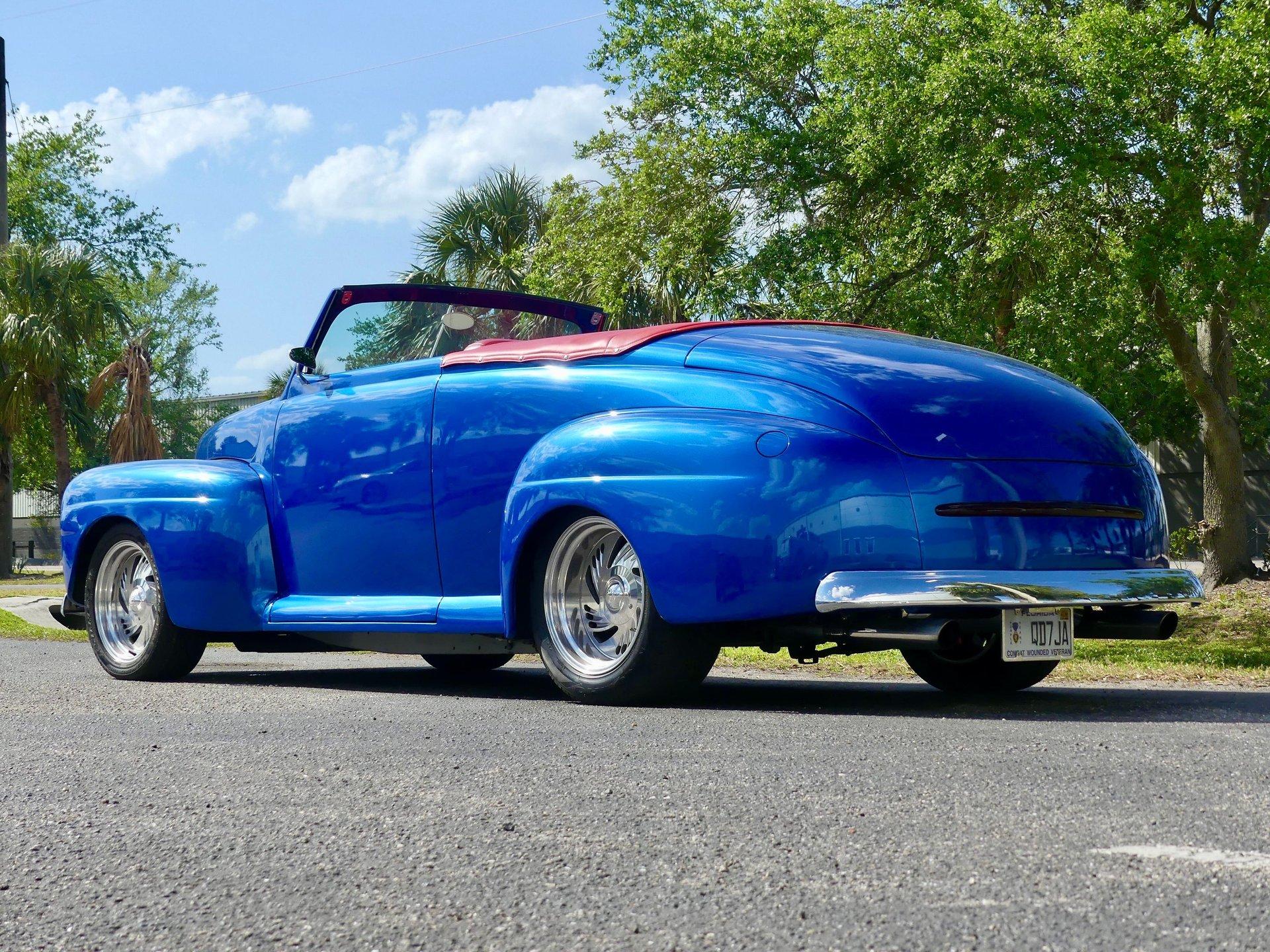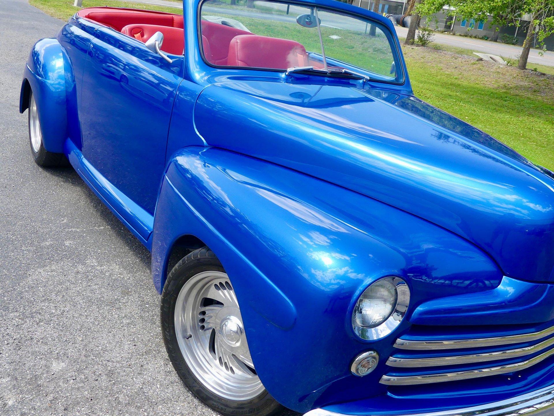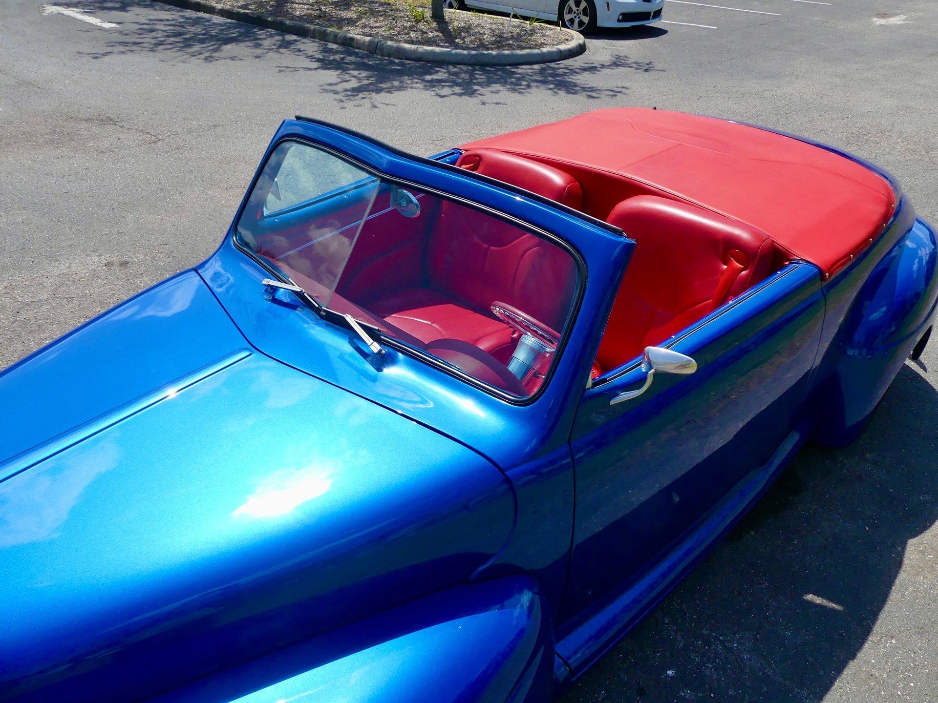 This awesome 1948 Ford street rod is a totally custom convertible, with a one off removable hard top and custom roadster tonneau cover. It is painted in a beautiful bright blue metallic paint that shines like a diamond in the sun. Shaved door handles and a custom single tail light let you know right away that she is far from stock! You can also raise the power trunk lid with the flick of a switch.