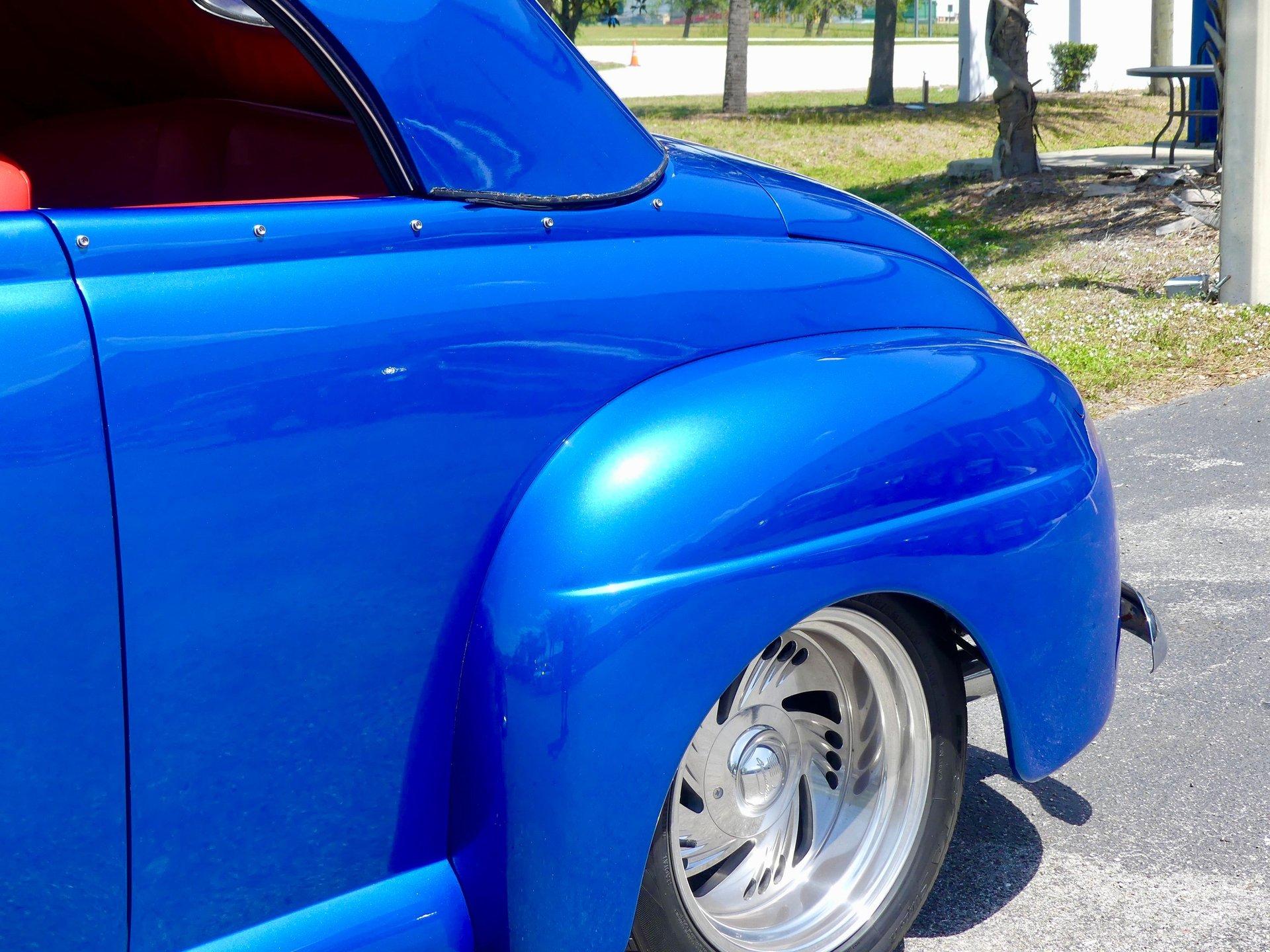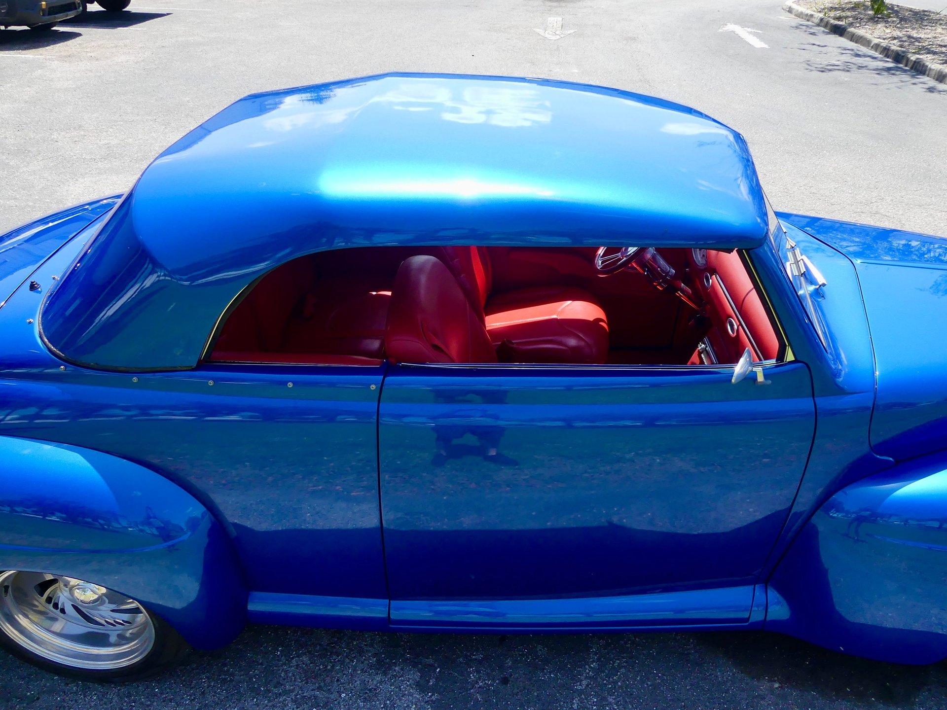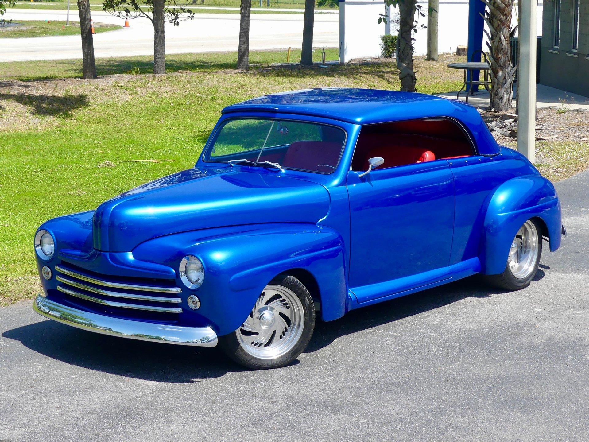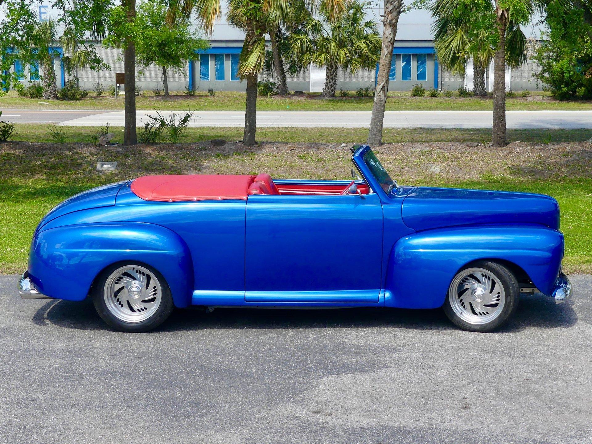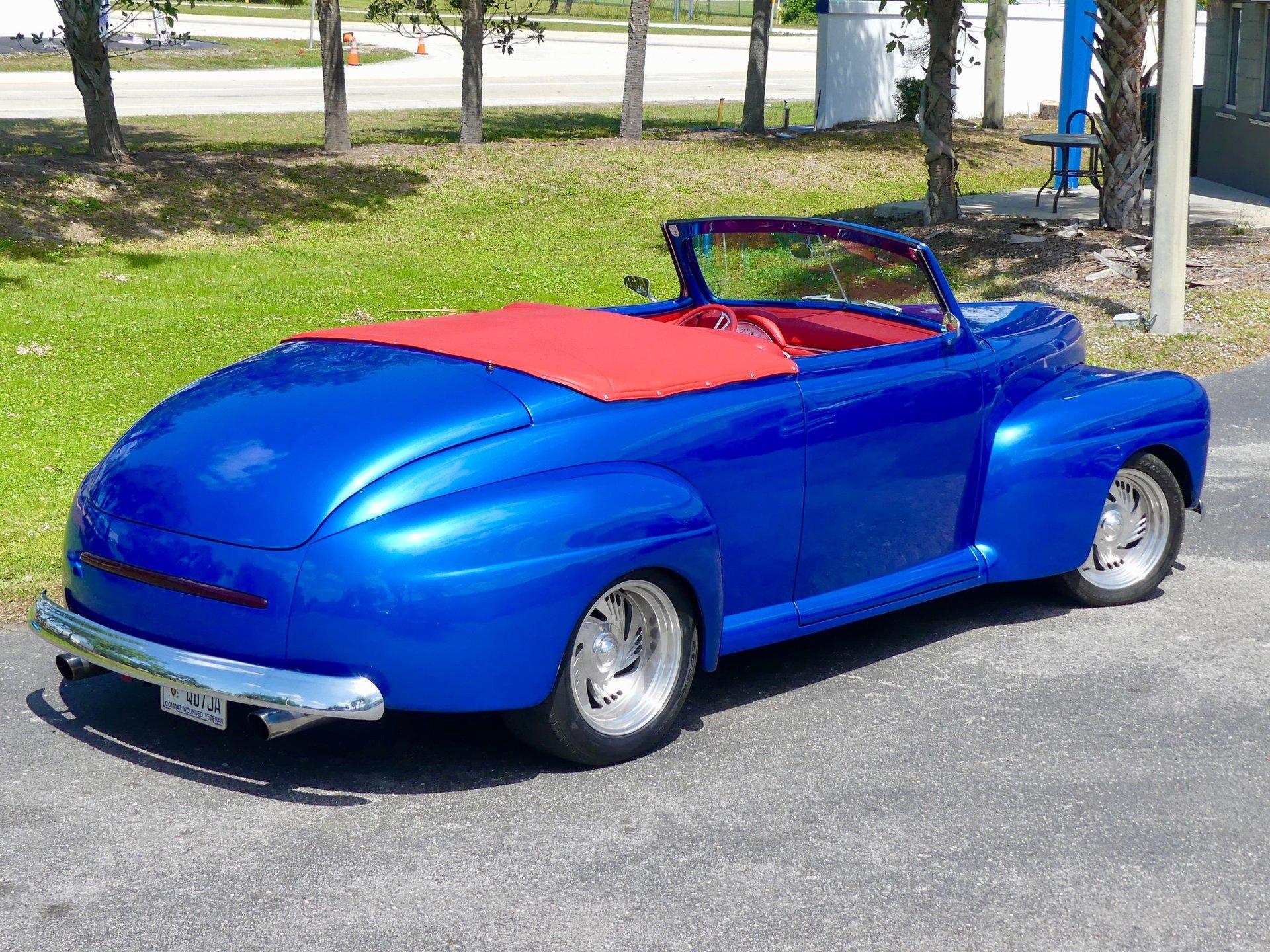 This awesome 1948 Ford street rod is a totally custom convertible, with a one off removable hard top and custom roadster tonneau cover. It is painted in a beautiful bright blue metallic paint that shines like a diamond in the sun. Shaved door handles and a custom single tail light let you know right away that she is far from stock! You can also raise the power trunk lid with the flick of a switch.