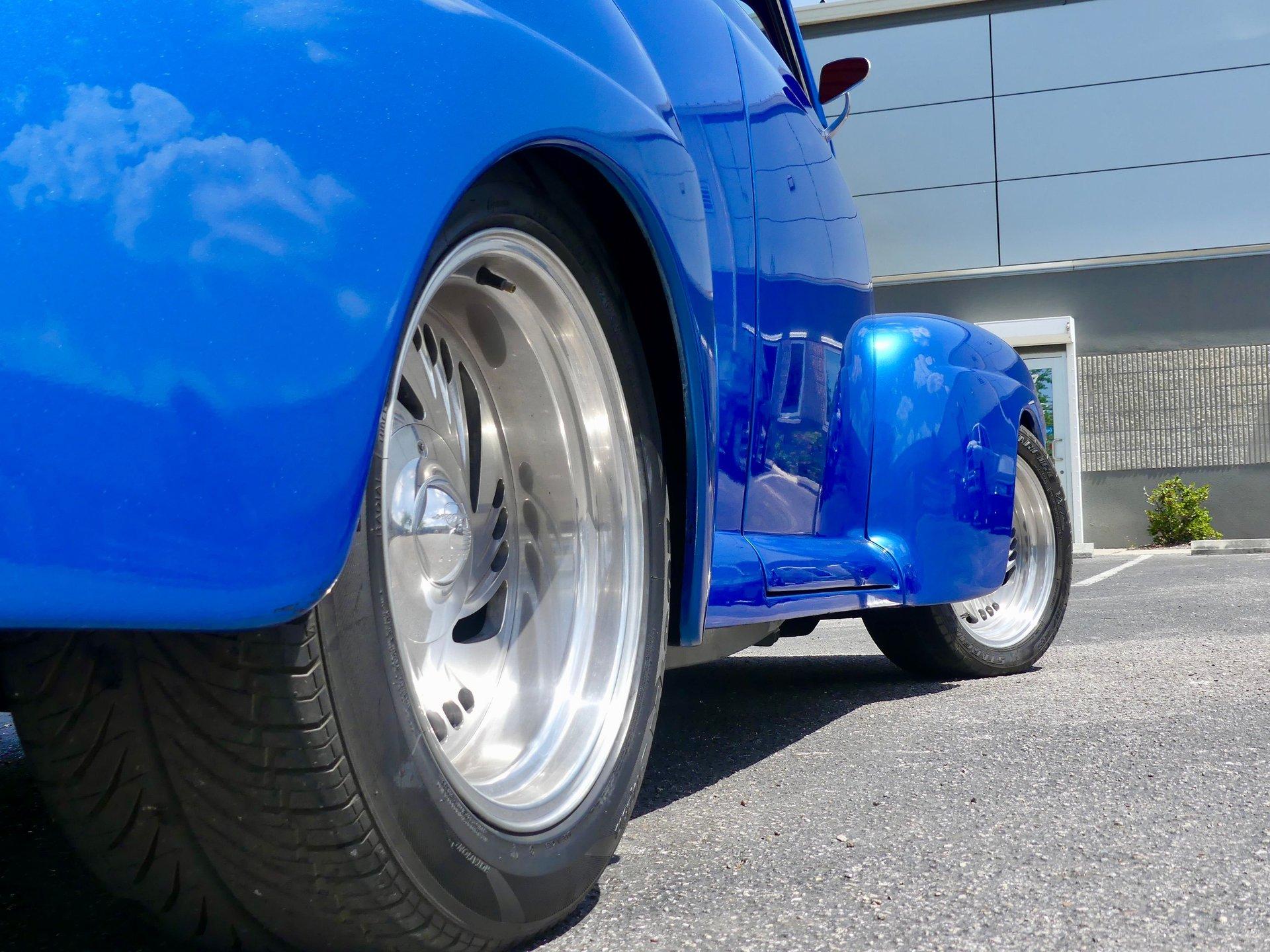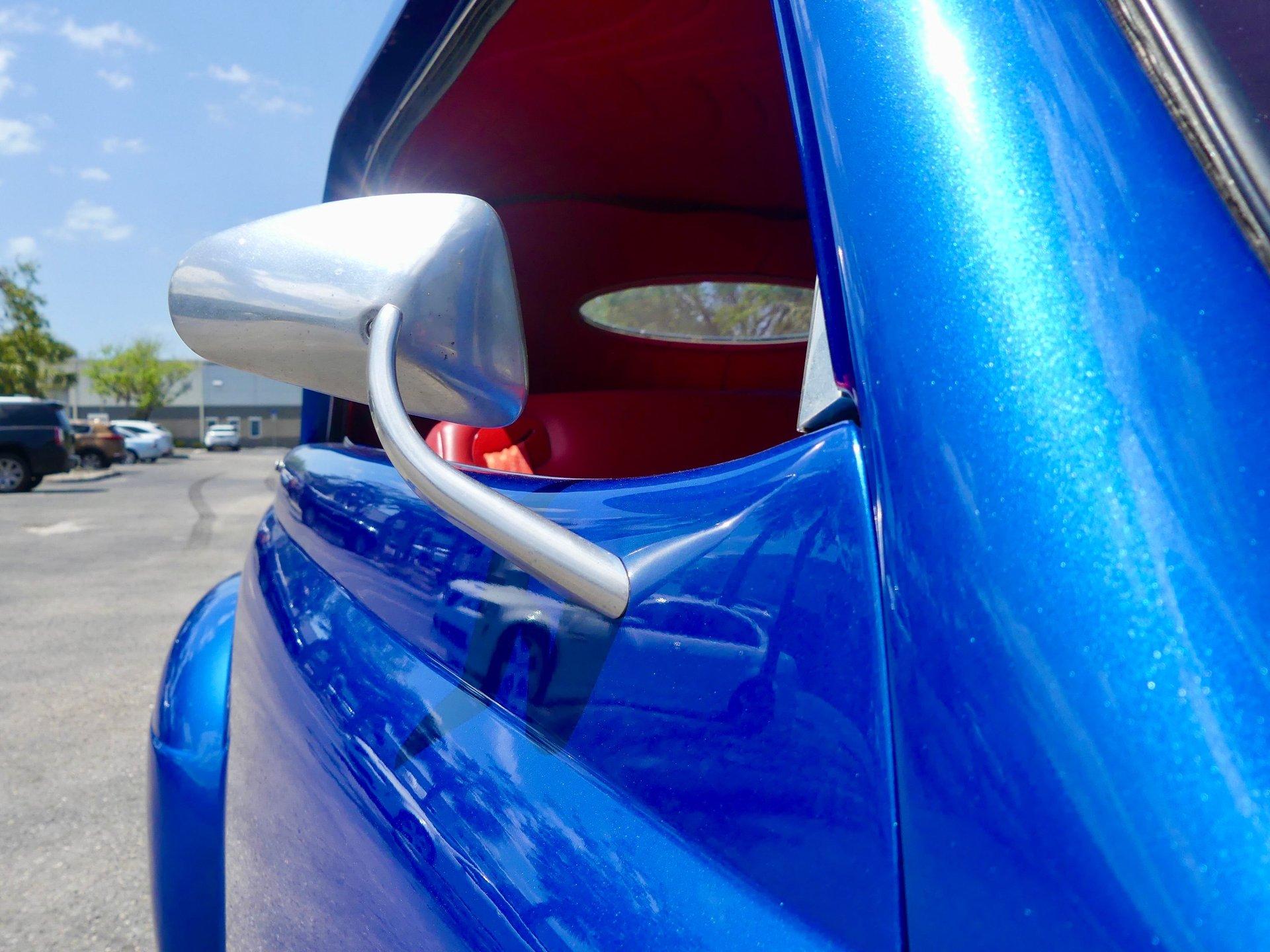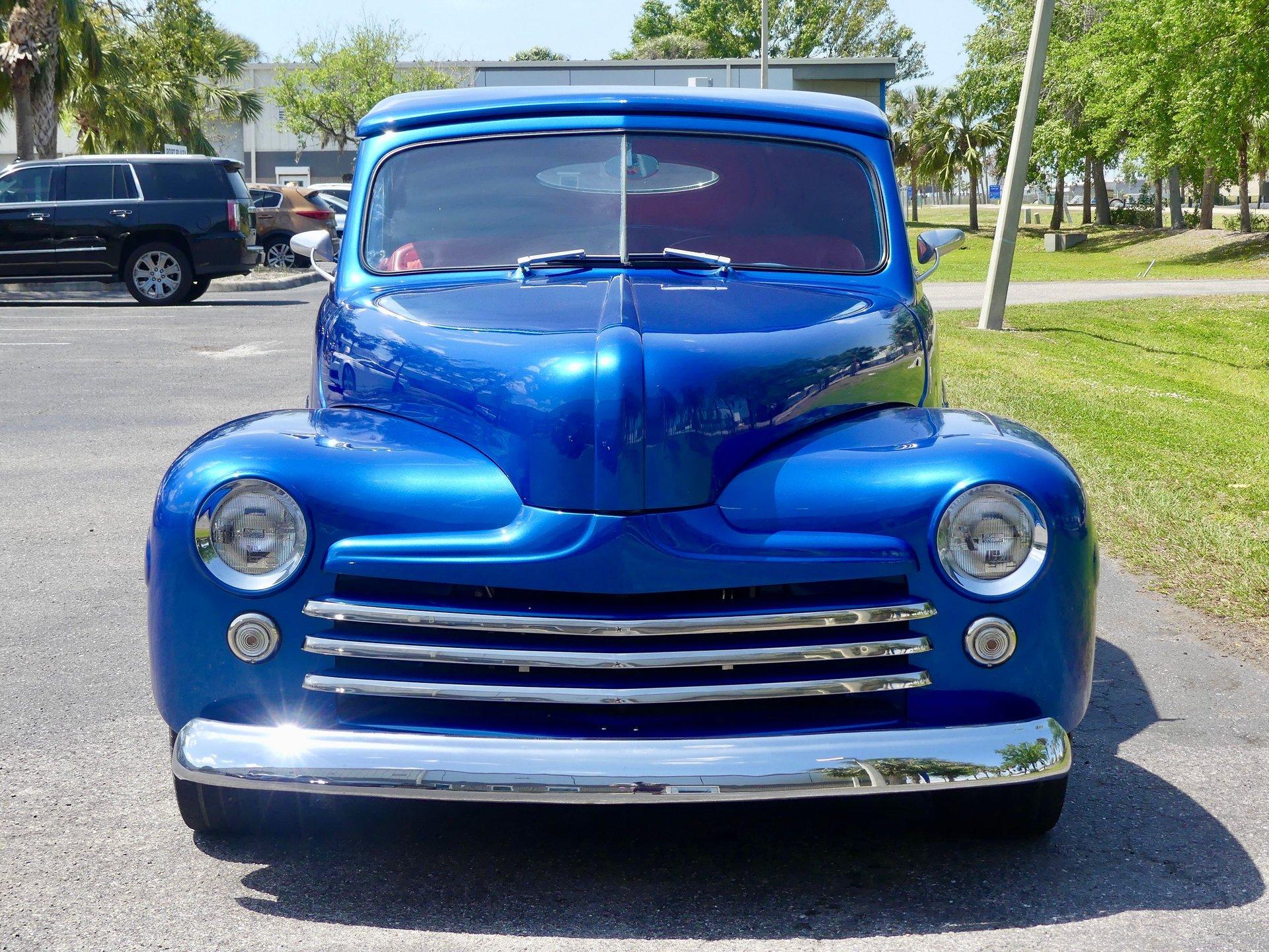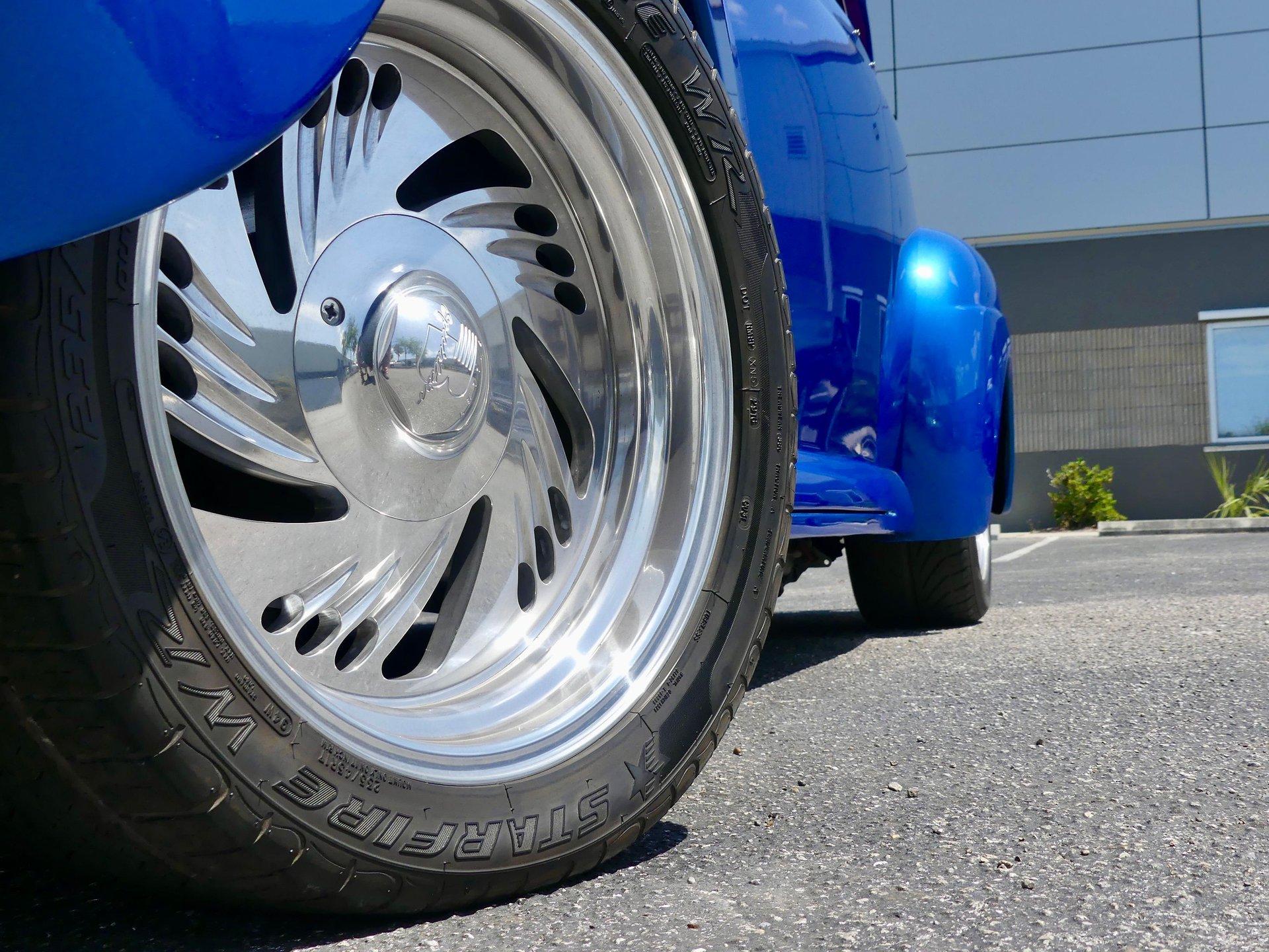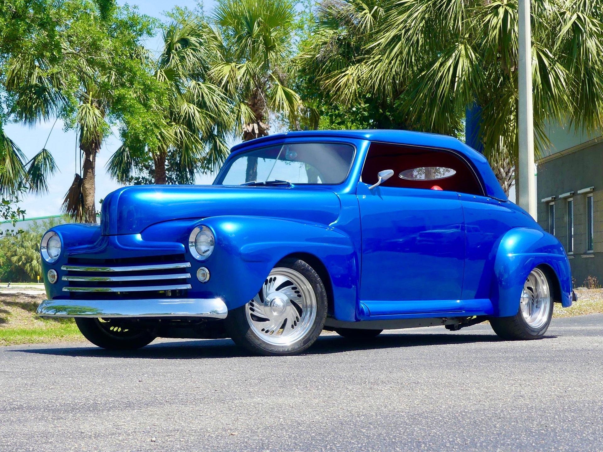This awesome 1948 Ford street rod is a totally custom convertible, with a one off removable hard top and custom roadster tonneau cover. It is painted in a beautiful bright blue metallic paint that shines like a diamond in the sun. Shaved door handles and a custom single tail light let you know right away that she is far from stock! You can also raise the power trunk lid with the flick of a switch.