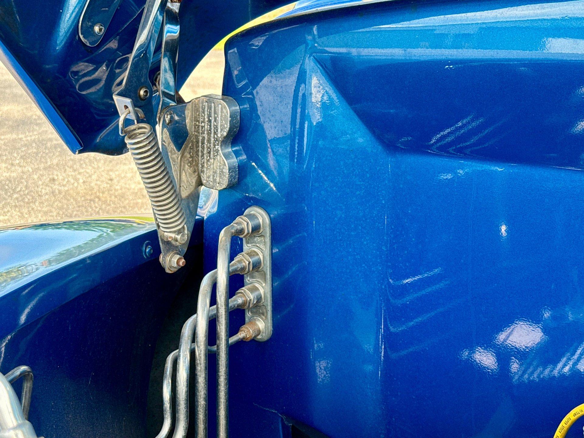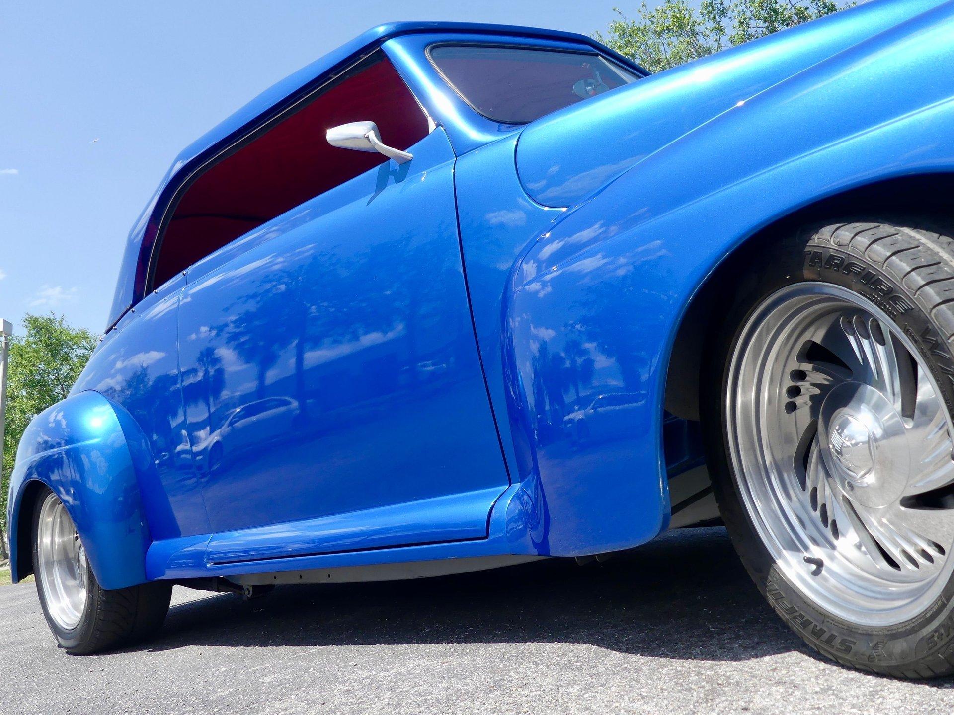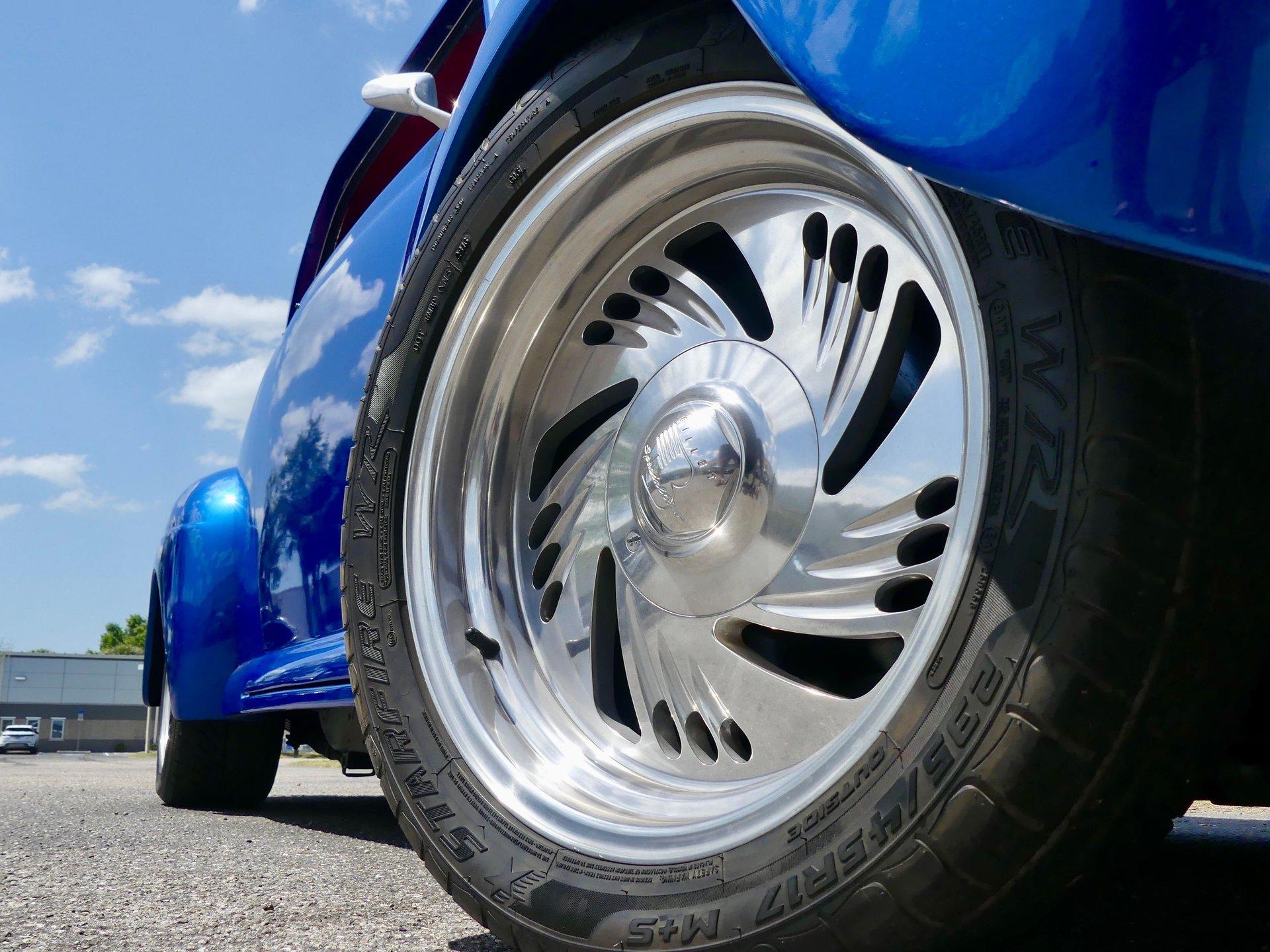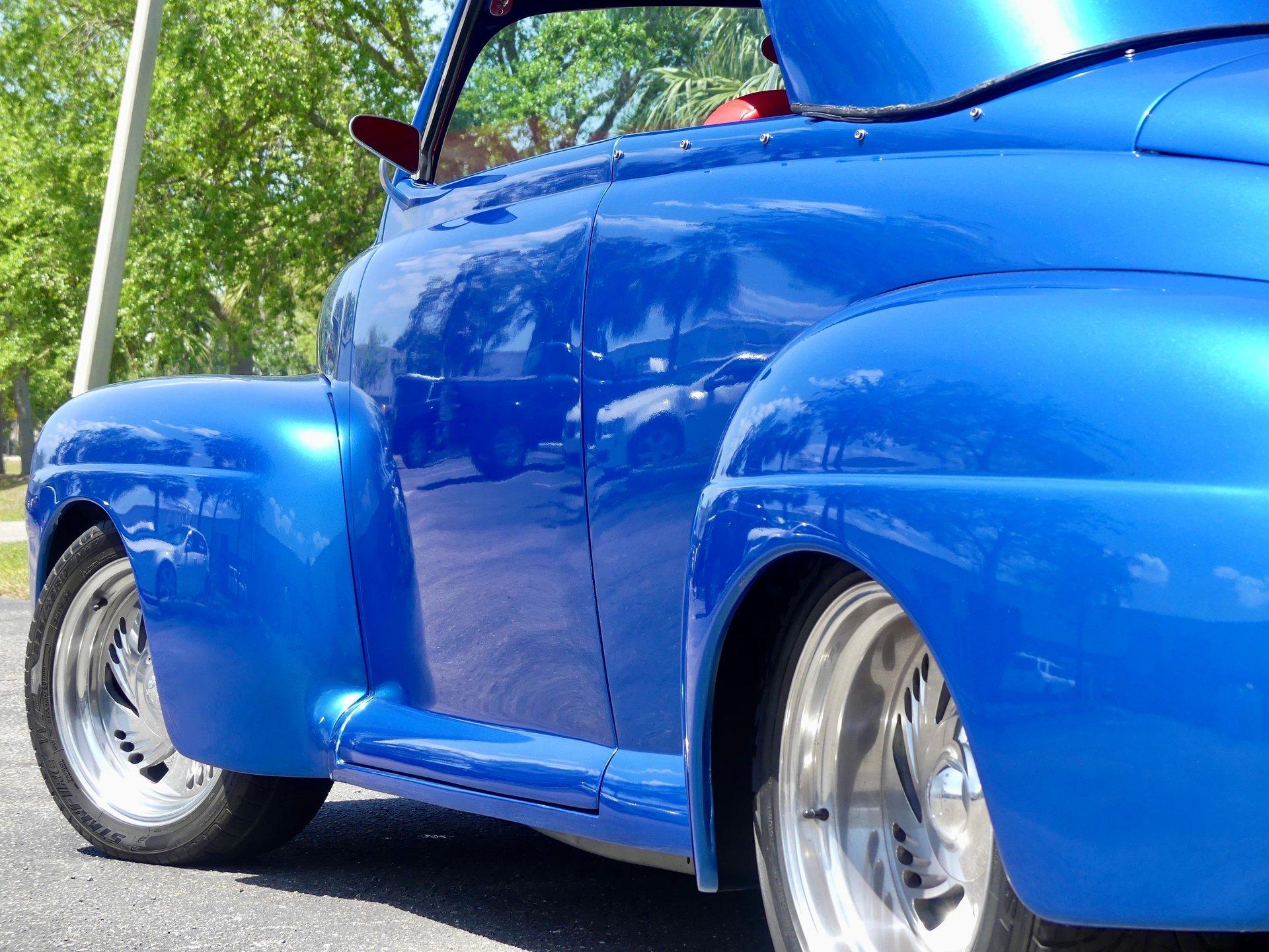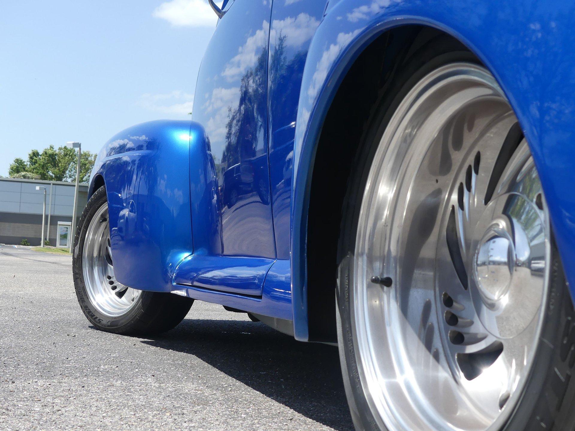 This awesome 1948 Ford street rod is a totally custom convertible, with a one off removable hard top and custom roadster tonneau cover. It is painted in a beautiful bright blue metallic paint that shines like a diamond in the sun. Shaved door handles and a custom single tail light let you know right away that she is far from stock! You can also raise the power trunk lid with the flick of a switch.