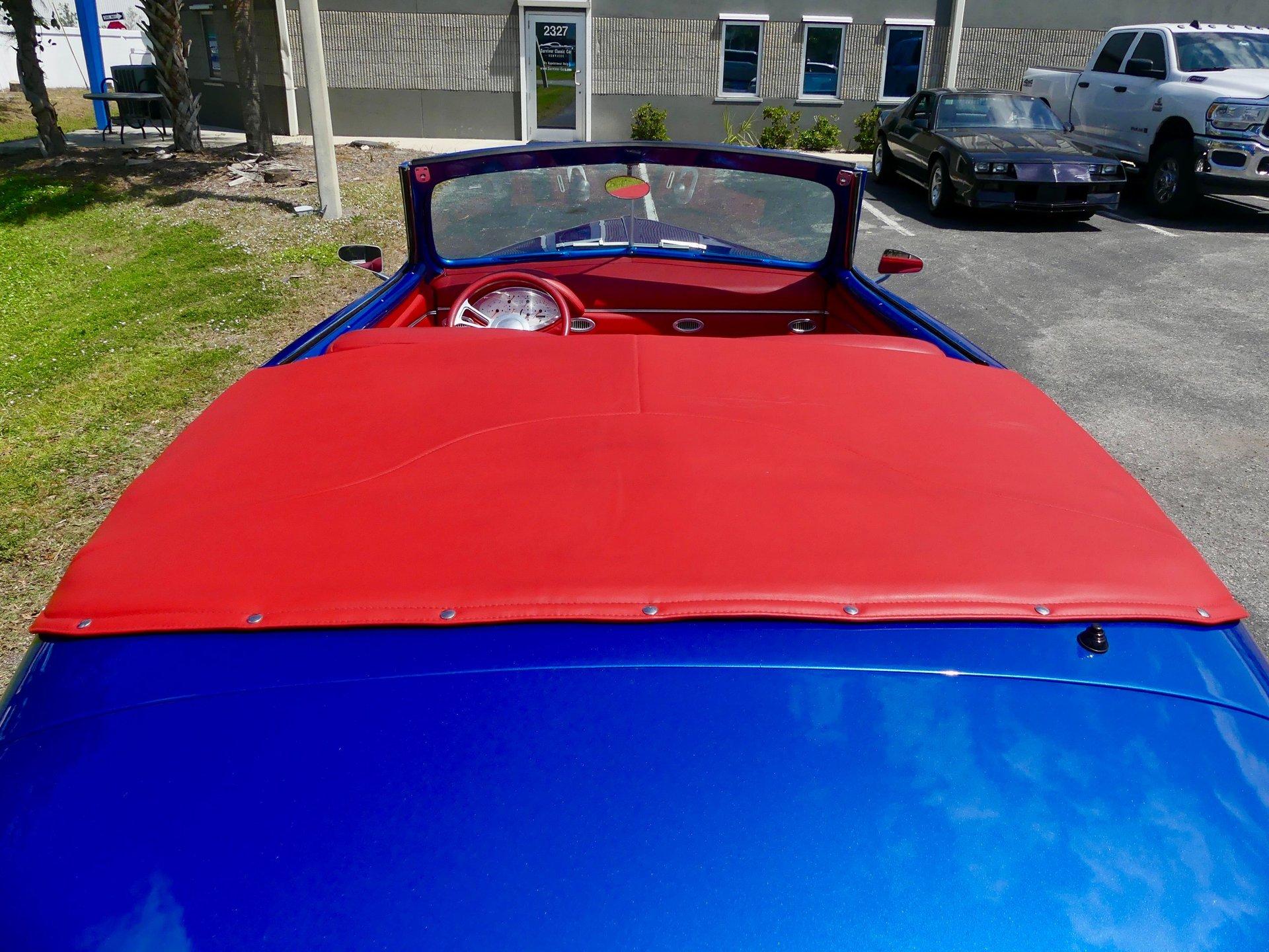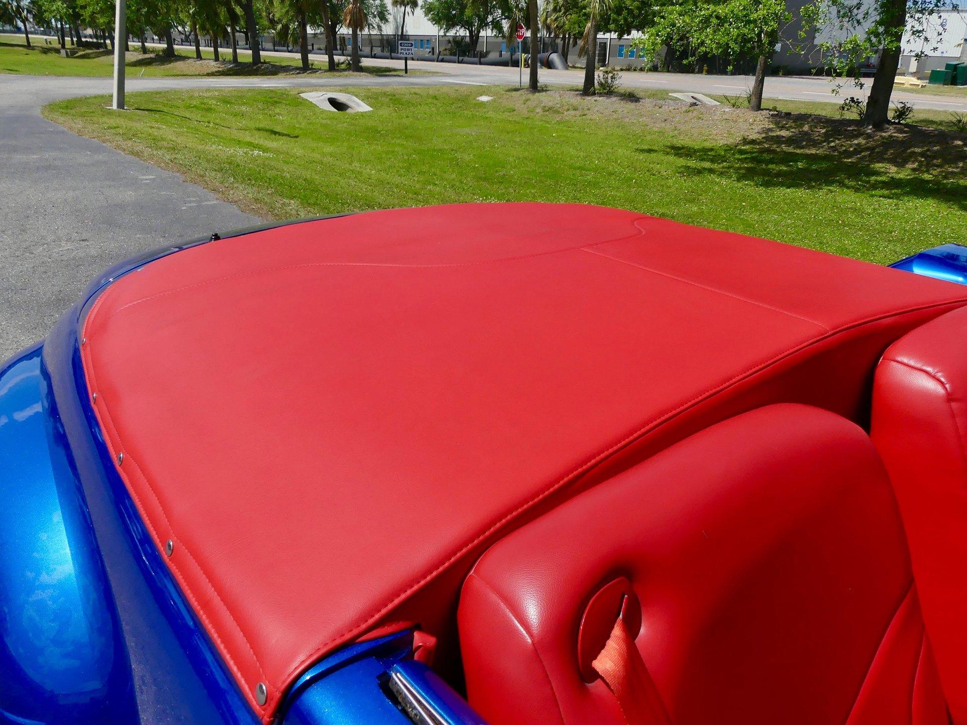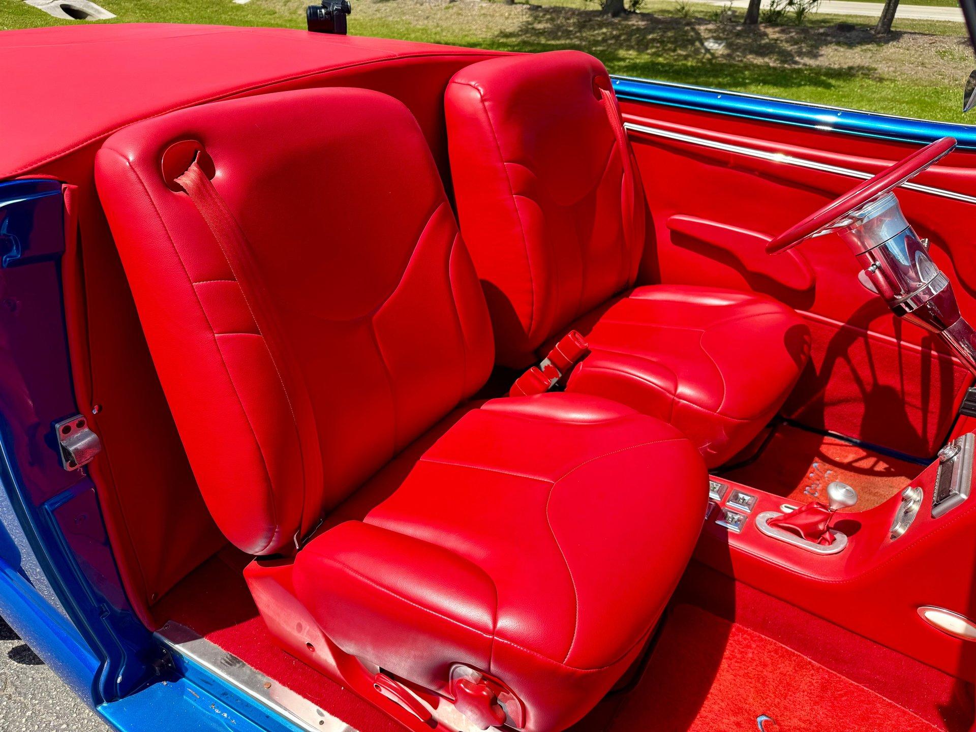 Red ultra leather custom interior, power seats, with power windows the hard top make this one cool custom street rod. Vintage Air is installed to keep you cool when the roof is on as well. The interior also features bucket seats, billet tilt steering column, custom center console, aftermarket white faced gauges and a JVC CD stereo. This is a real show stopper of a car and is sure to get you a trophy at your local cruise in. It is a cool piece of automotive history. With no expense spared, never driven in rain, Florida ownership car with a clean and clear title.