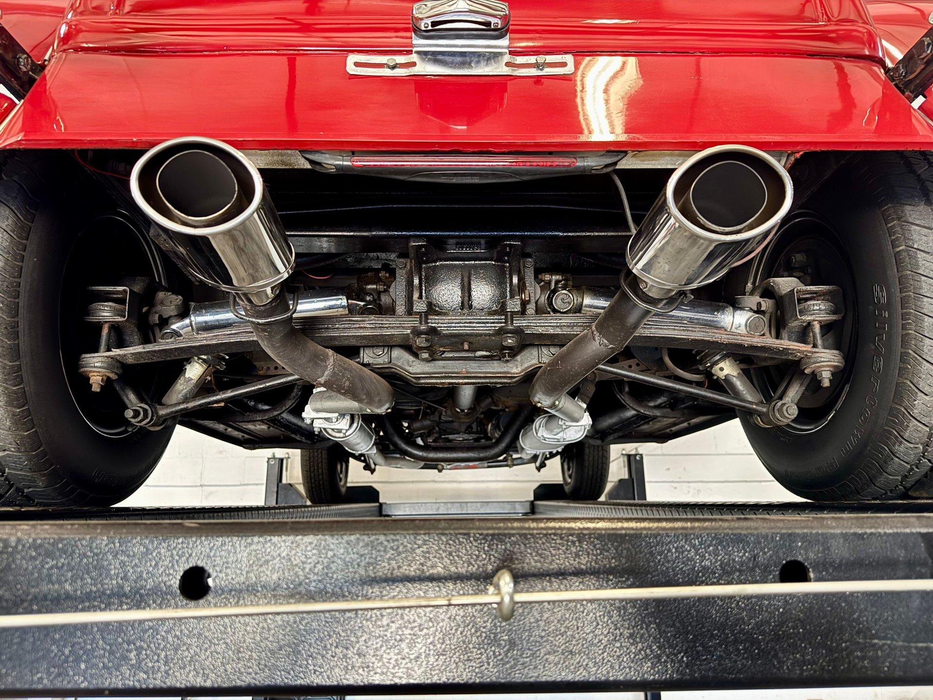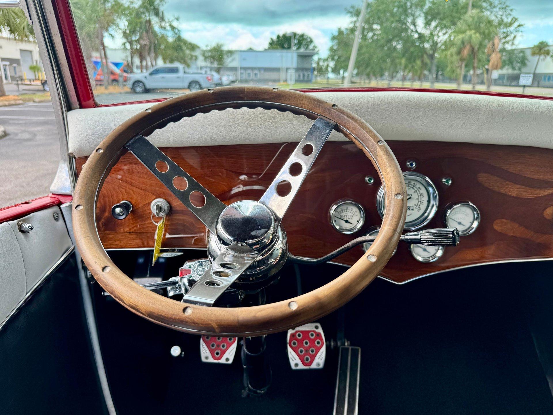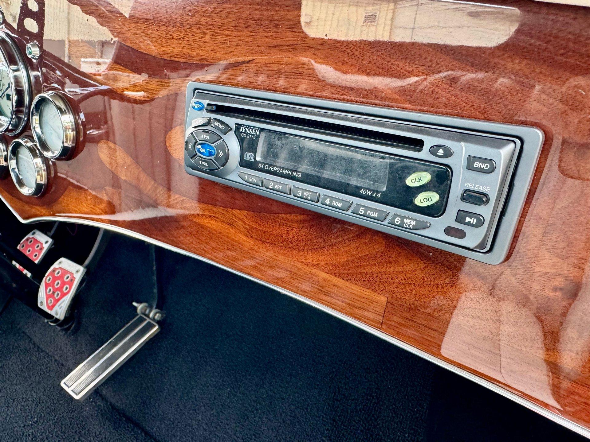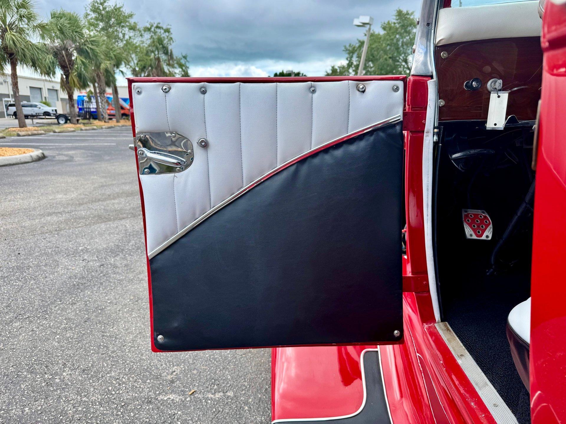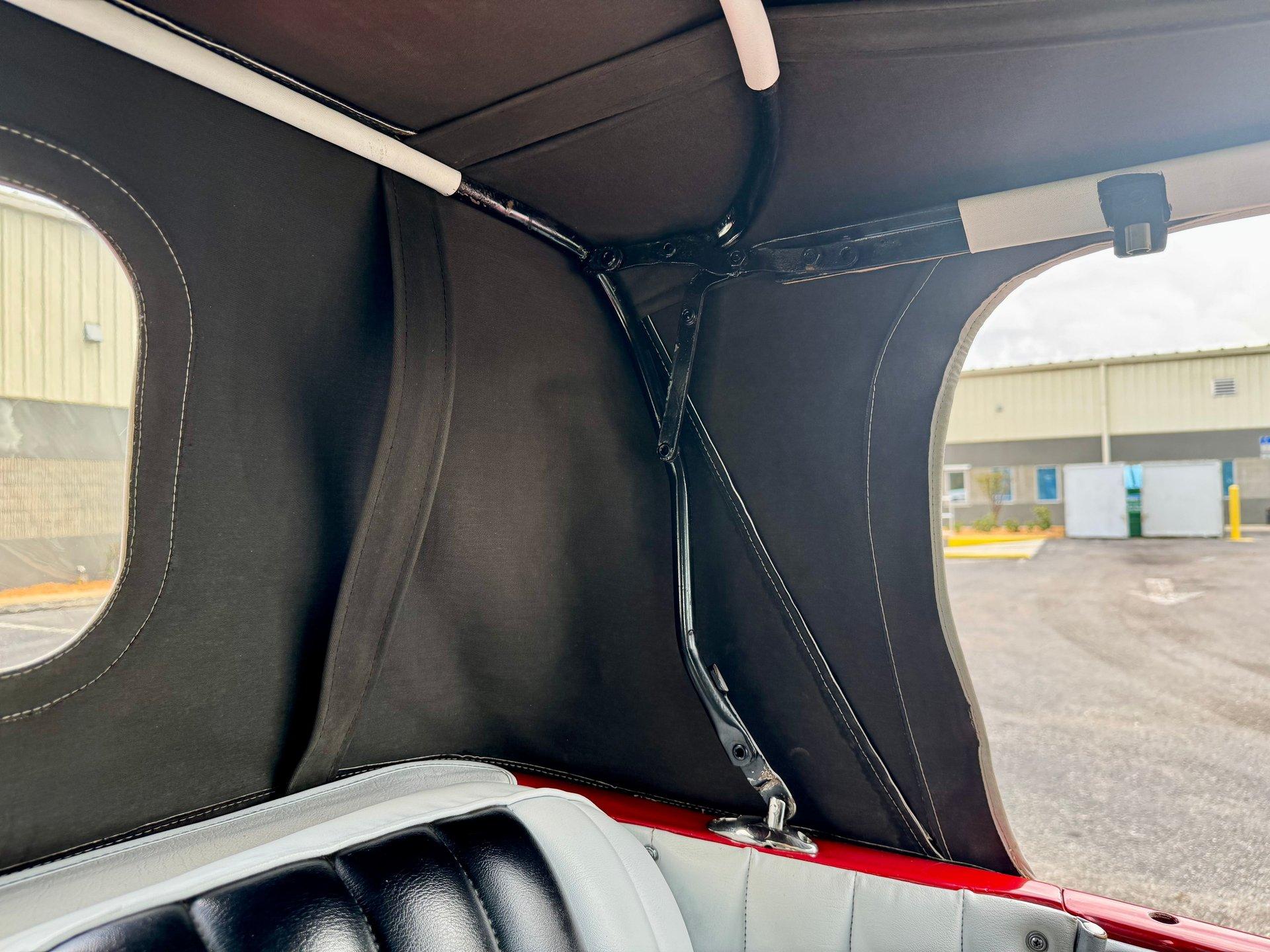 The custom two toned black and white vinyl interior looks great with the top on or off. The beautiful woodgrain dash is accented nicely by Classic Instruments white faced gauges and an aftermarket AM FM CD stereo. The stationary steering column has a custom steering wheel and also features an ahooga horn for an awesome vintage feel!