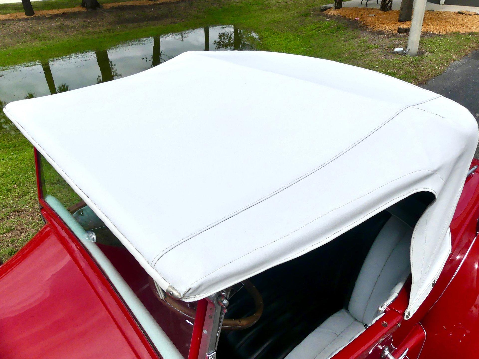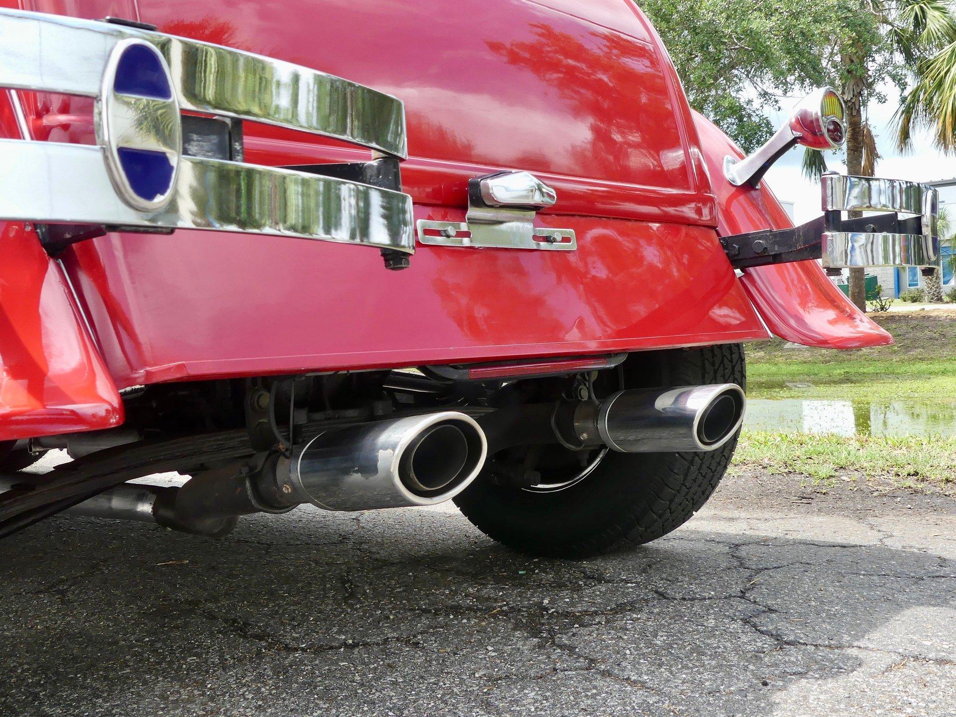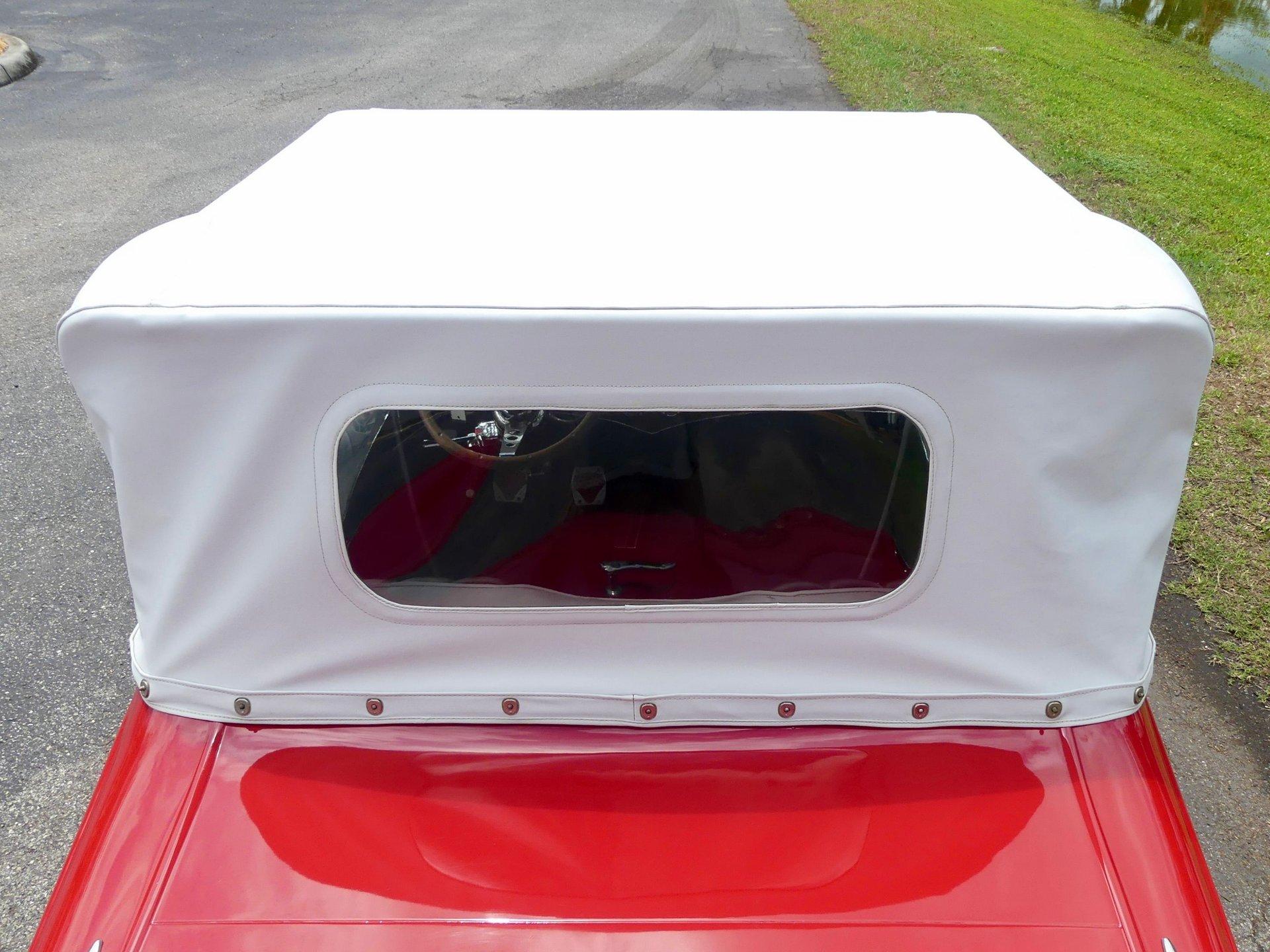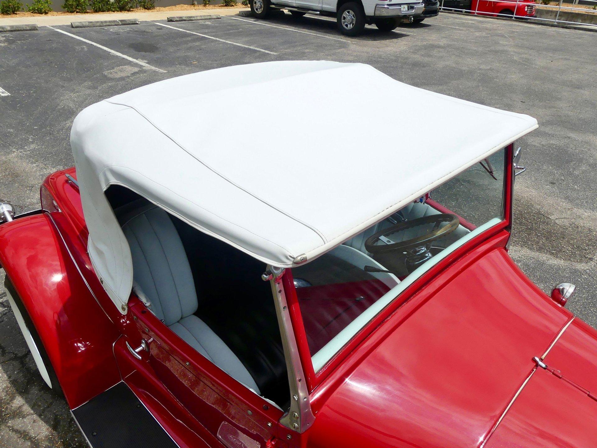 The custom two toned black and white vinyl interior looks great with the top on or off. The beautiful woodgrain dash is accented nicely by Classic Instruments white faced gauges and an aftermarket AM FM CD stereo. The stationary steering column has a custom steering wheel and also features an ahooga horn for an awesome vintage feel!