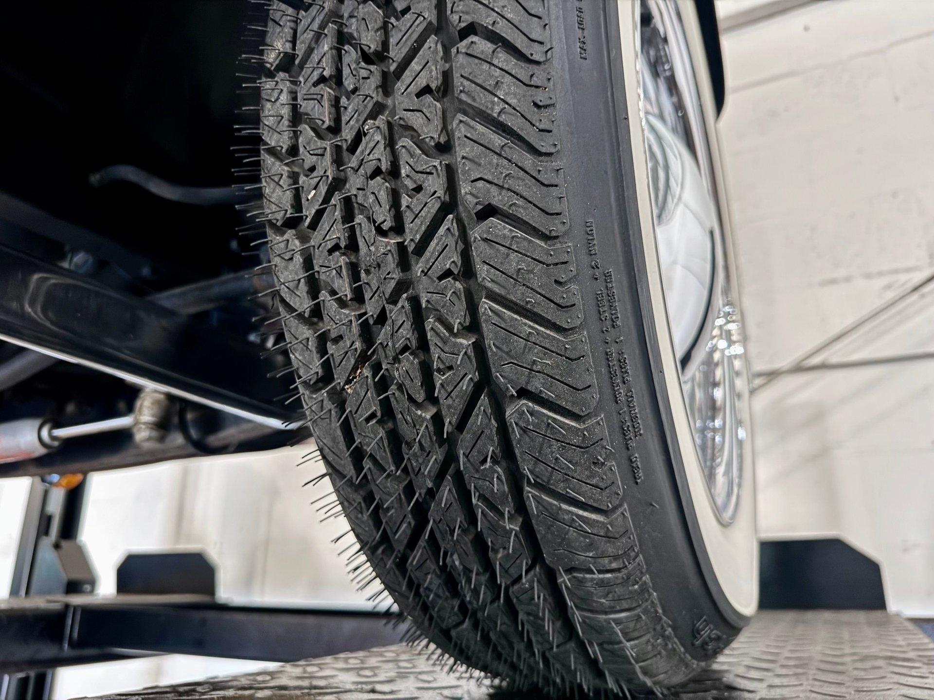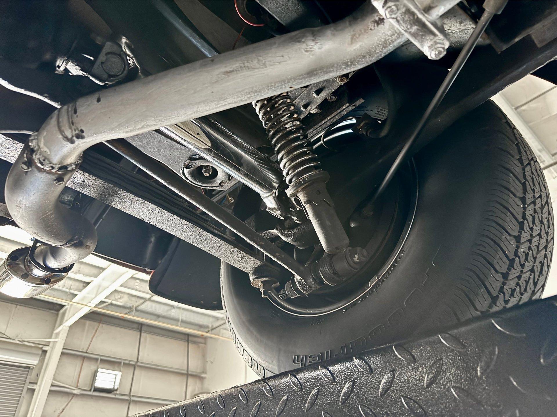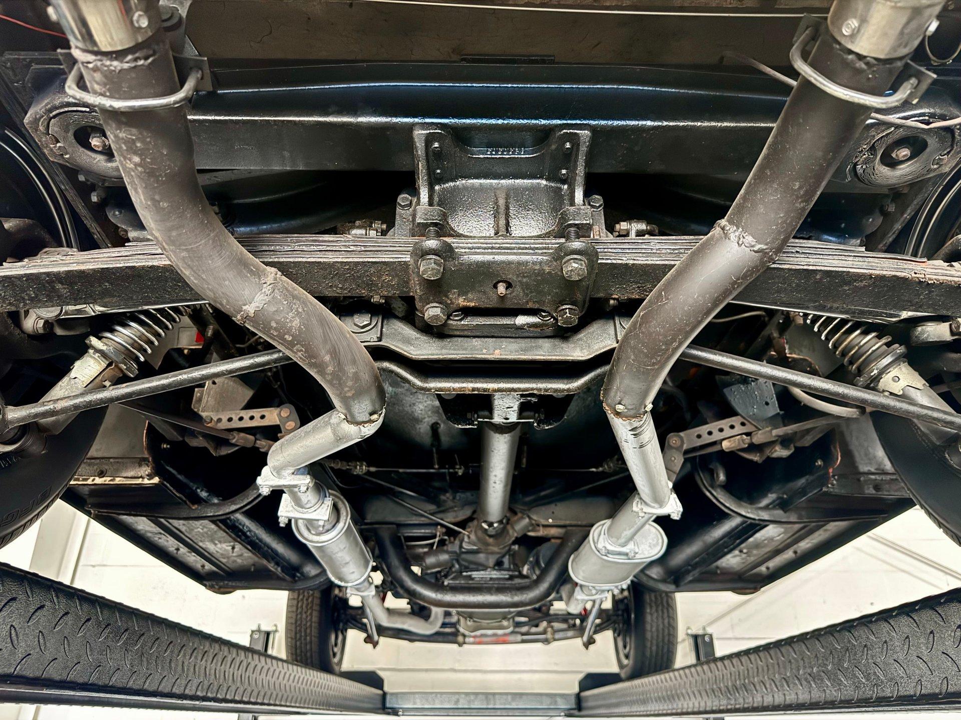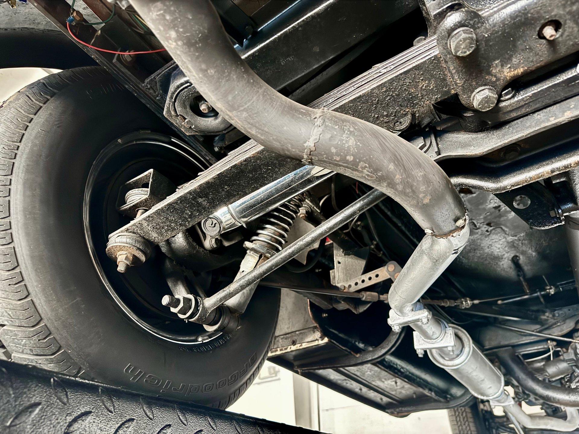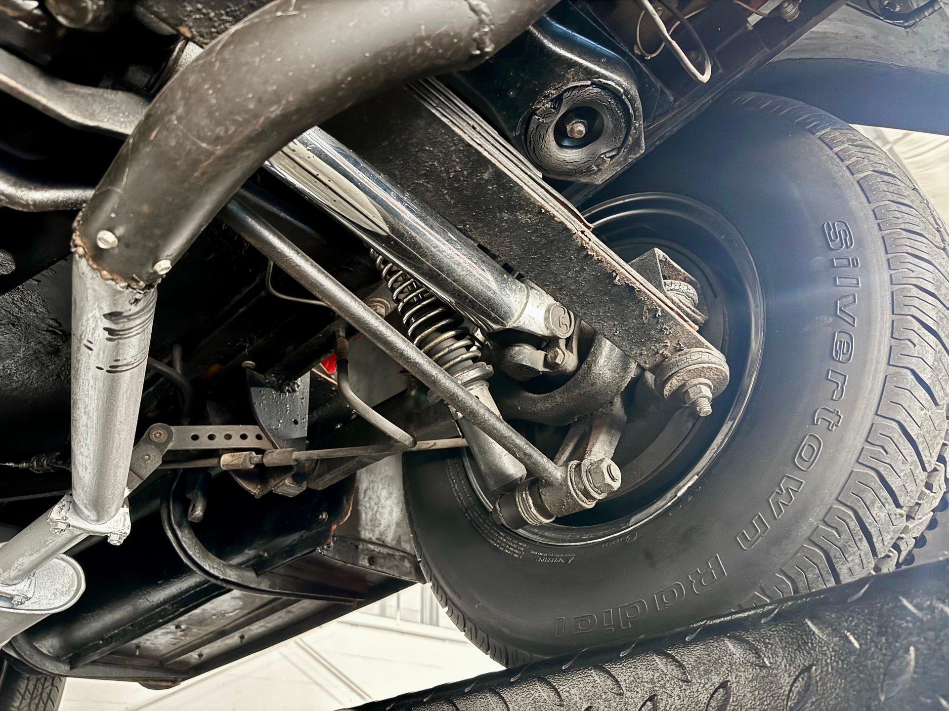 The custom two toned black and white vinyl interior looks great with the top on or off. The beautiful woodgrain dash is accented nicely by Classic Instruments white faced gauges and an aftermarket AM FM CD stereo. The stationary steering column has a custom steering wheel and also features an ahooga horn for an awesome vintage feel!