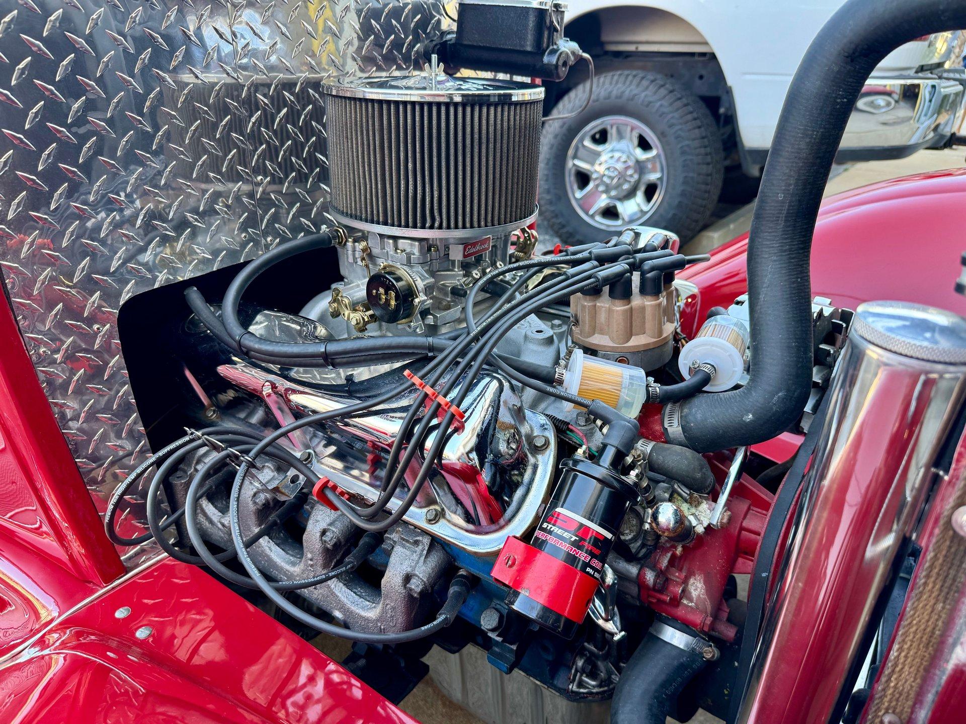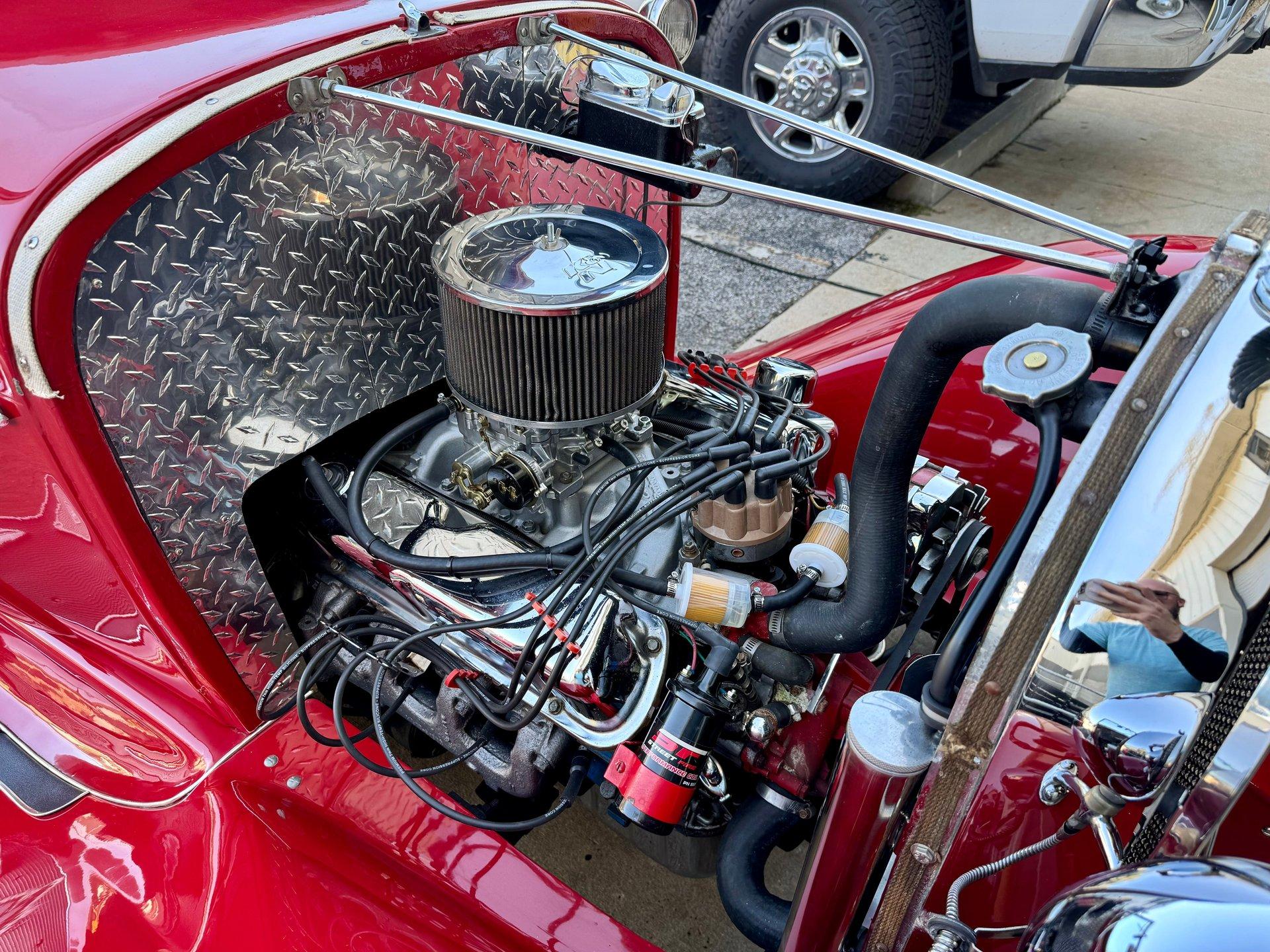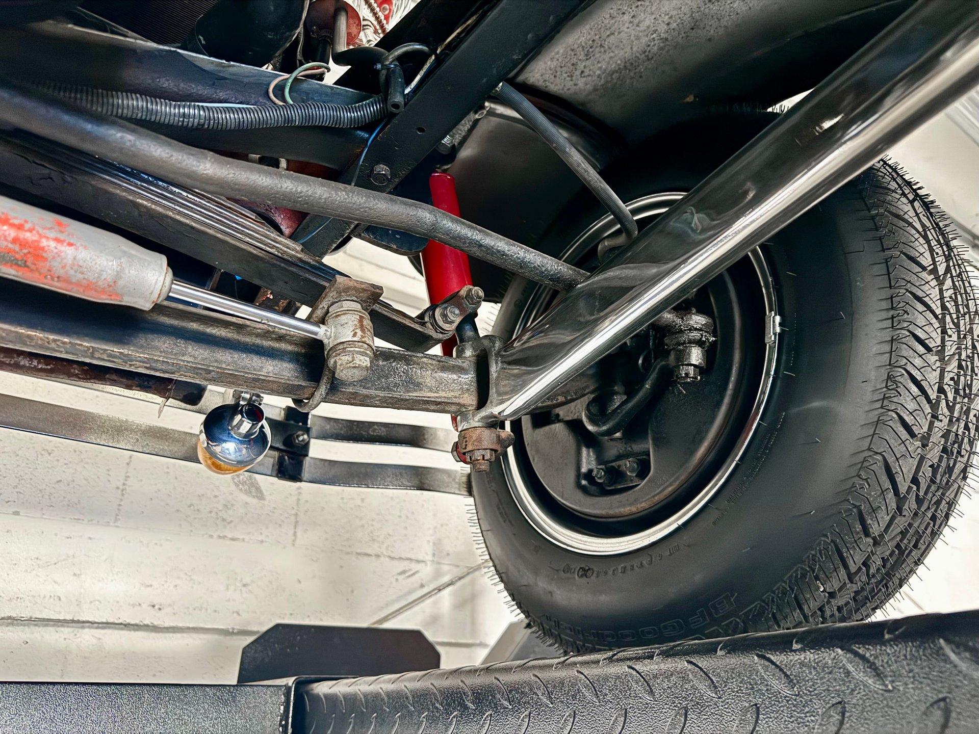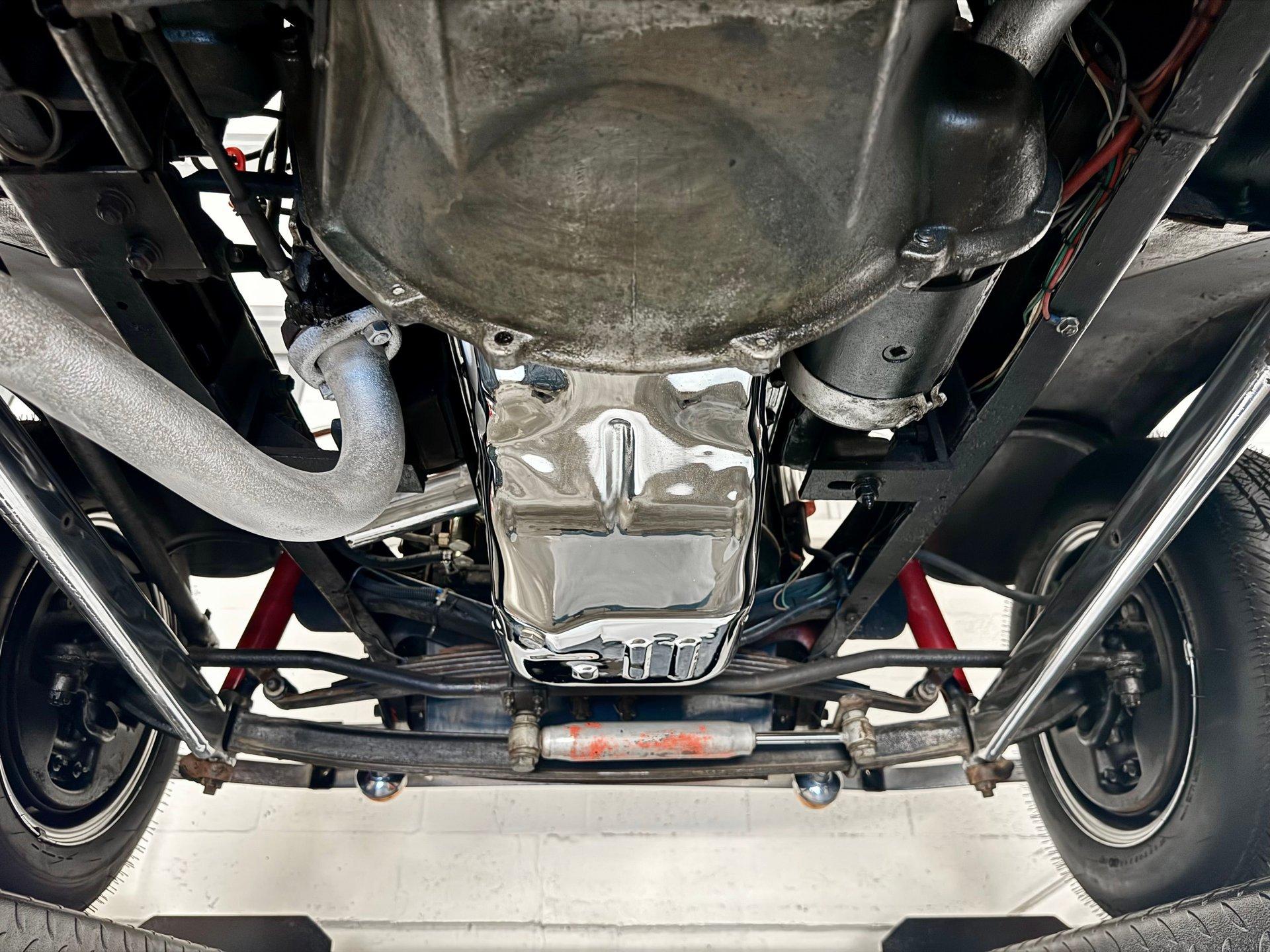The smooth fiberglass body is sitting on top of a custom chassis with Corvette independent rear suspension making this beauty drive like a dream. Chrome baby moon style wheels with new radial tires complete the look. Under the hood lies a 289 CID V8 engine mated to a 3-speed manual transmission with column shift for a truly unique setup in a street rod.