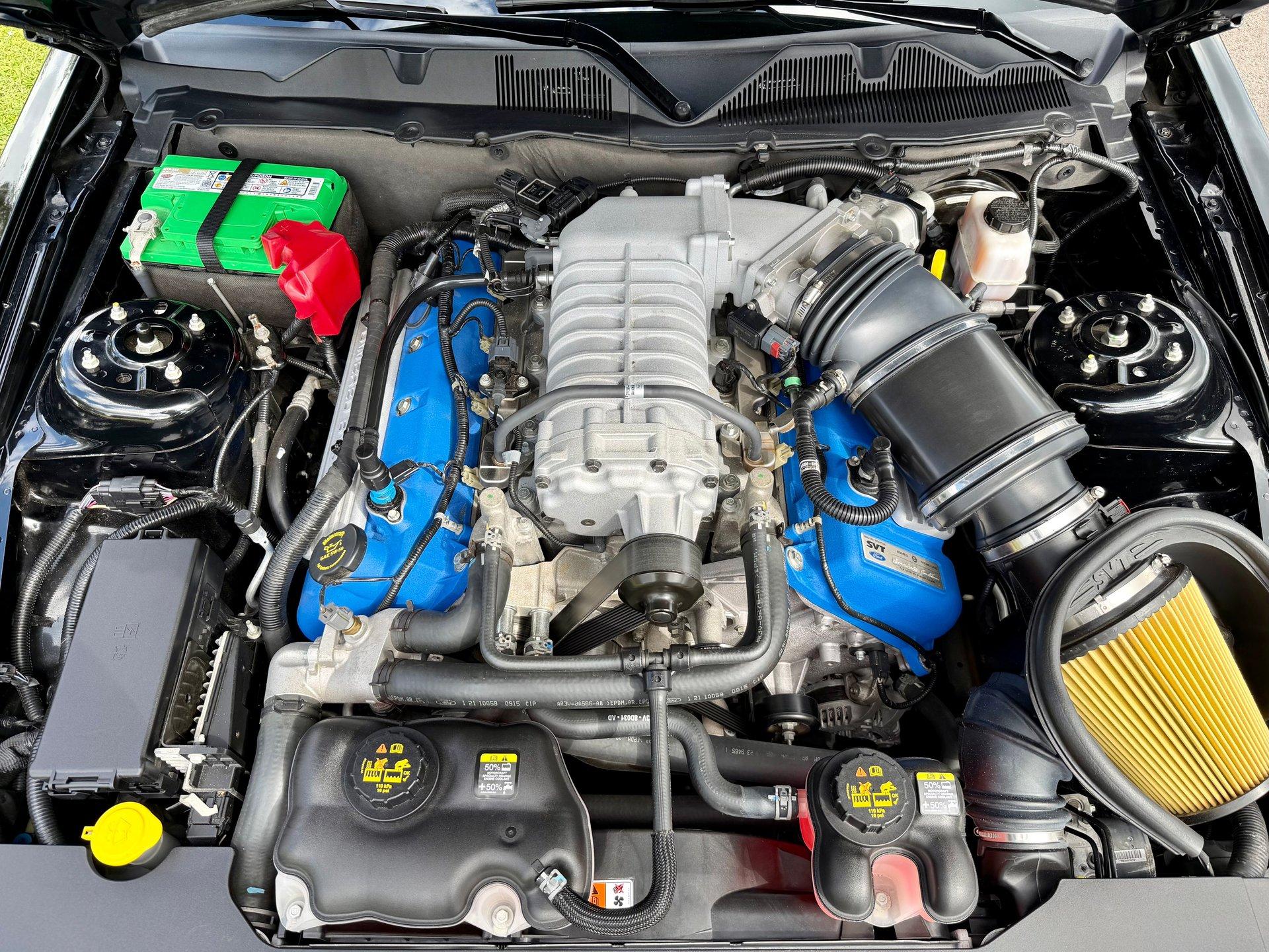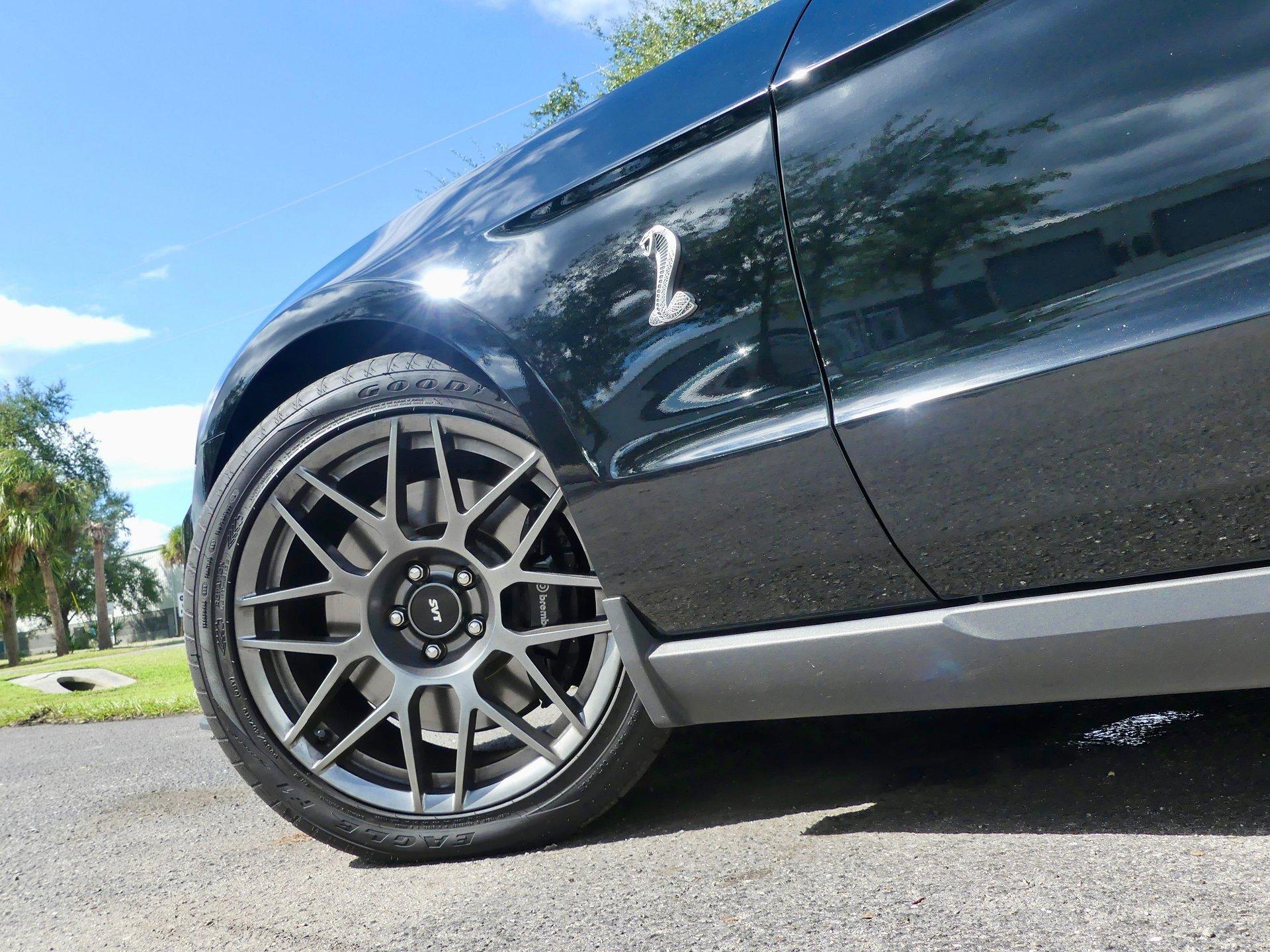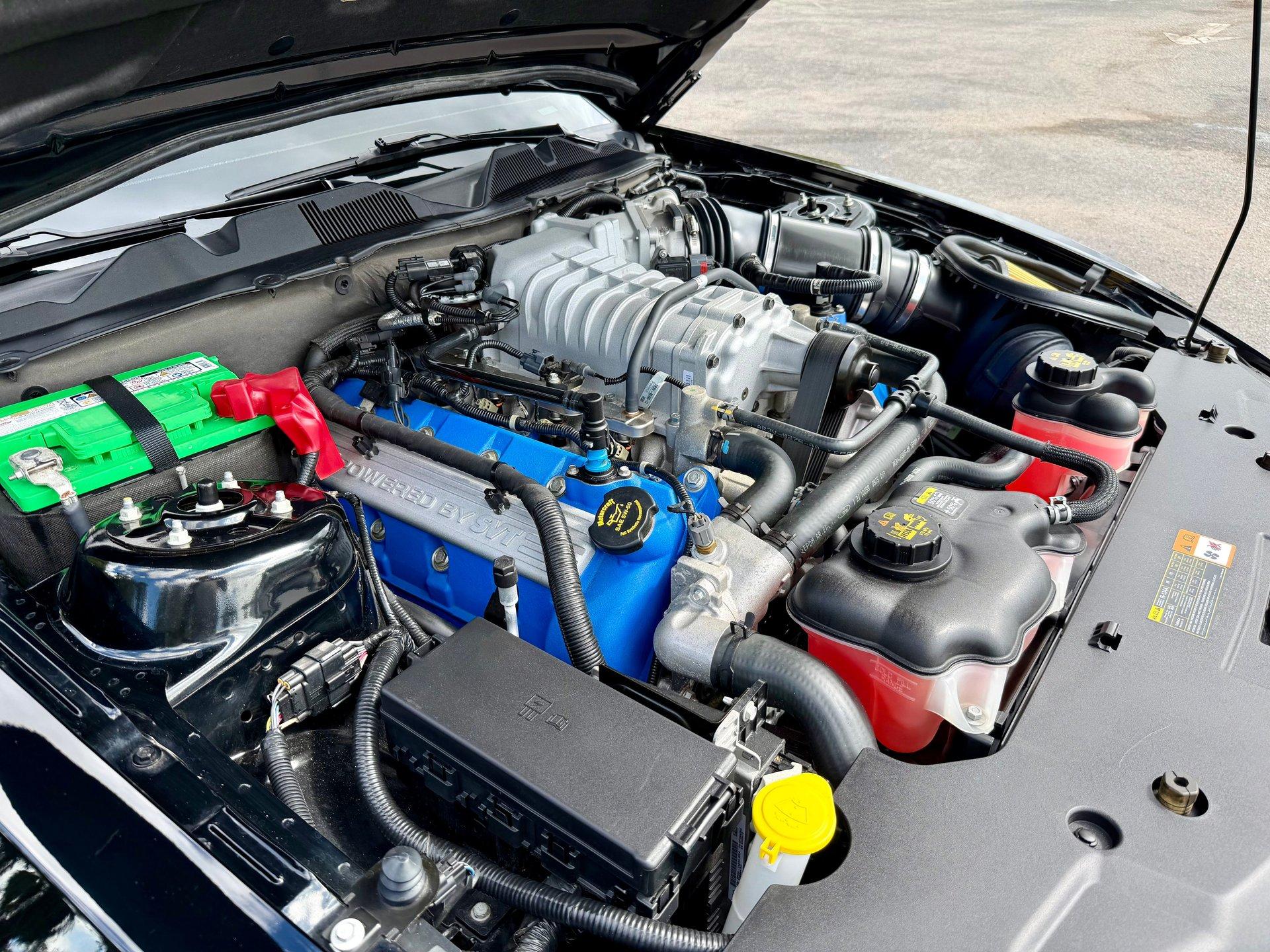 This modern muscle car is also loaded with options like Recaro seats, leather upholstery, cold factory air conditioning, power 4-wheel disc brakes, power steering, tilt, cruise control, Shaker stereo, AM/FM/CD/Navigation, alarm system, alloy wheels, radial tires, and more!The slick Black paint is set off by a spoiler, and Shelby specific hood and front end treatment. Rocker panel stripes and Shelby emblems complete the look. The factory SVT gunmetal staggered fit wheels wrapped in Supercar tires give it a sinister stance!