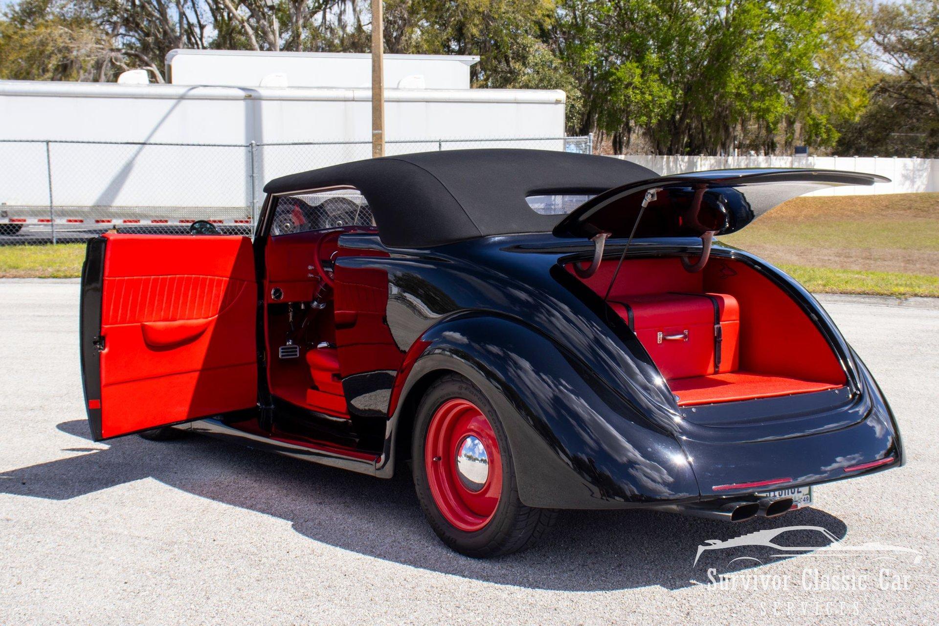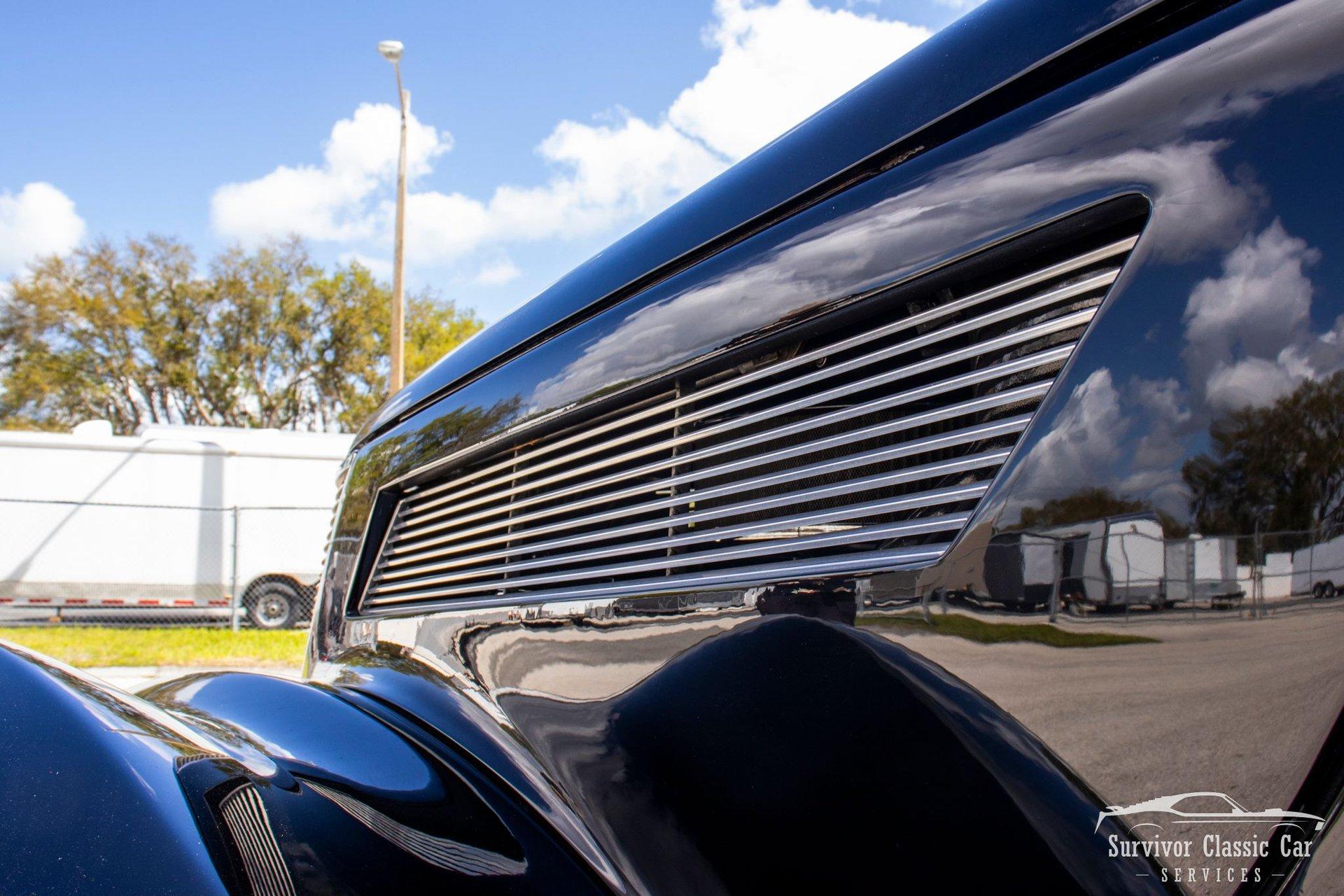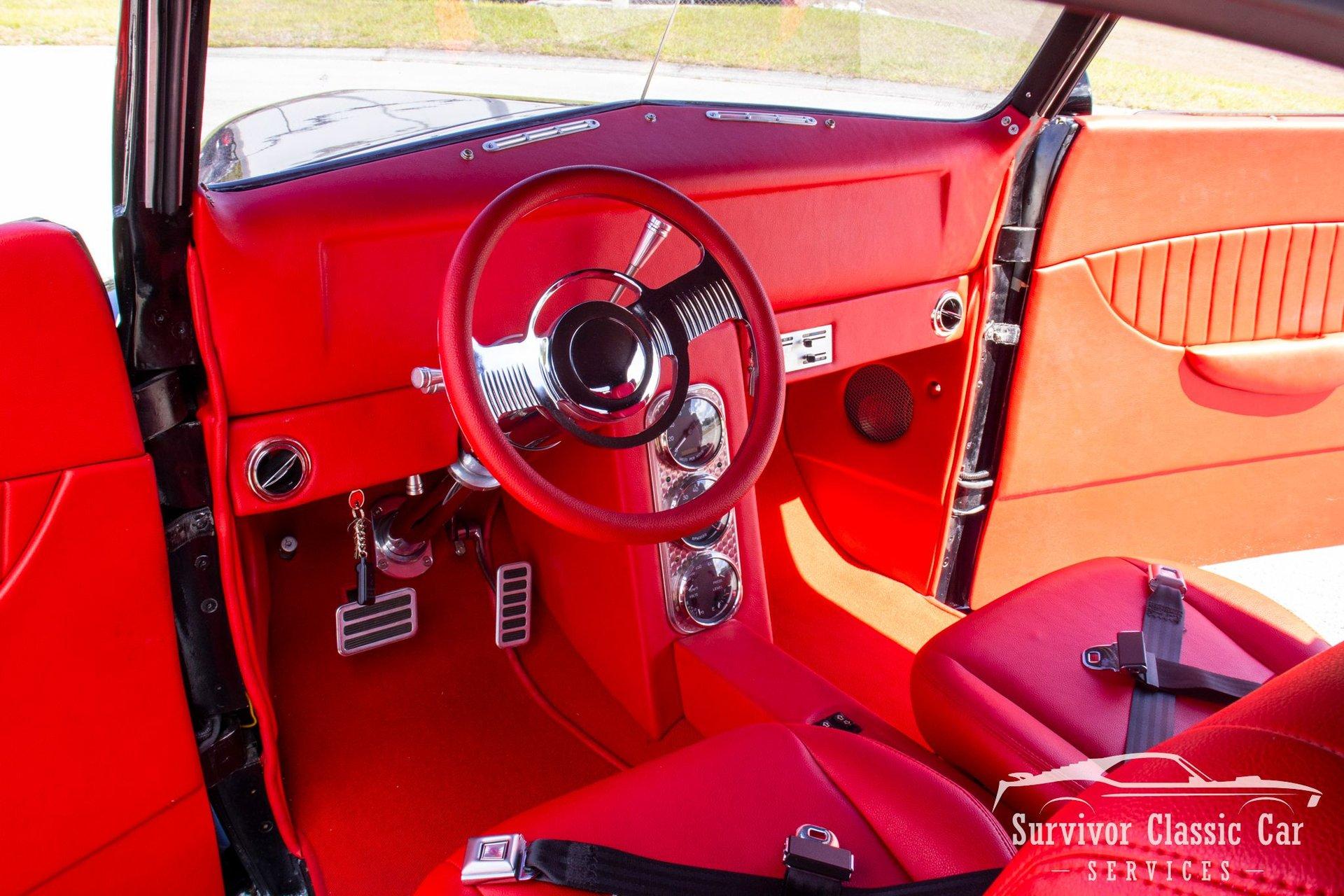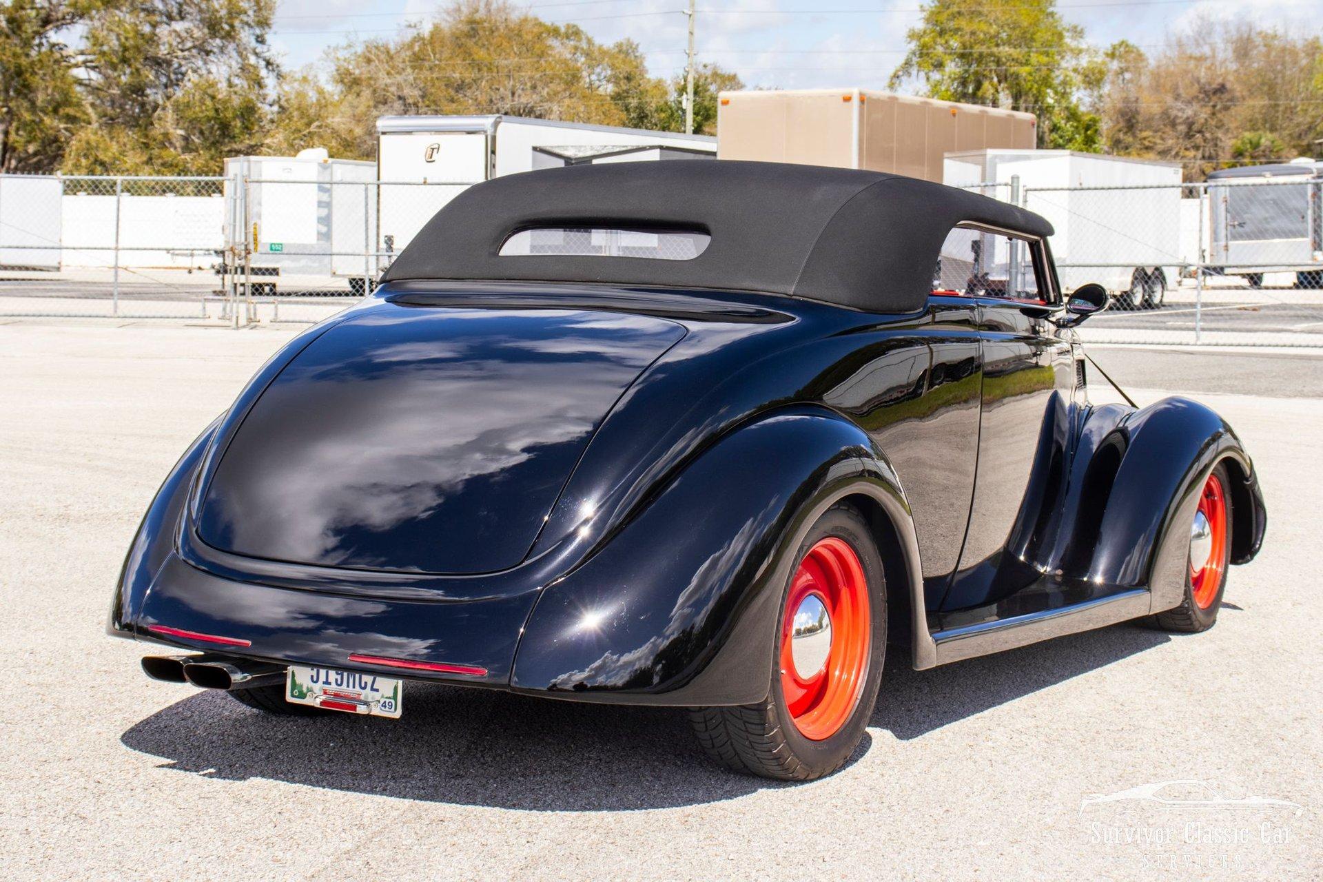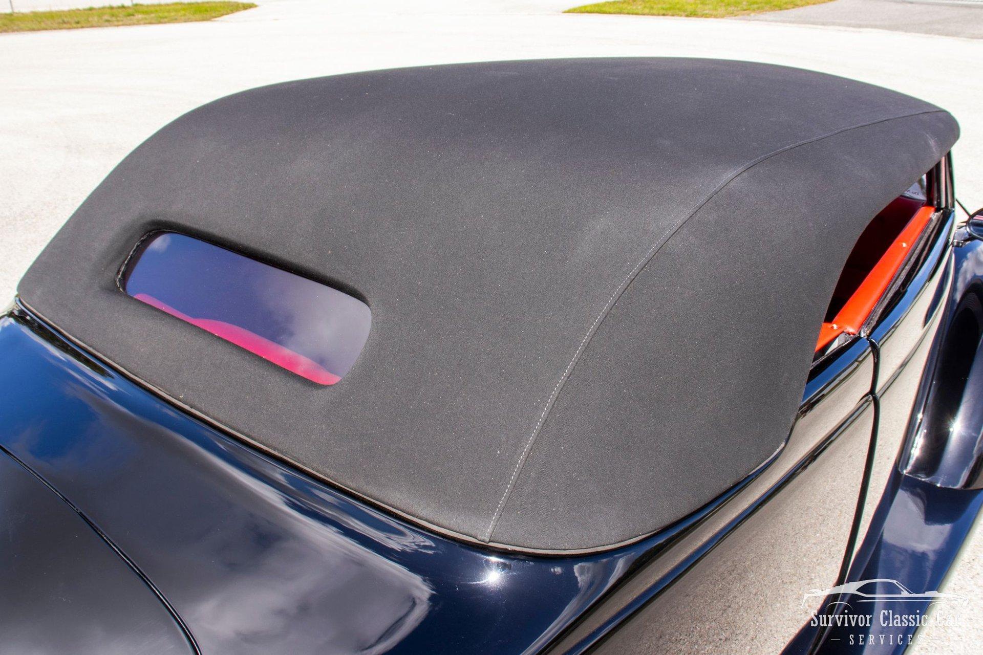 The Mirror Black PPG Paint has been polished to a Mirror Finish and features a Chrome '37 Ford Grille, Glass Headlamps and shaved doors (remote door poppers for easy access). The Top is a custom designed Removable Canvas Carson Top & the 17in Steel wheels has been painted to match the interior.