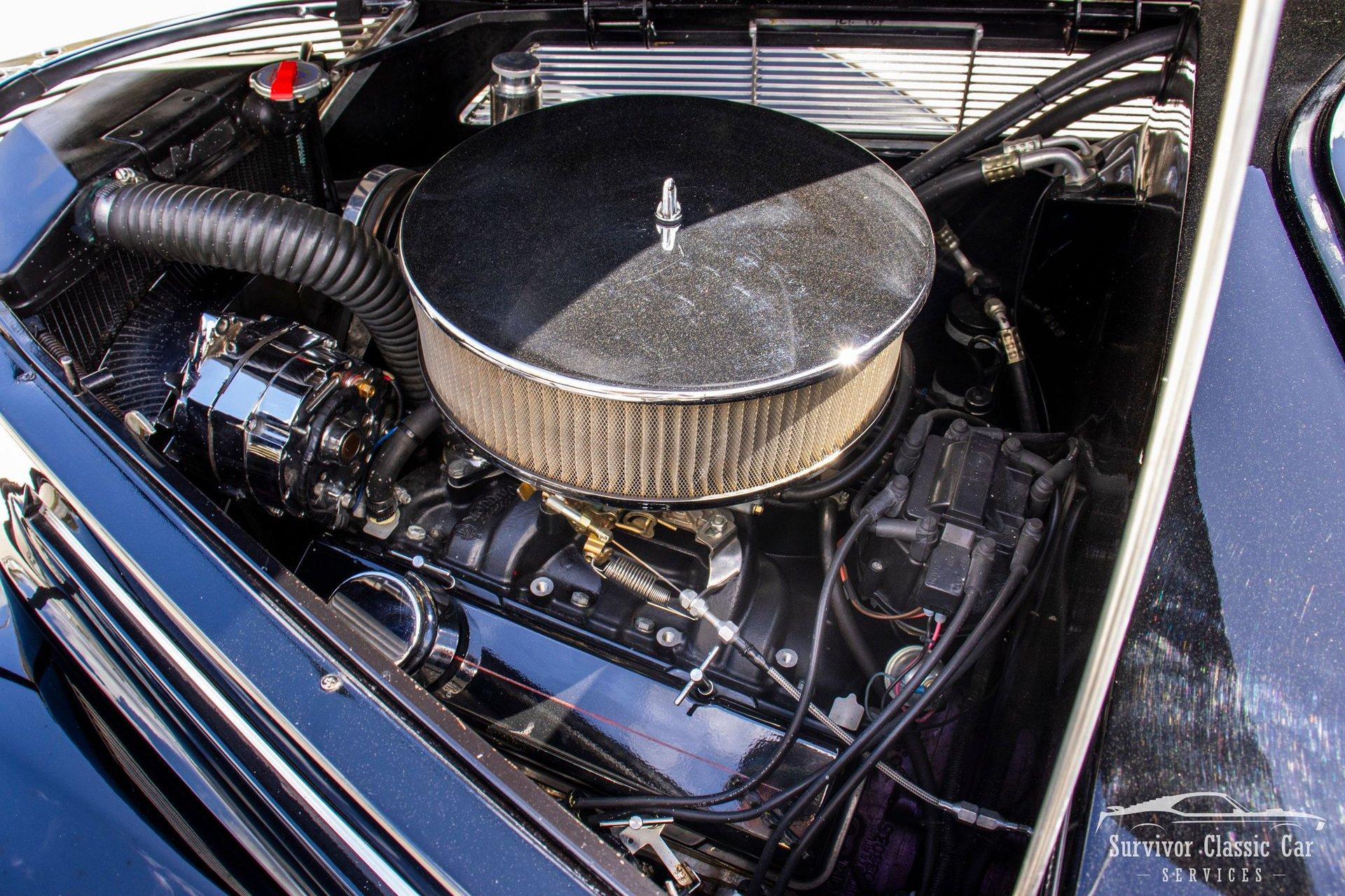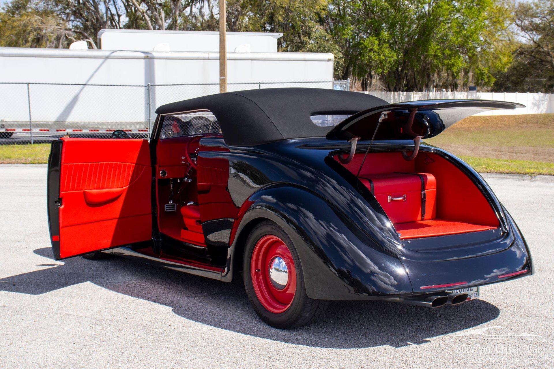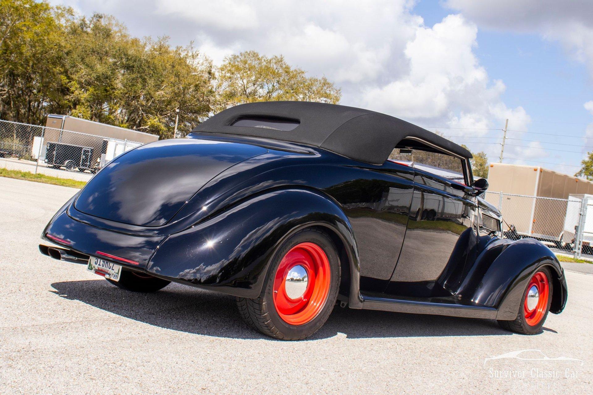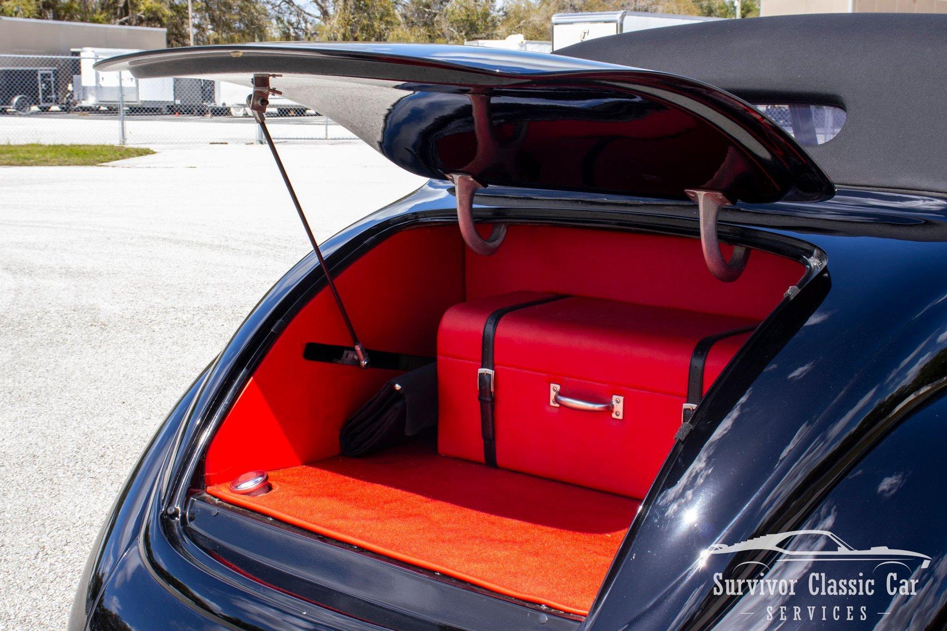 The Mirror Black PPG Paint has been polished to a Mirror Finish and features a Chrome '37 Ford Grille, Glass Headlamps and shaved doors (remote door poppers for easy access). The Top is a custom designed Removable Canvas Carson Top & the 17in Steel wheels has been painted to match the interior.
