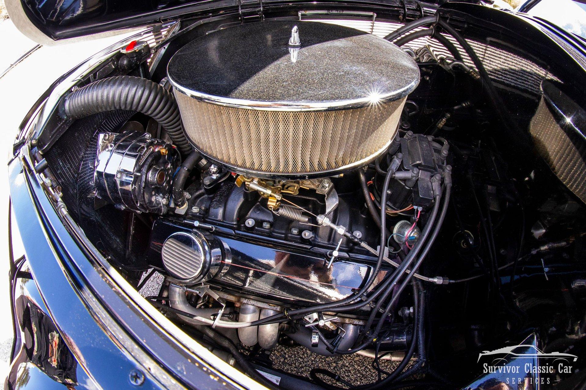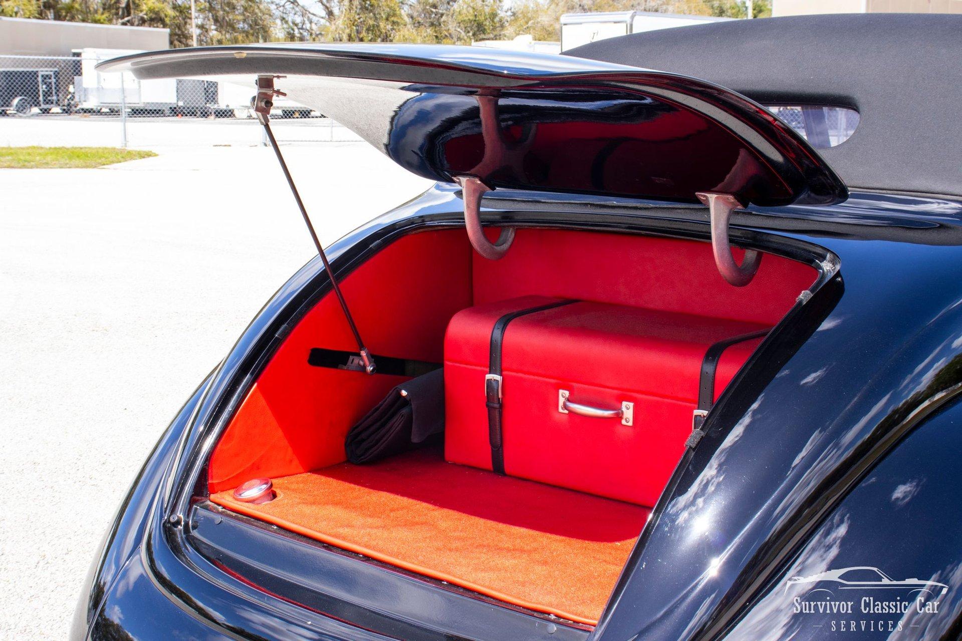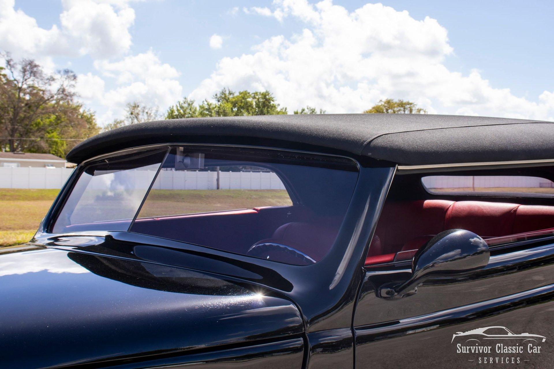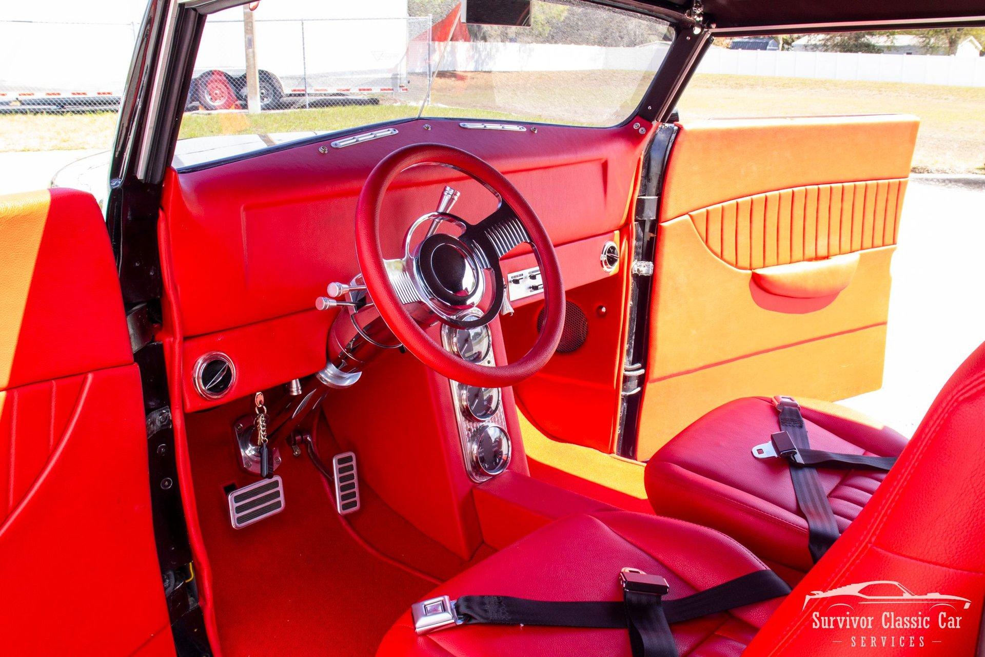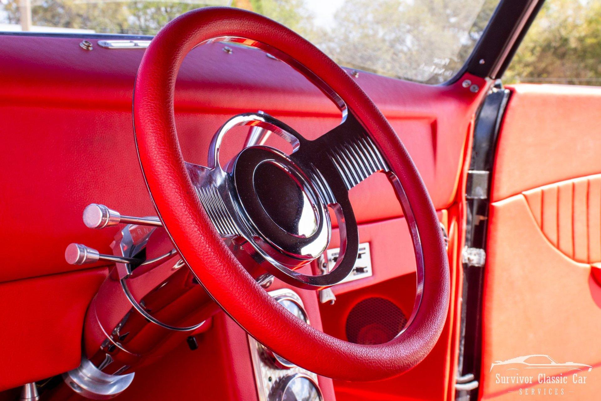 The Mirror Black PPG Paint has been polished to a Mirror Finish and features a Chrome '37 Ford Grille, Glass Headlamps and shaved doors (remote door poppers for easy access). The Top is a custom designed Removable Canvas Carson Top & the 17in Steel wheels has been painted to match the interior.