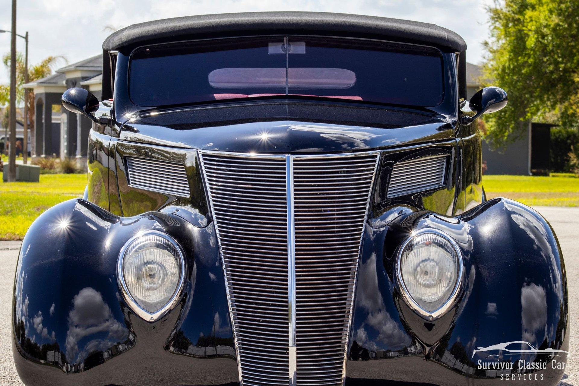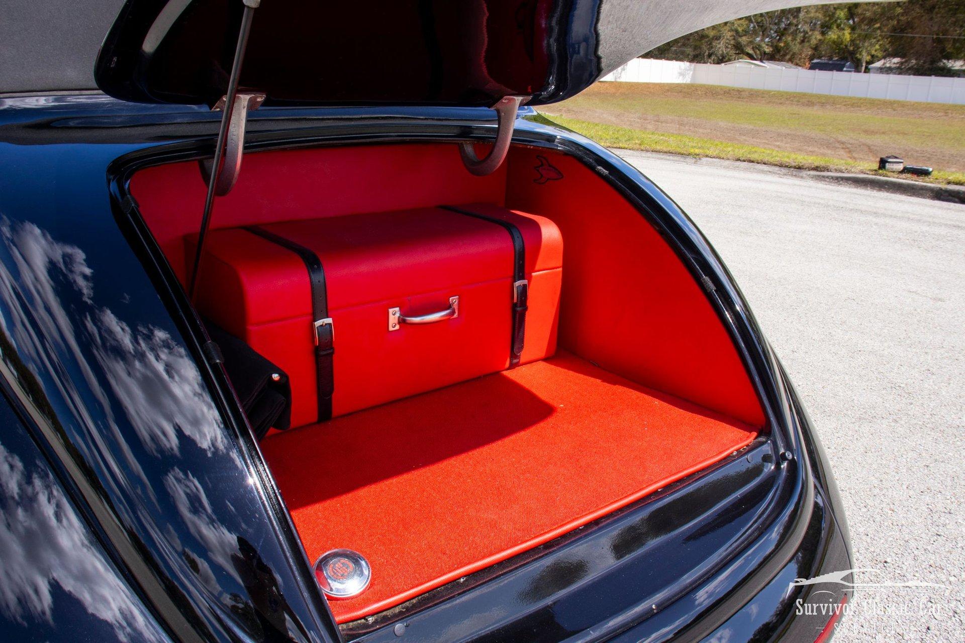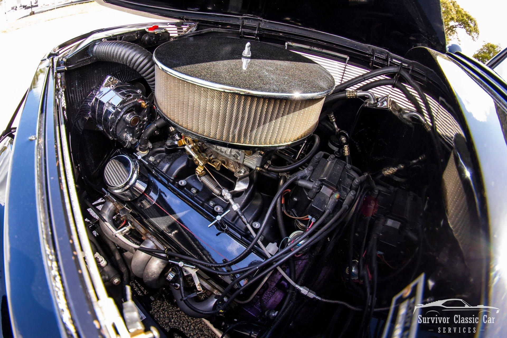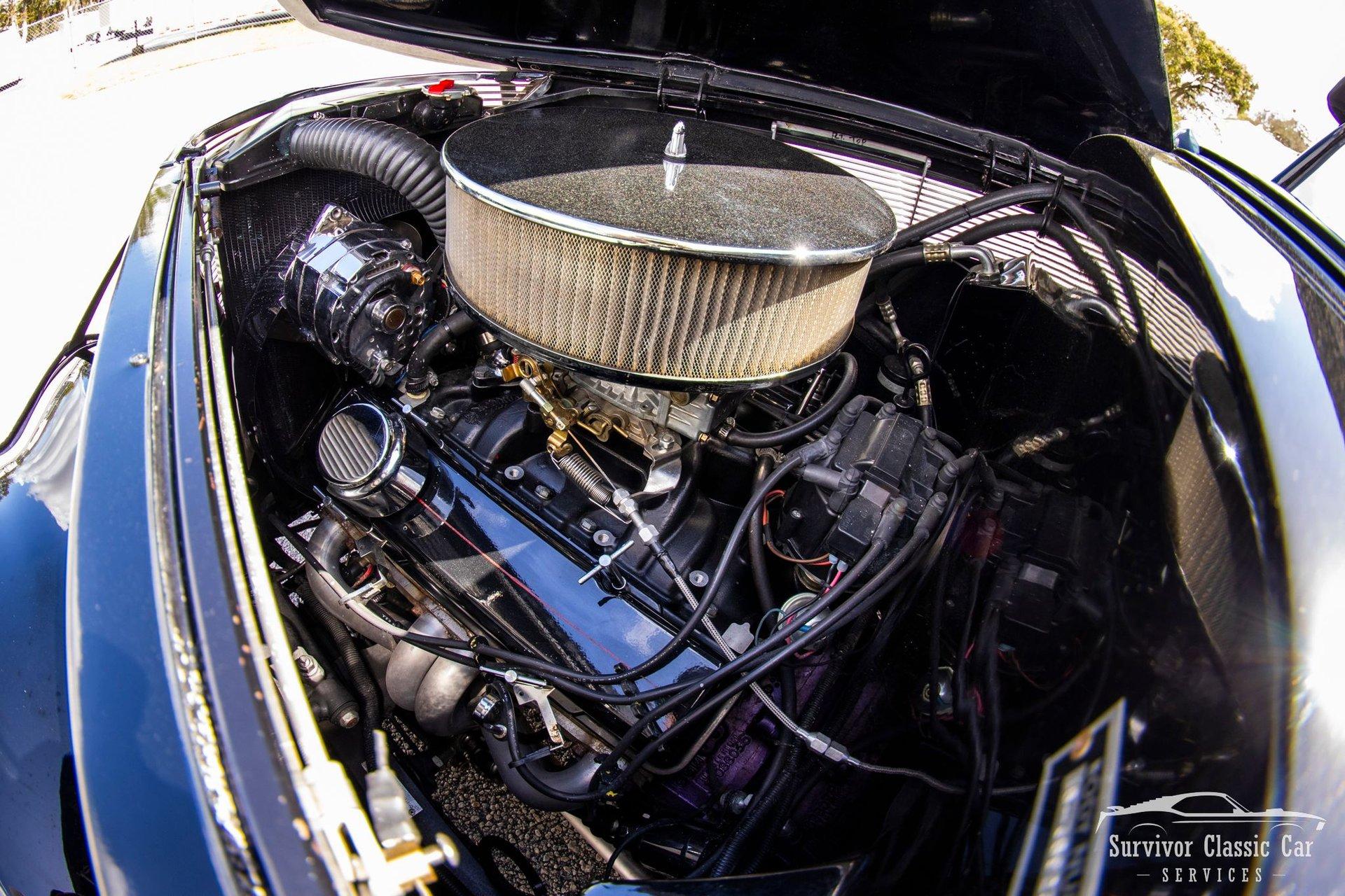 The Mirror Black PPG Paint has been polished to a Mirror Finish and features a Chrome '37 Ford Grille, Glass Headlamps and shaved doors (remote door poppers for easy access). The Top is a custom designed Removable Canvas Carson Top & the 17in Steel wheels has been painted to match the interior.