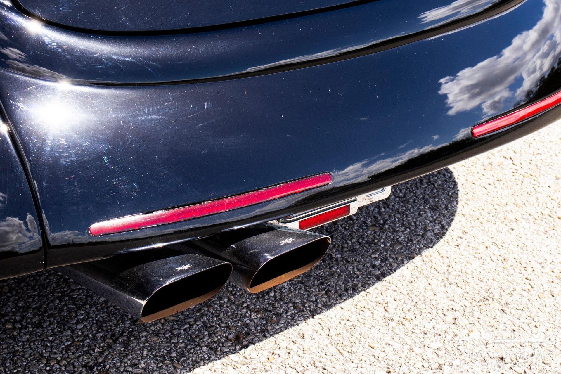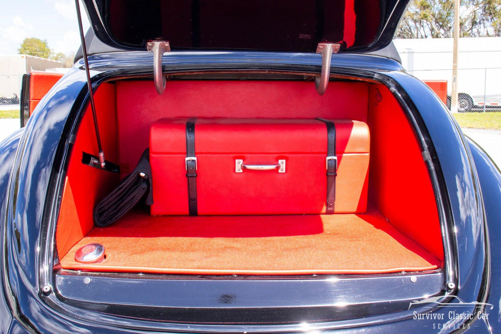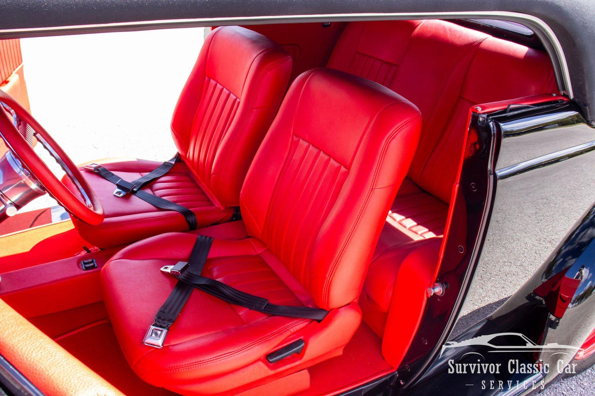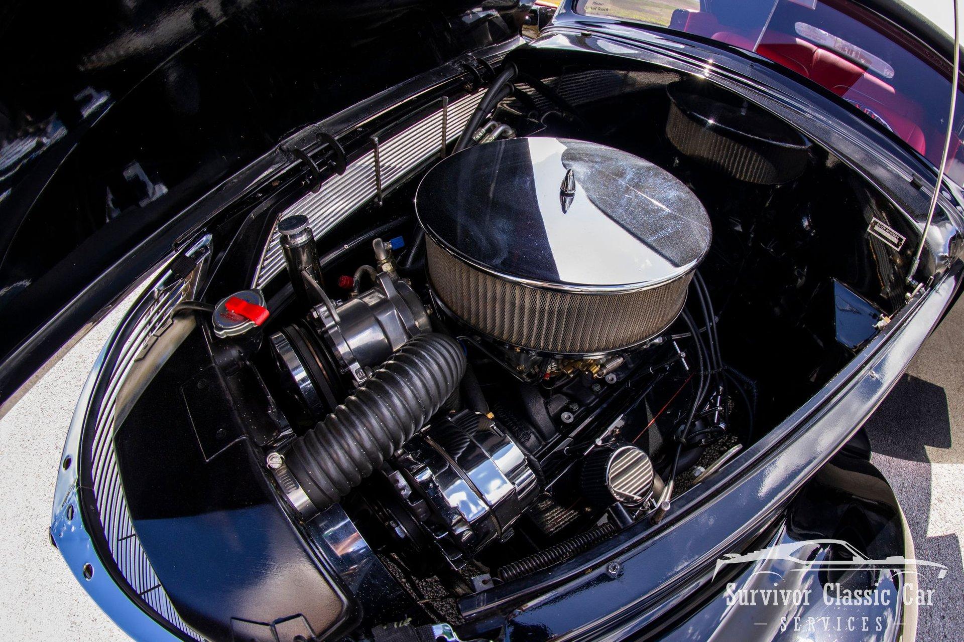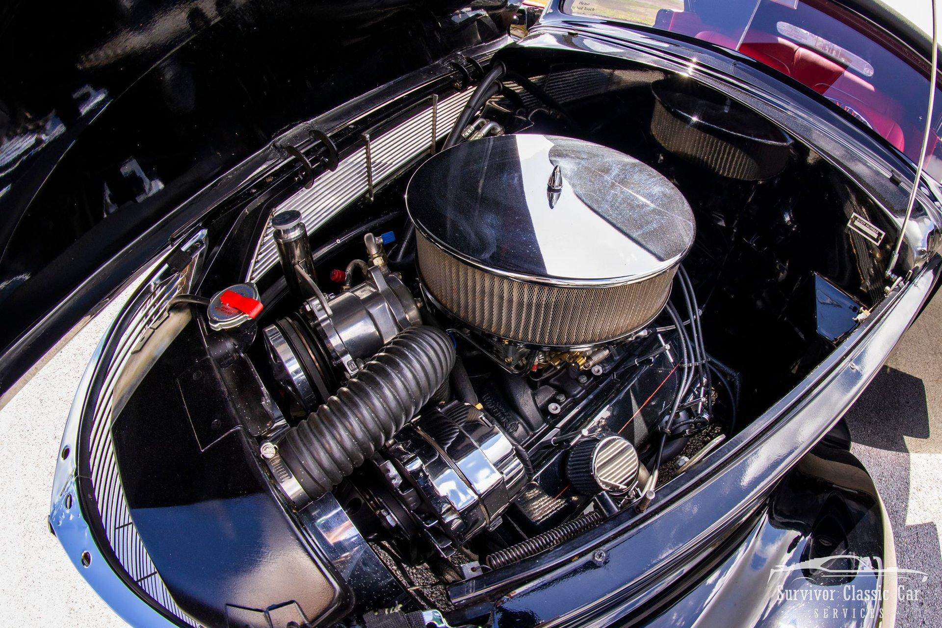 The Mirror Black PPG Paint has been polished to a Mirror Finish and features a Chrome '37 Ford Grille, Glass Headlamps and shaved doors (remote door poppers for easy access). The Top is a custom designed Removable Canvas Carson Top & the 17in Steel wheels has been painted to match the interior.