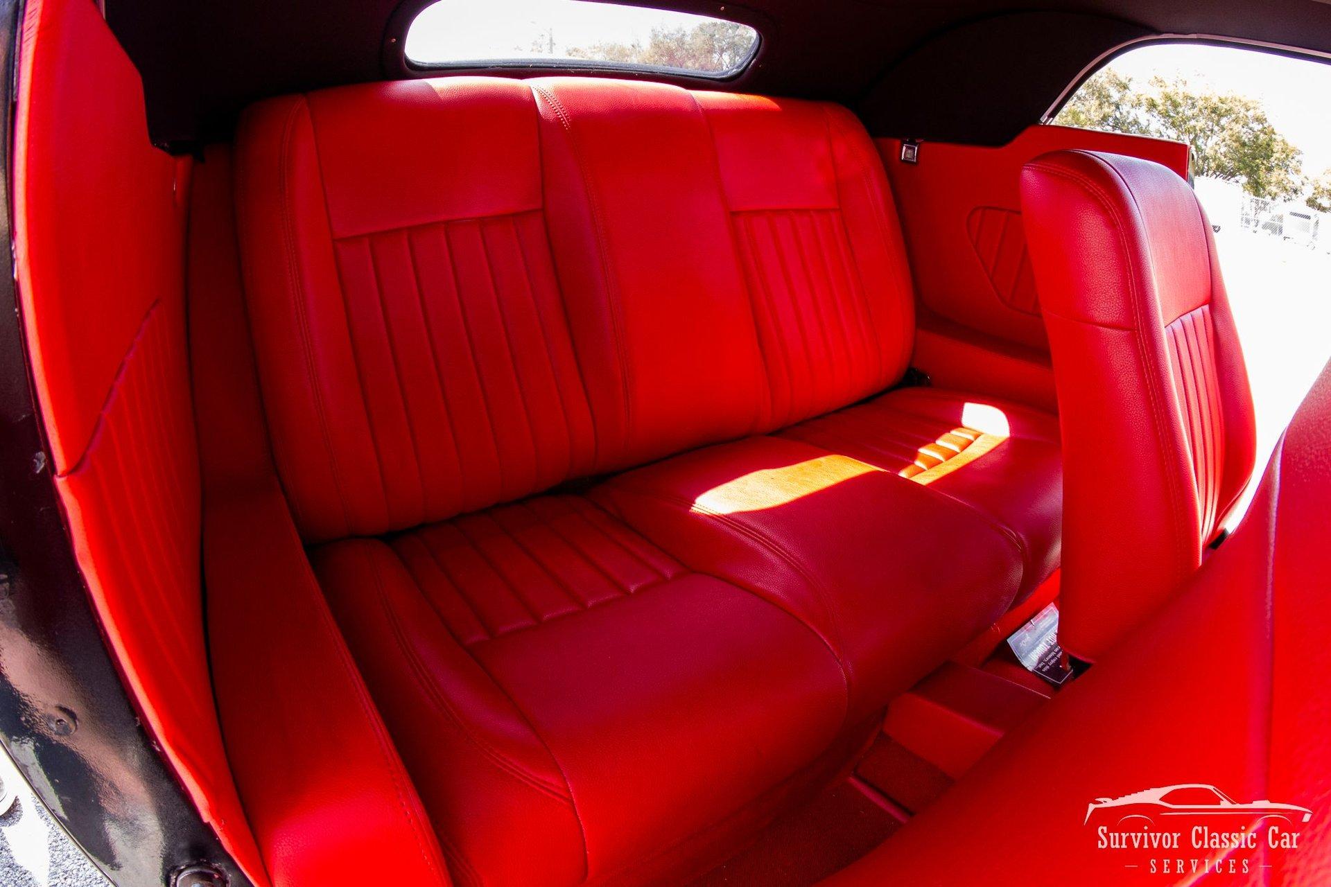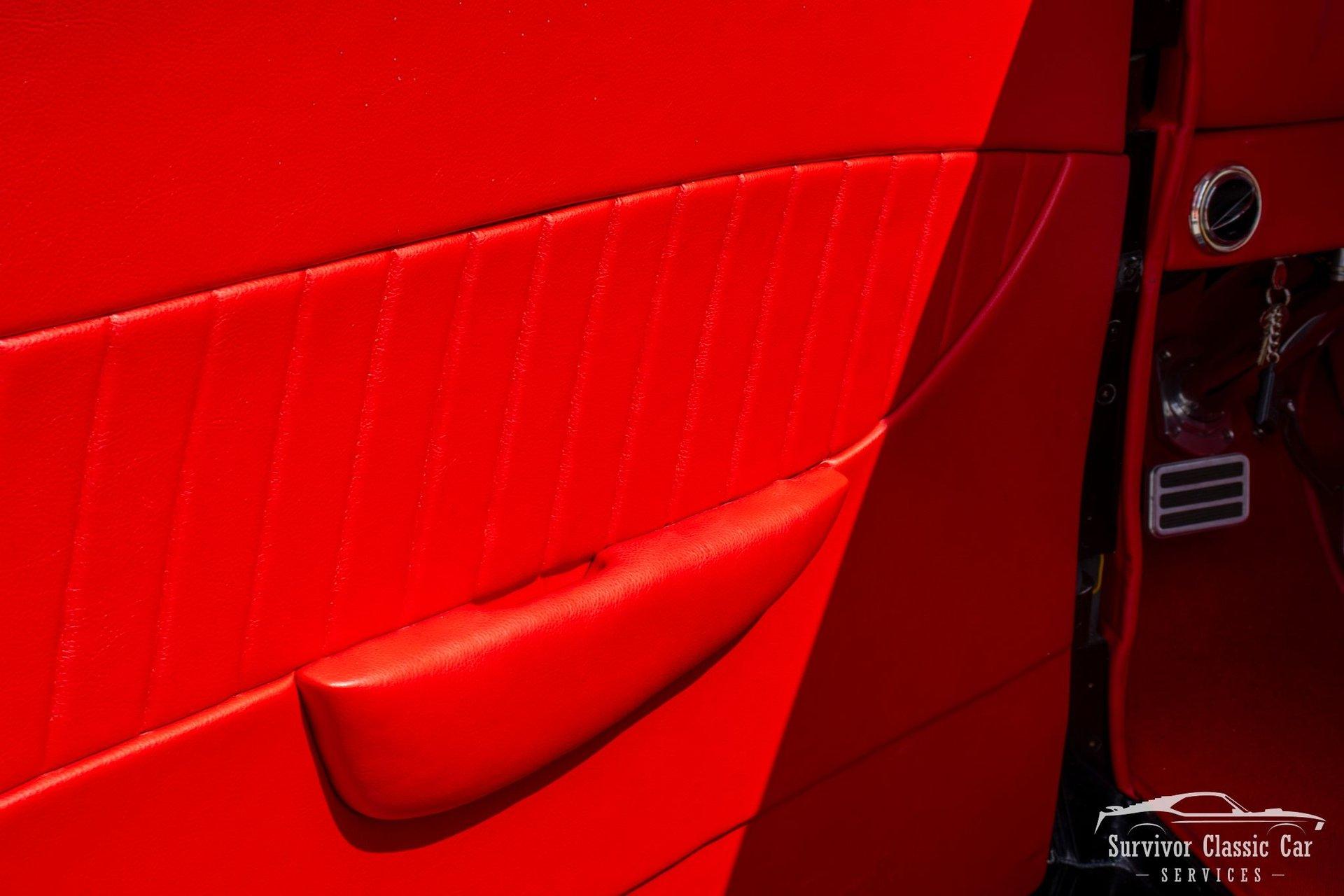 This Interior was designed by the owner. He wanted a “Clean & Simple” Styling & everything is wrapped in Ultrafrabric's Red, a Vinyl fabric that looks & fells similar to real Leather. The Billet 1/2 Wrapped Steering Wheel is attached to a full polished Chrome Tilt Steering Column & the gauges are located in the lower Dash panel. The Interior is air conditioning cooled by Vintage Air A/C & comfortable bucket seating.