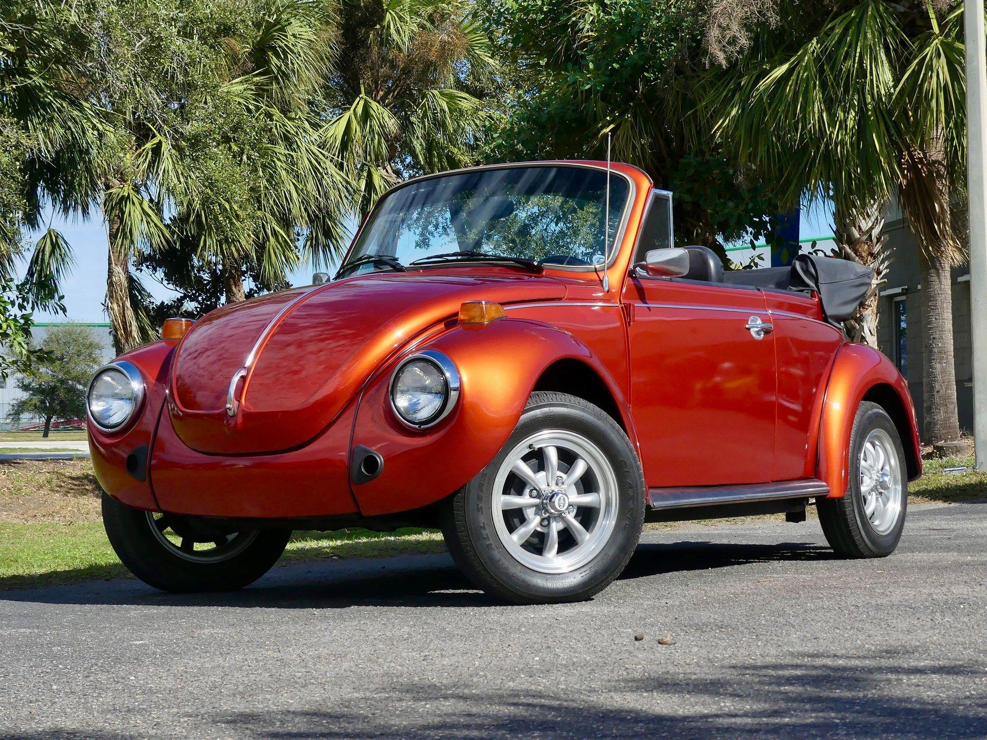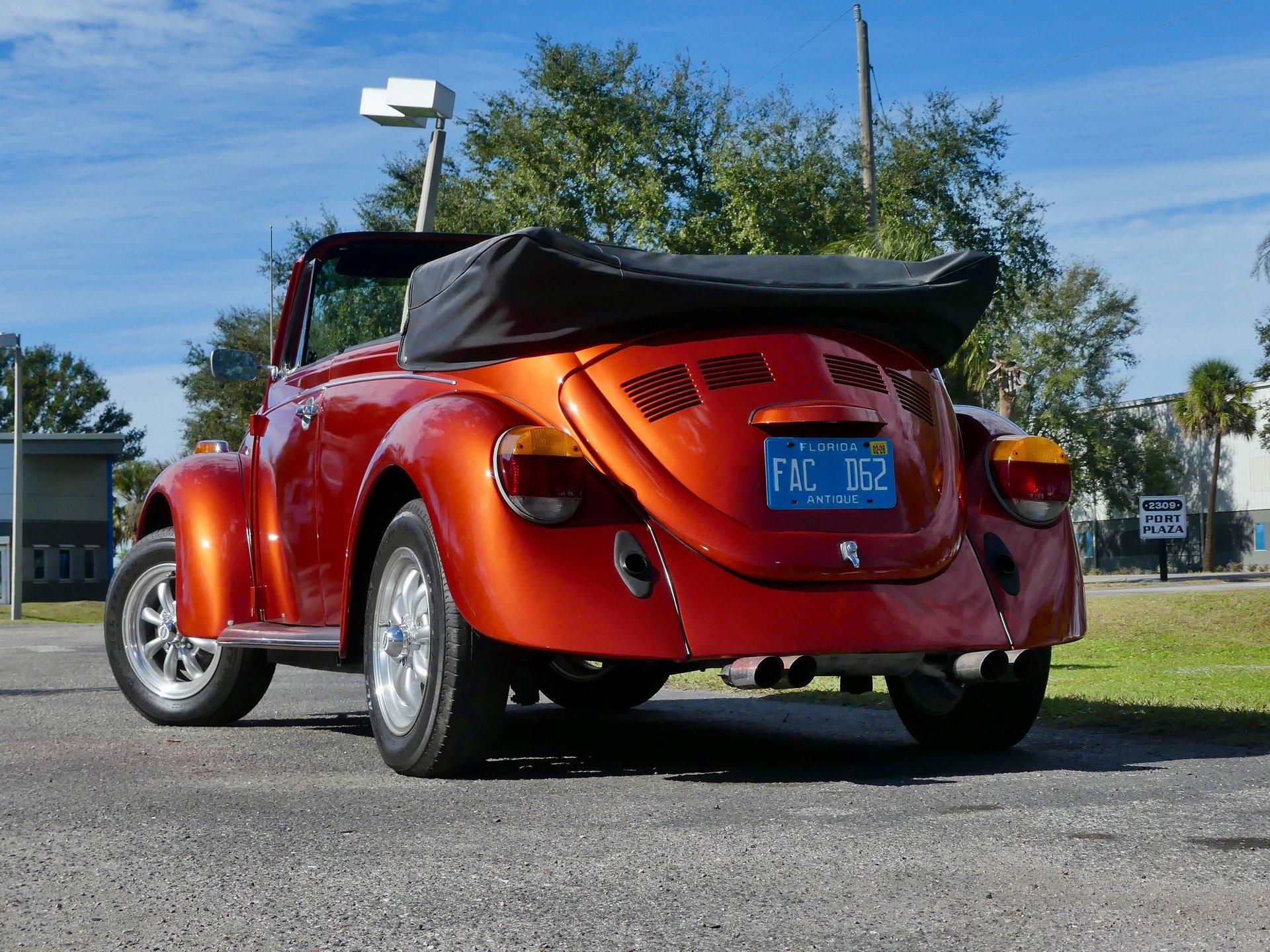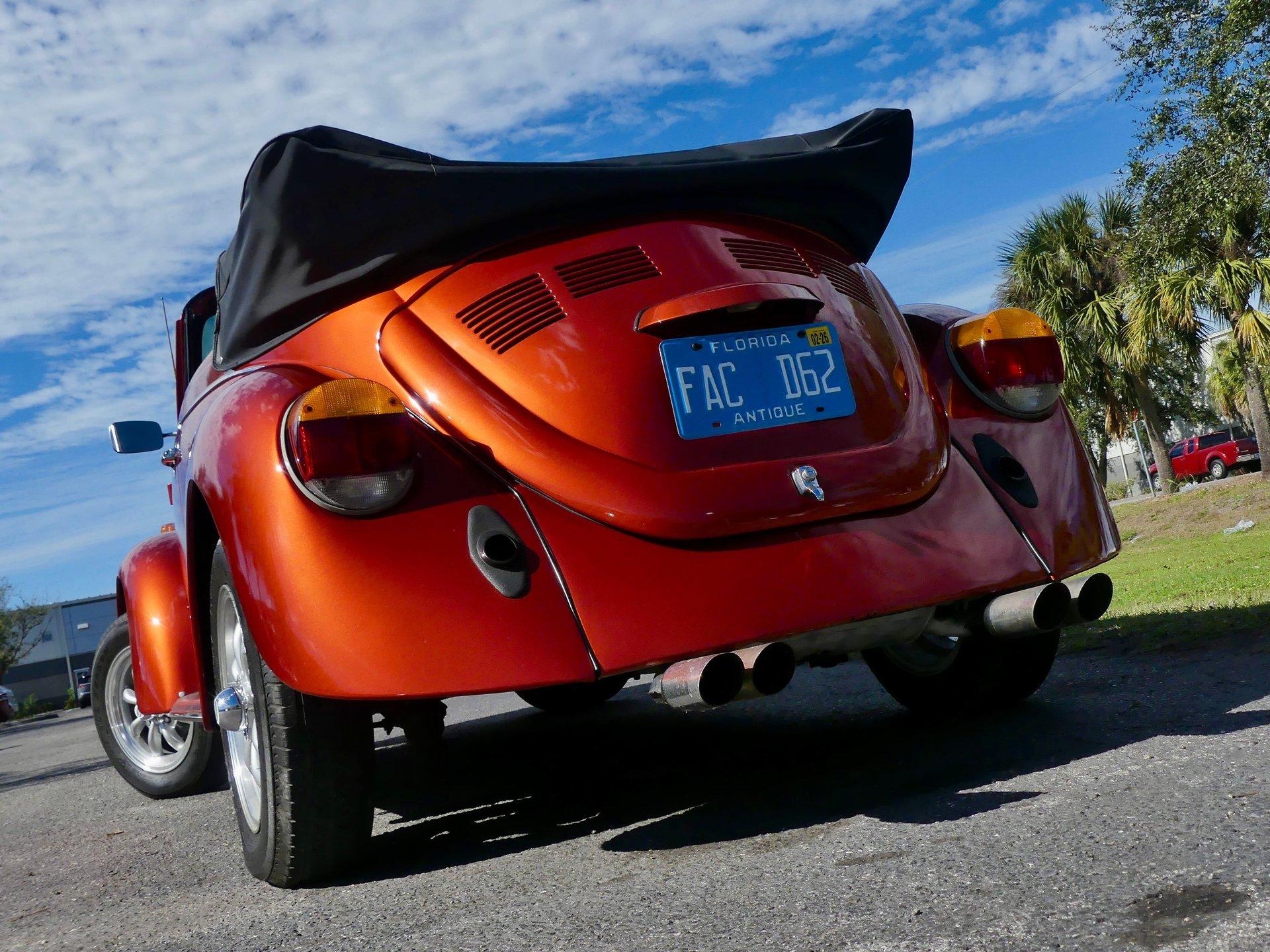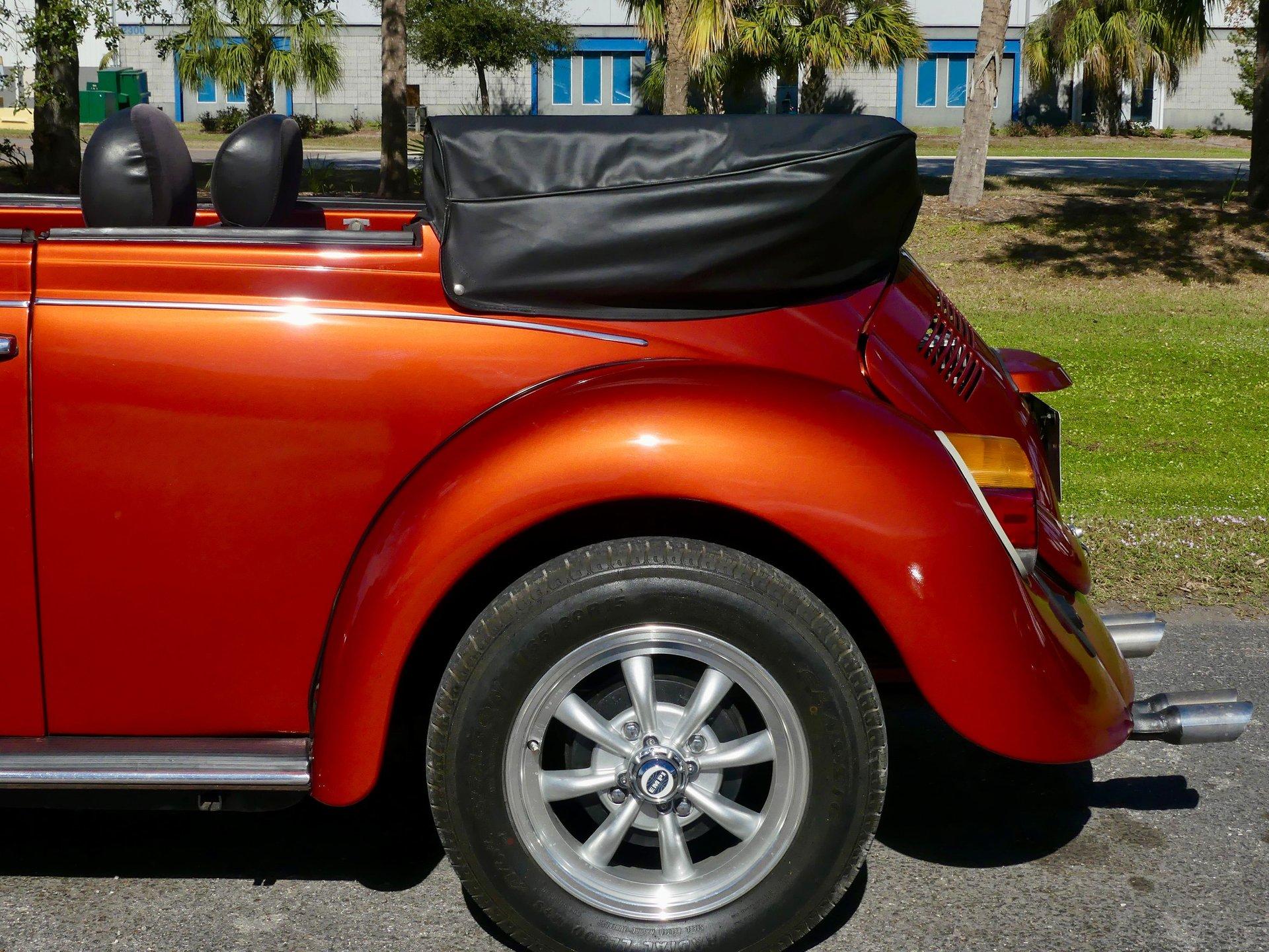 This one features a custom paint color of Burnt Orange Metallic. Paired with EMPI wheels and black convertible top, it is a real show stopper.