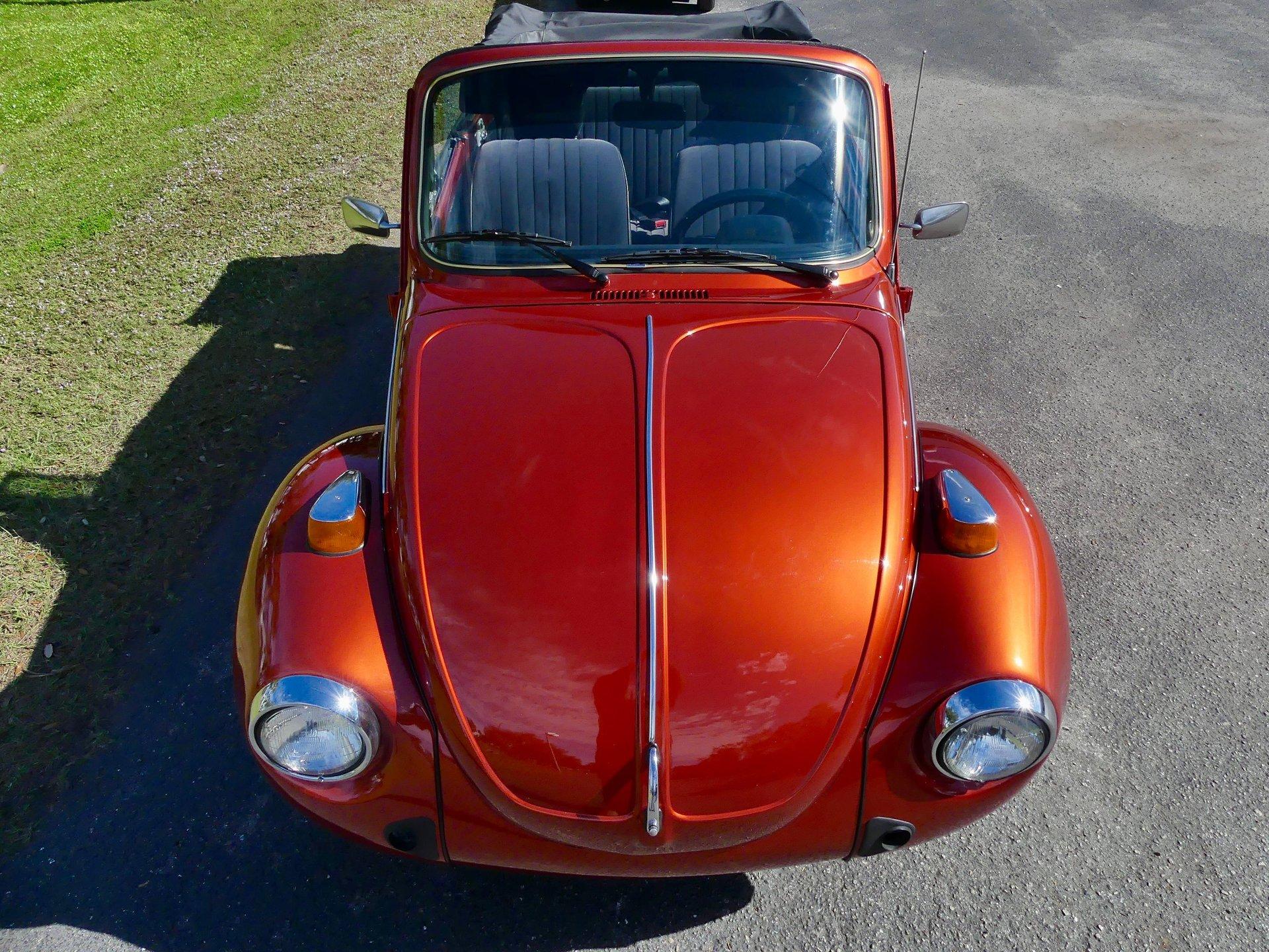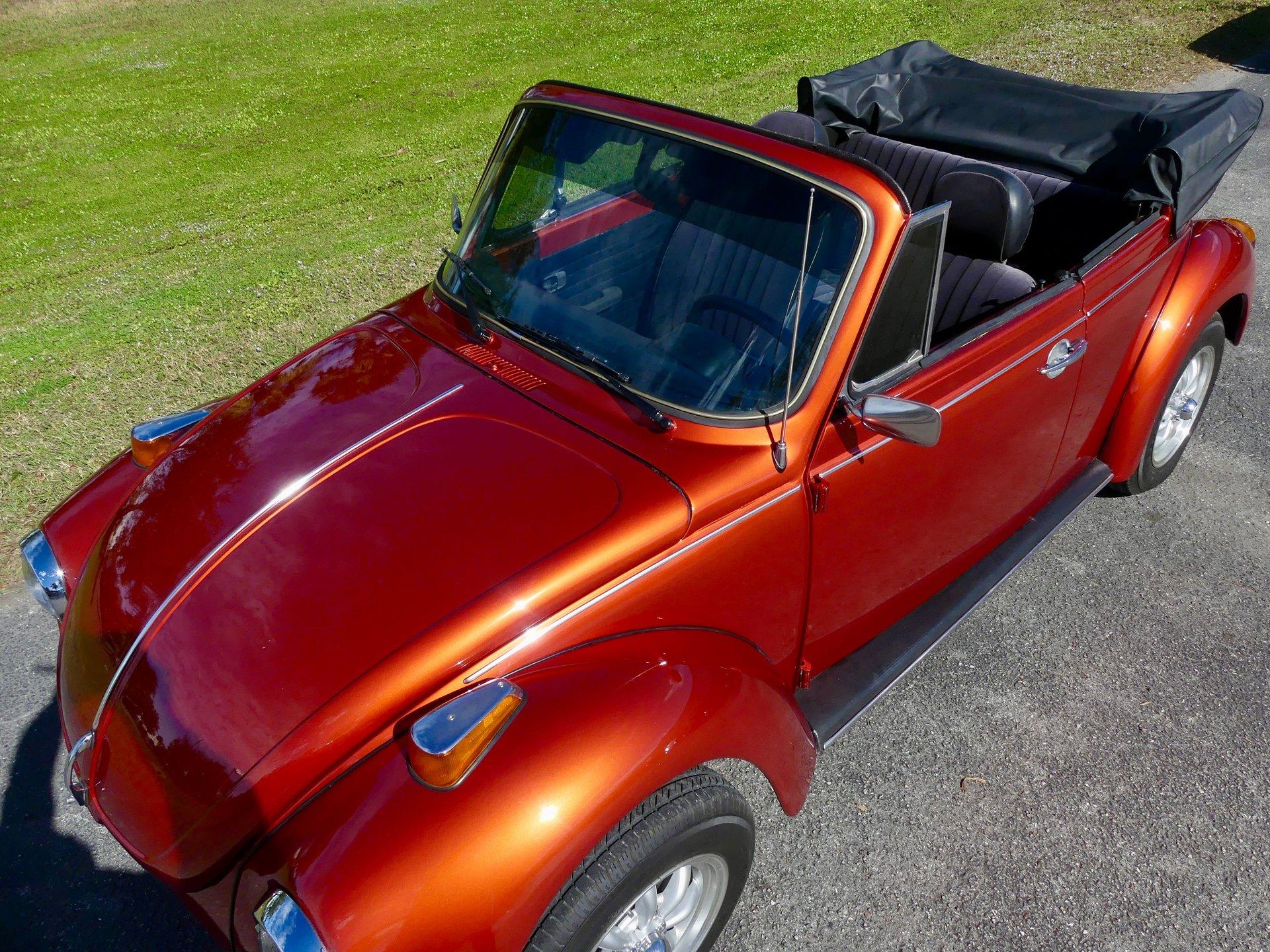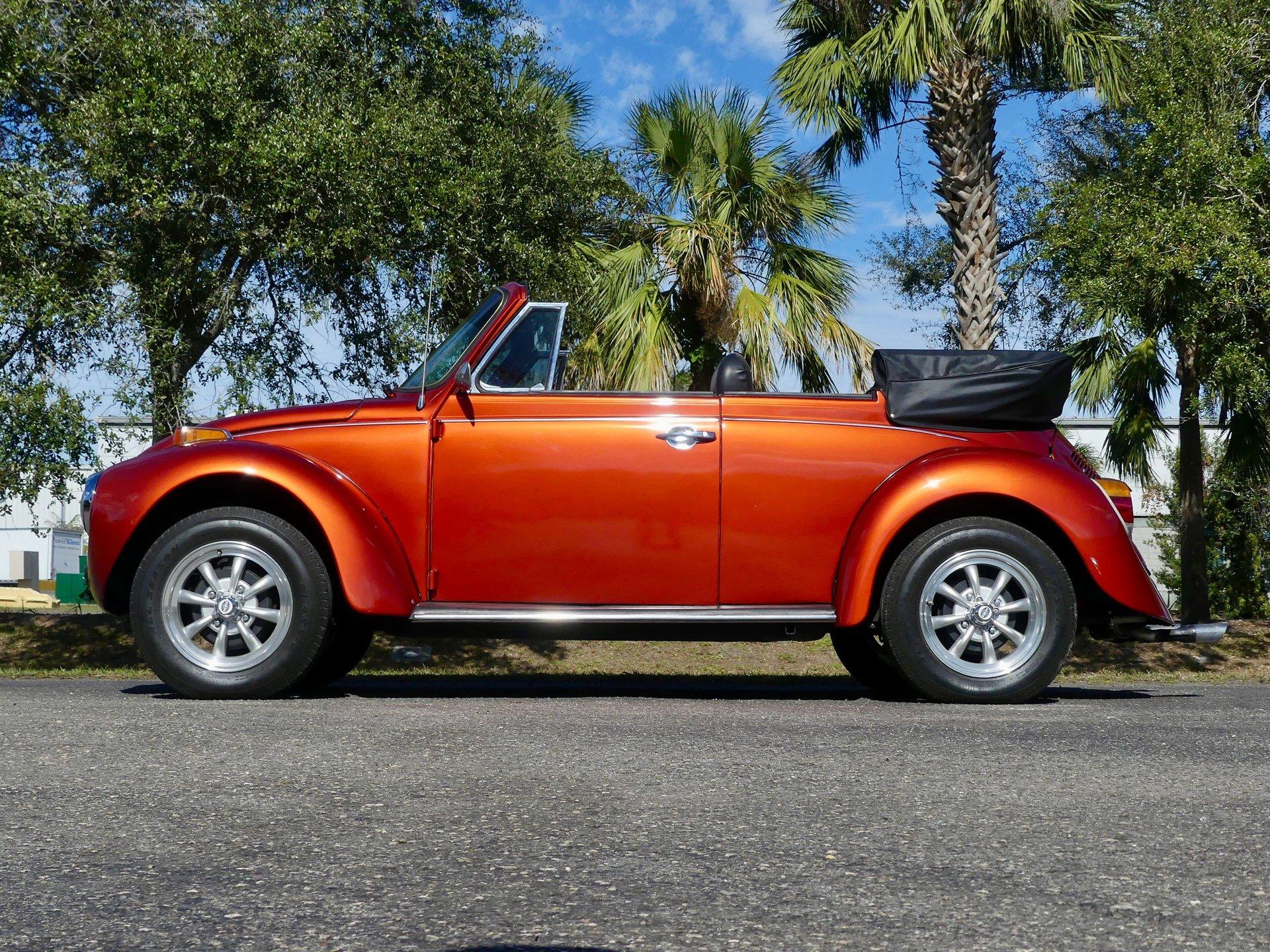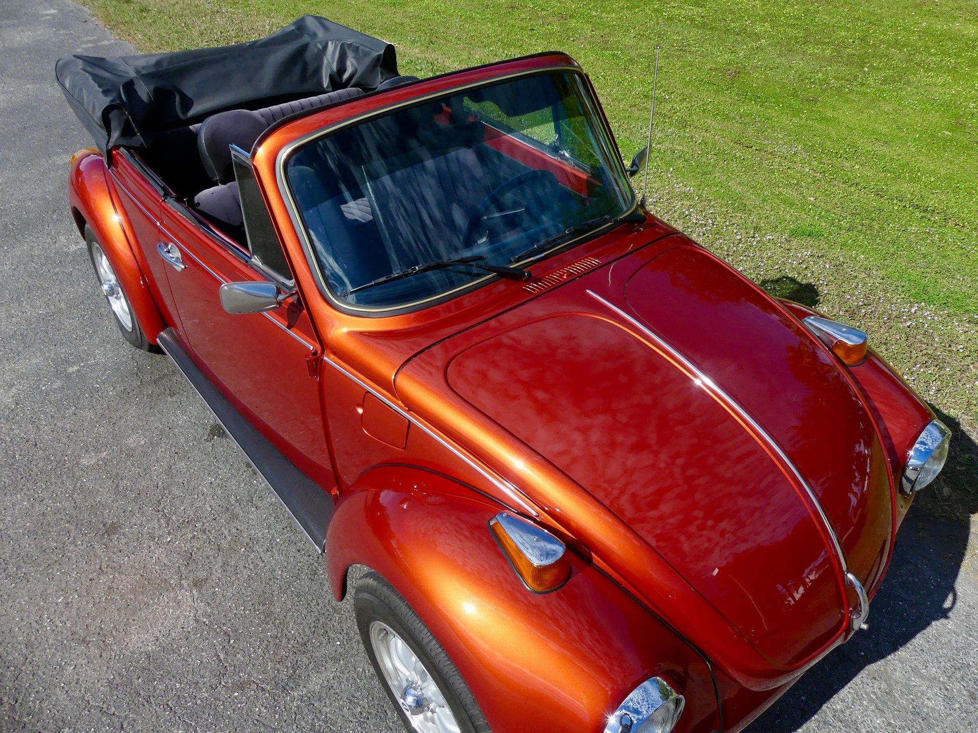 This one features a custom paint color of Burnt Orange Metallic. Paired with EMPI wheels and black convertible top, it is a real show stopper.