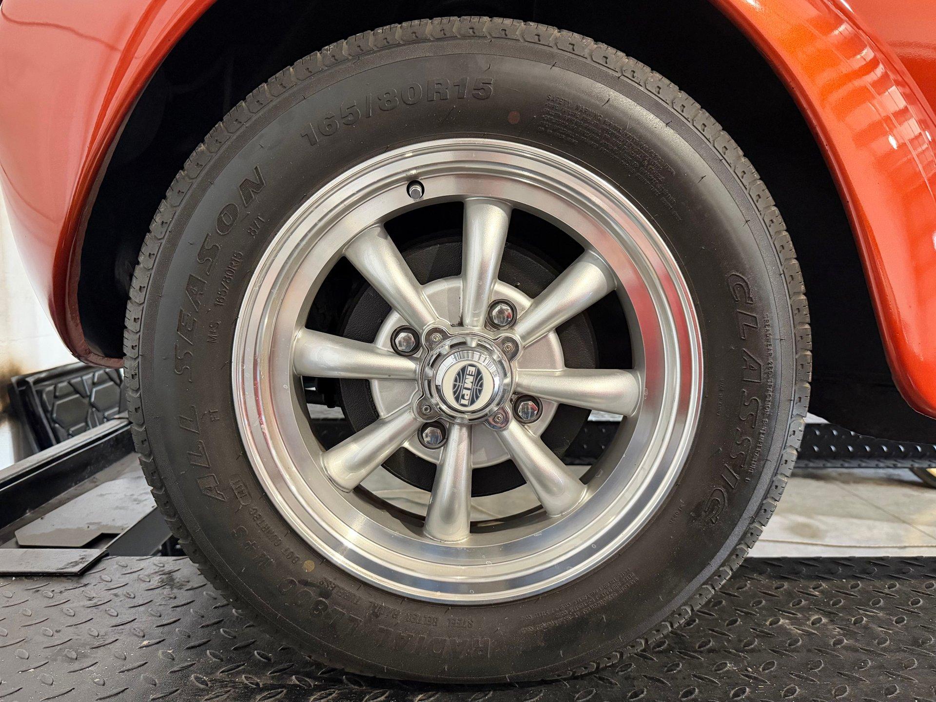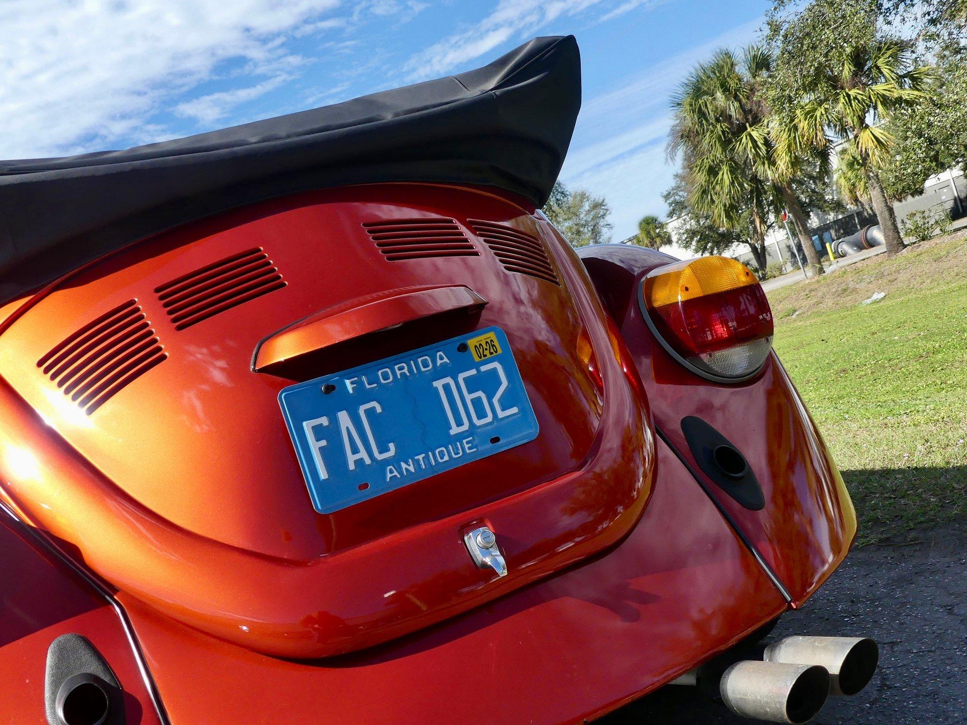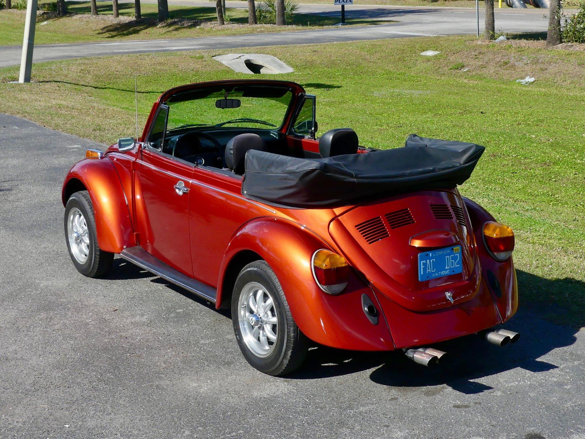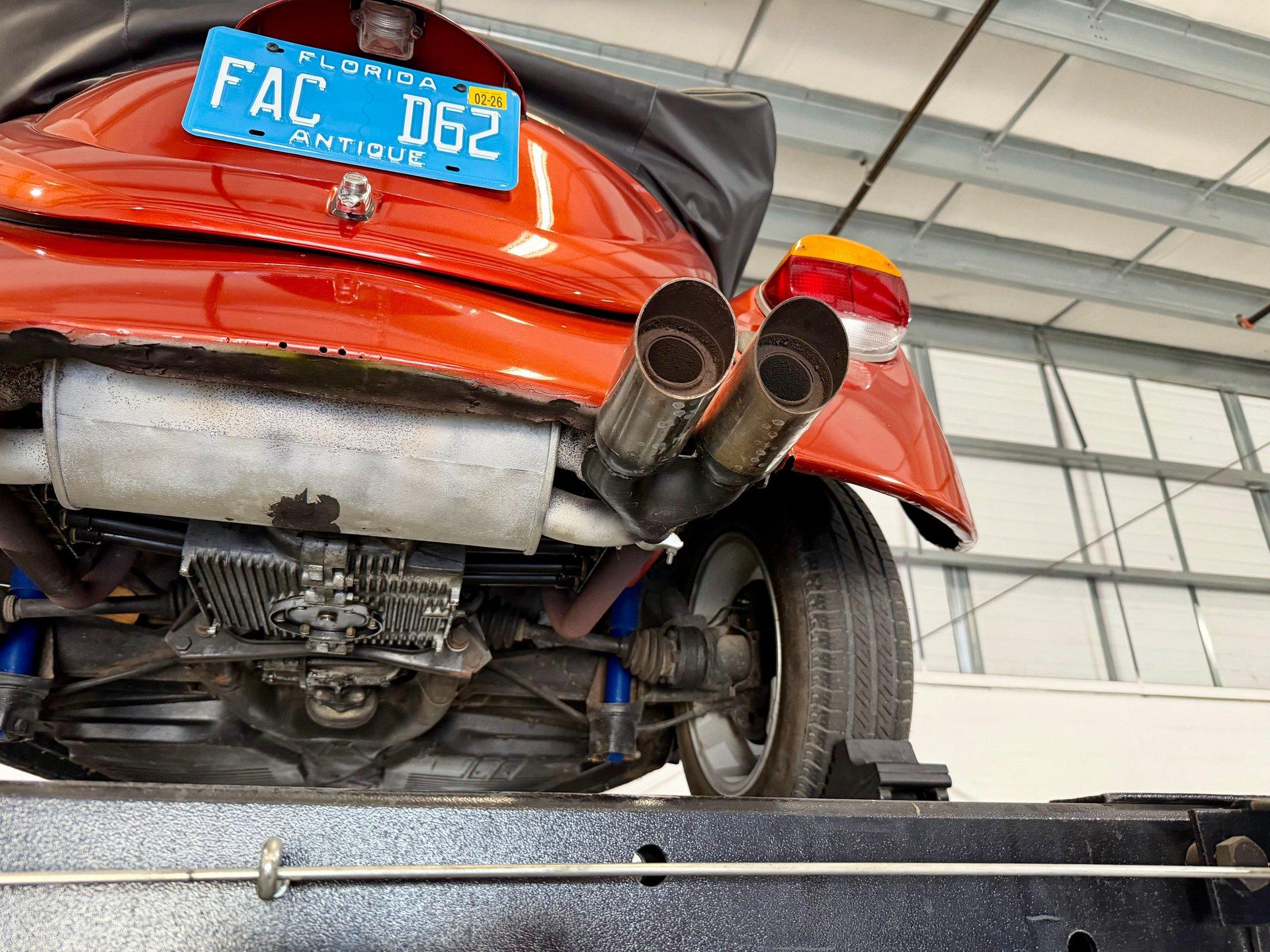 This one features a custom paint color of Burnt Orange Metallic. Paired with EMPI wheels and black convertible top, it is a real show stopper.