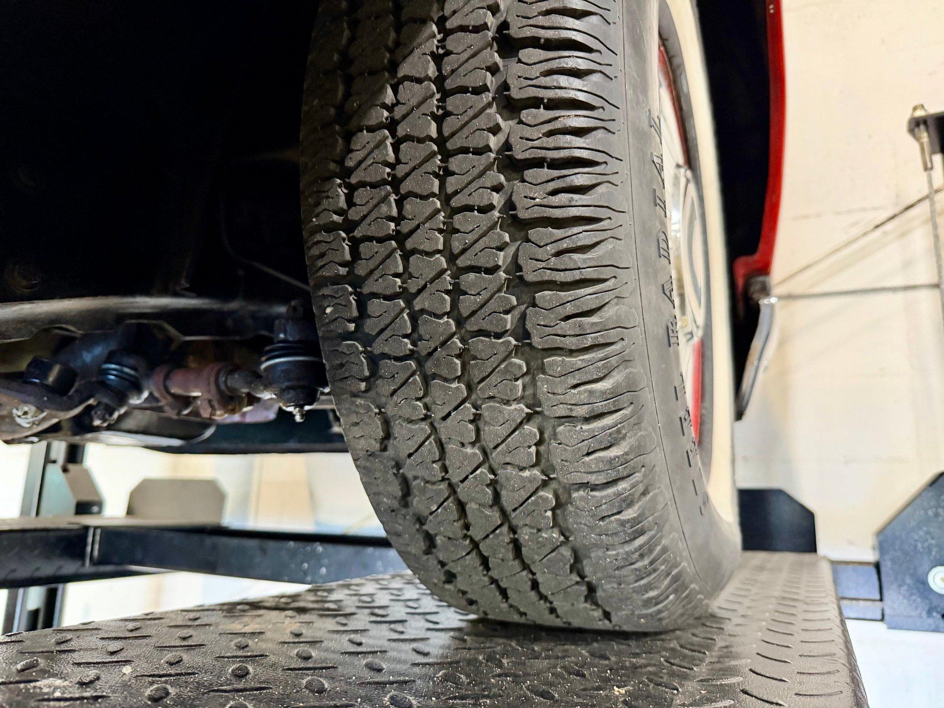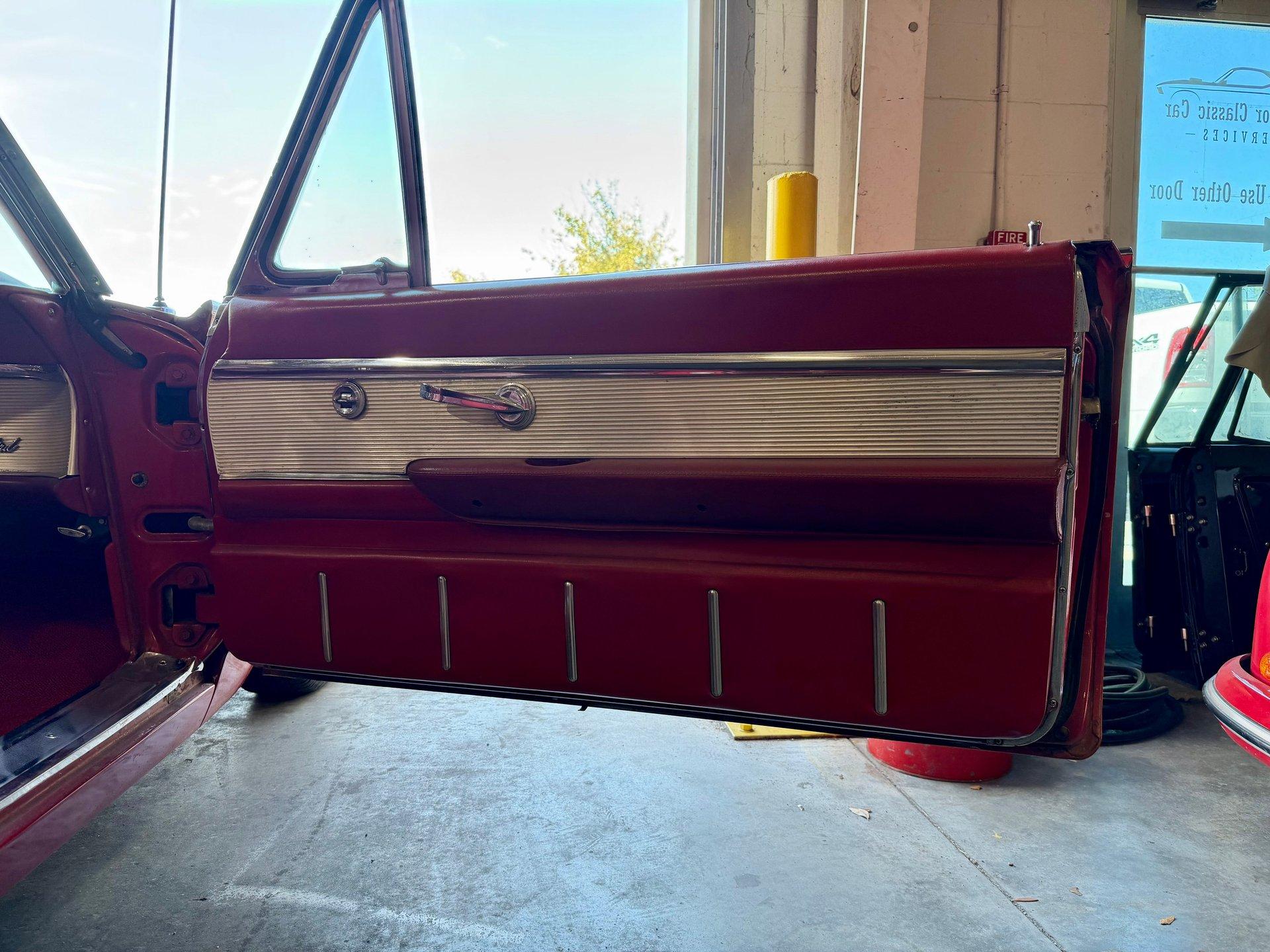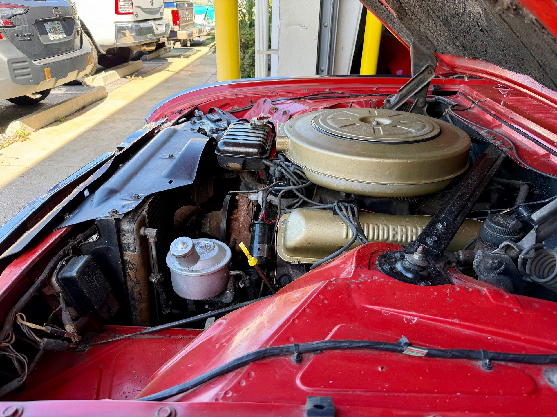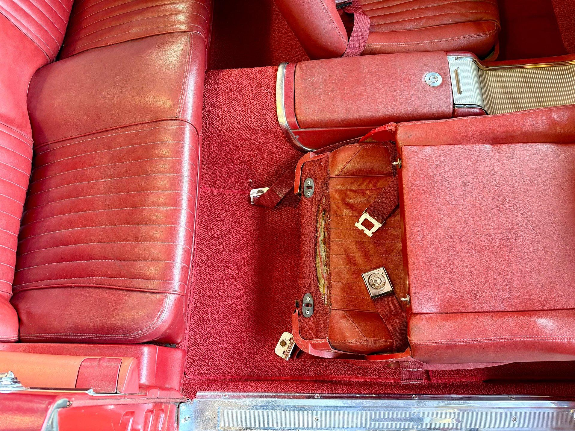 Open up the driver's door and you will see a nice honest red vinyl interior with bucket seats and a beautiful center console. You can get in and out with ease thanks to a tilt-away steering column, and have room for the rest of the family thanks to a roomy rear seat!