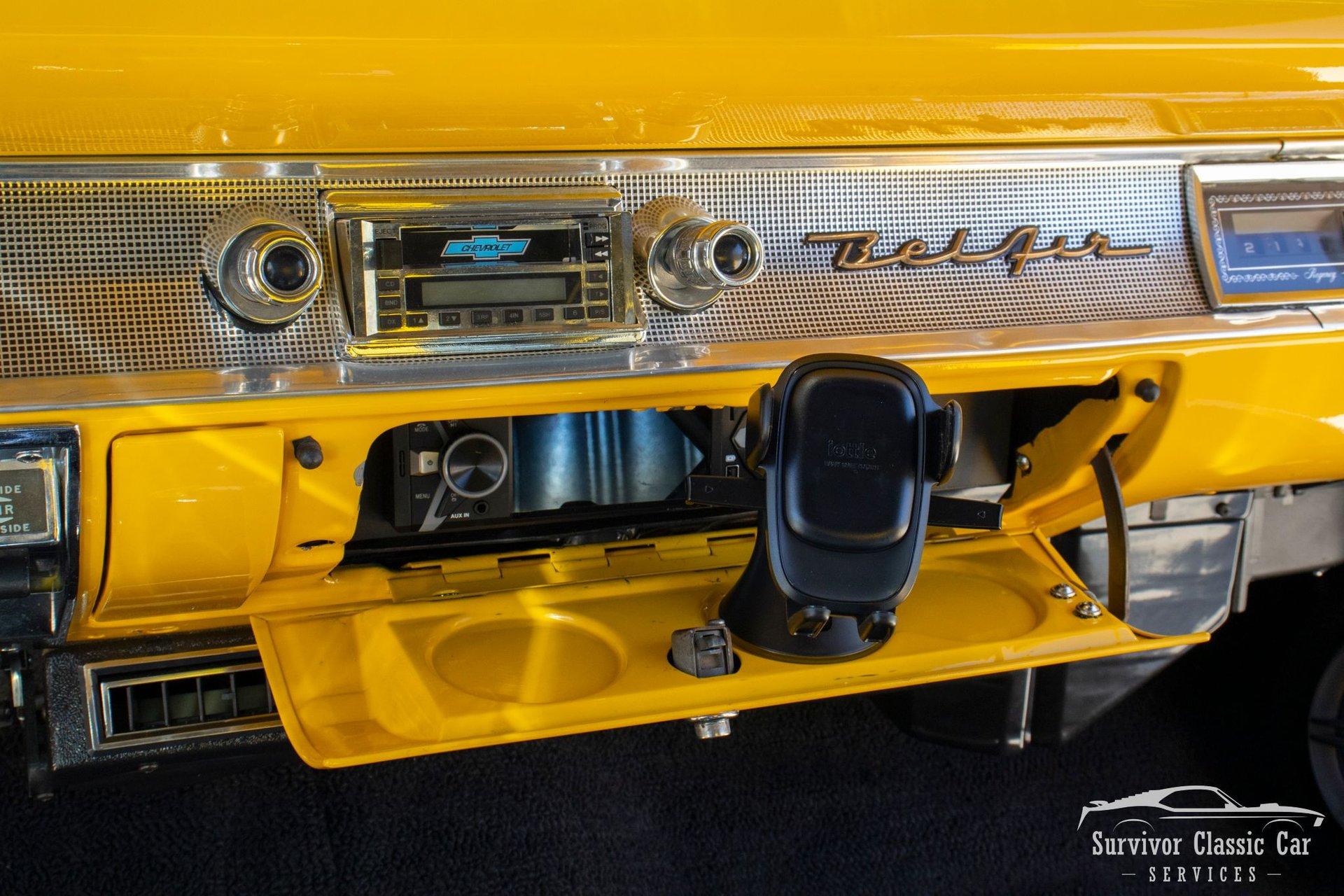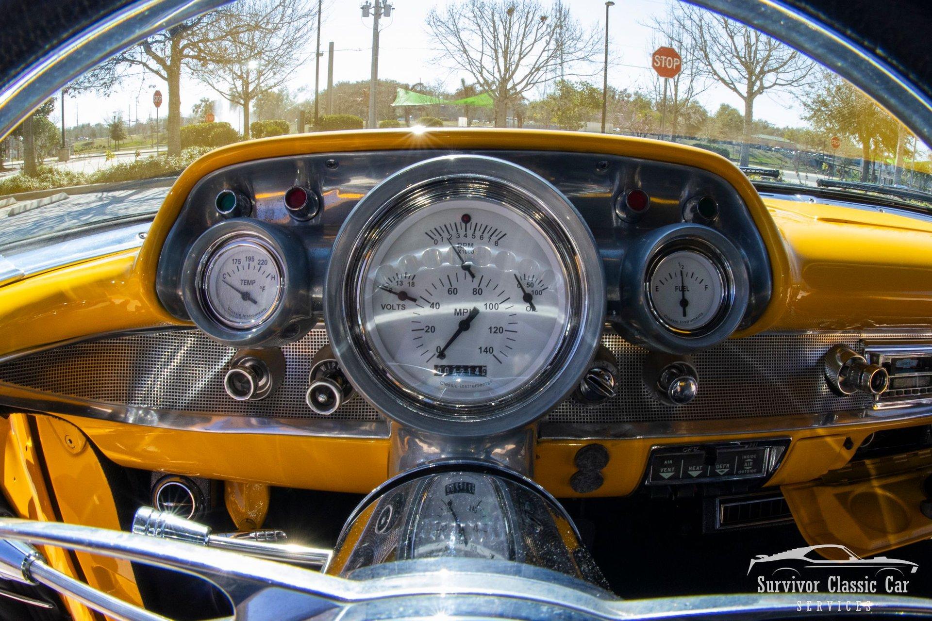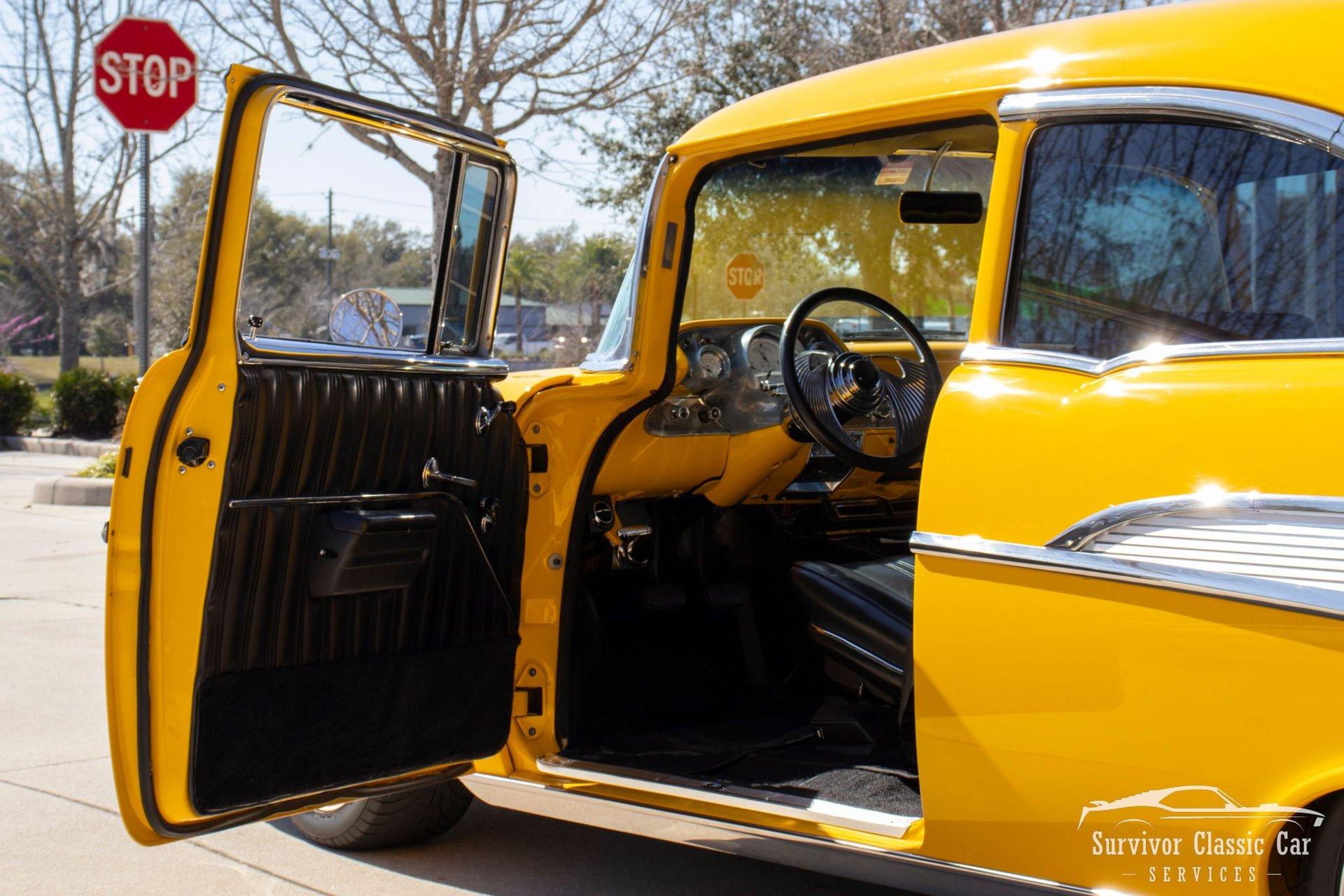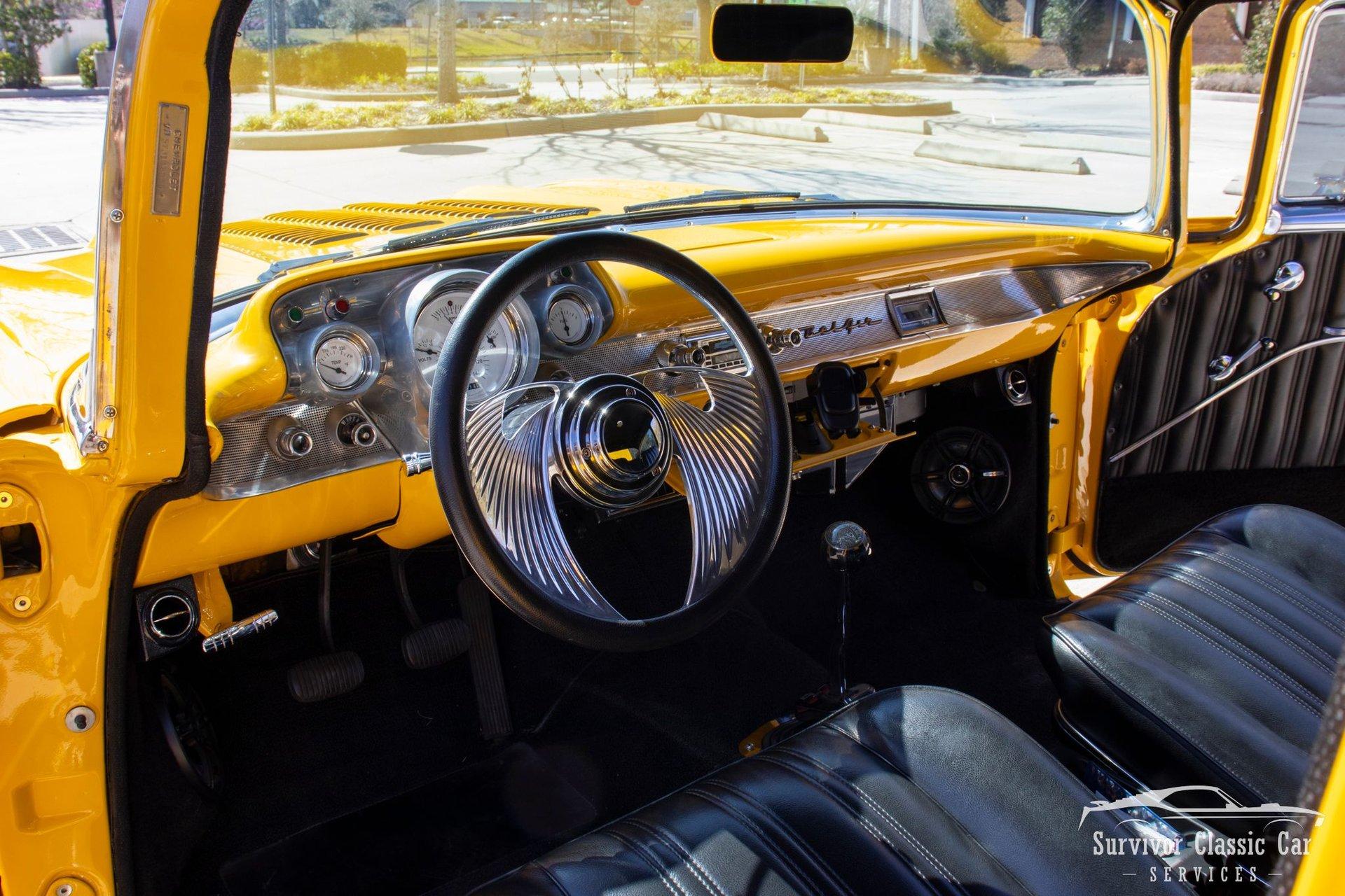 The interior is custom, but not to extreme. That Bright Yellow and Polished Chrome can be seen throughout. A Billet 1/2 Wrapped Steering Wheel attached to the Tilt Steering Column. This 1957 210 was completed 12-years ago, and has been used a just a “Weekend Show Car or Sunday driver” ... The. 4K Miles proves how clean & “new” the the interior still is. The Seating has been swapped out with a 1963 Impala Front Buckets & Rear Bench. And the Audio is sharp with a Clean Alpine Install.