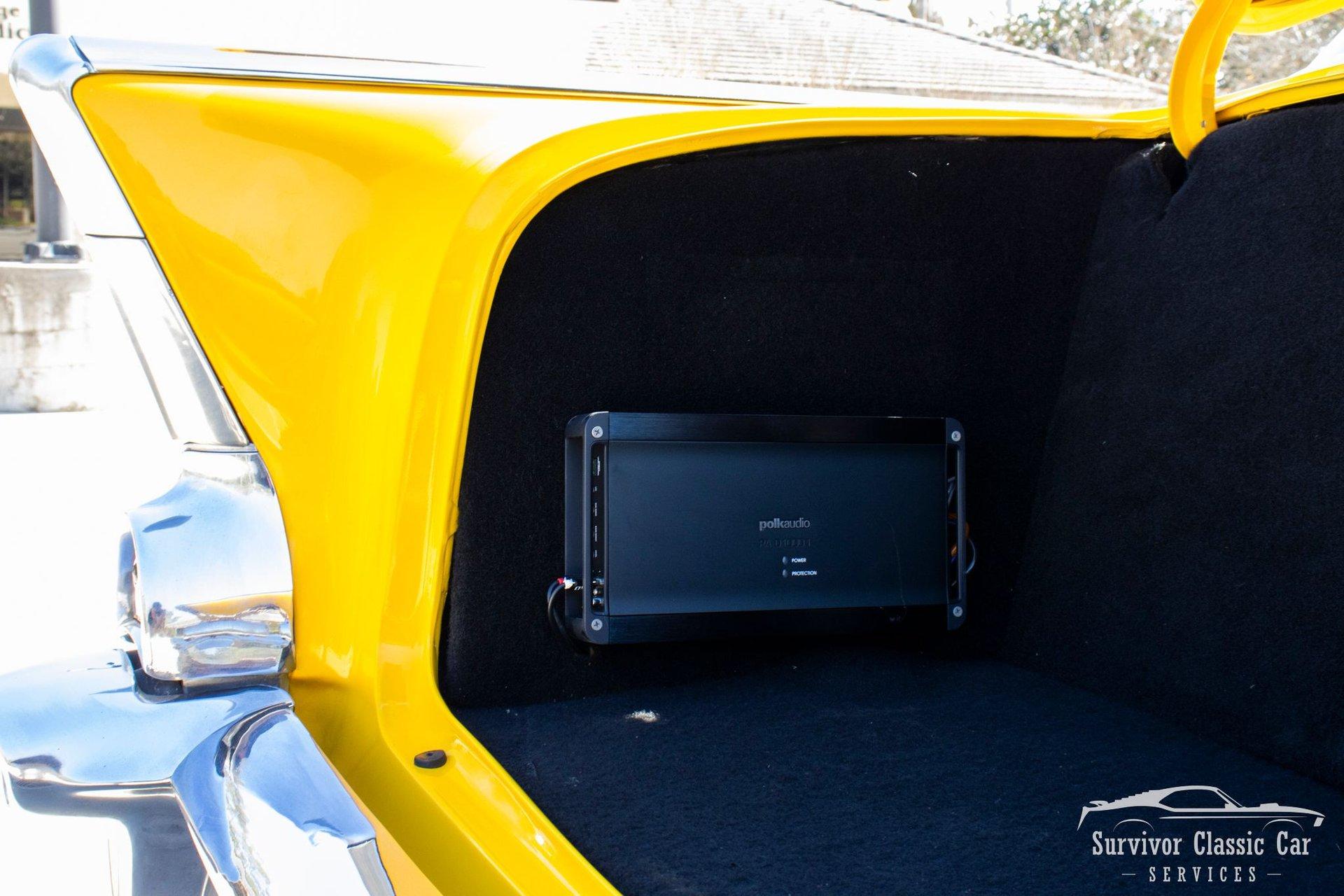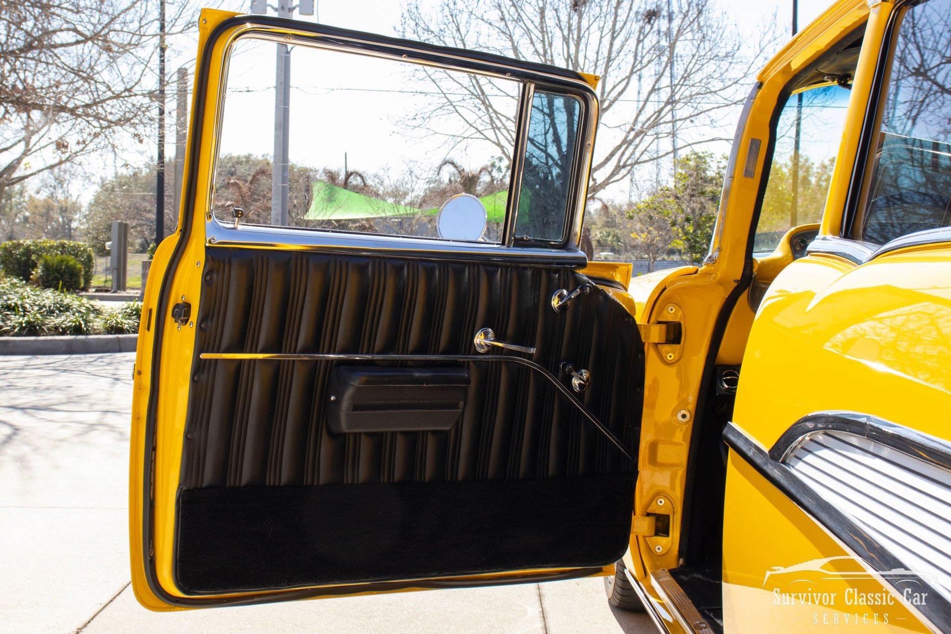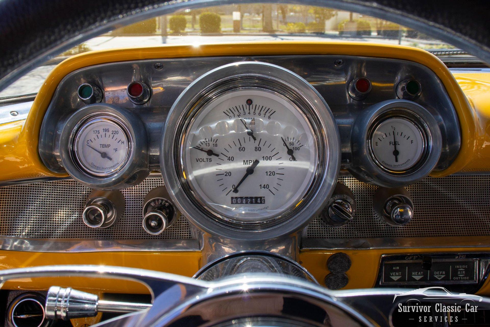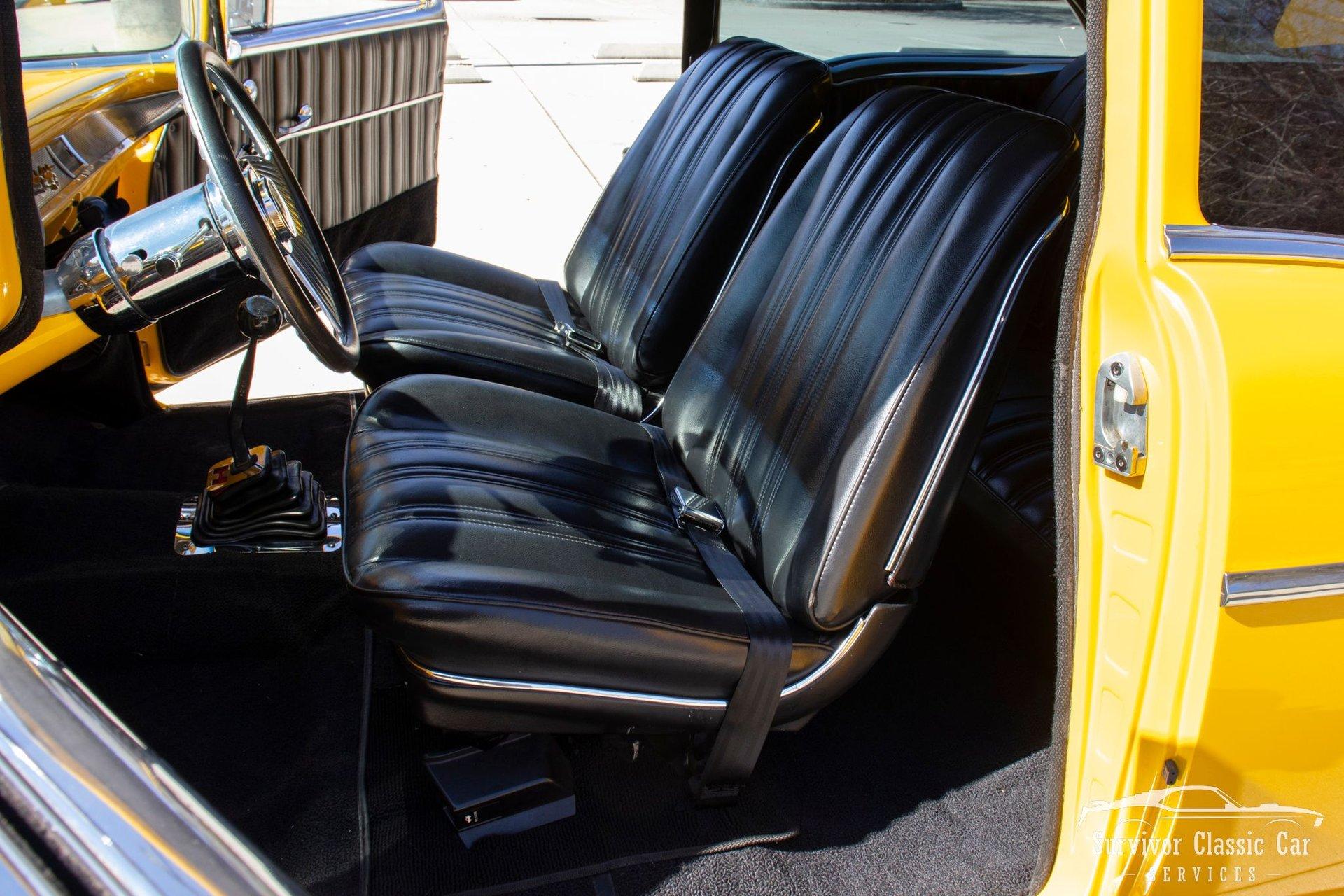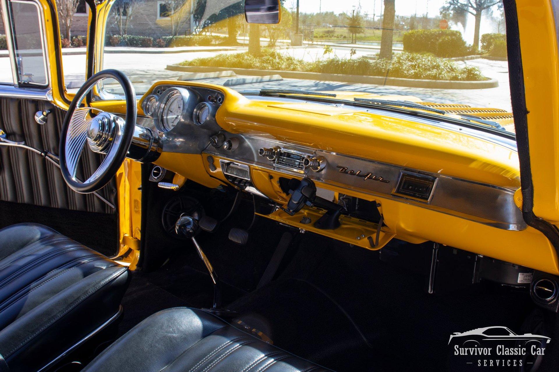 The interior is custom, but not to extreme. That Bright Yellow and Polished Chrome can be seen throughout. A Billet 1/2 Wrapped Steering Wheel attached to the Tilt Steering Column. This 1957 210 was completed 12-years ago, and has been used a just a “Weekend Show Car or Sunday driver” ... The. 4K Miles proves how clean & “new” the the interior still is. The Seating has been swapped out with a 1963 Impala Front Buckets & Rear Bench. And the Audio is sharp with a Clean Alpine Install.