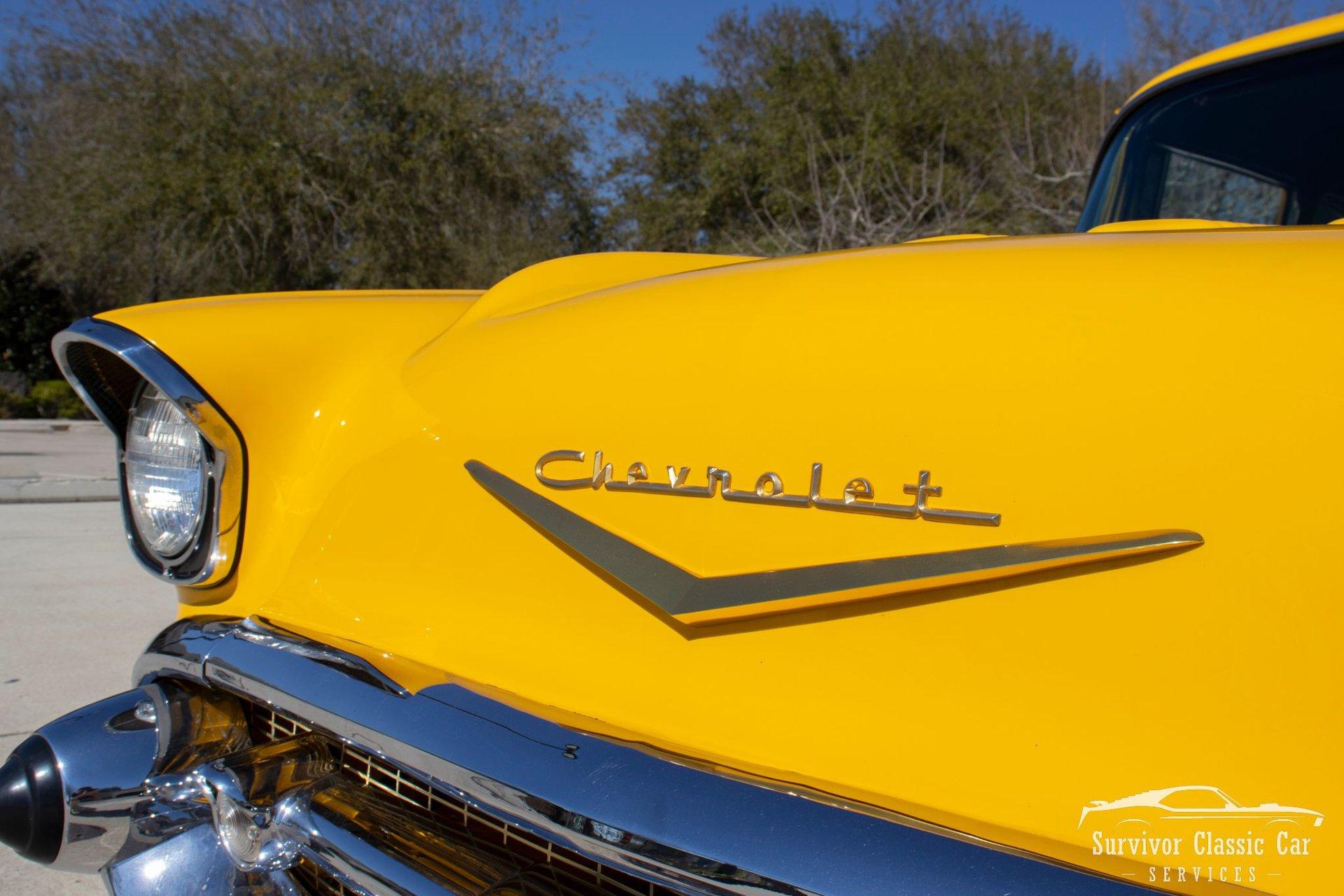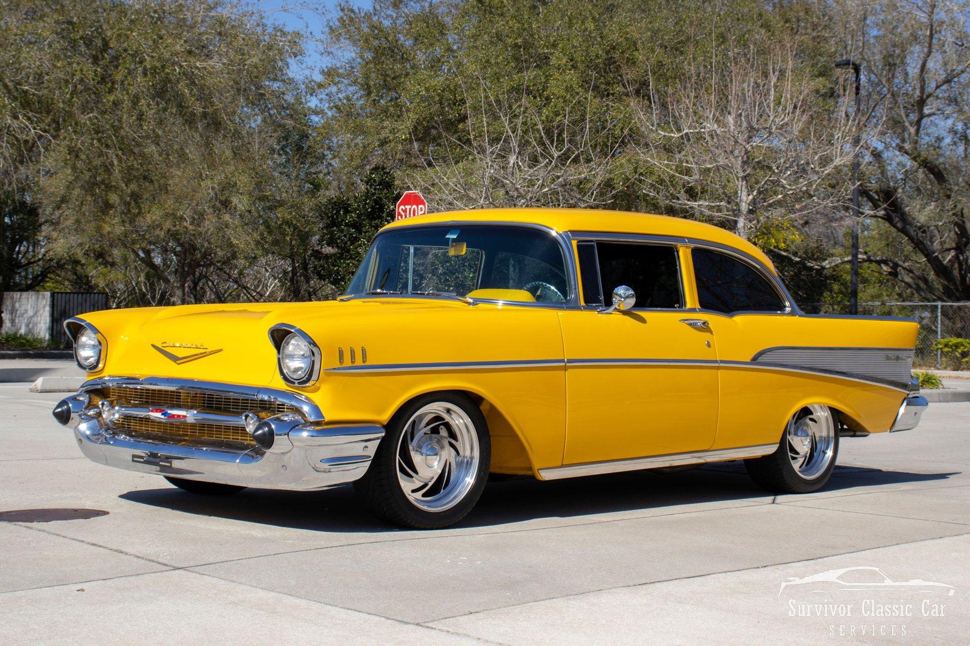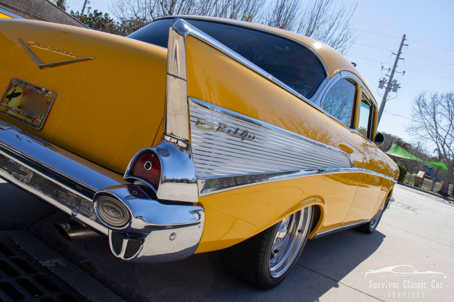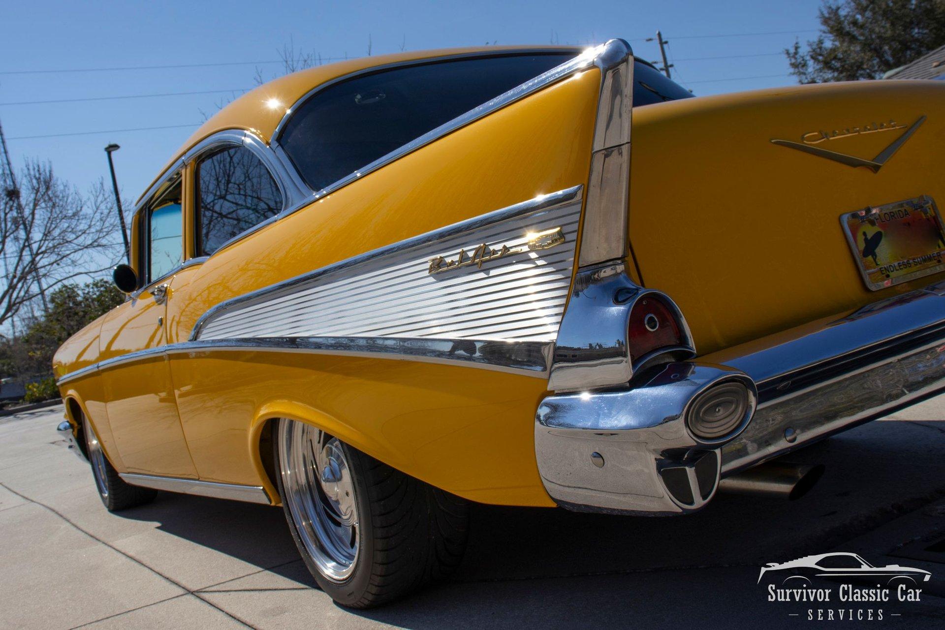 It's safe to say that the Bel Air has become America's sweetheart and is one of the most recognized icons of the car world. With its elegant rear fins and anodized aluminum side trim panels. Even though this 1957 Chevrolet is not a Bel-Air, but instead a 210, it still pays tribute those iconic aluminum sails and badging. The Exterior is painted in this bright yellow, which helps accentuate the chrome & Vintage 17in Billet Specialties “Pyscho” Wheels.
