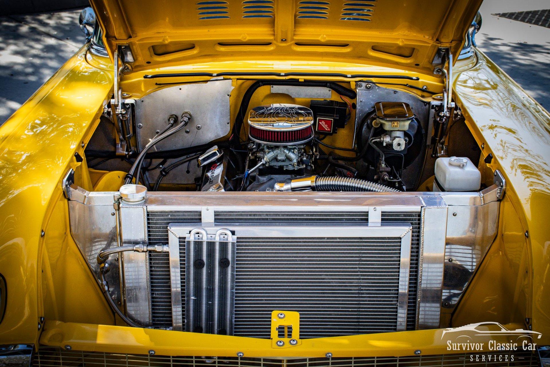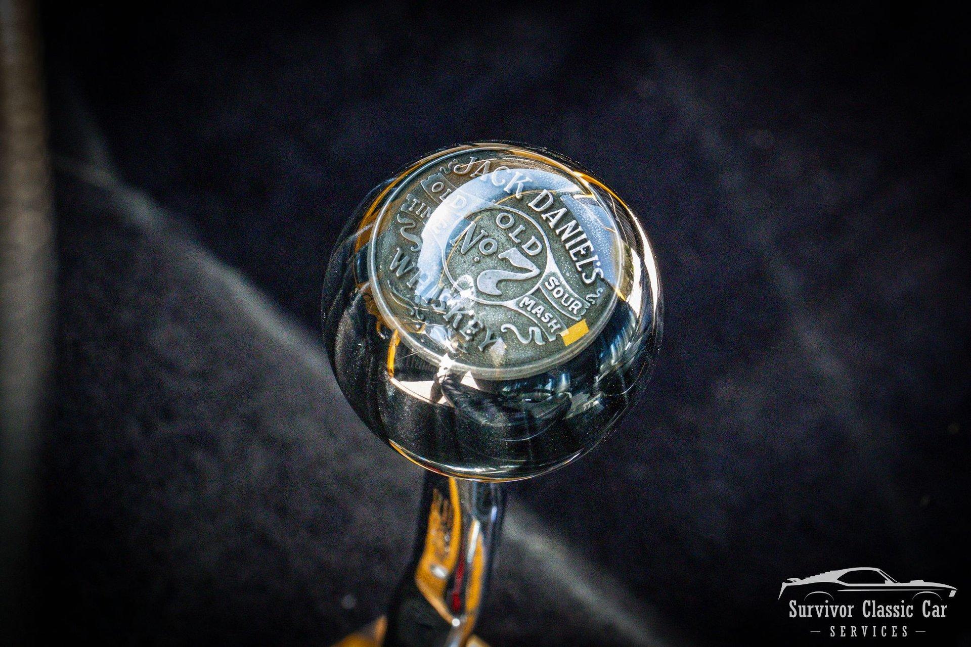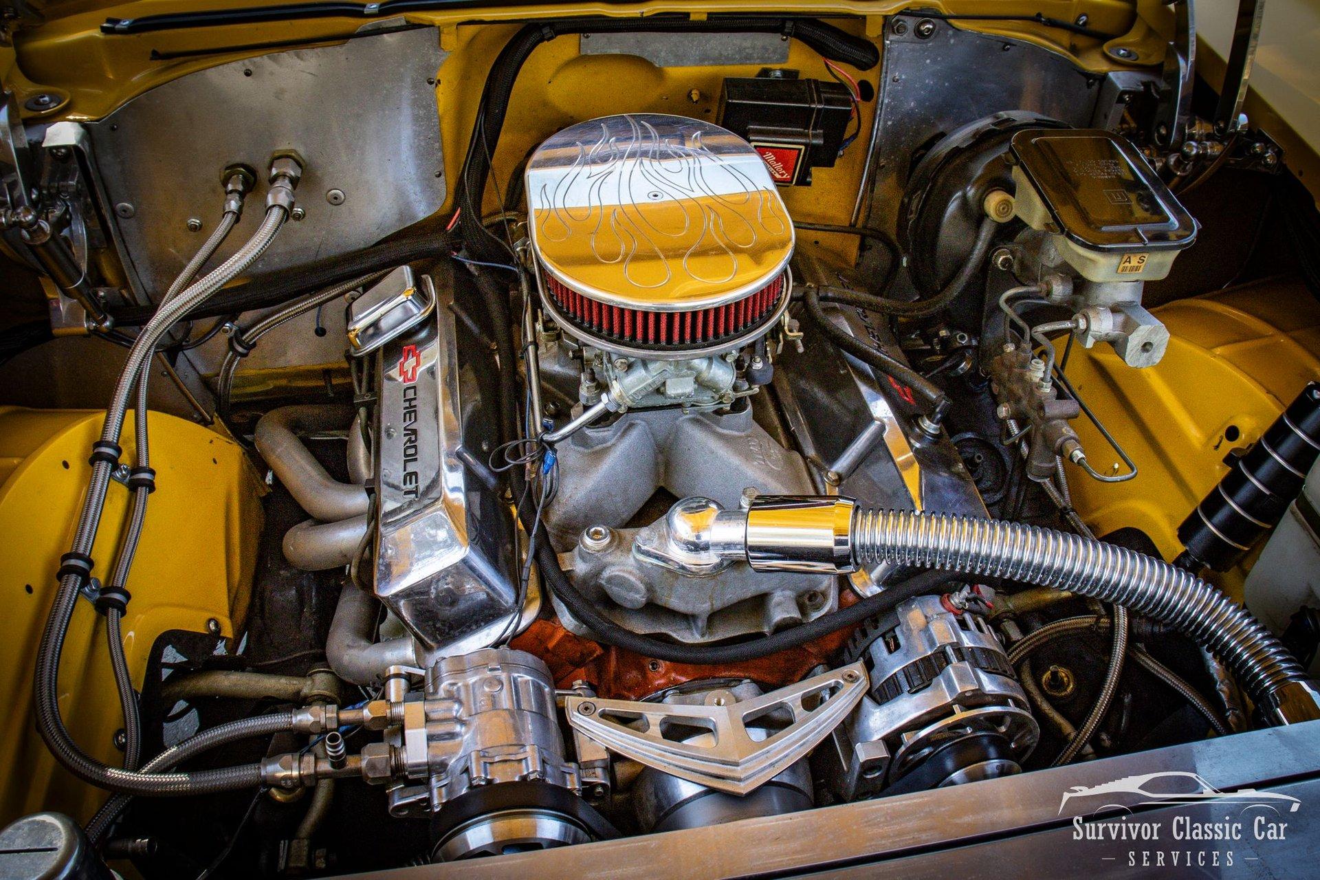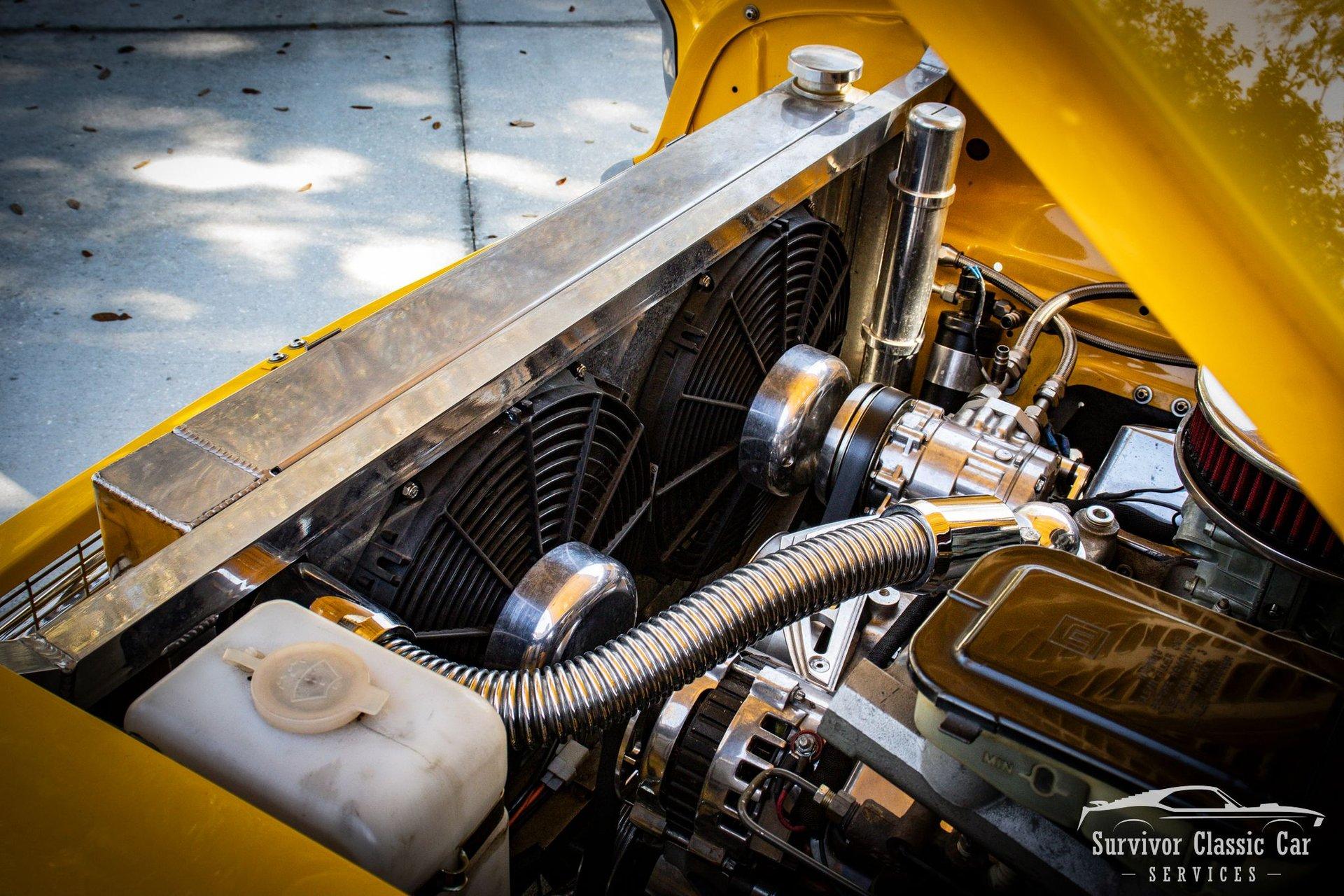 Under the custom louvered hood is a fully dressed-up Billet & Chrome 5.7L 350 V8. Polished Flame-Series Billet Air Cleaner with a Holley 4BBL Carburetor, all sitting on top of a Weiand Team-G Raised Intake Manifold. The polished Ceramic Coated Long-tube Headers add a little more flare along with the Polished Full Aluminum Radiator Support, Radiator & Dual Electric Fans. A Few other Modern Upgrade is the Power Steering, 4-Wheel Powered Disc Brakes & Electric Ignition. The 4-Speed Manual Transmission shifts smooth like butter.
