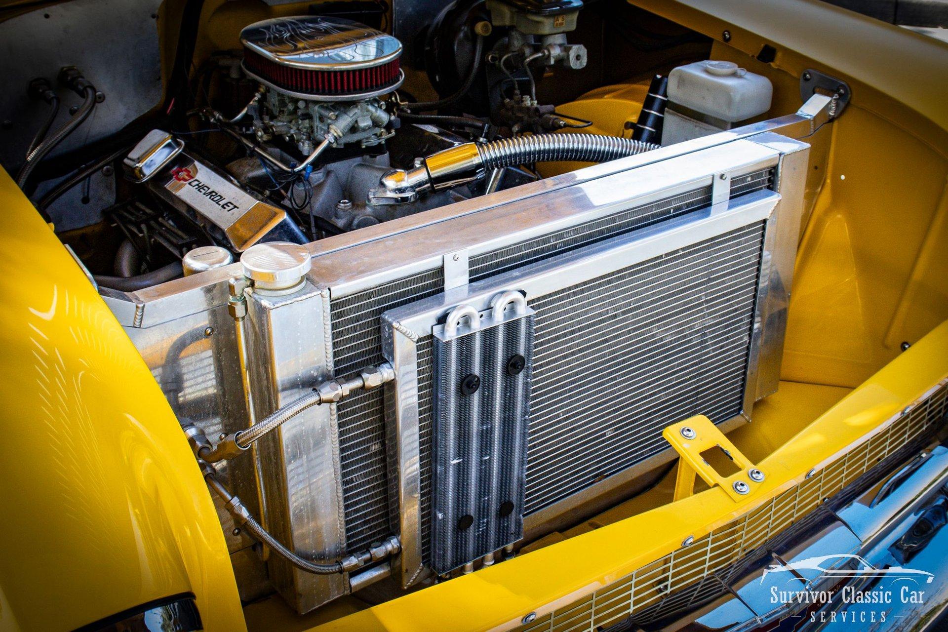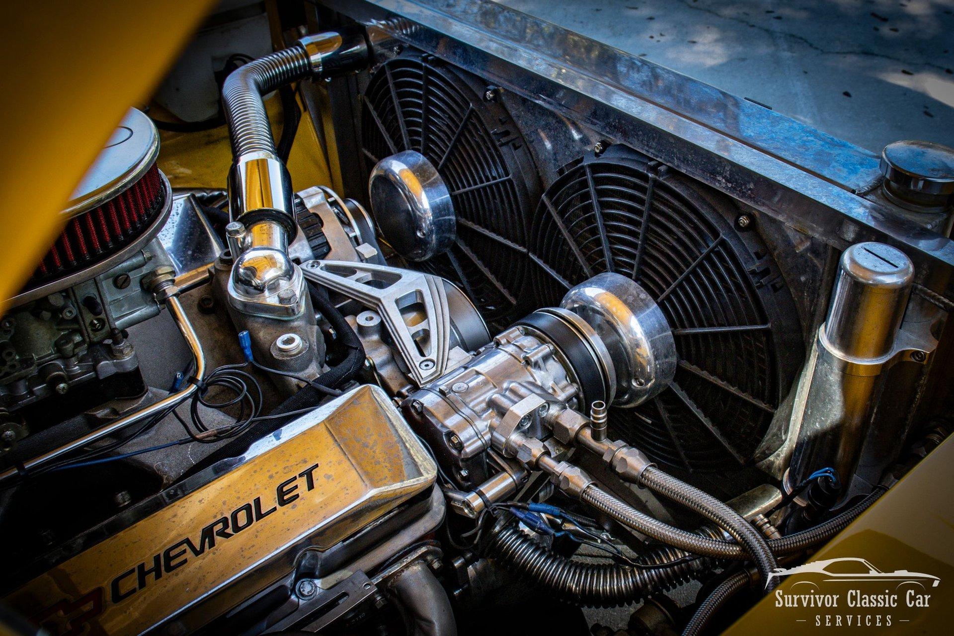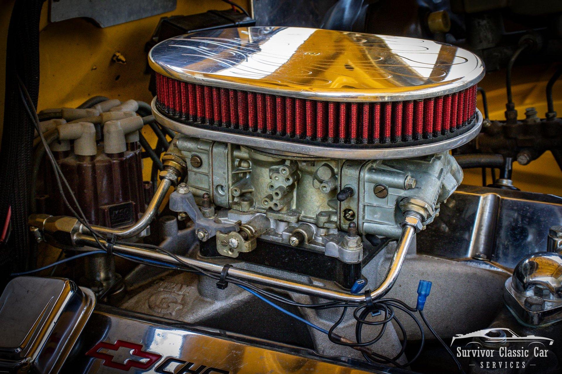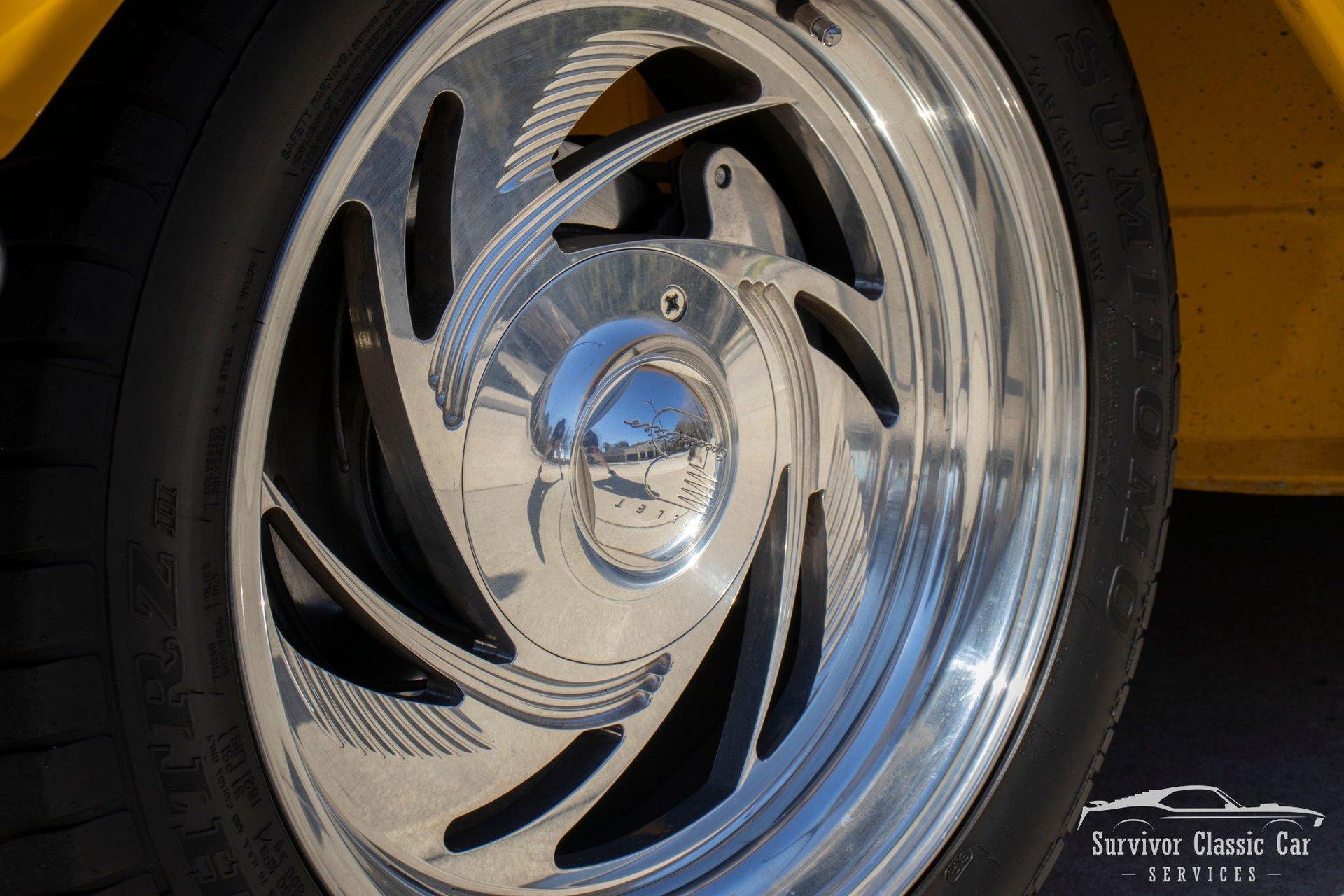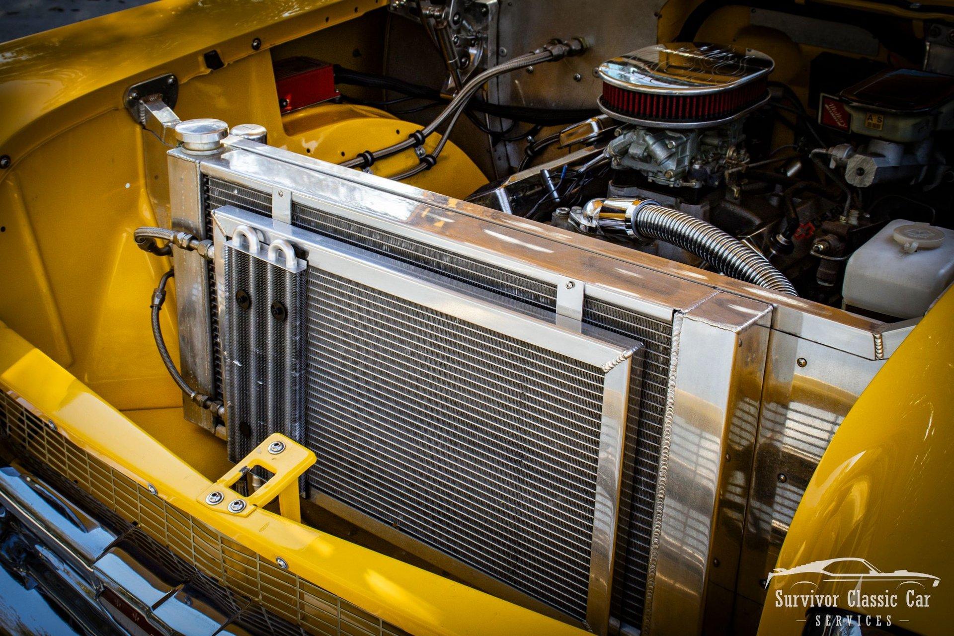 Under the custom louvered hood is a fully dressed-up Billet & Chrome 5.7L 350 V8. Polished Flame-Series Billet Air Cleaner with a Holley 4BBL Carburetor, all sitting on top of a Weiand Team-G Raised Intake Manifold. The polished Ceramic Coated Long-tube Headers add a little more flare along with the Polished Full Aluminum Radiator Support, Radiator & Dual Electric Fans. A Few other Modern Upgrade is the Power Steering, 4-Wheel Powered Disc Brakes & Electric Ignition. The 4-Speed Manual Transmission shifts smooth like butter.