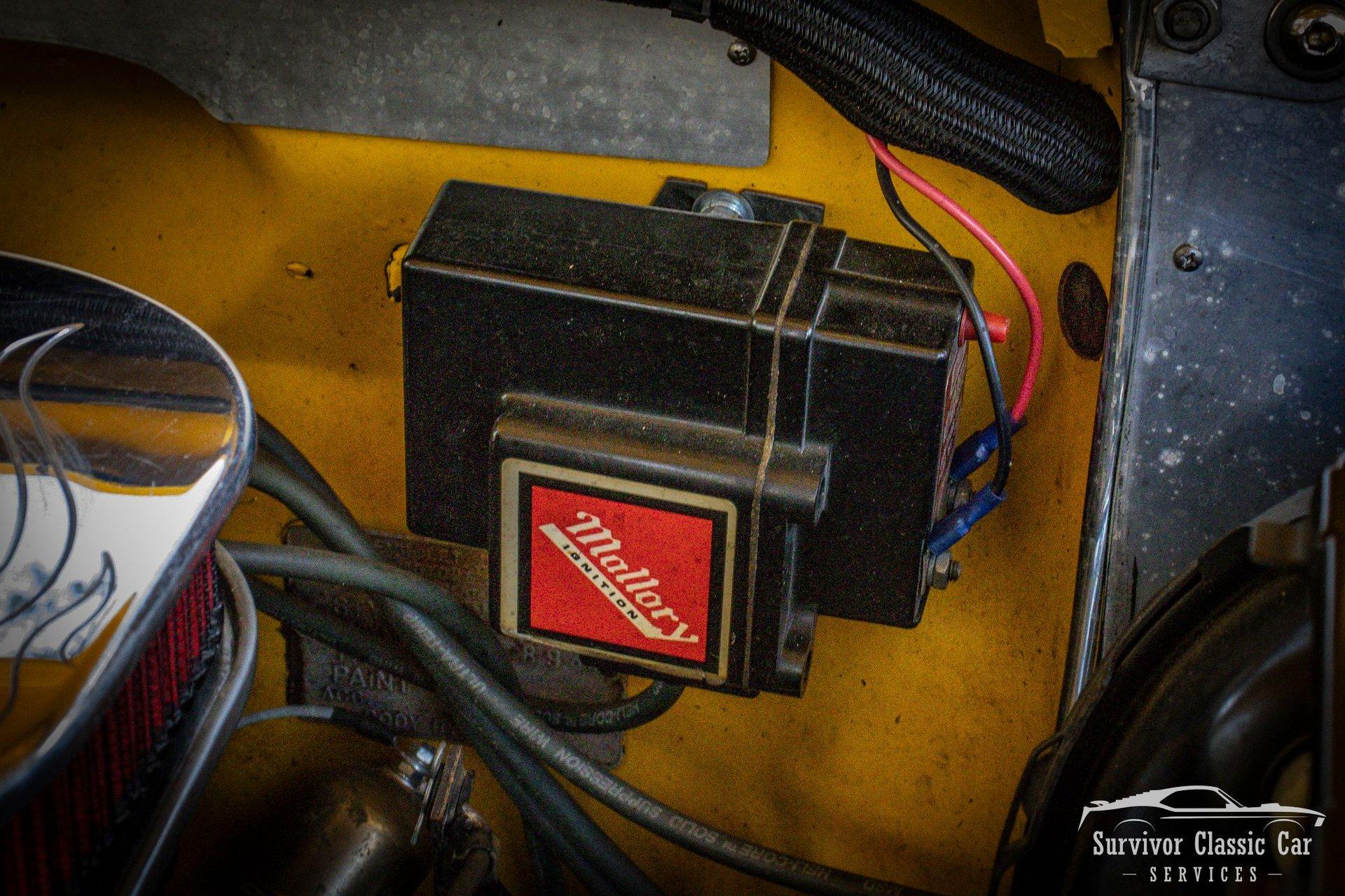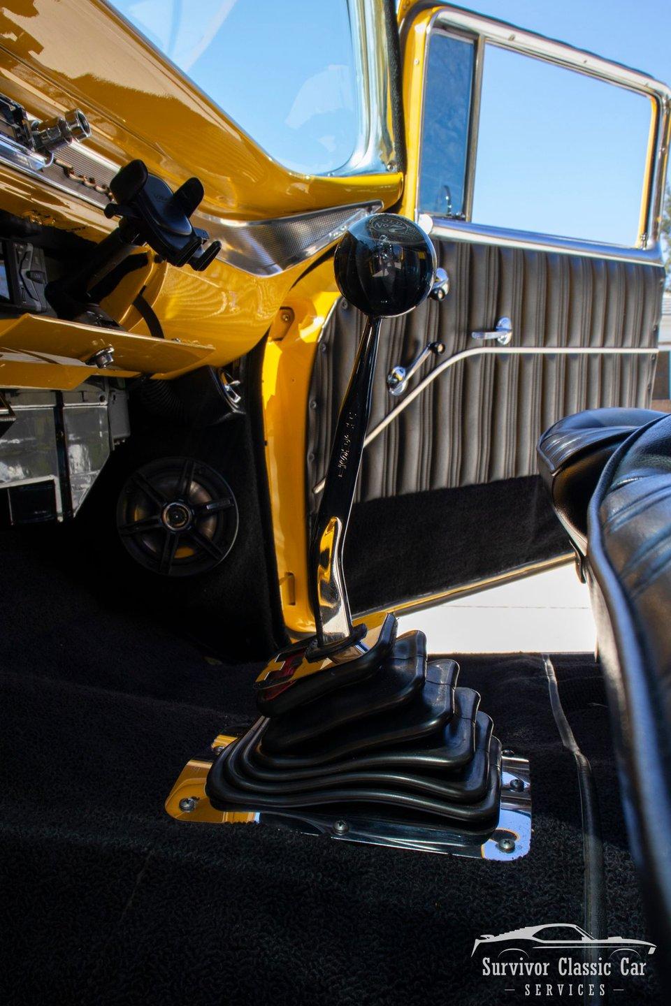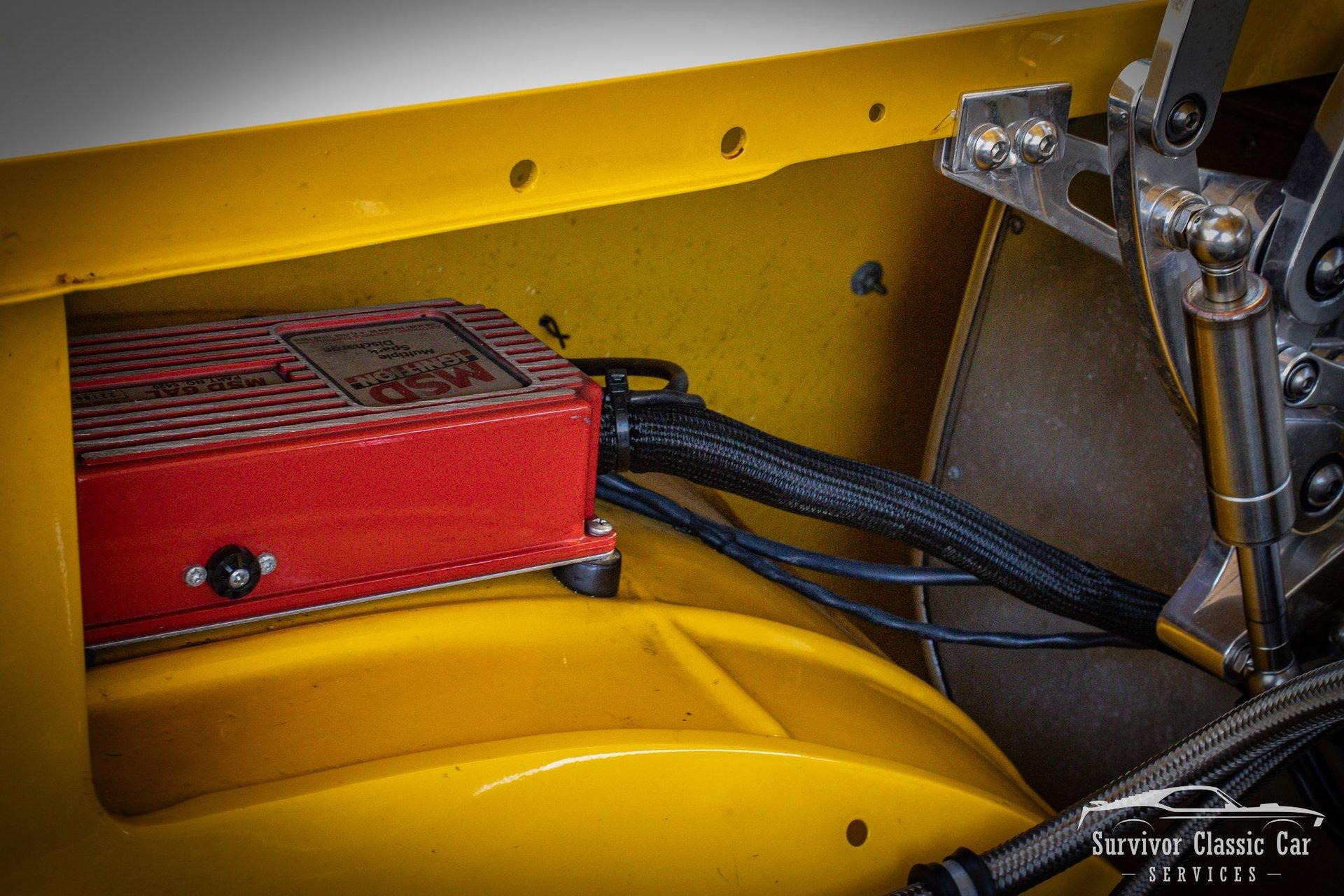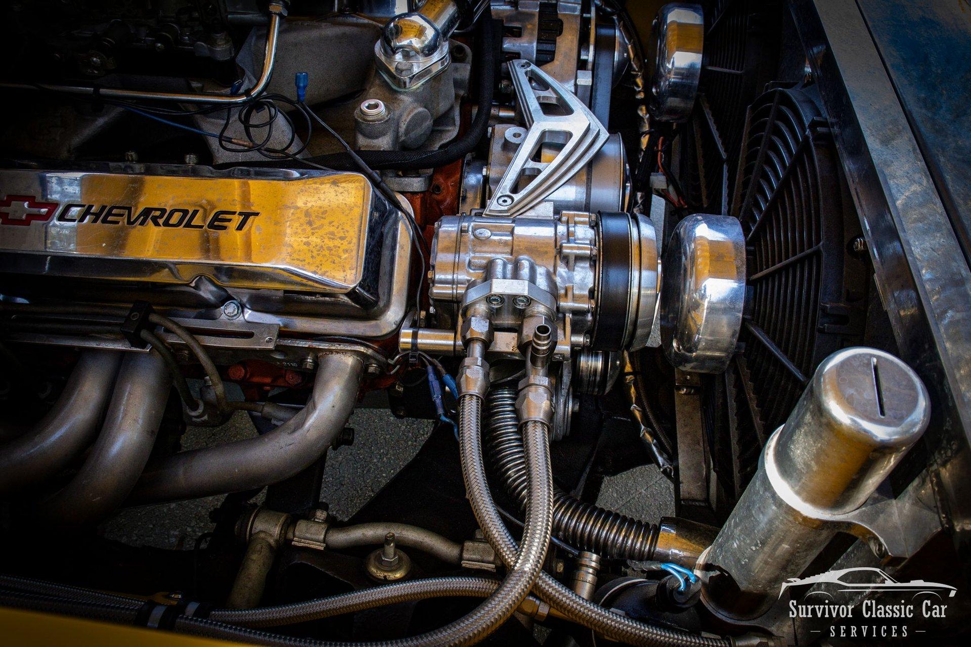 Under the custom louvered hood is a fully dressed-up Billet & Chrome 5.7L 350 V8. Polished Flame-Series Billet Air Cleaner with a Holley 4BBL Carburetor, all sitting on top of a Weiand Team-G Raised Intake Manifold. The polished Ceramic Coated Long-tube Headers add a little more flare along with the Polished Full Aluminum Radiator Support, Radiator & Dual Electric Fans. A Few other Modern Upgrade is the Power Steering, 4-Wheel Powered Disc Brakes & Electric Ignition. The 4-Speed Manual Transmission shifts smooth like butter.