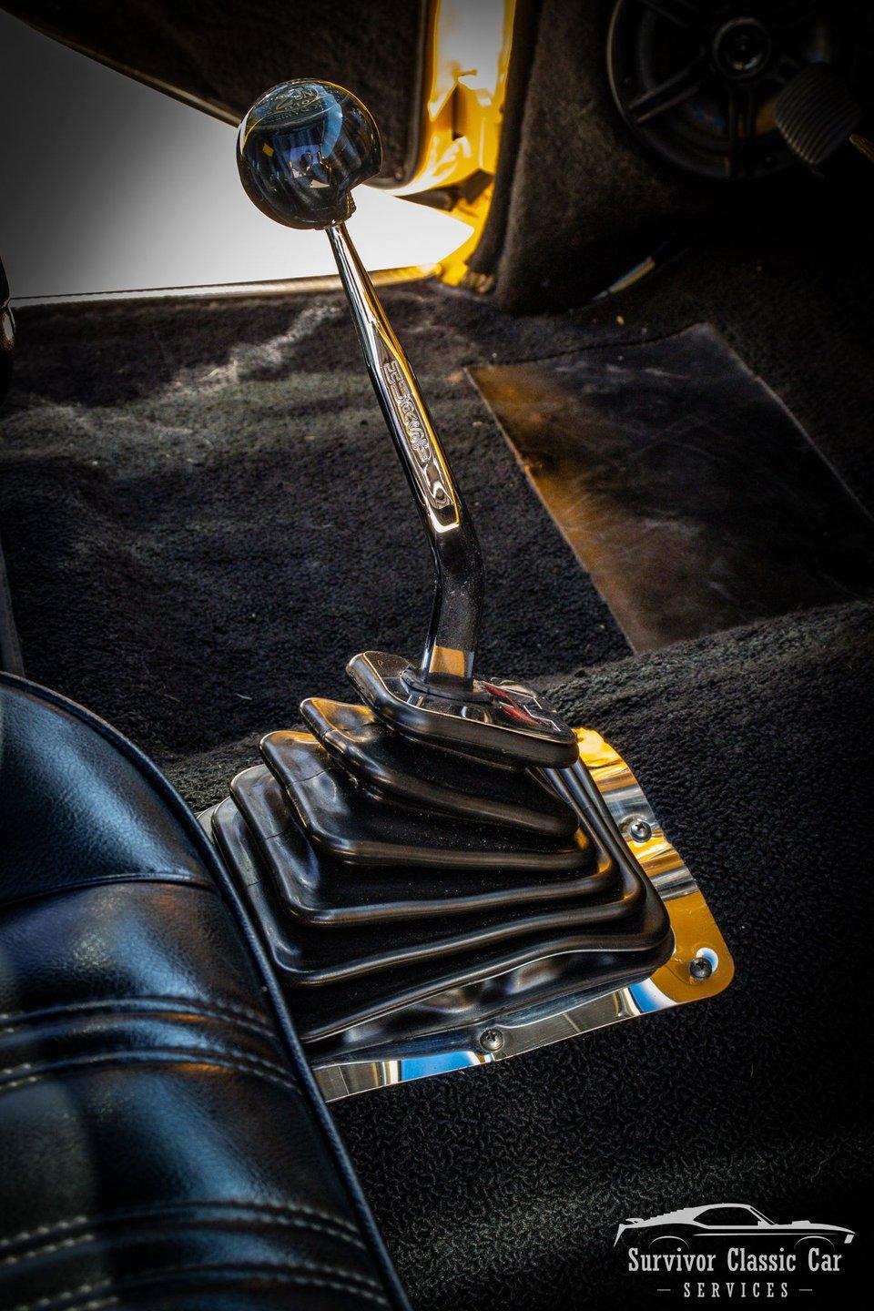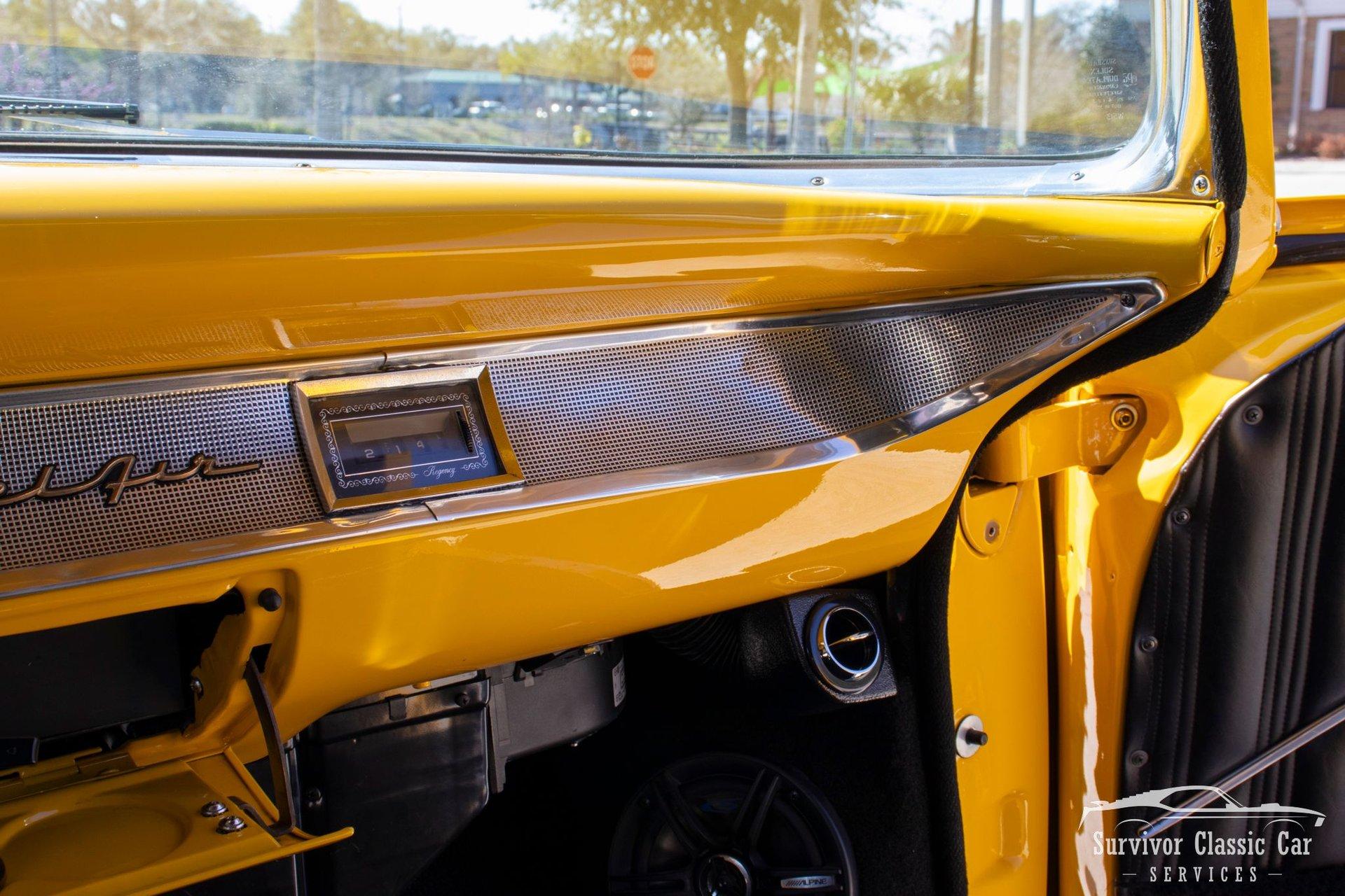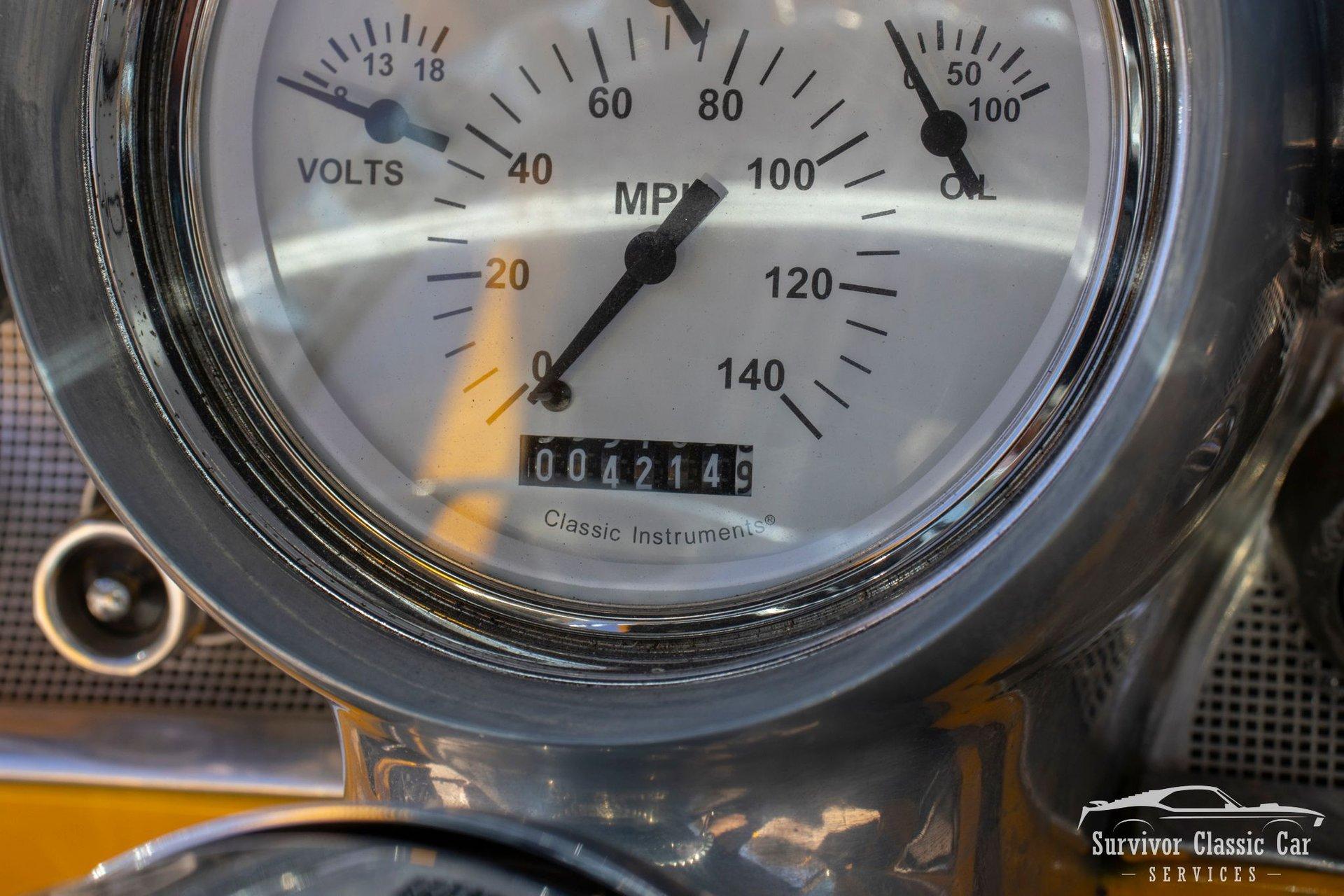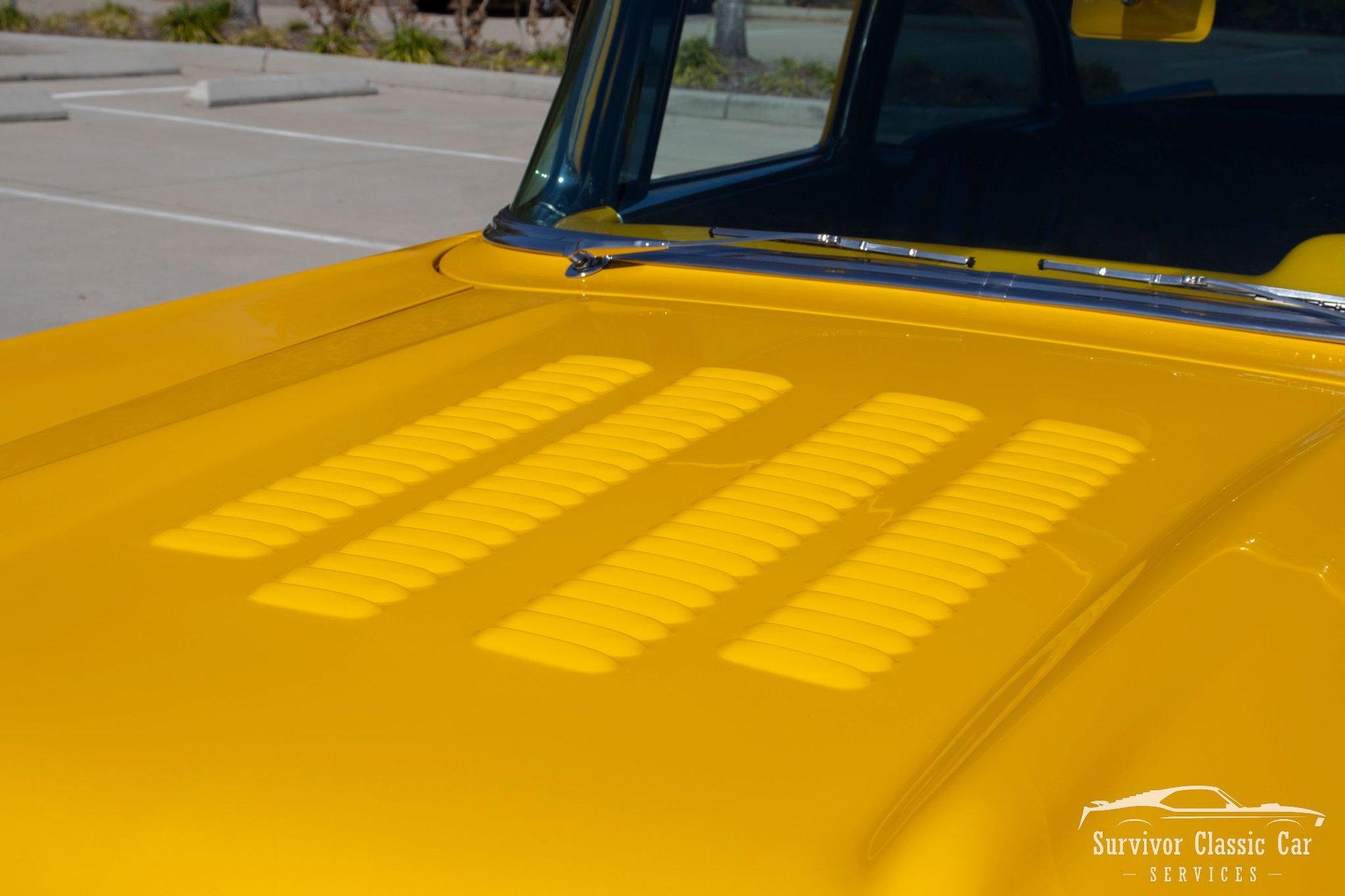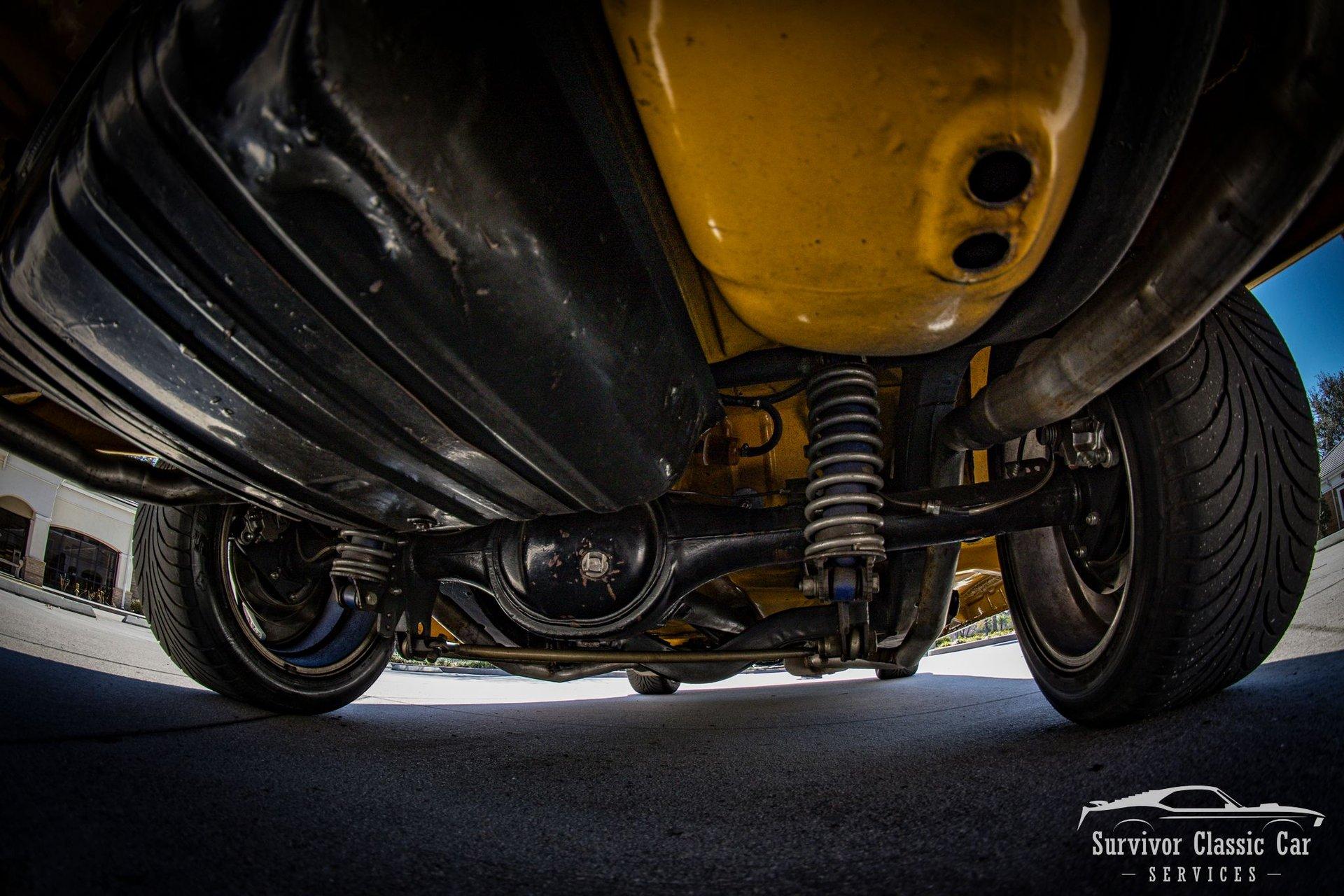 Under the custom louvered hood is a fully dressed-up Billet & Chrome 5.7L 350 V8. Polished Flame-Series Billet Air Cleaner with a Holley 4BBL Carburetor, all sitting on top of a Weiand Team-G Raised Intake Manifold. The polished Ceramic Coated Long-tube Headers add a little more flare along with the Polished Full Aluminum Radiator Support, Radiator & Dual Electric Fans. A Few other Modern Upgrade is the Power Steering, 4-Wheel Powered Disc Brakes & Electric Ignition. The 4-Speed Manual Transmission shifts smooth like butter.