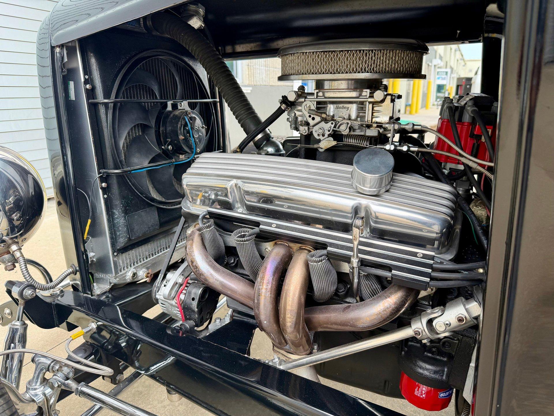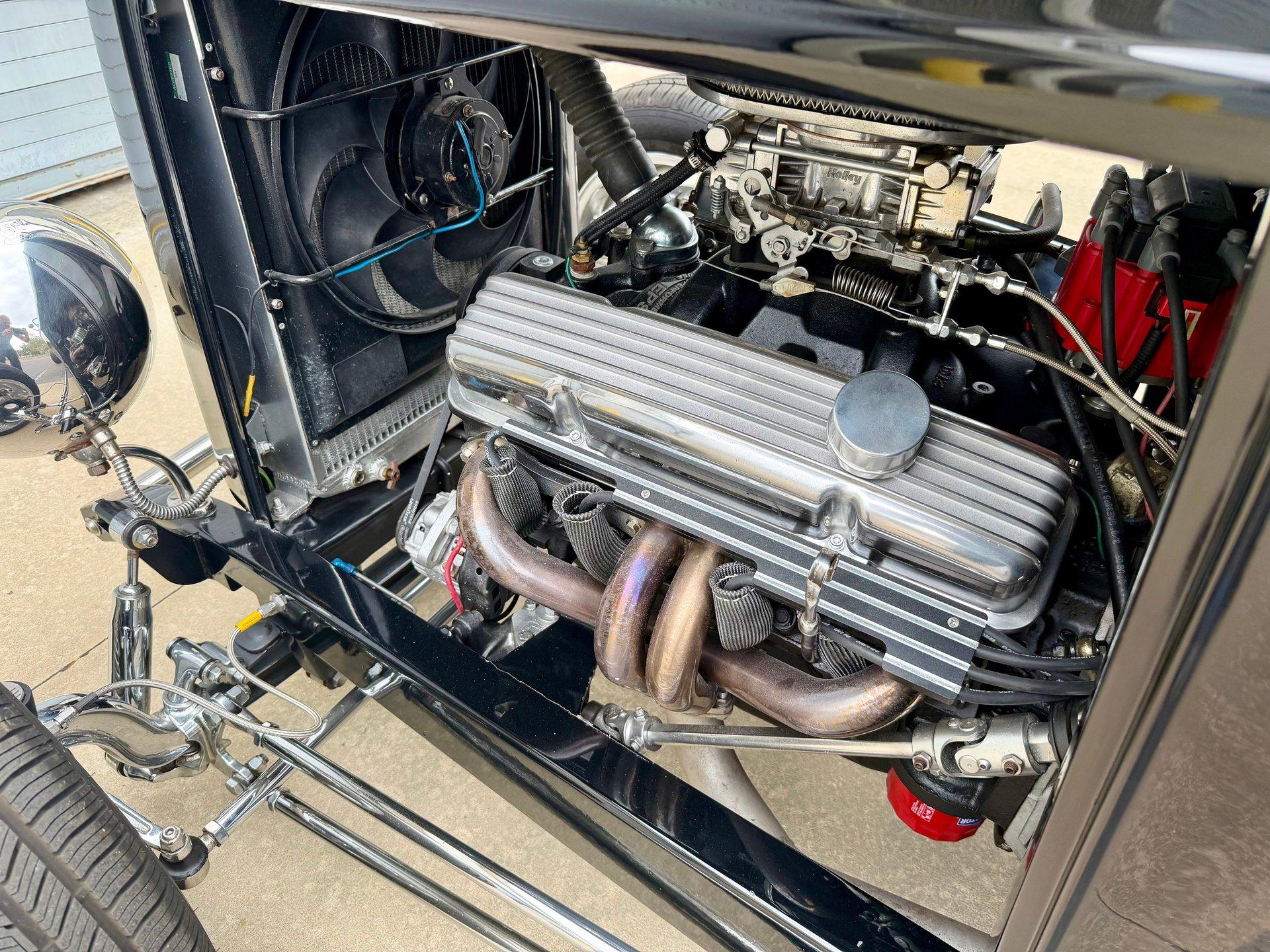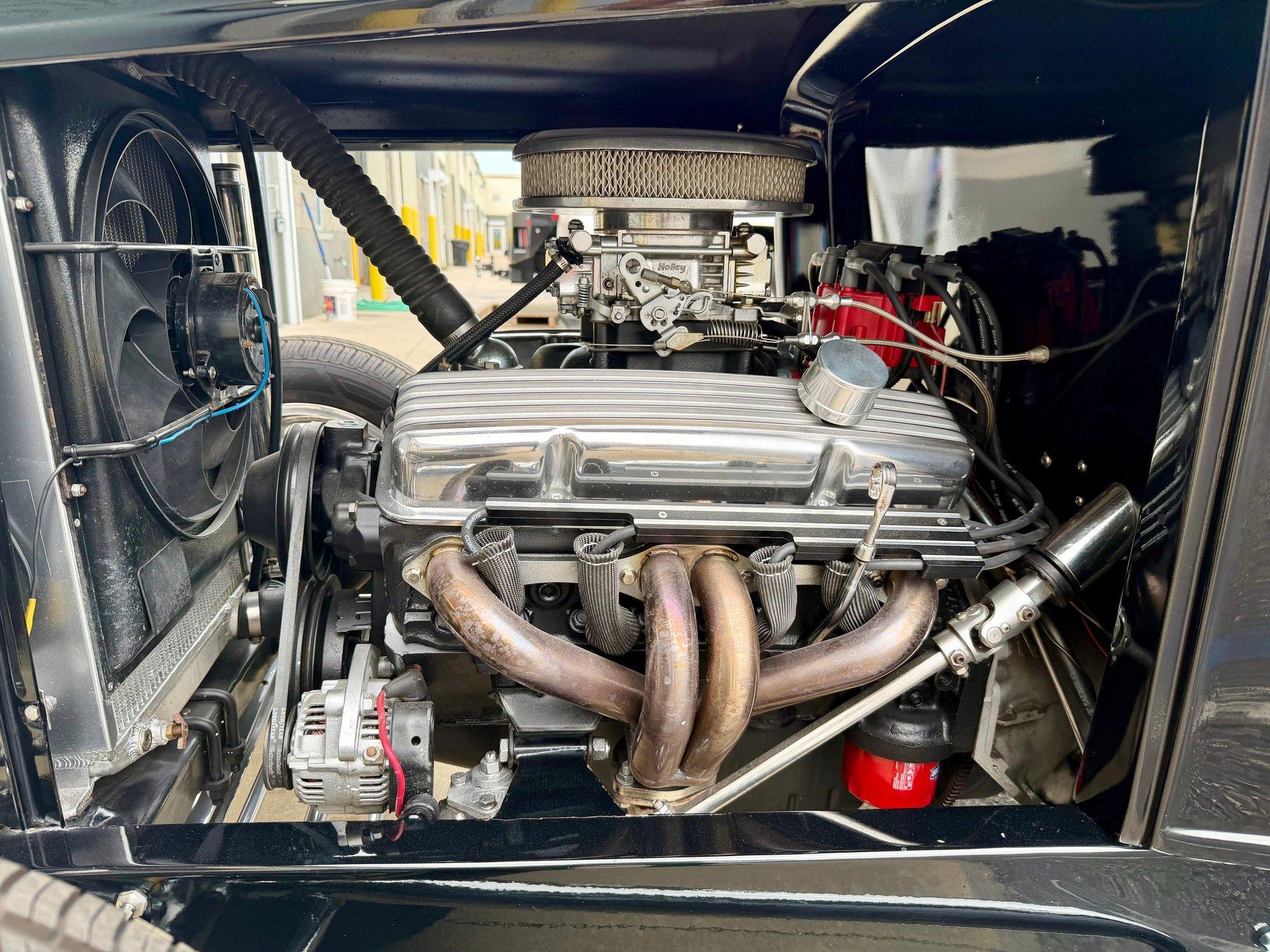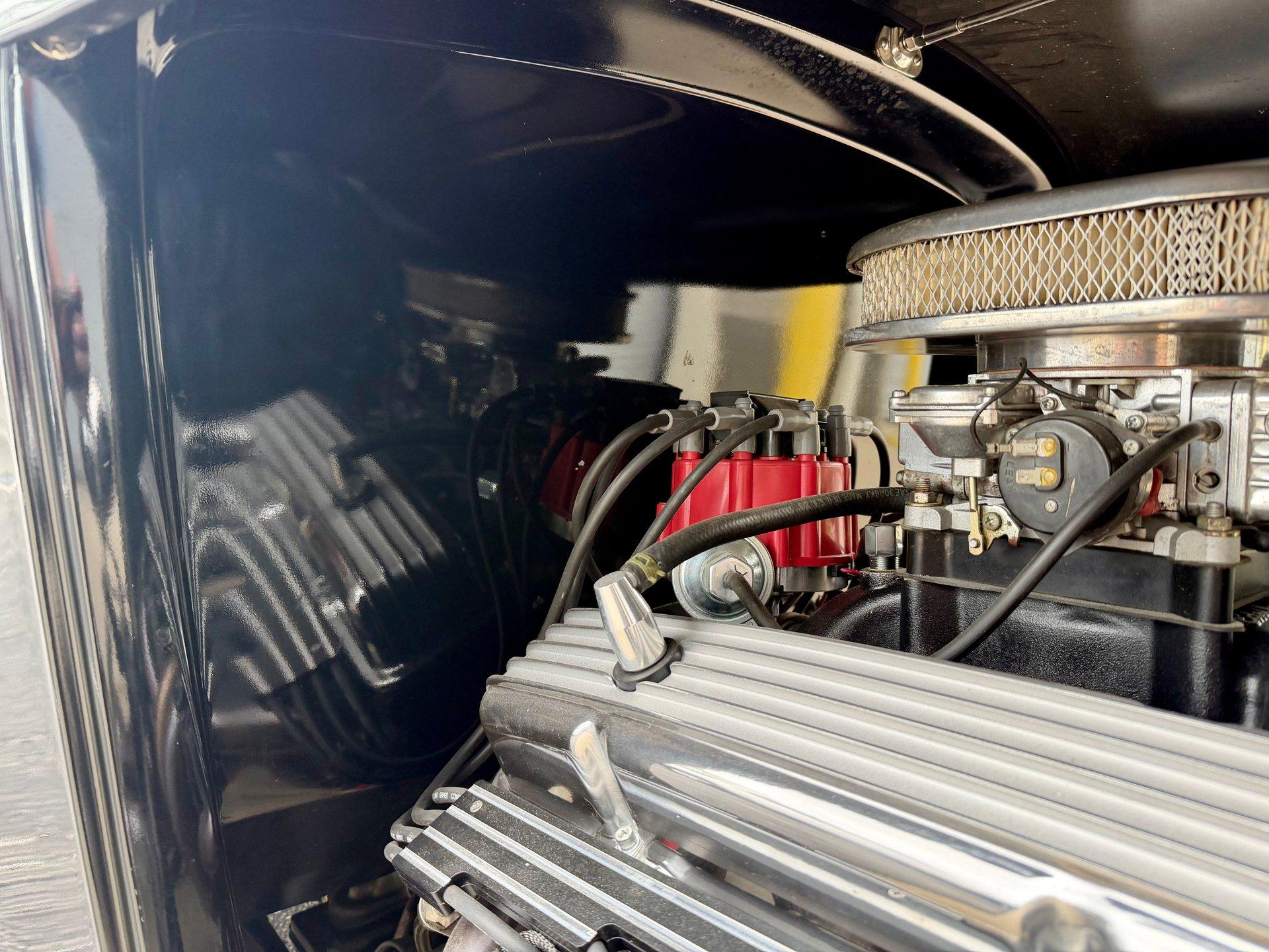 The interior is bright red which brings a nice pop of color against the all black exterior. Stewart Warner gauges sit in a polished bezel in the dash. Tilt steering column, billet pedals, and a classic banjo steering wheel finish off the show quality interior nicely. Under the hood sits a 350 CID V8, that is believed to be stroked to 383 cubic inches, but we do not have documentation on that. It is backed by a smooth shifting 700R4 making this Model A ready to hit the highway and cruise!