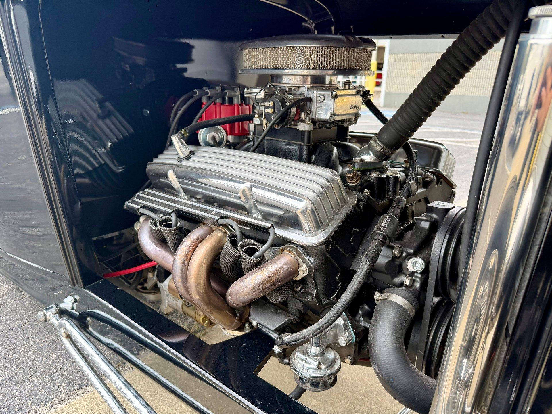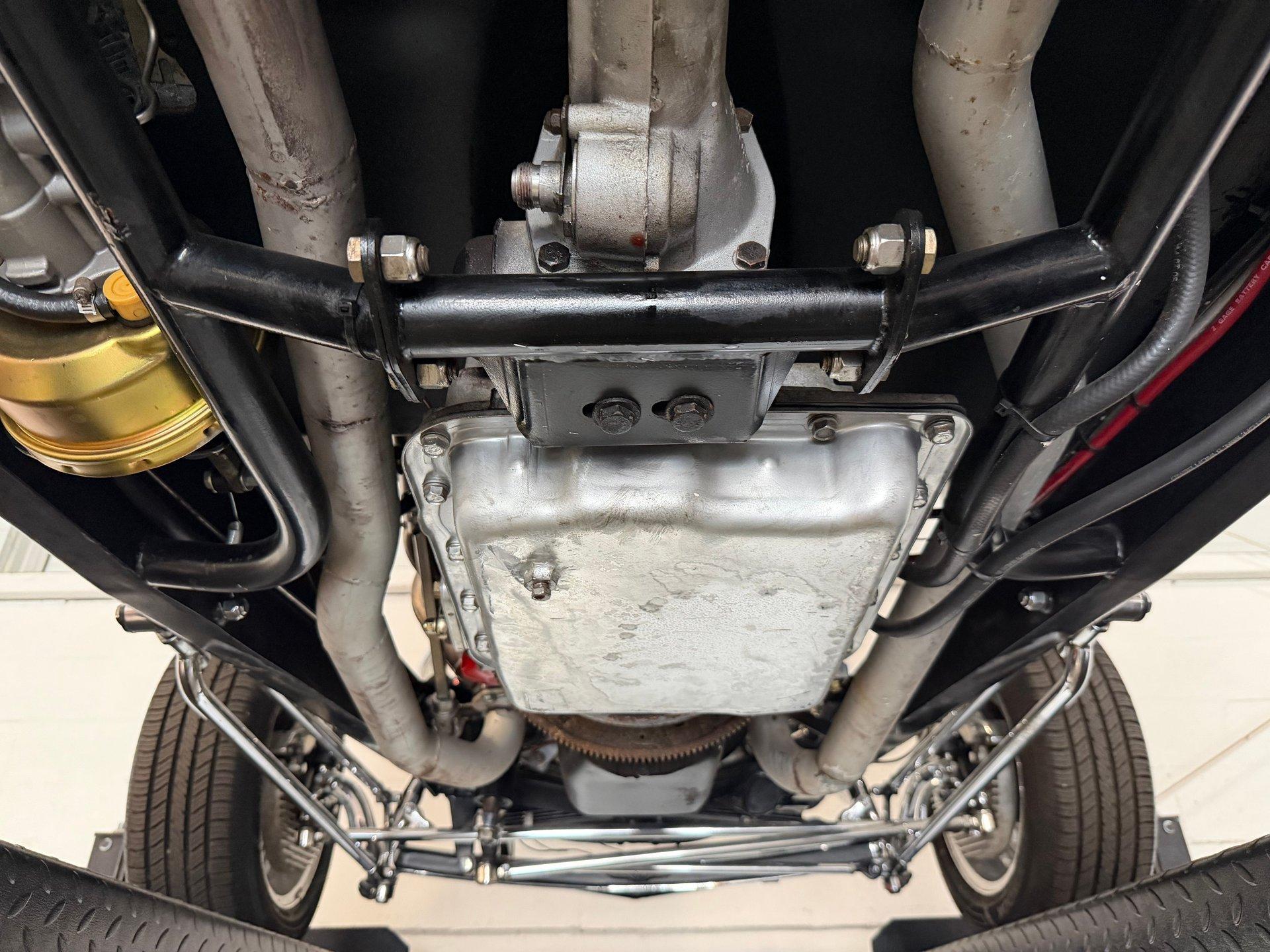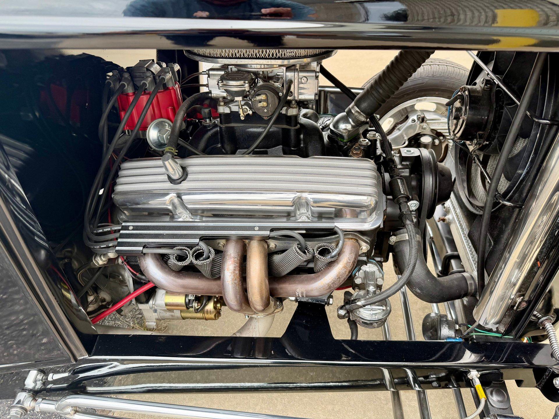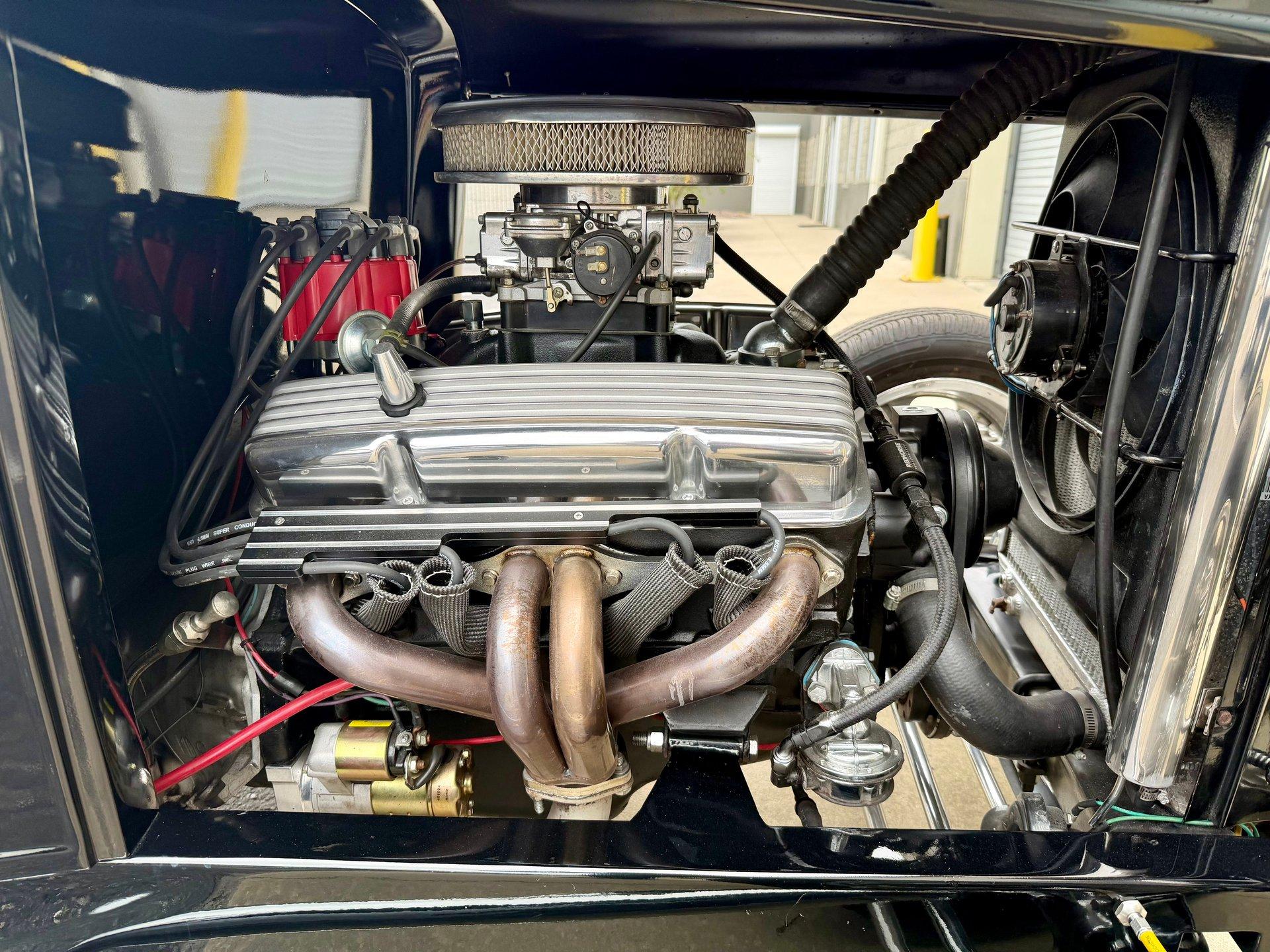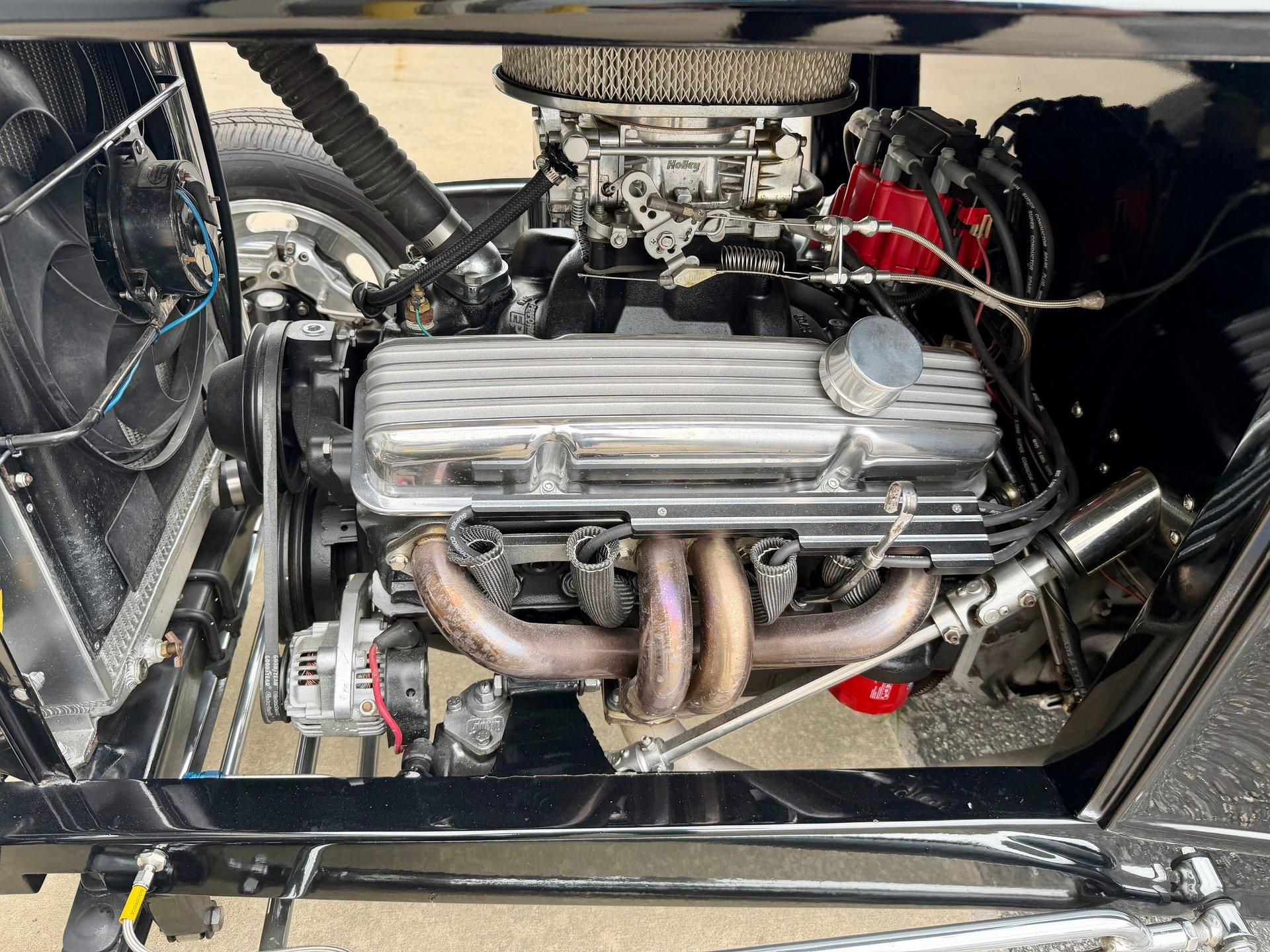 The interior is bright red which brings a nice pop of color against the all black exterior. Stewart Warner gauges sit in a polished bezel in the dash. Tilt steering column, billet pedals, and a classic banjo steering wheel finish off the show quality interior nicely. Under the hood sits a 350 CID V8, that is believed to be stroked to 383 cubic inches, but we do not have documentation on that. It is backed by a smooth shifting 700R4 making this Model A ready to hit the highway and cruise!