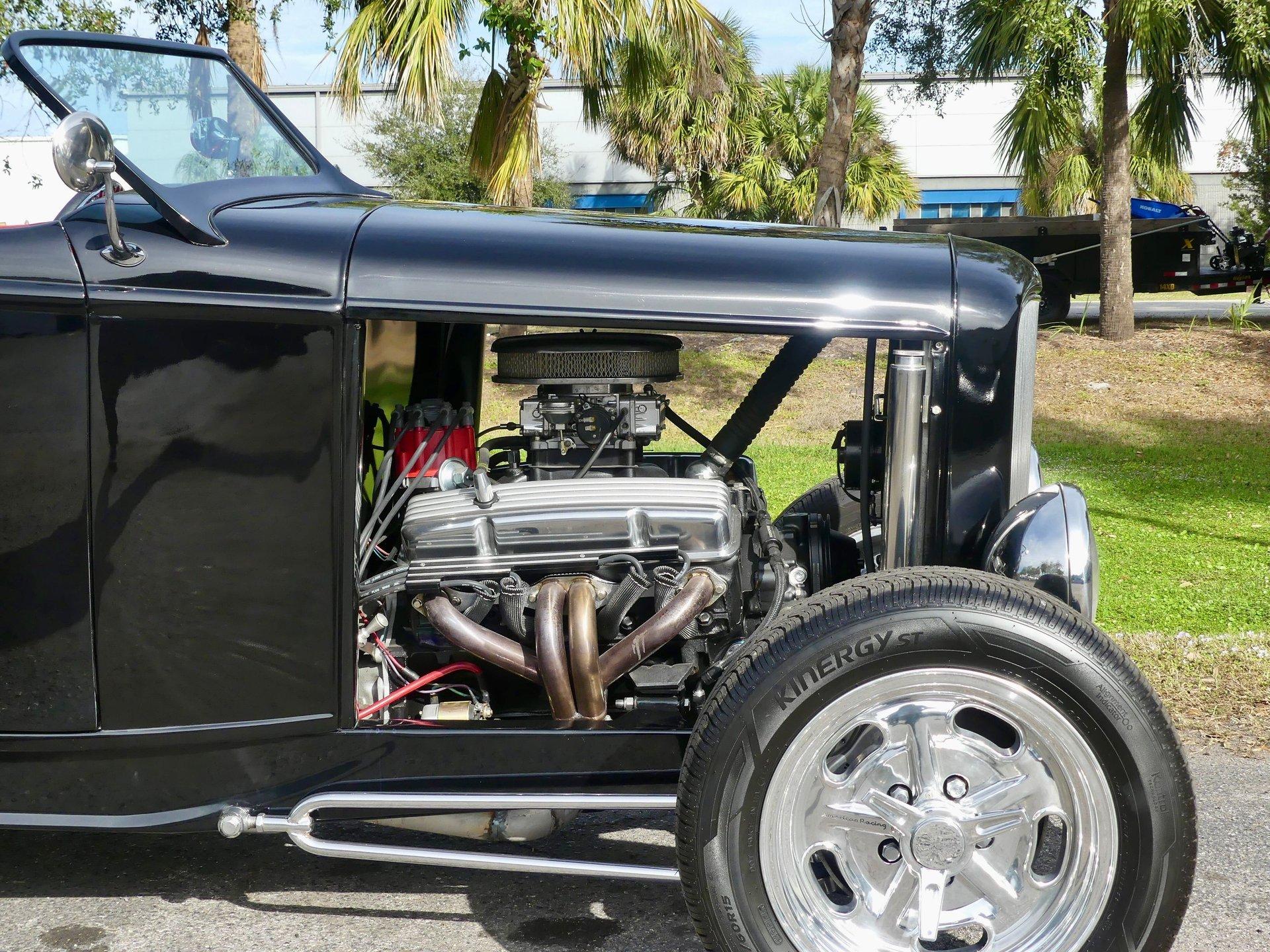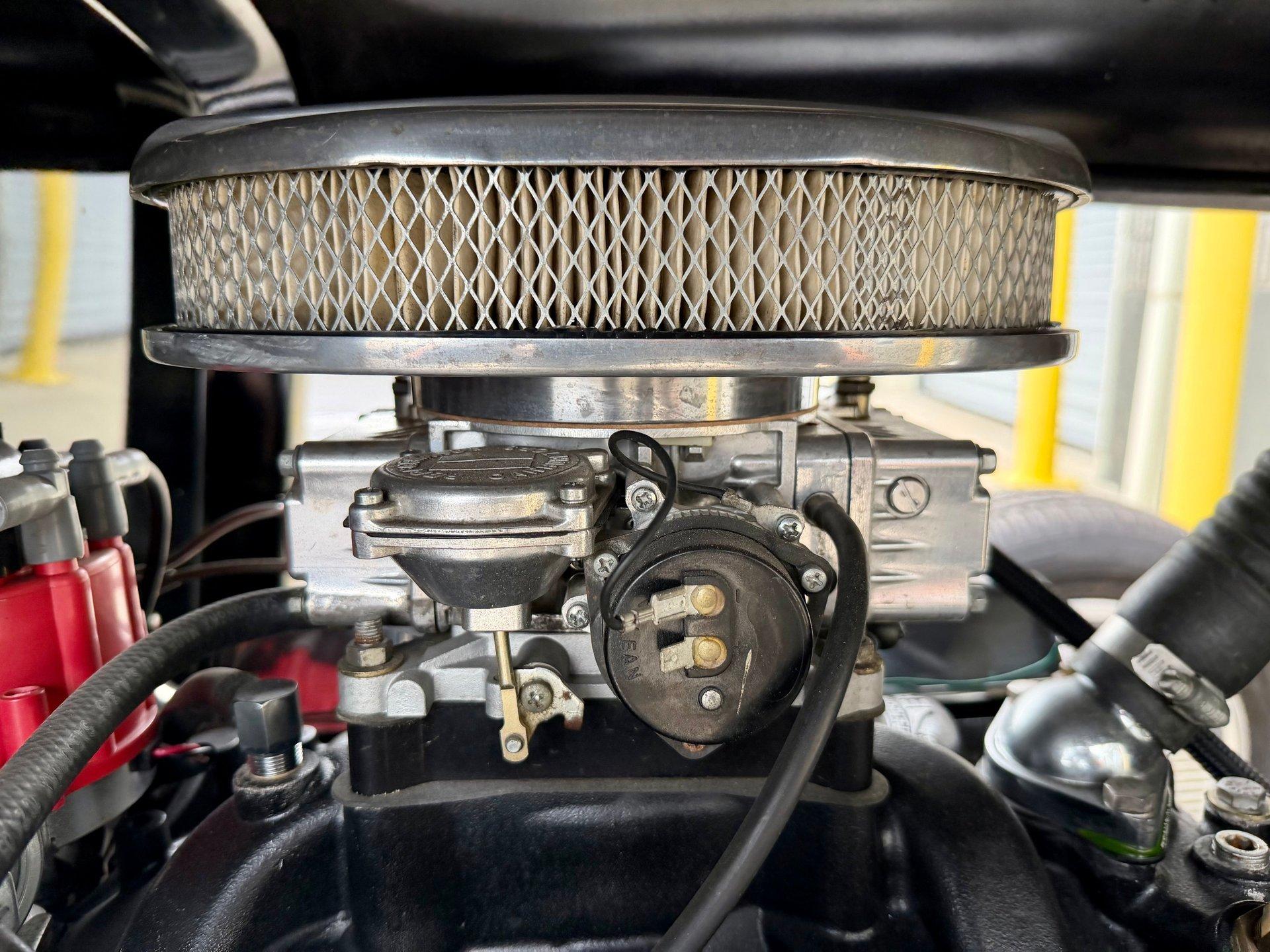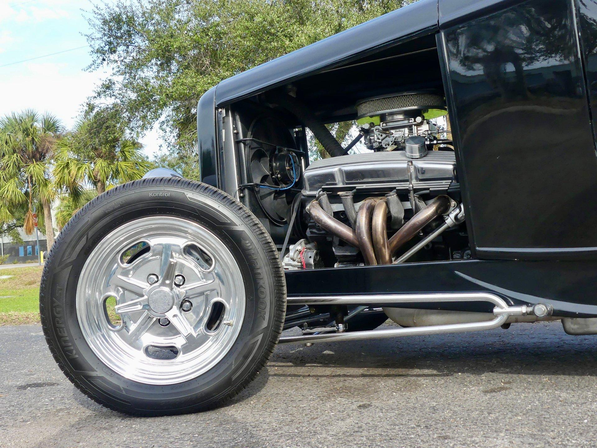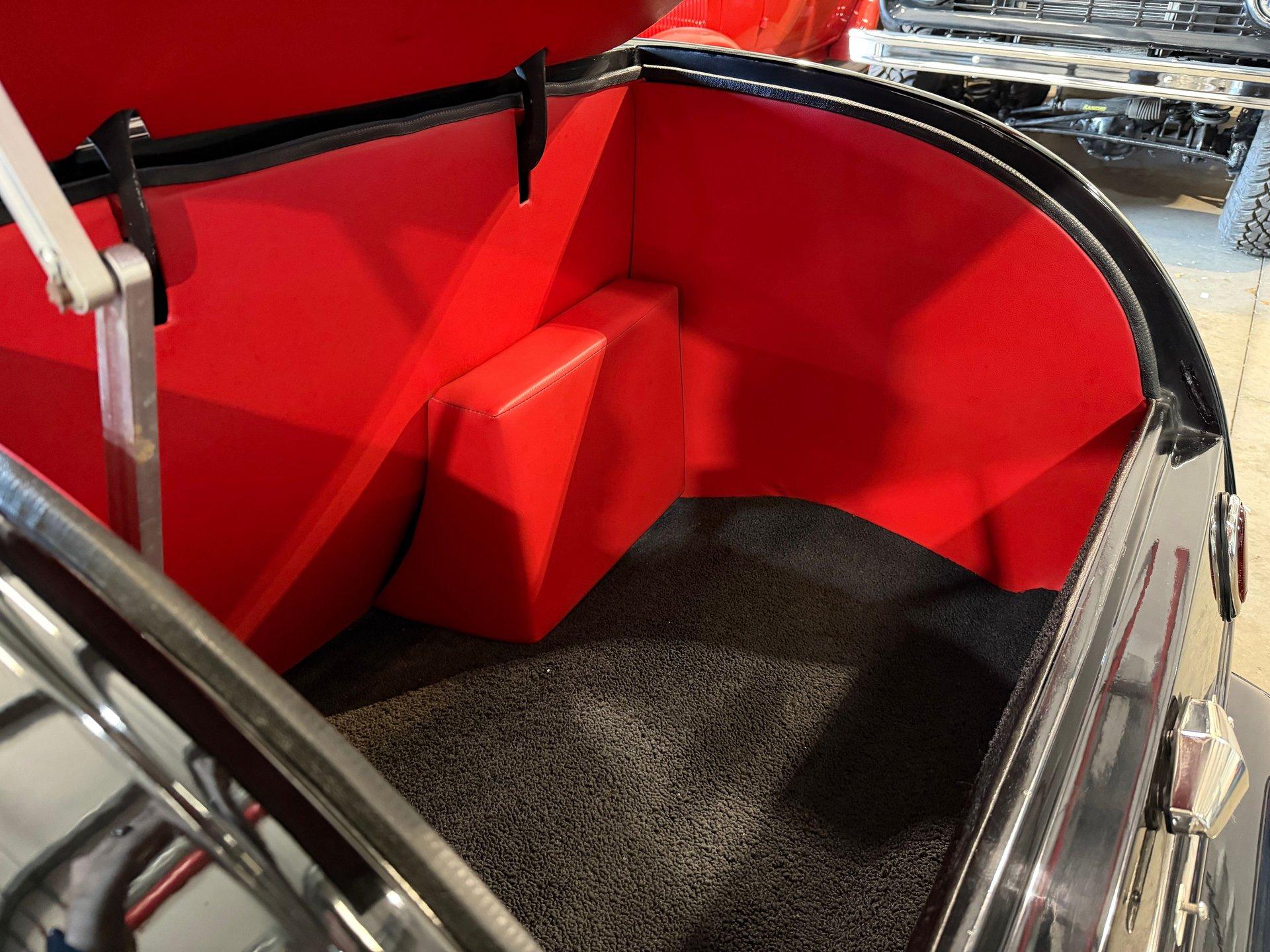 The interior is bright red which brings a nice pop of color against the all black exterior. Stewart Warner gauges sit in a polished bezel in the dash. Tilt steering column, billet pedals, and a classic banjo steering wheel finish off the show quality interior nicely. Under the hood sits a 350 CID V8, that is believed to be stroked to 383 cubic inches, but we do not have documentation on that. It is backed by a smooth shifting 700R4 making this Model A ready to hit the highway and cruise!