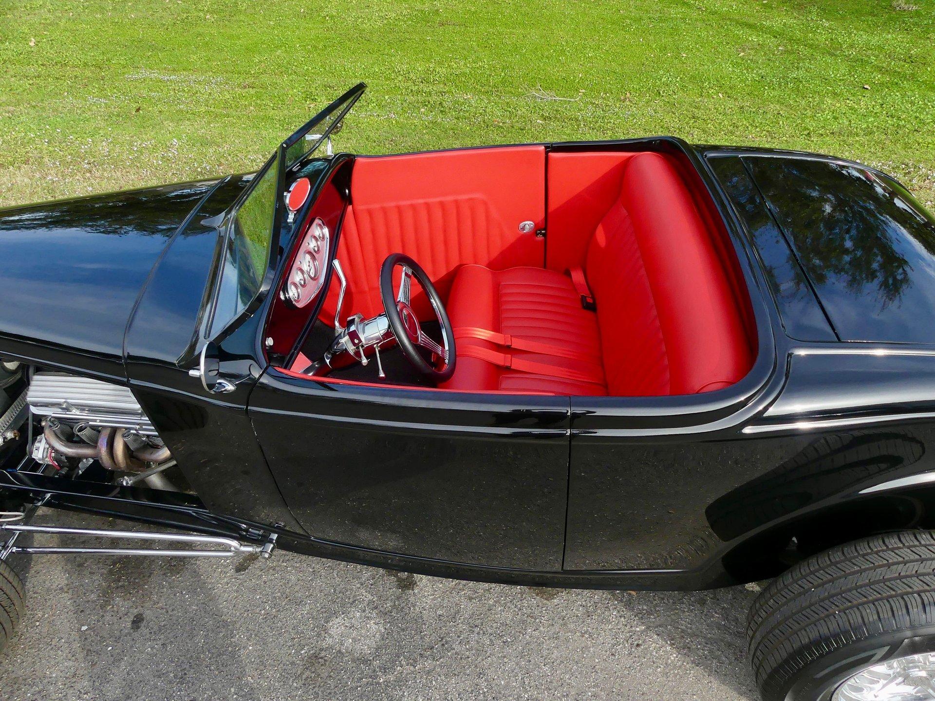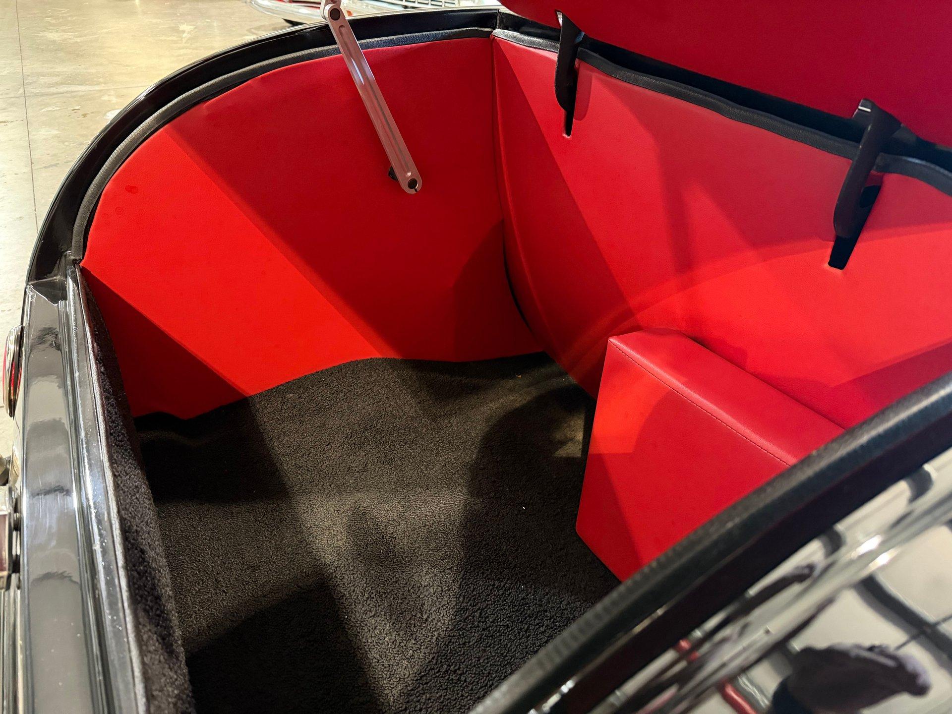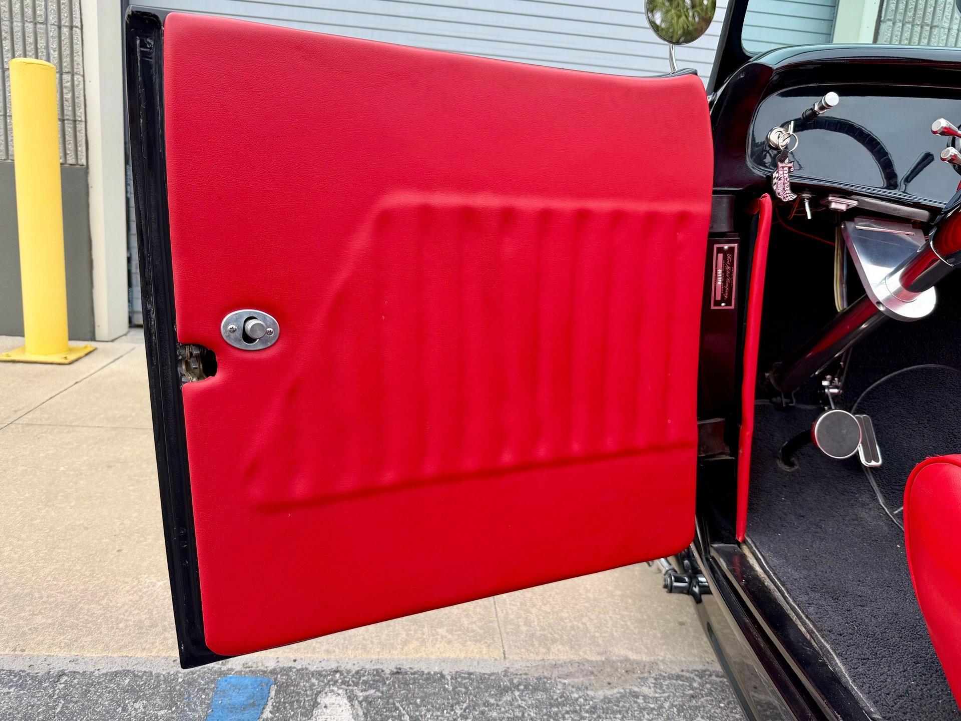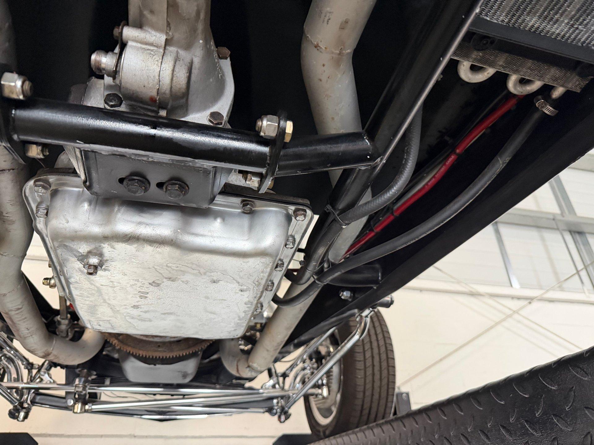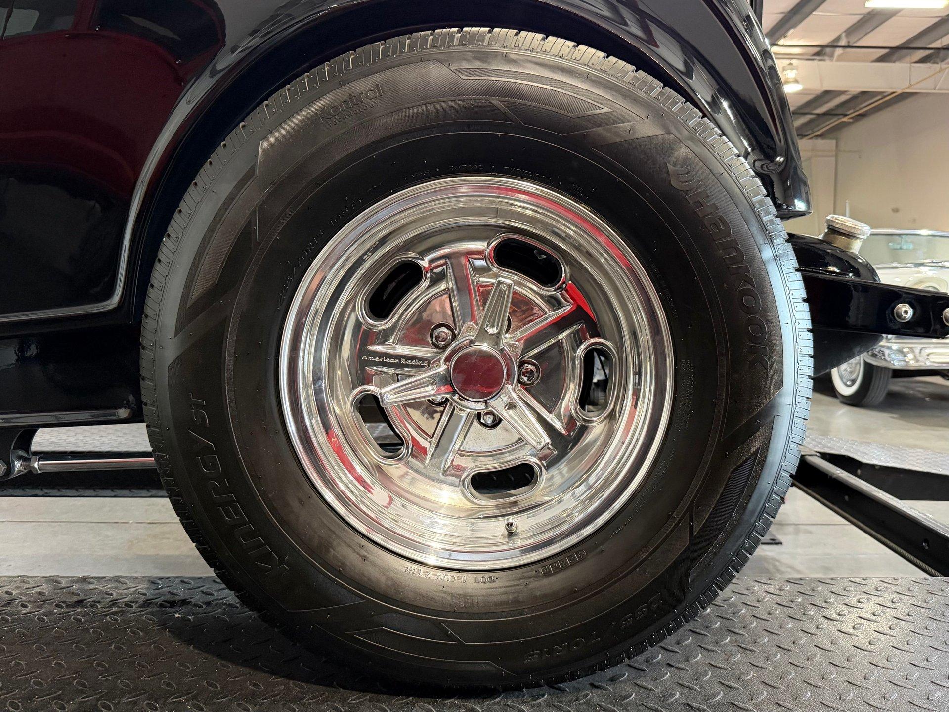 The interior is bright red which brings a nice pop of color against the all black exterior. Stewart Warner gauges sit in a polished bezel in the dash. Tilt steering column, billet pedals, and a classic banjo steering wheel finish off the show quality interior nicely. Under the hood sits a 350 CID V8, that is believed to be stroked to 383 cubic inches, but we do not have documentation on that. It is backed by a smooth shifting 700R4 making this Model A ready to hit the highway and cruise!