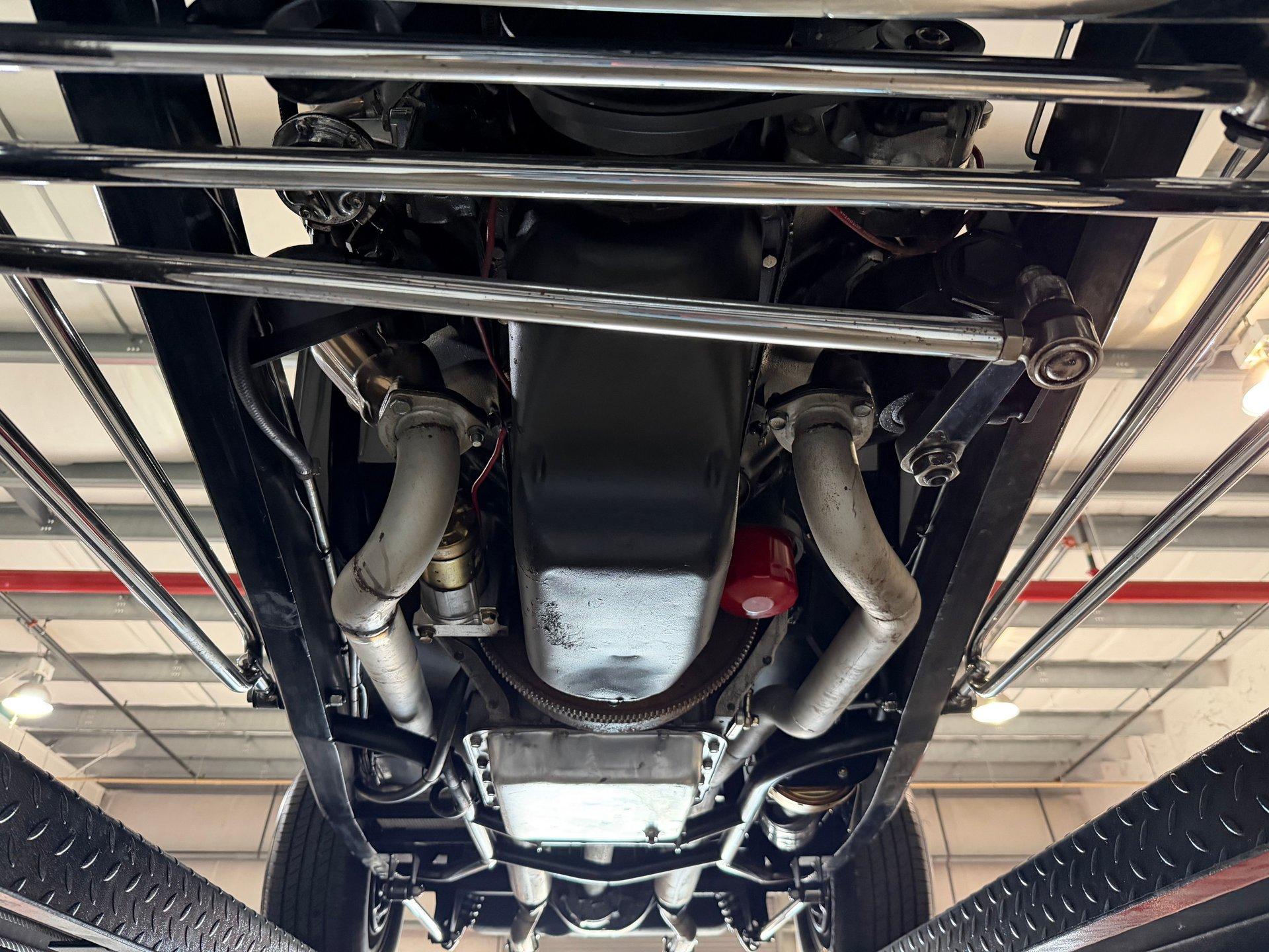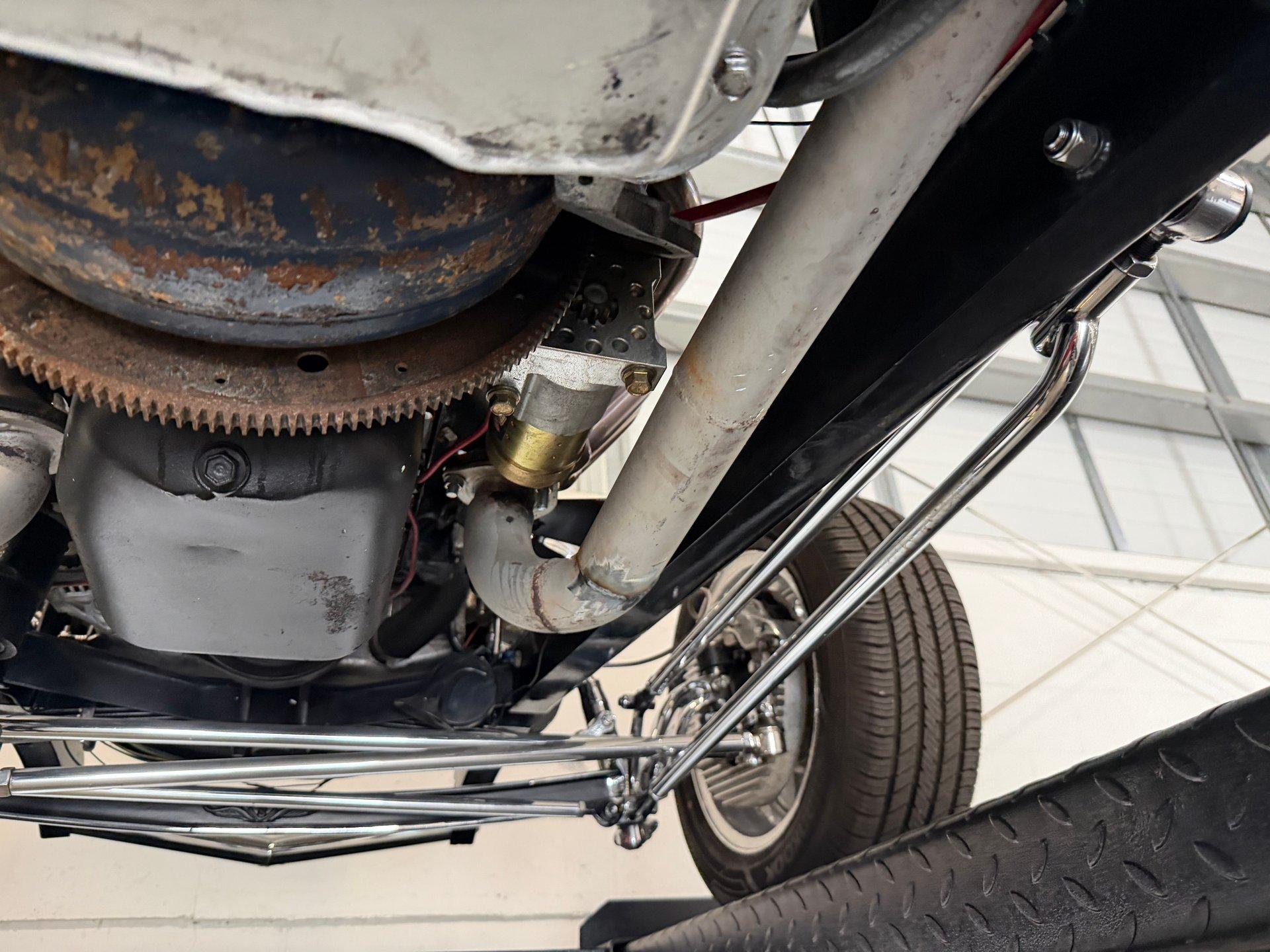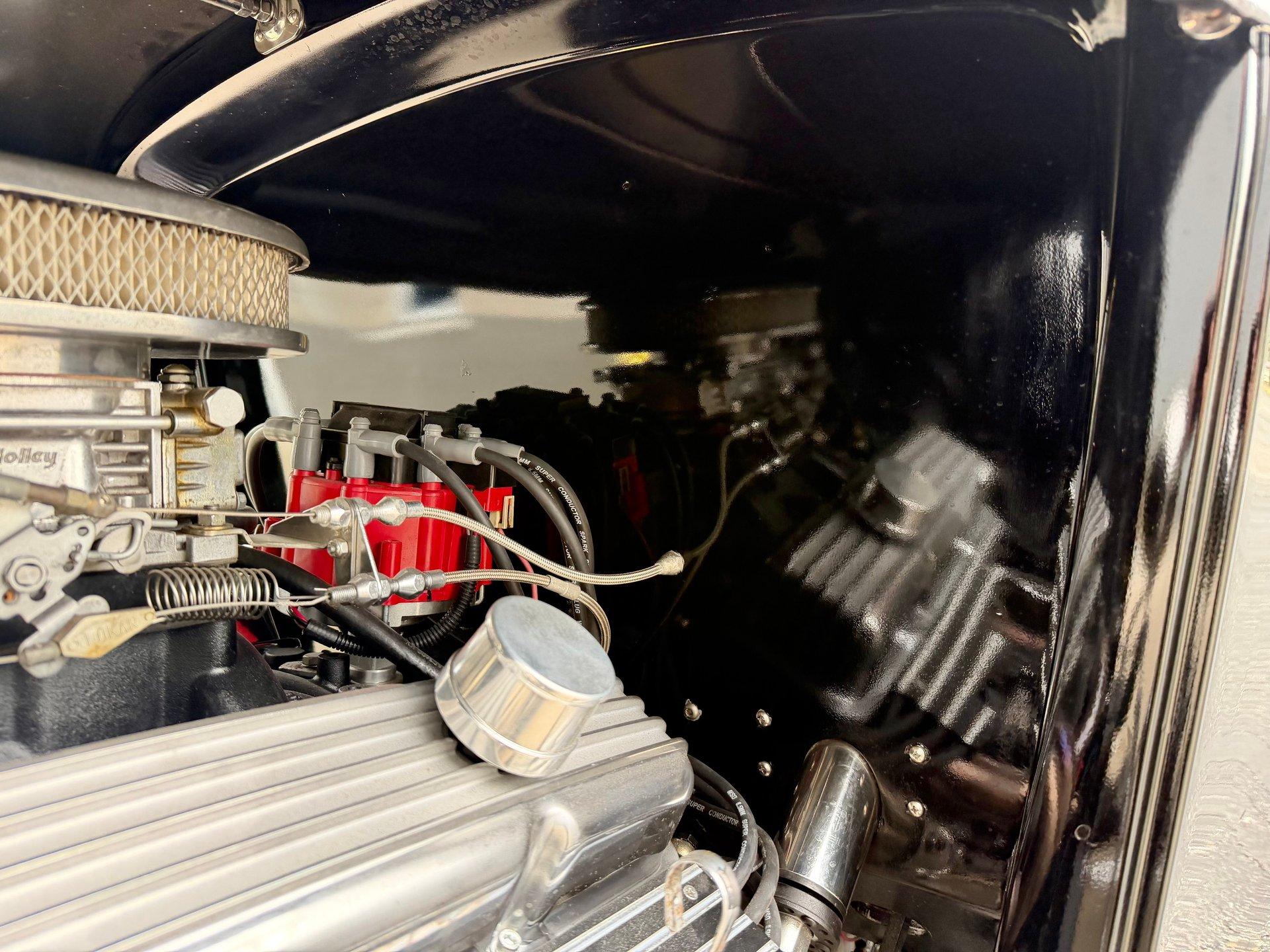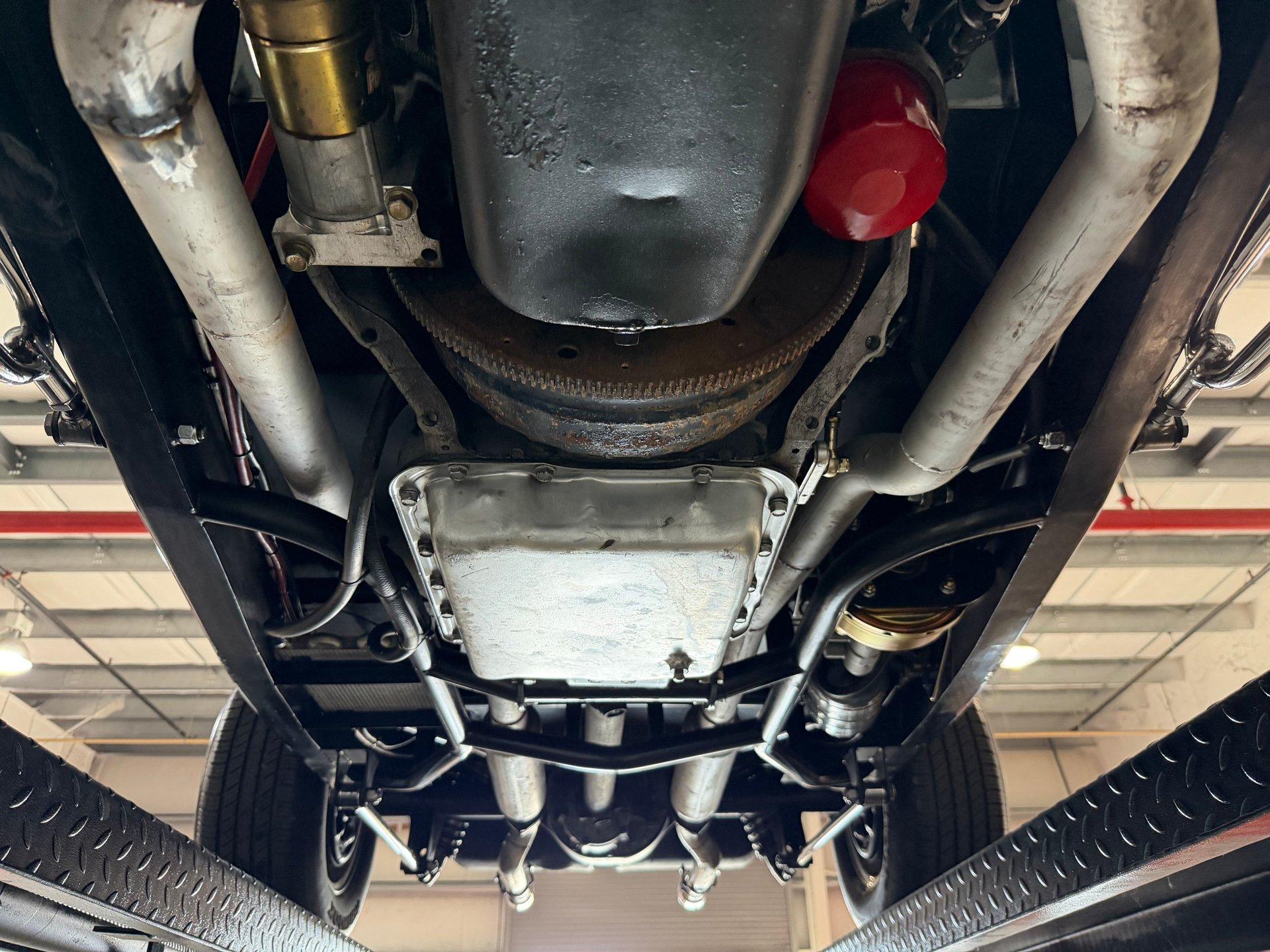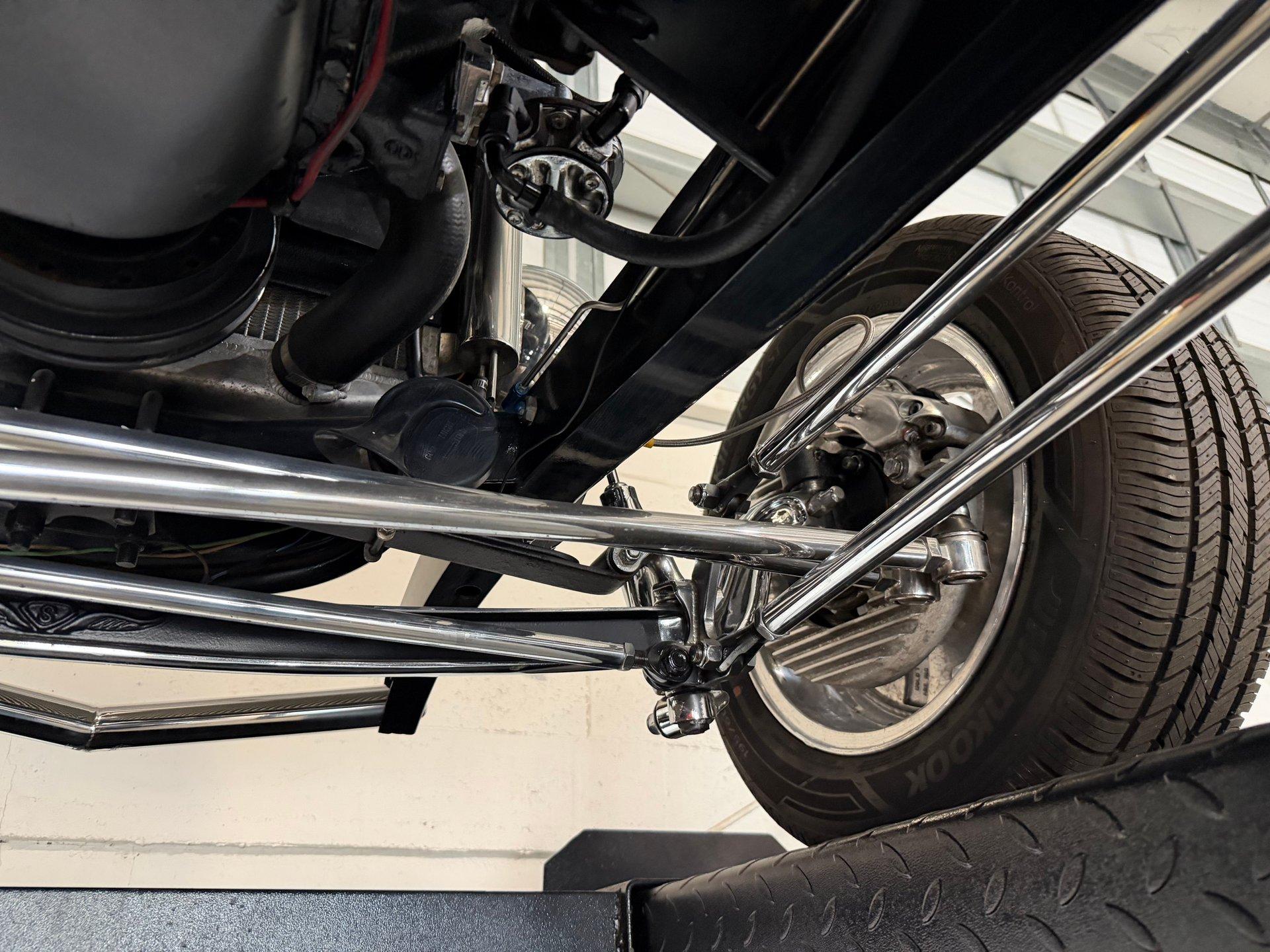 The engine is built with a Holley 4-barrel carburetor, Be Cool aluminum radiator with electric fan, MSD plug wires, Accel plugs, HEI distributor, mild cam, and headers. The front end is an inverted leaf with shocks and is all chrome for a show quality look and nice ride quality. Disc brakes on the front and adjustable coil over shocks on the rear also help give this street rod a nice ride. The brake lines are all stainless, which gives a nice finished look, and provide great performance versus soft lines that can swell and collapse.