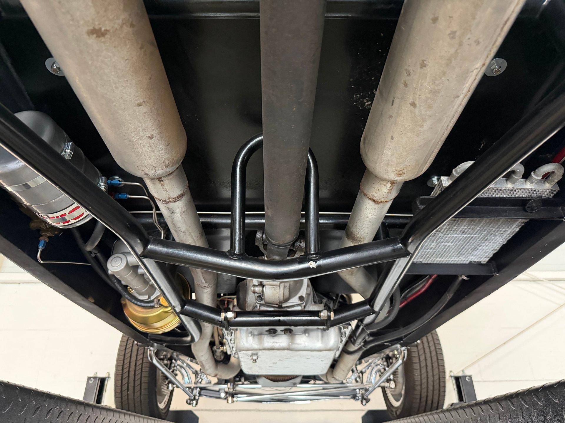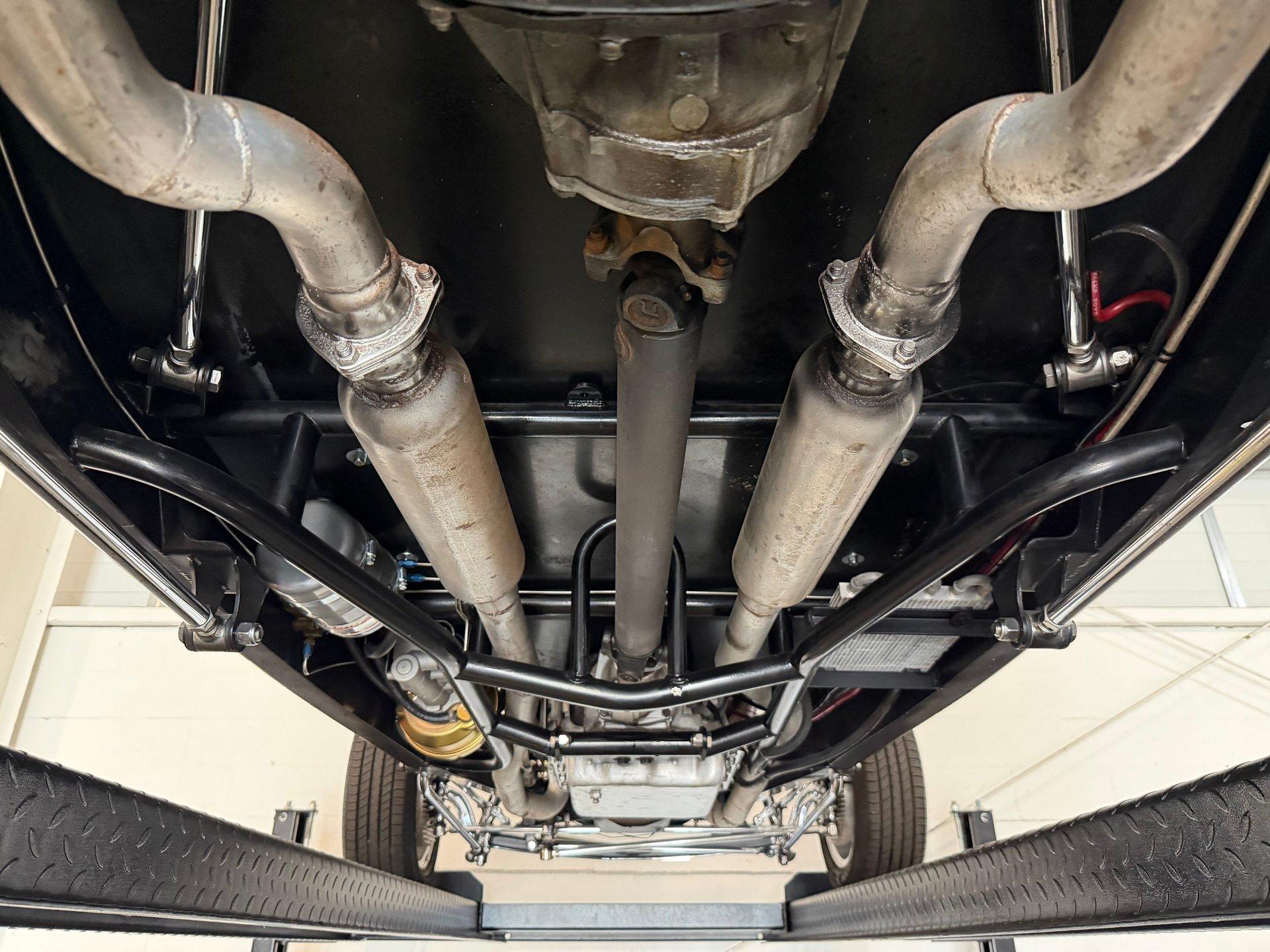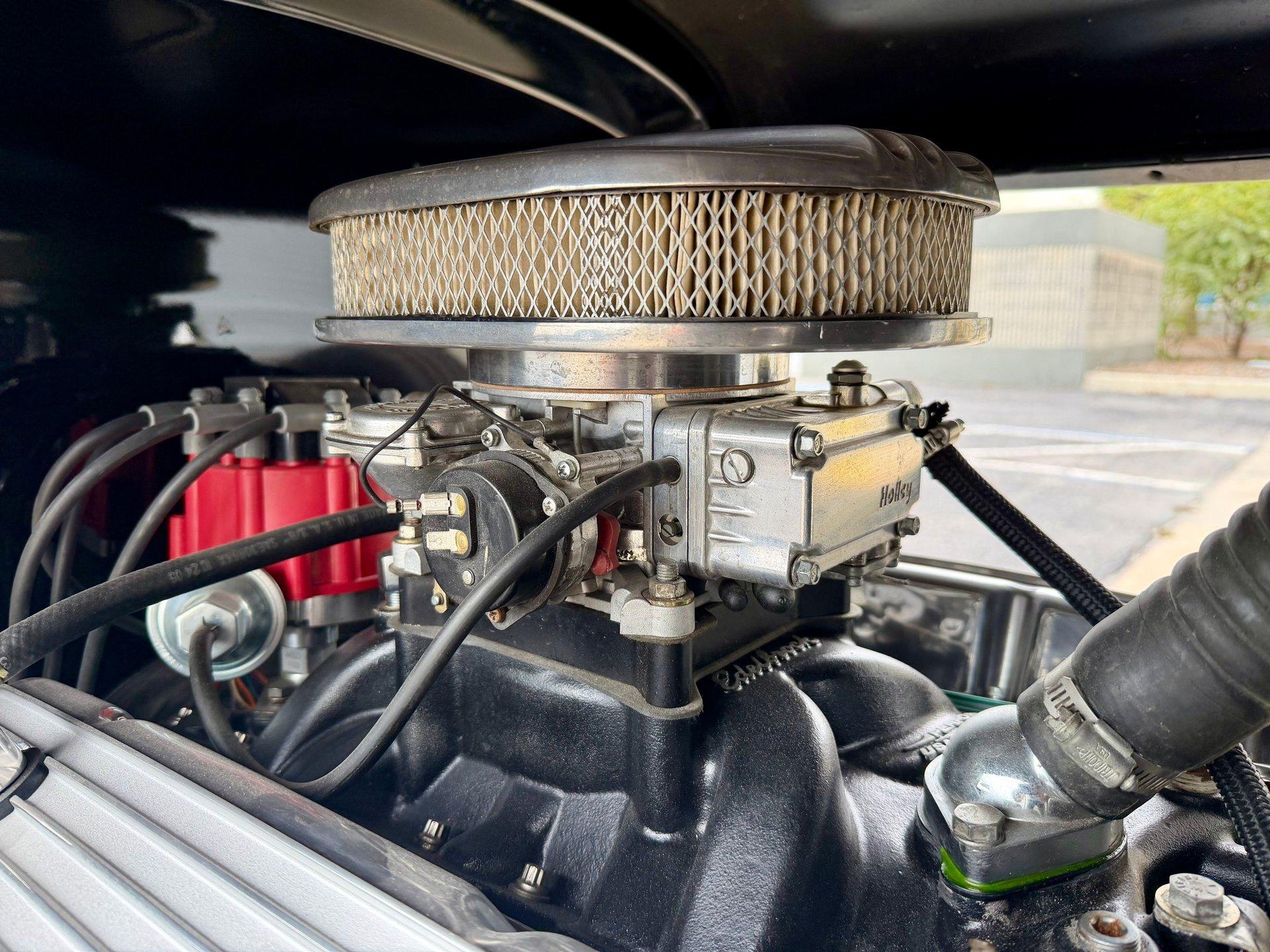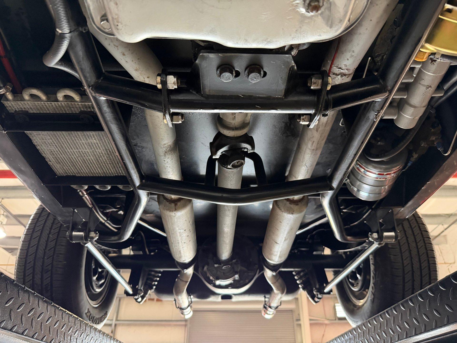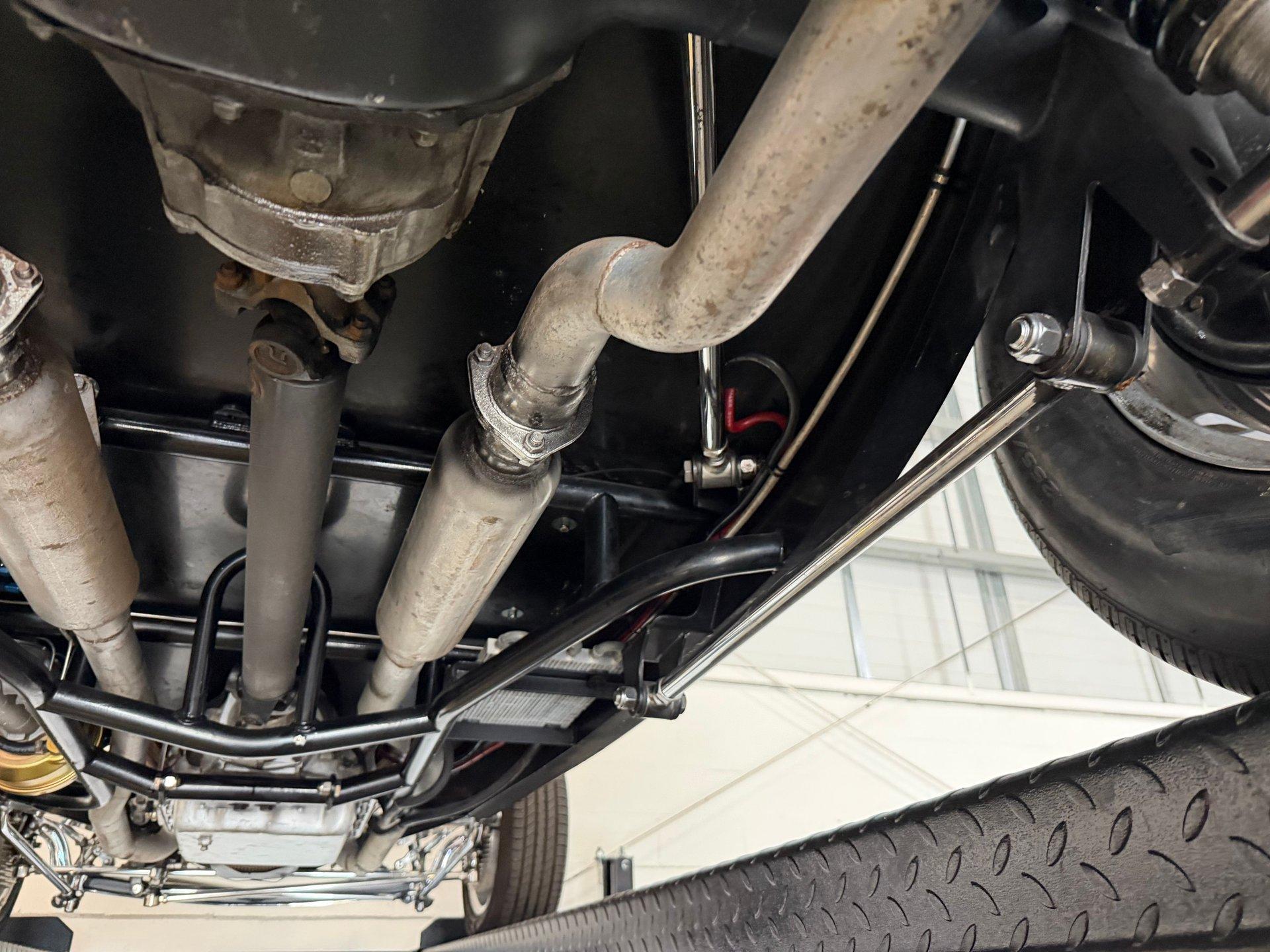 The engine is built with a Holley 4-barrel carburetor, Be Cool aluminum radiator with electric fan, MSD plug wires, Accel plugs, HEI distributor, mild cam, and headers. The front end is an inverted leaf with shocks and is all chrome for a show quality look and nice ride quality. Disc brakes on the front and adjustable coil over shocks on the rear also help give this street rod a nice ride. The brake lines are all stainless, which gives a nice finished look, and provide great performance versus soft lines that can swell and collapse.