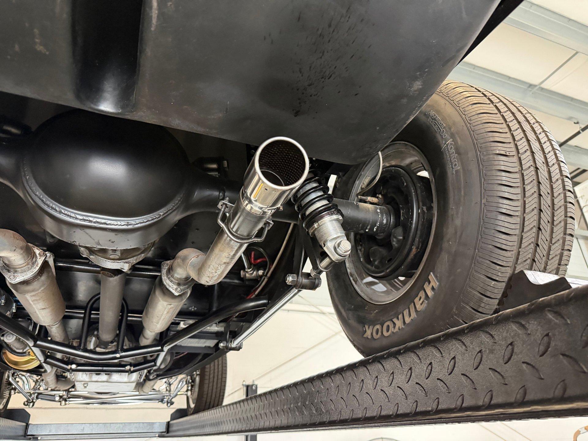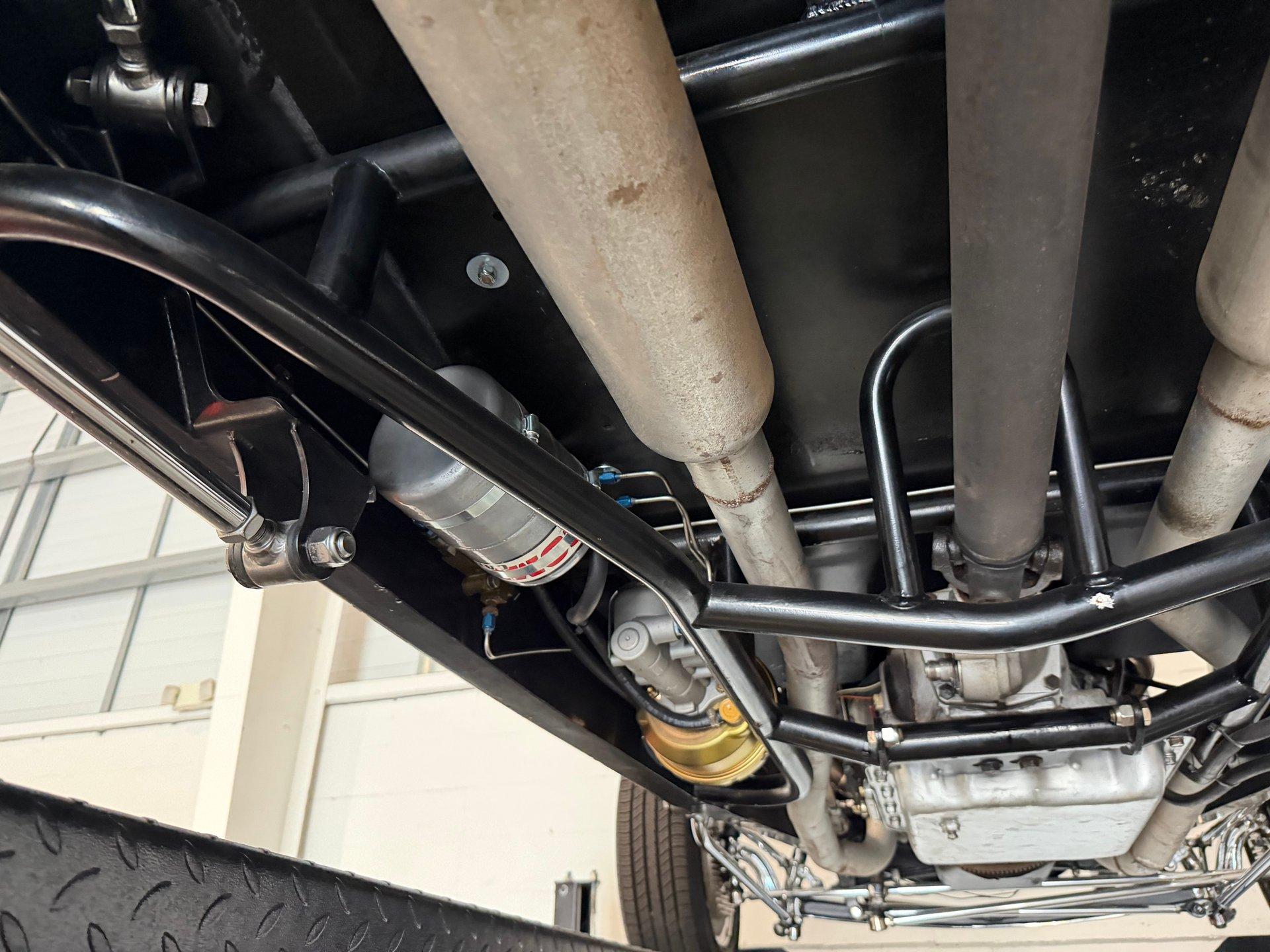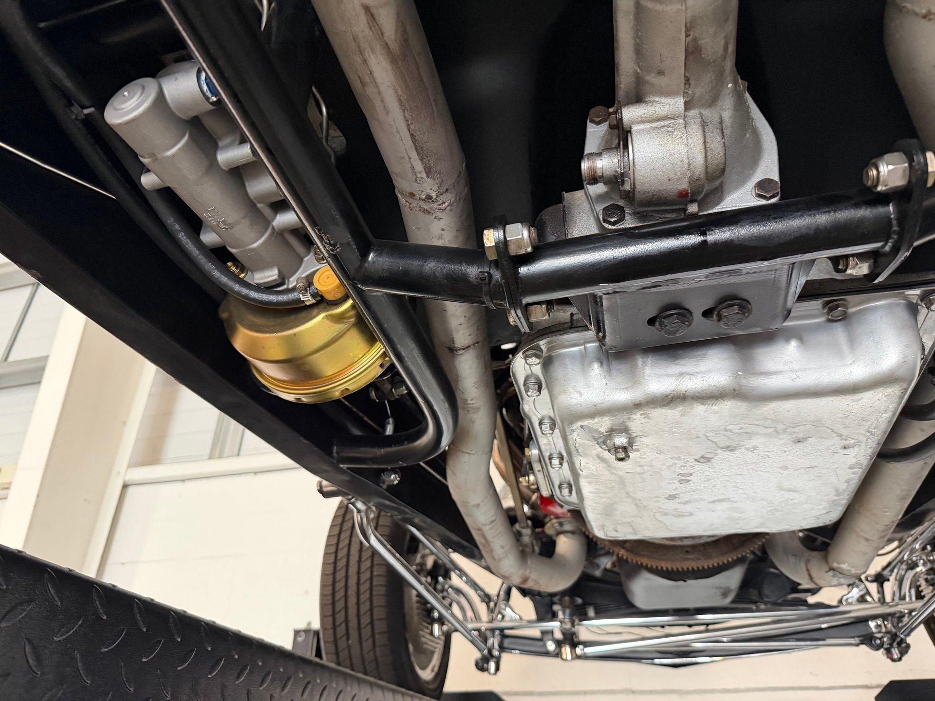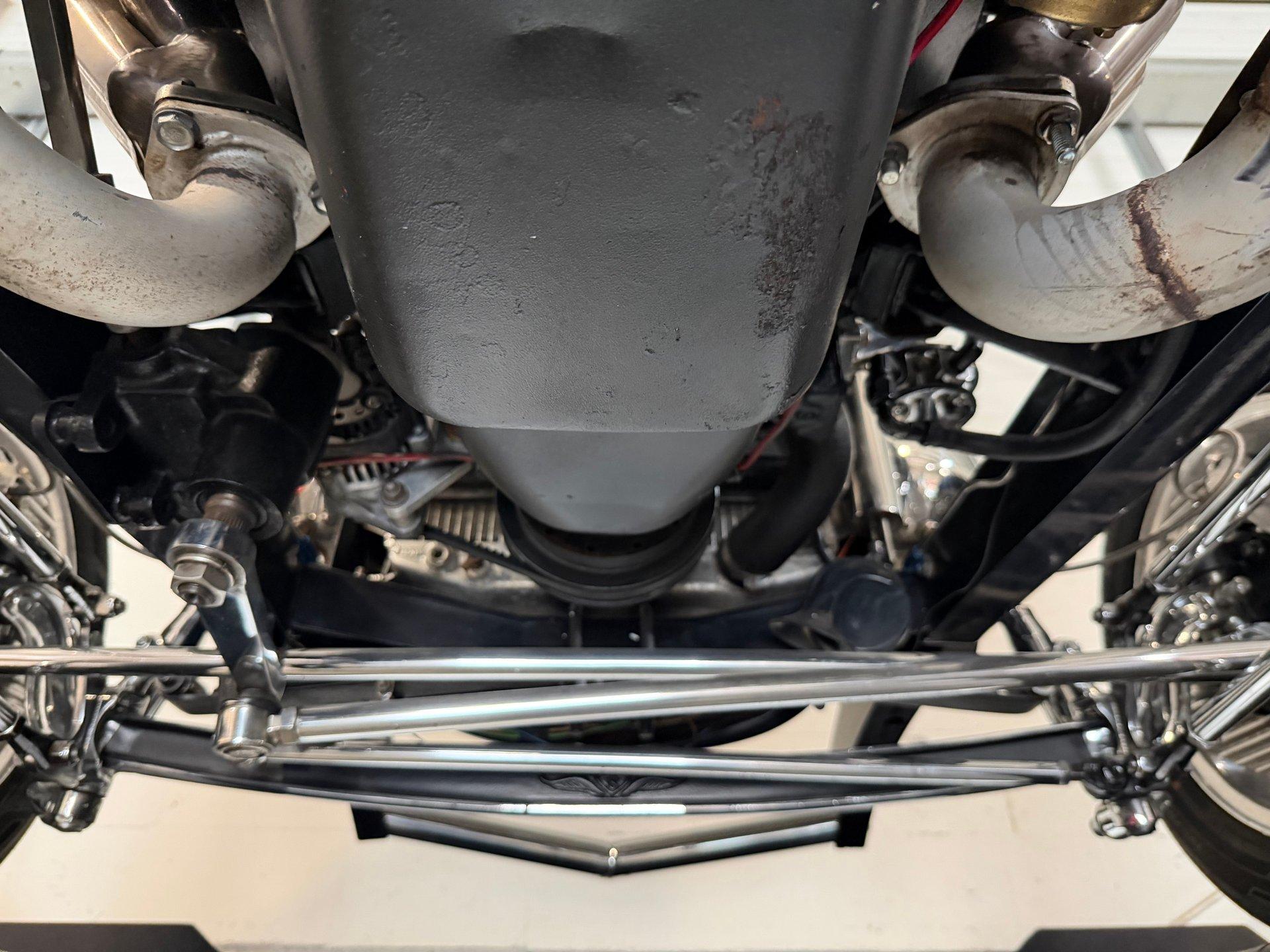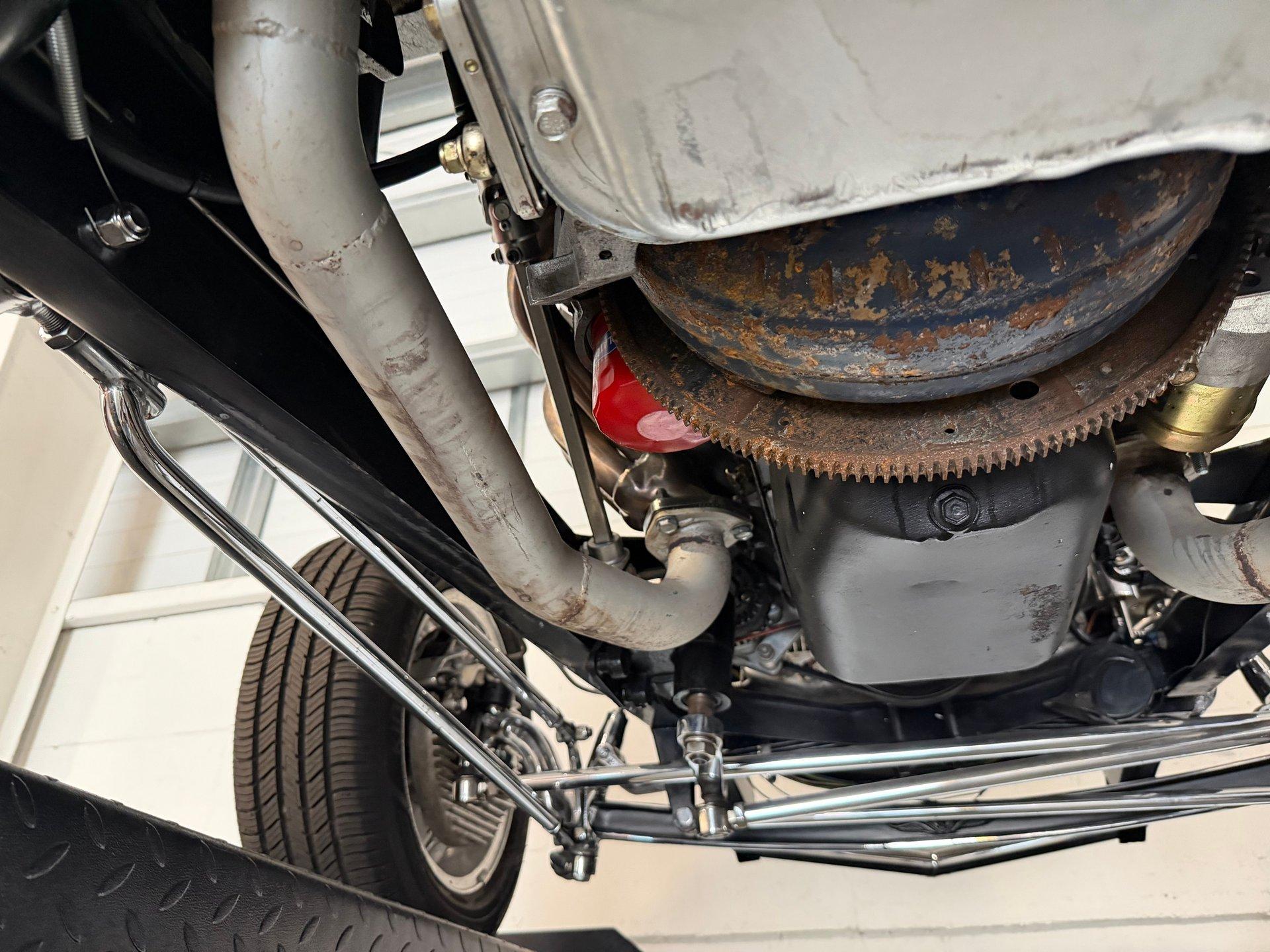 The engine is built with a Holley 4-barrel carburetor, Be Cool aluminum radiator with electric fan, MSD plug wires, Accel plugs, HEI distributor, mild cam, and headers. The front end is an inverted leaf with shocks and is all chrome for a show quality look and nice ride quality. Disc brakes on the front and adjustable coil over shocks on the rear also help give this street rod a nice ride. The brake lines are all stainless, which gives a nice finished look, and provide great performance versus soft lines that can swell and collapse.