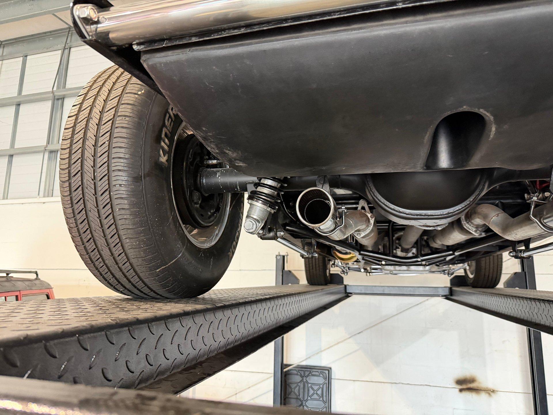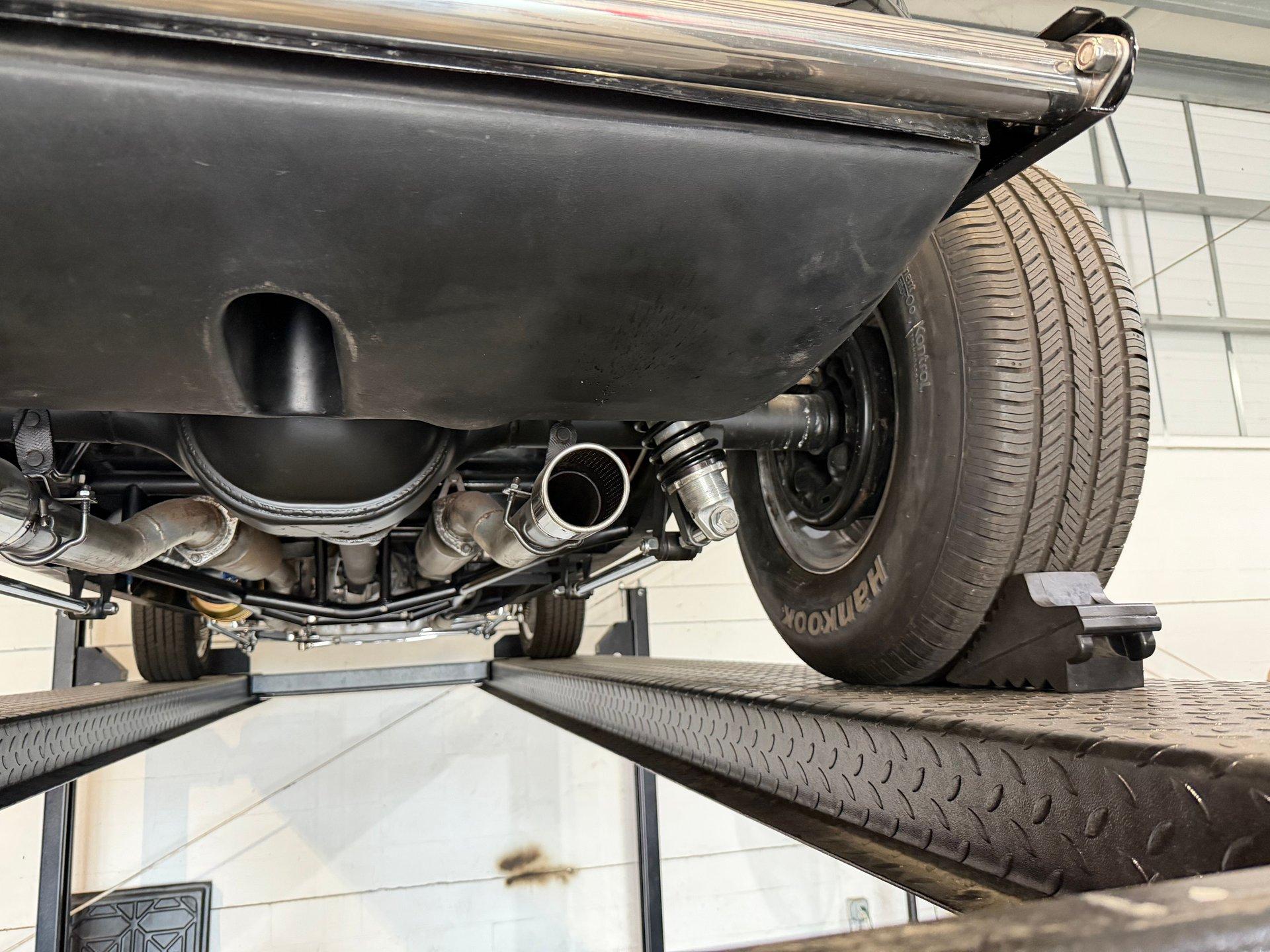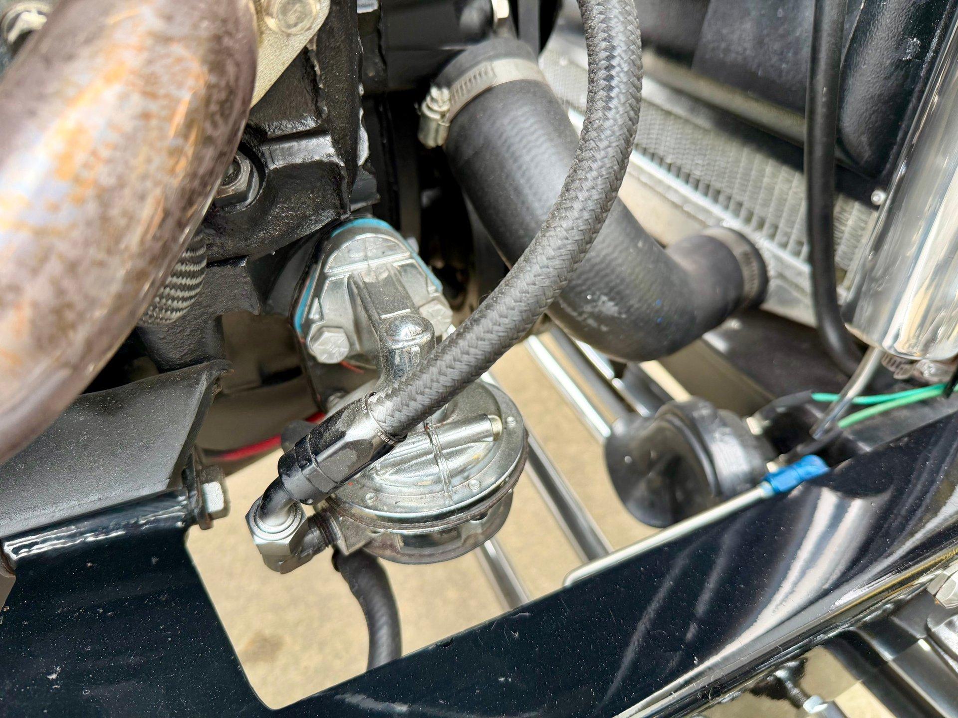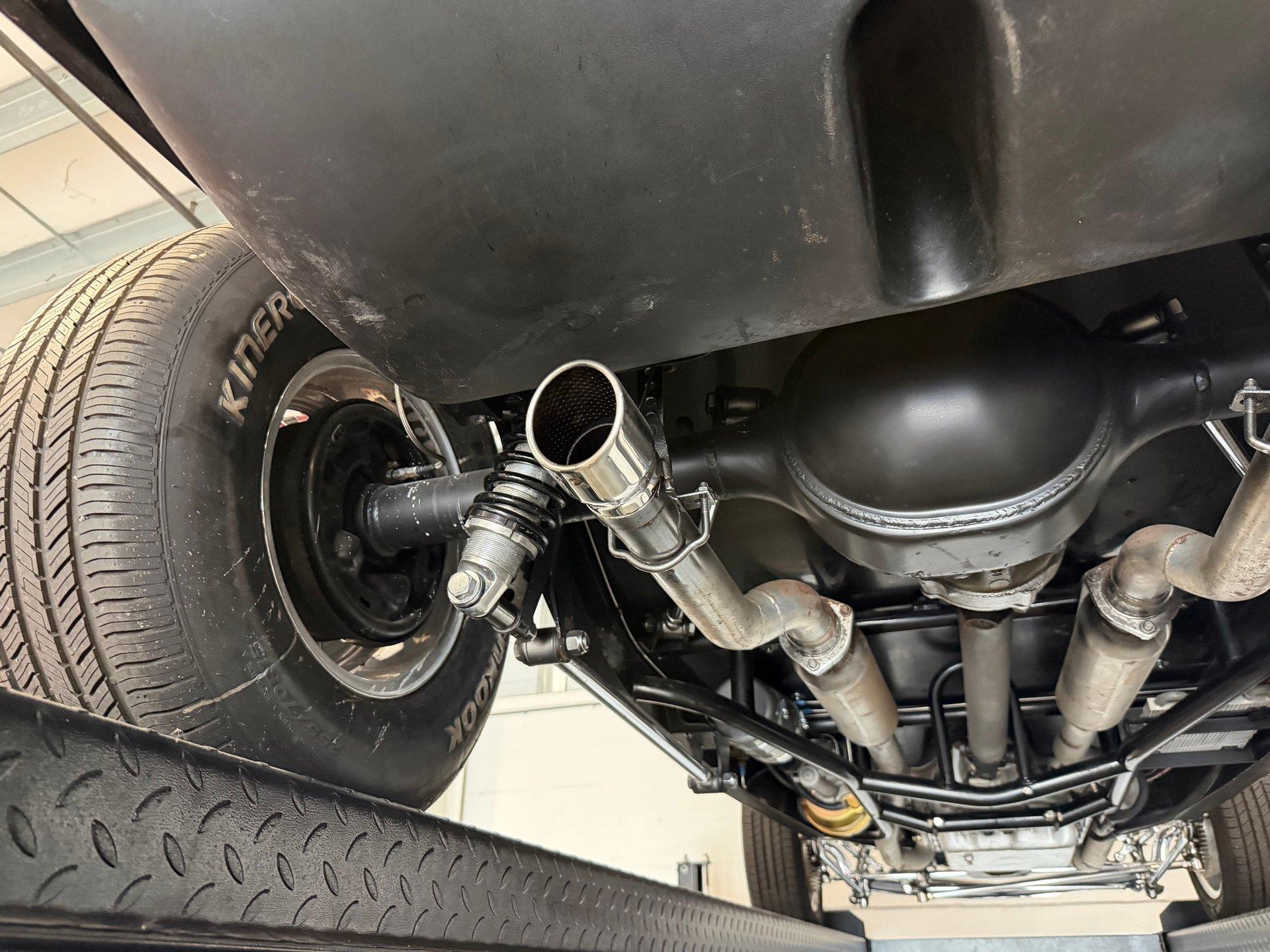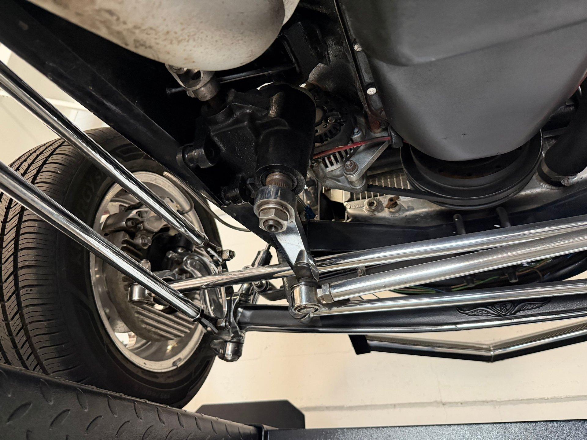 The engine is built with a Holley 4-barrel carburetor, Be Cool aluminum radiator with electric fan, MSD plug wires, Accel plugs, HEI distributor, mild cam, and headers. The front end is an inverted leaf with shocks and is all chrome for a show quality look and nice ride quality. Disc brakes on the front and adjustable coil over shocks on the rear also help give this street rod a nice ride. The brake lines are all stainless, which gives a nice finished look, and provide great performance versus soft lines that can swell and collapse.