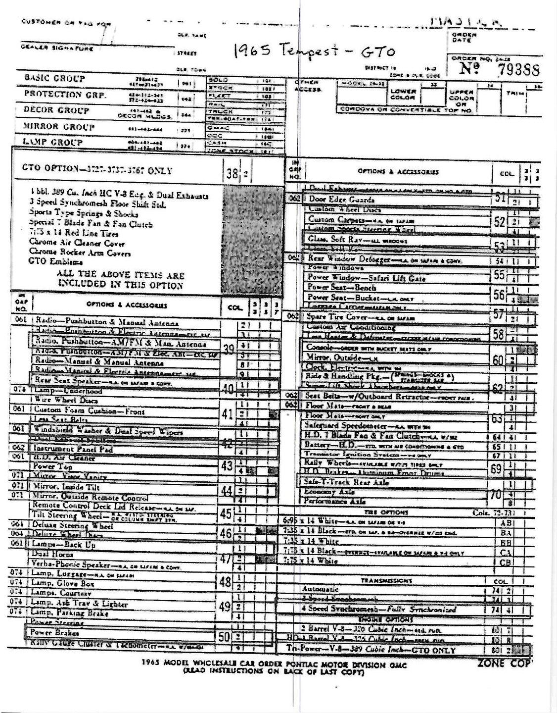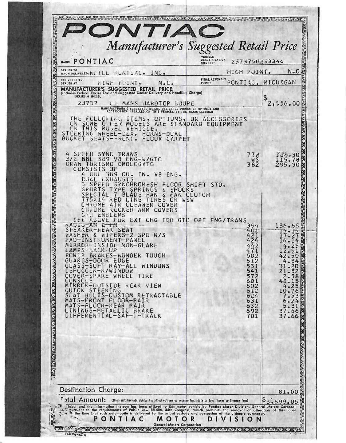 This clean example is PHS documented as a true 365 HP Tri Power from the factory. We even have the original window sticker to verify that everything is correct on this goat. The 389CI V8 engine is mated to a Muncie M20 4 speed manual transmission. Power steering and power brakes make it a breeze to drive and stop the car confidently.