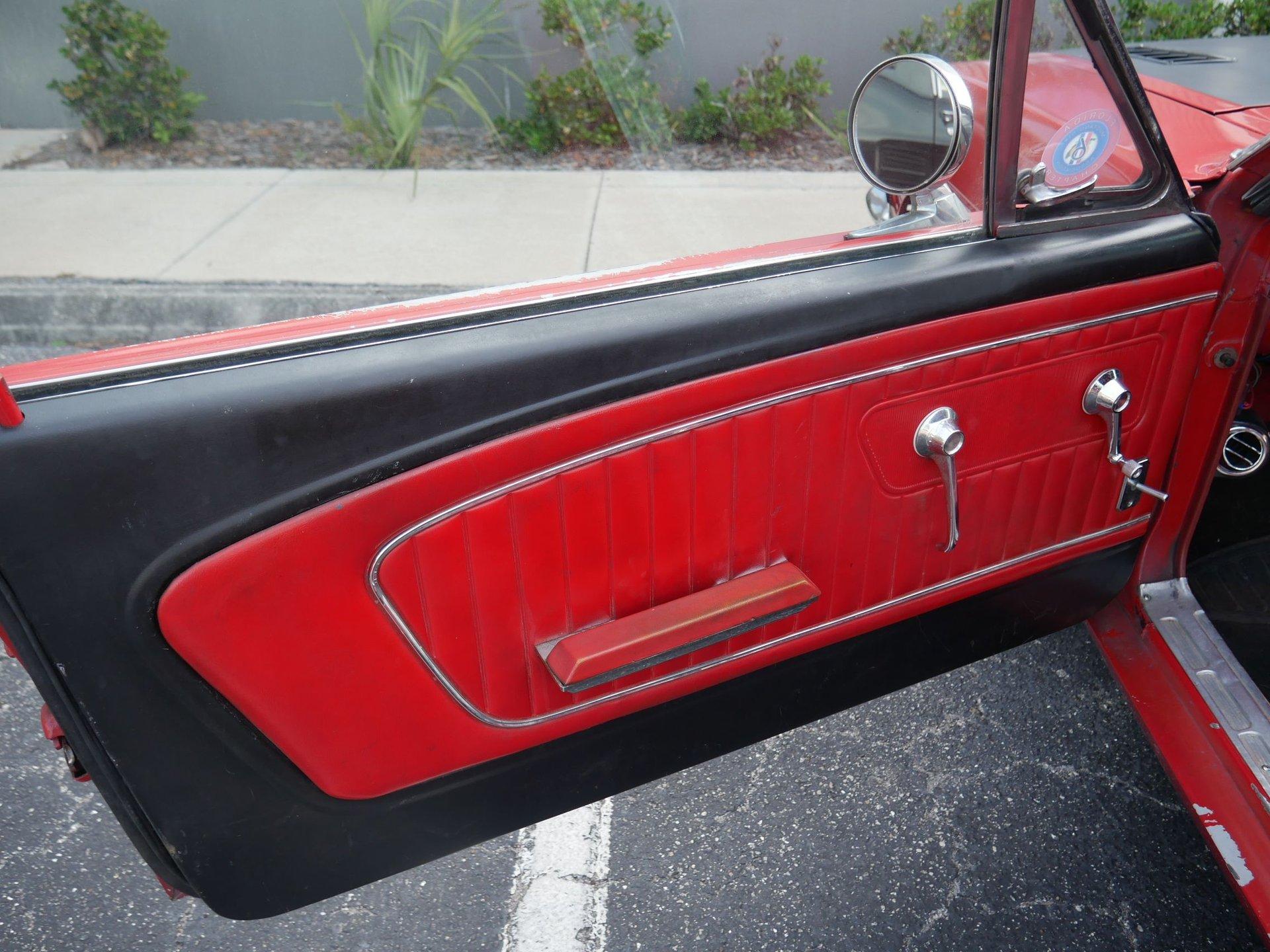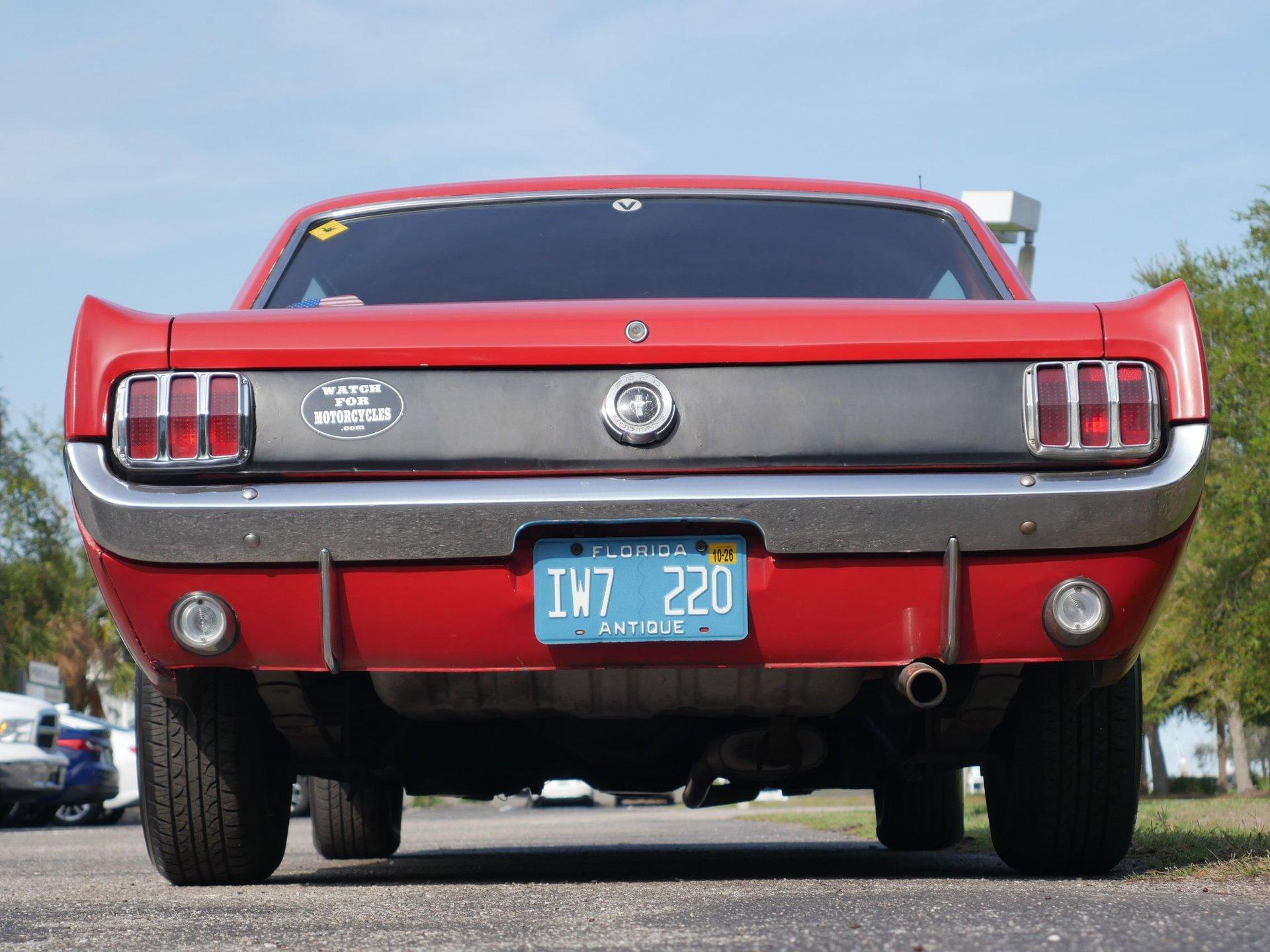 Inside, the interior was redone some time back and still shows well. The driver's seat has a cover to keep it cool in the hot Florida summer months. It has a modern style AM/FM radio in the dash, extra gauges on the column, and the sporty bucket seats with floor shifter you expect in a first-generation Mustang. A center console is a great addition with an armrest, some storage, and cupholders for you and your passenger.