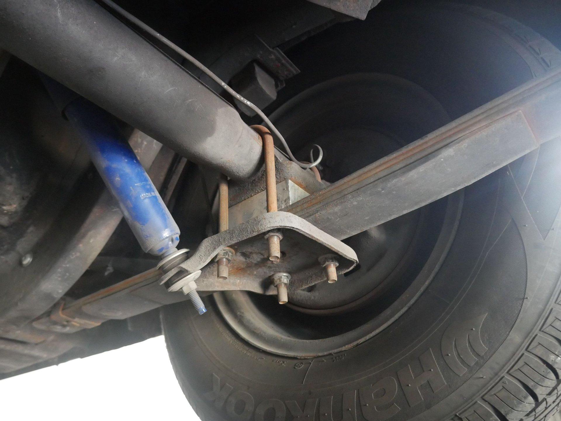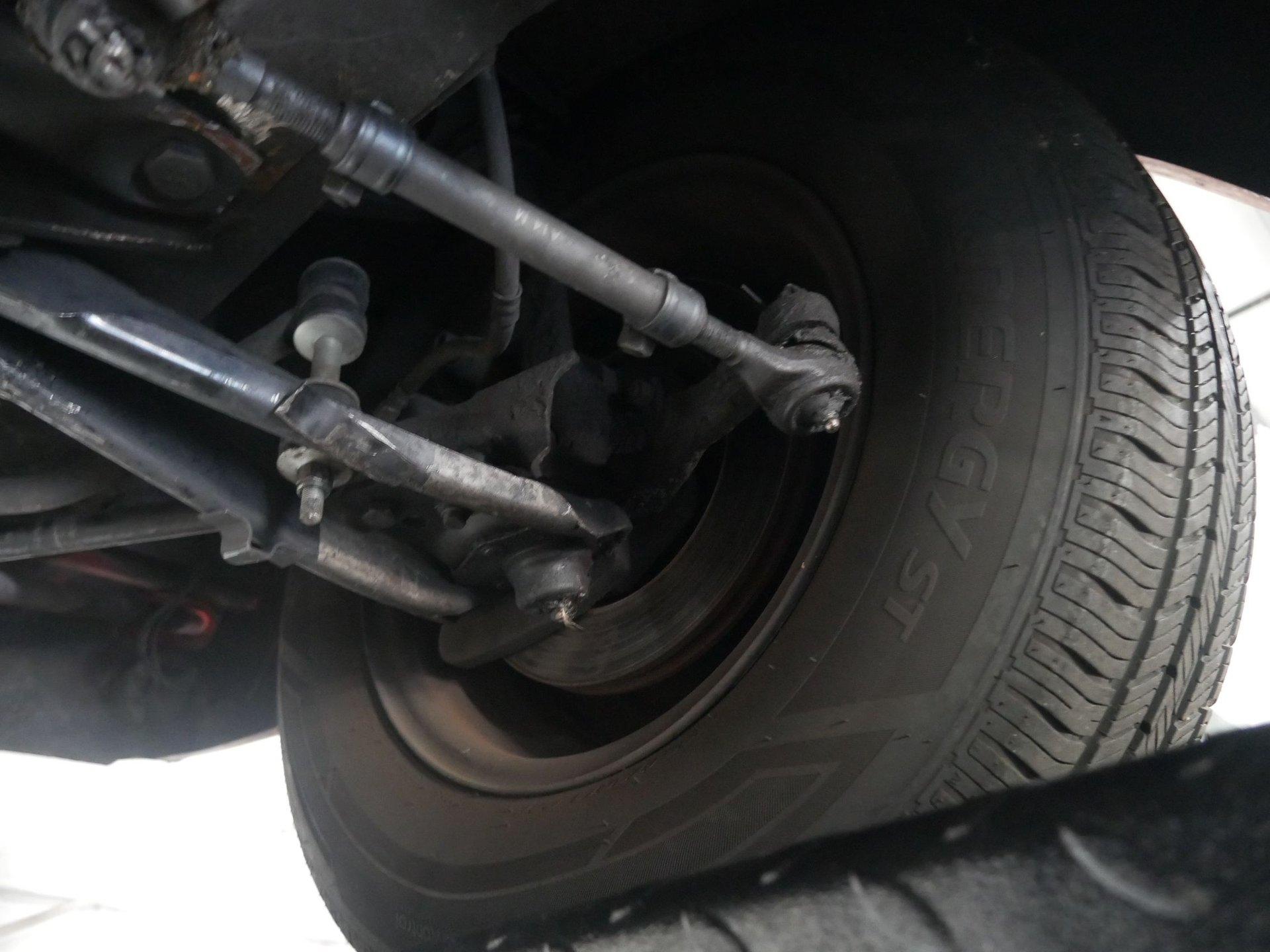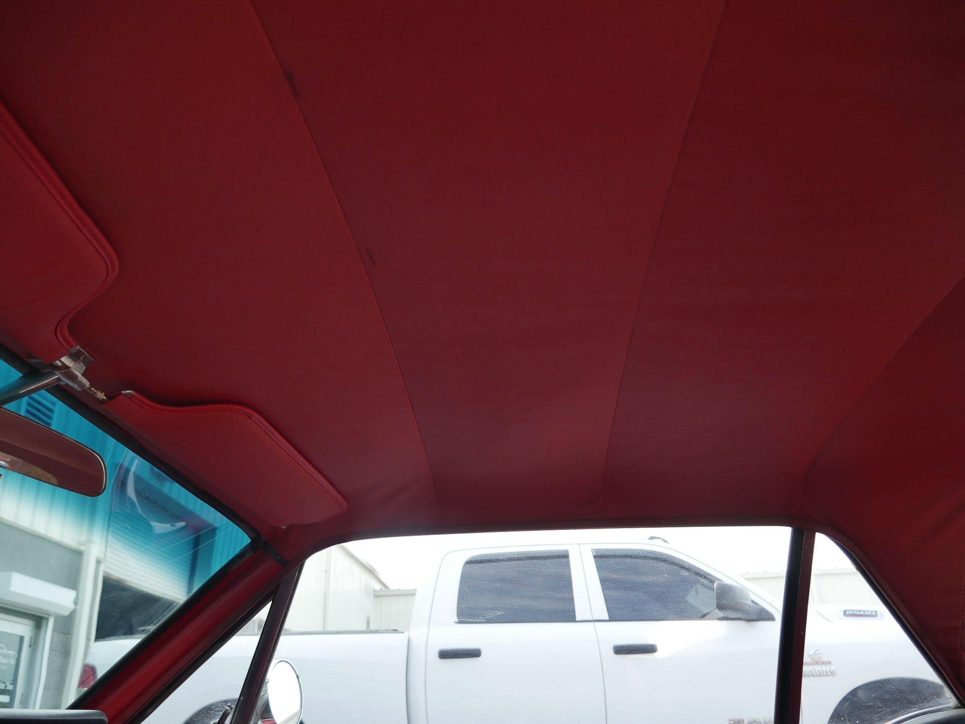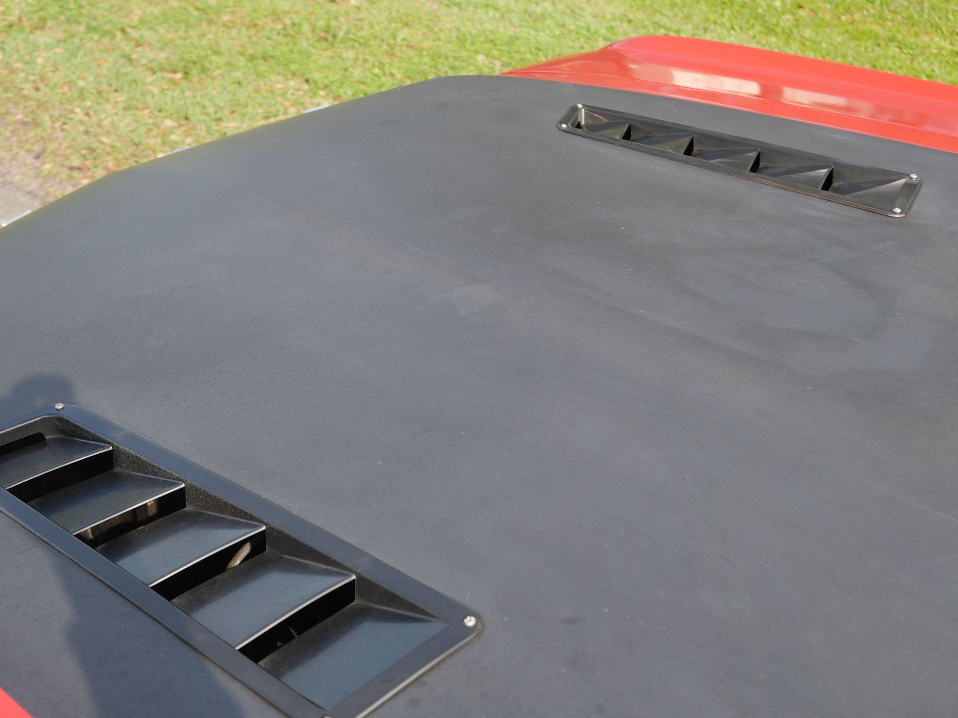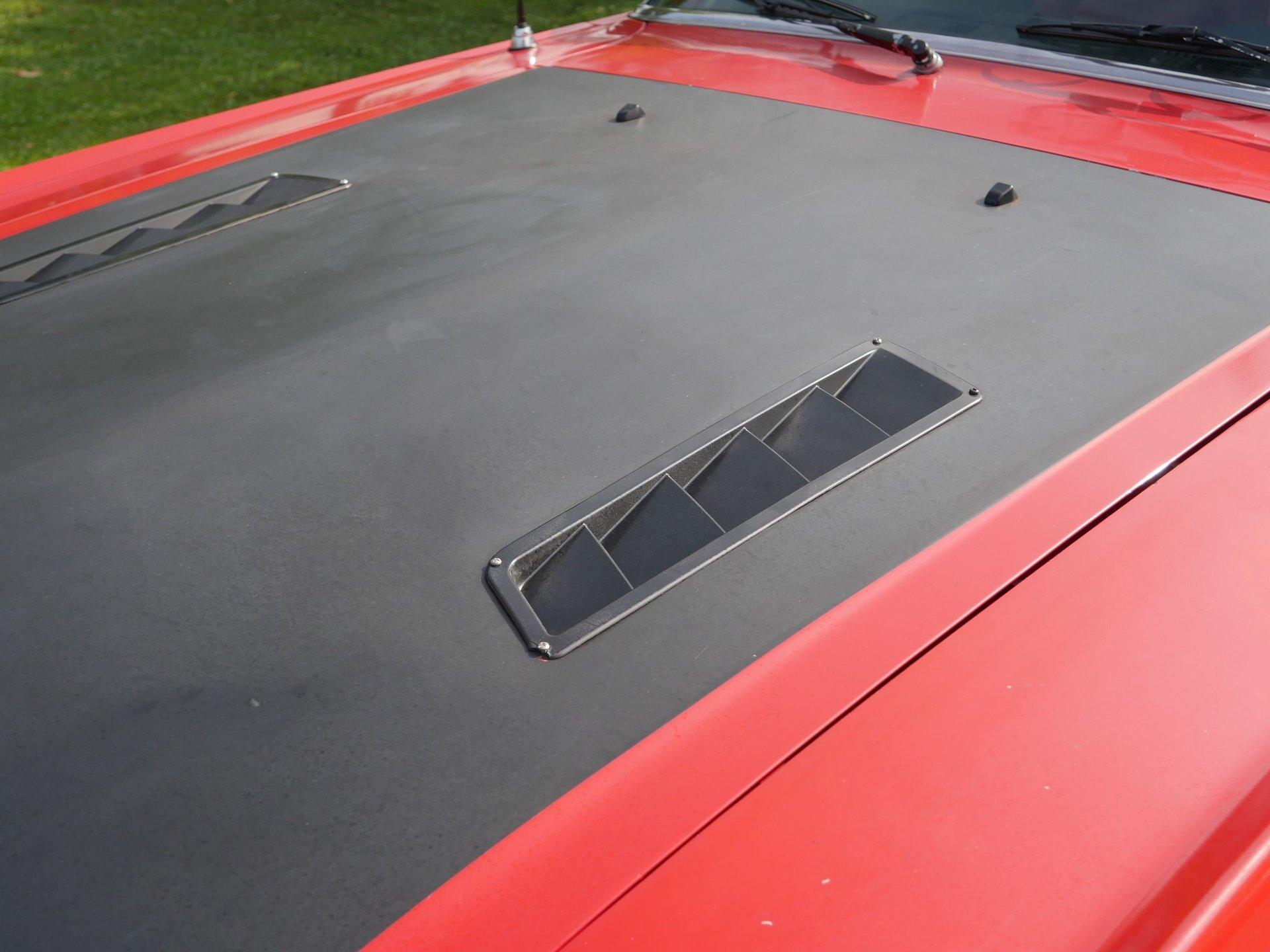 The exterior has some custom touches like a more sporty hood, given the matte black treatment, and black steel wheels with chrome center caps. The red paint is in driver quality condition.