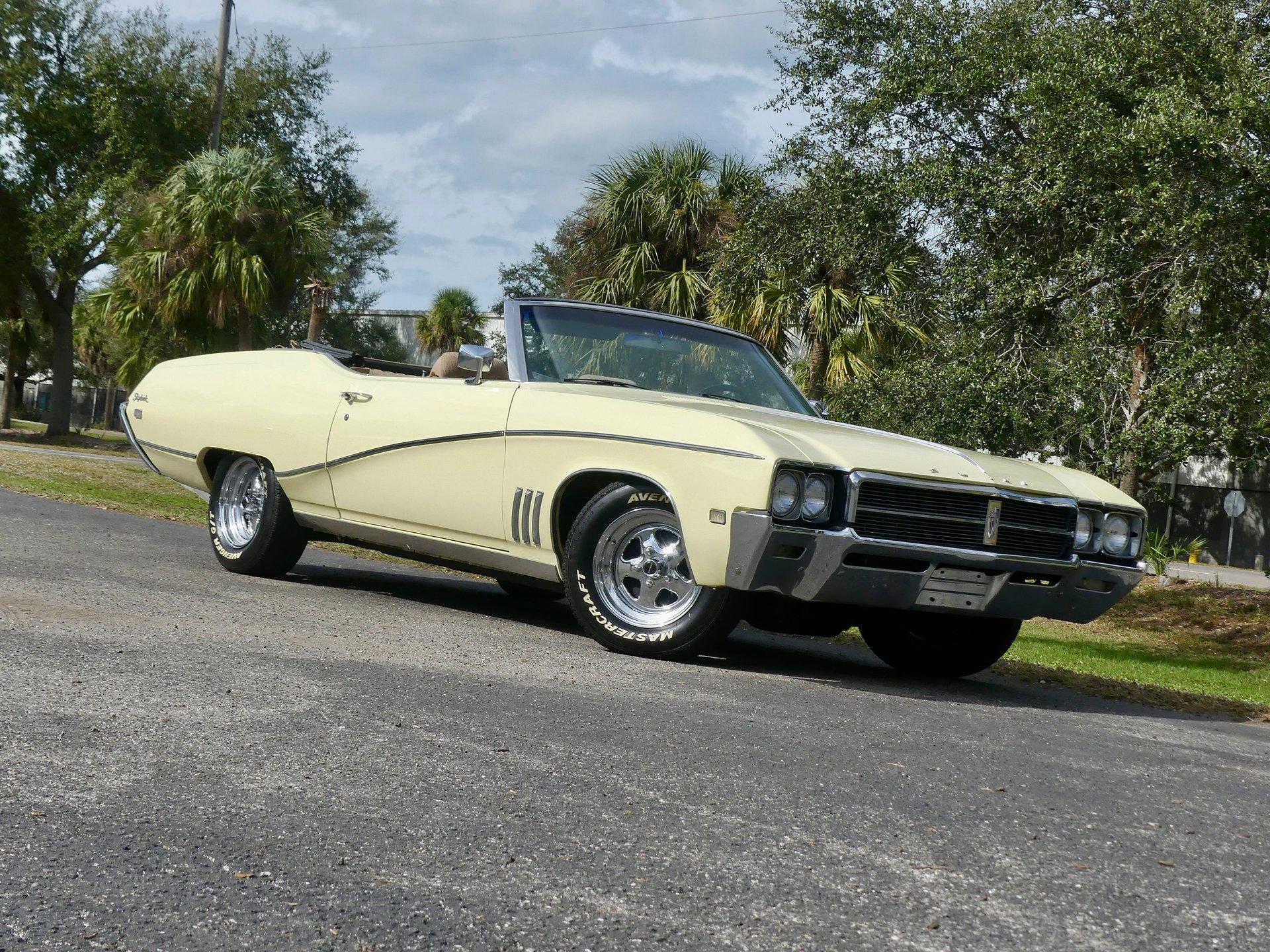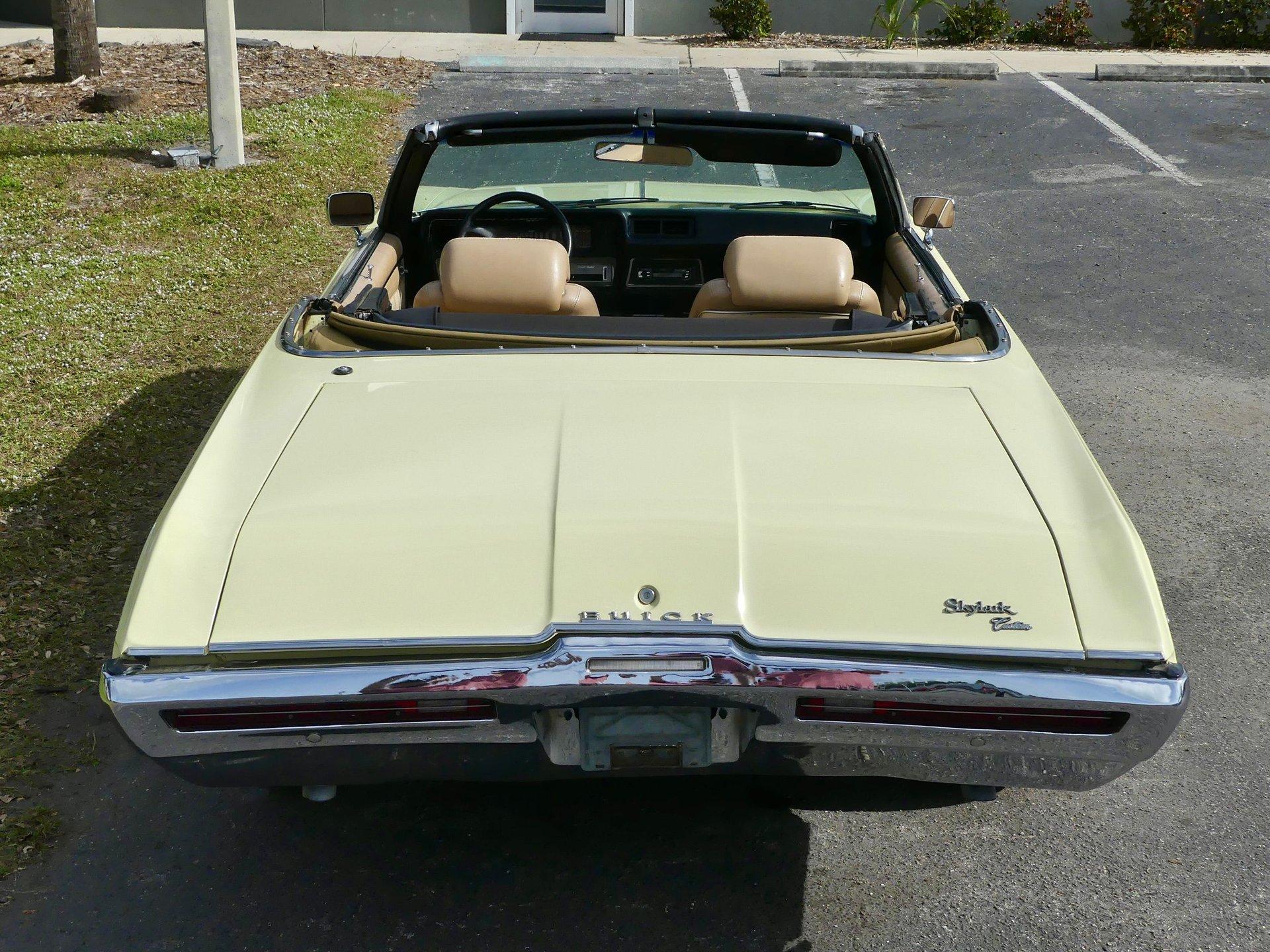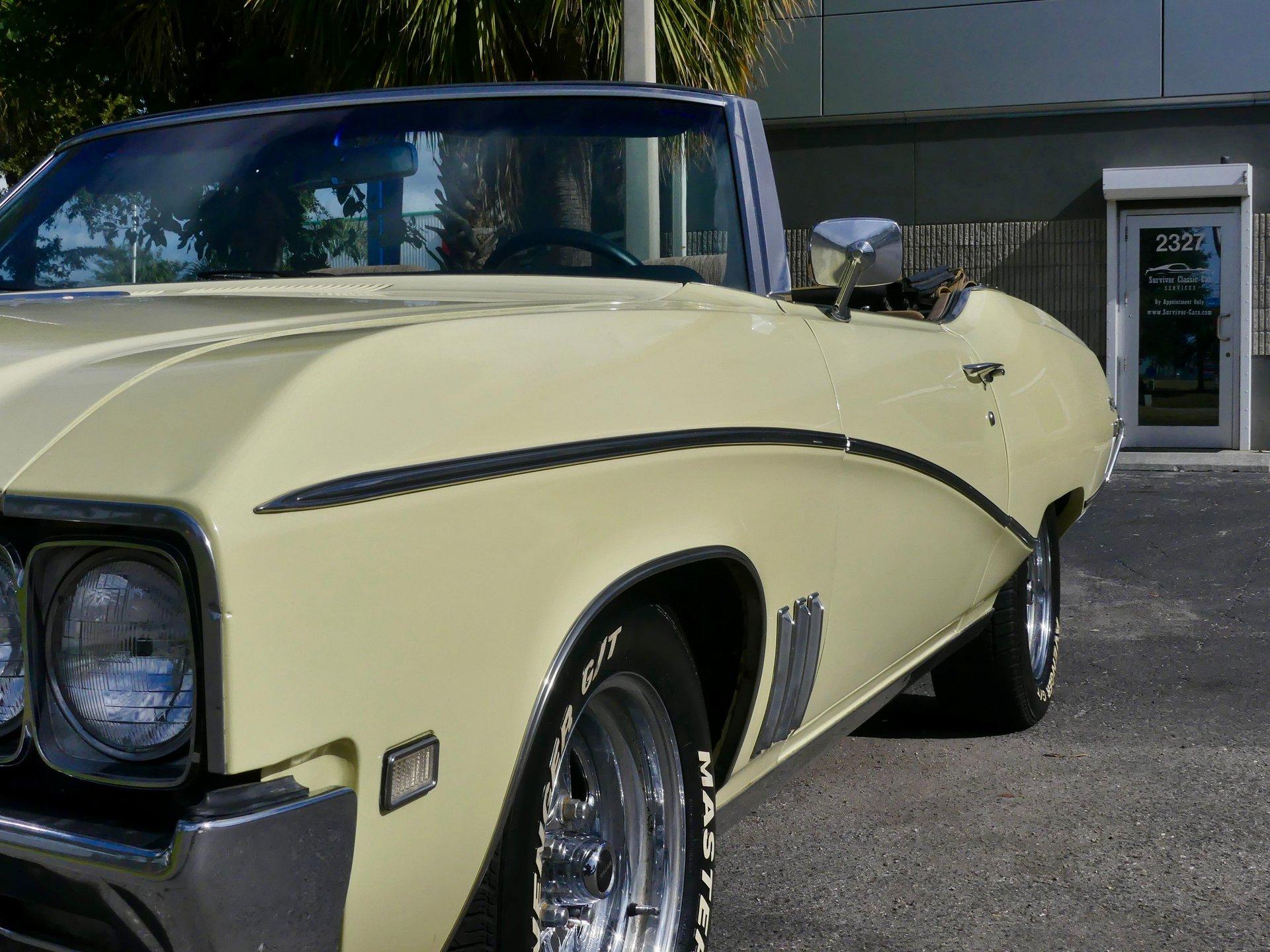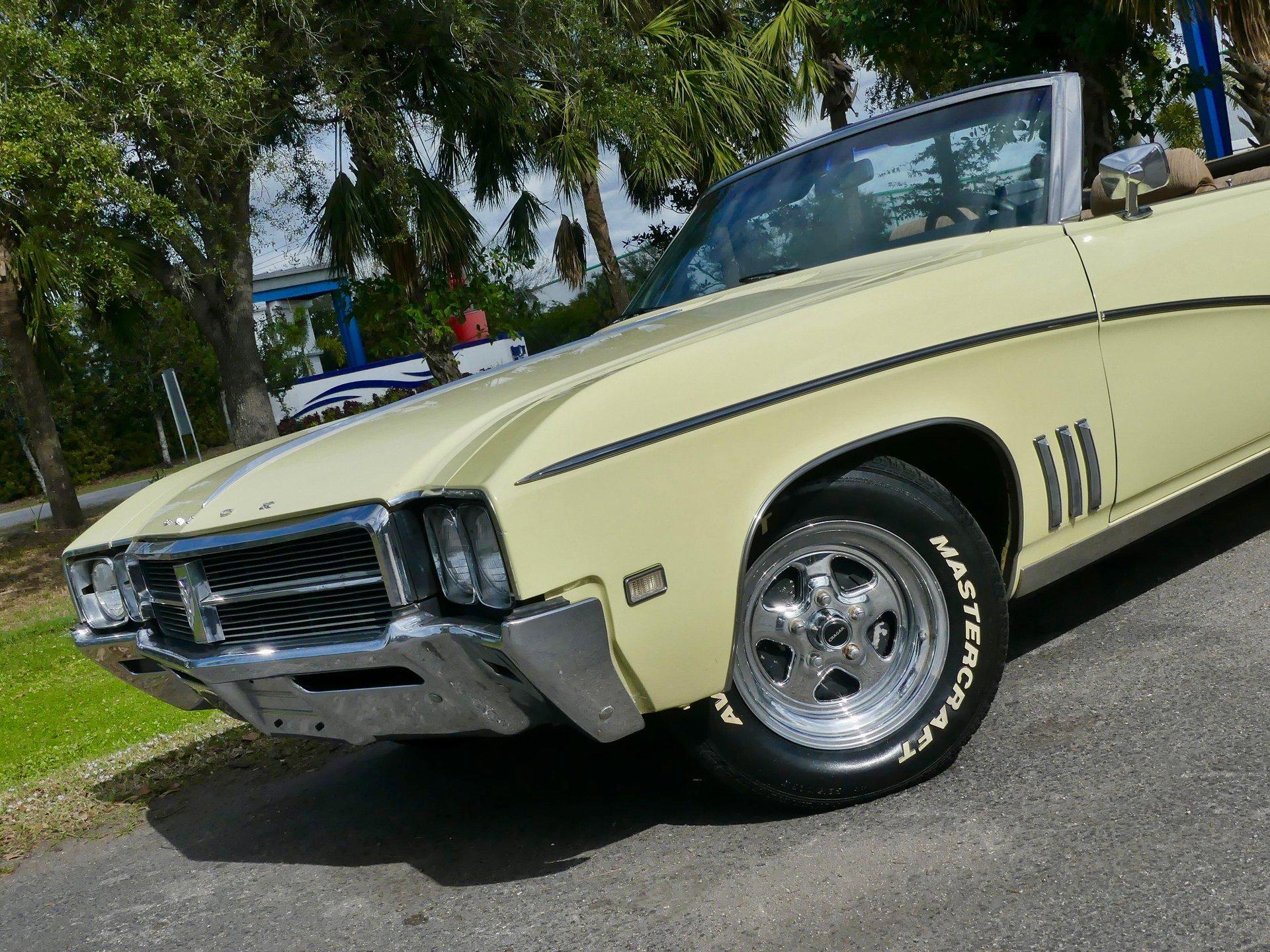 This 1969 Buick Skylark custom convertible is a muscle car, with a big block 455 CID V8 under the hood and a Turbo 400 automatic transmission. But it is also a luxury ride with power steering, power brakes, A/C, tilt steering, comfortable bucket seats, a power convertible top, and an AM/FM/CD player in the dash.
